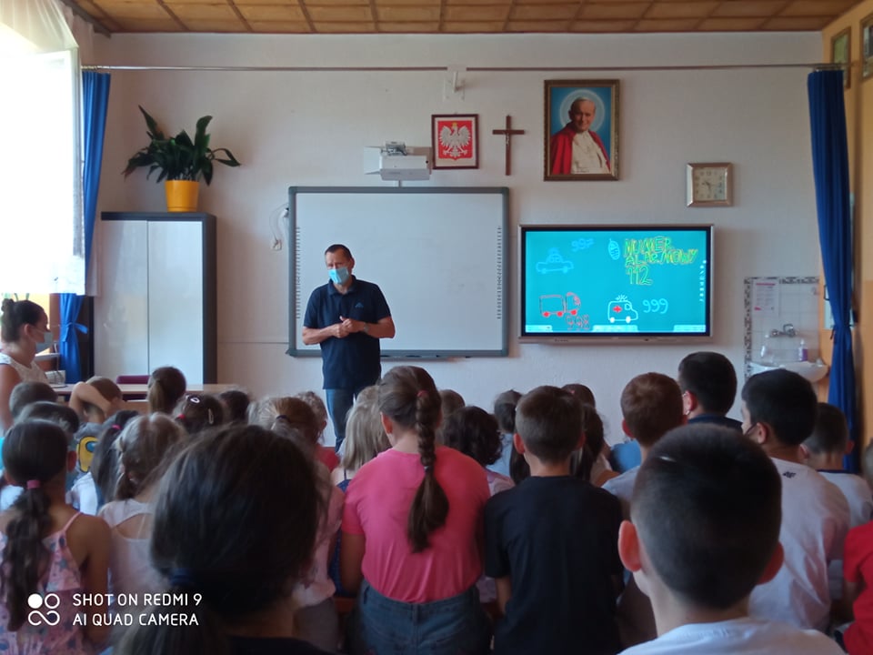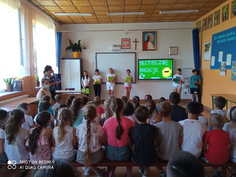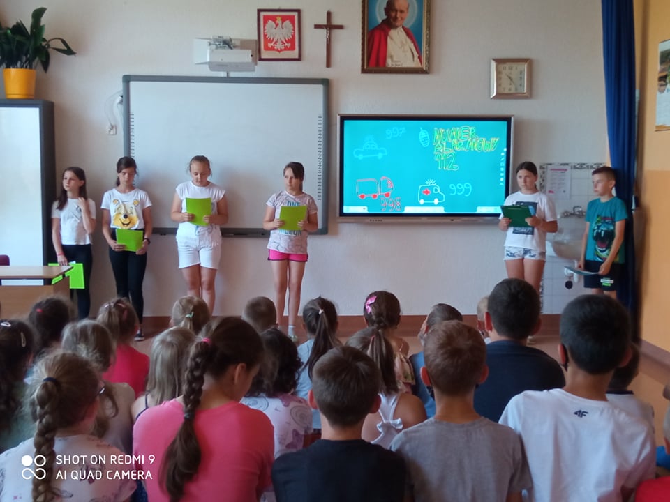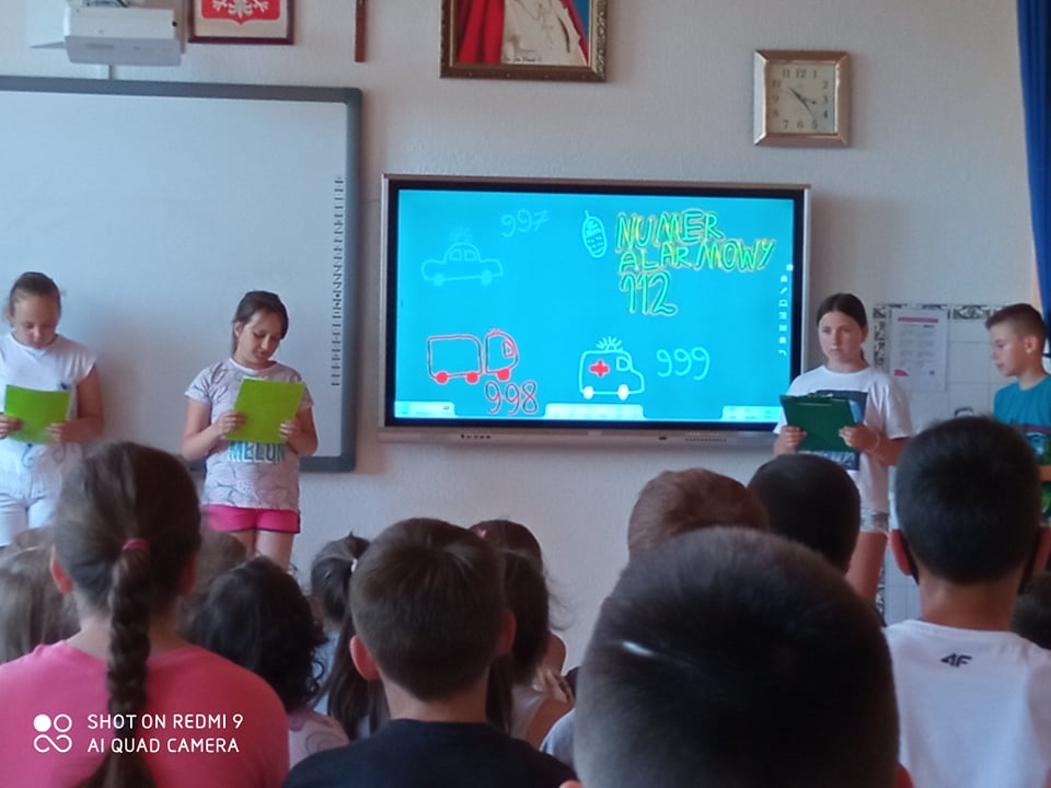 Wakacje to okres, w którym znajdujemy czas na zabawę, relaks i drobne szaleństwa. Uczniowie nie mają obowiązków związanych ze szkołą i nauką, więc mogą bez ograniczeń planować najróżniejsze przygody. Niektórzy spotykają się z przyjaciółmi i wspólnie świetnie się bawią, inni wybierają się na rodzinne wyjazdy. Nikt nie spędza czasu w domu, kiedy za oknem mamy słoneczną, piękną, zachęcającą do wyjścia pogodę. Wakacyjny relaks nie zwalnia nas jednak z obowiązku dbania o bezpieczeństwo swoje i innych osób. Aby przypomnieć o tym wszystkim uczniom, w ostatnim tygodniu czerwca odbył się apel poświęcony bezpieczeństwu w czasie wakacji. Uczniowie klasy IV, przy wykorzystaniu tablicy multimedialnej, wykonali ilustracje związane z tematyką apelu, które były wyświetlane podczas spotkania. Chętni wychowankowie, w krótkim wystąpieniu przypomnieli, jak powinniśmy postępować, aby wakacje zawsze kojarzyły nam się z samymi przyjemnościami. Wystarczy wykazać zdrowy rozsądek i pamiętać o kluczowych zasadach bezpieczeństwa. Społeczność szkolna przypomniała sobie też jak reagować, kiedy zdarzy się wypadek. Uczniowie z pewnością pamiętają, że należy czym prędzej zawiadomić osobę dorosłą, a jeśli w pobliżu nie ma nikogo, kto mógłby nam pomóc, a mamy dostęp do telefonu, dzwonimy po pomoc pod numer 999, bądź 112.