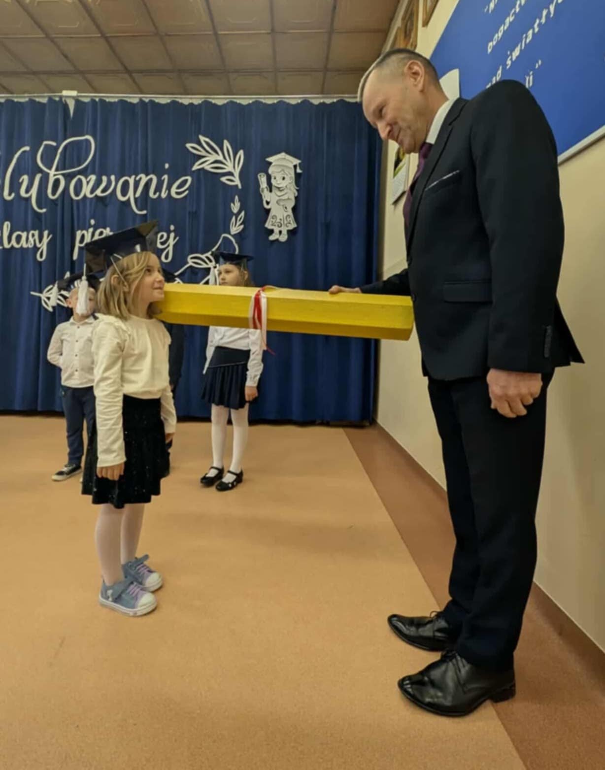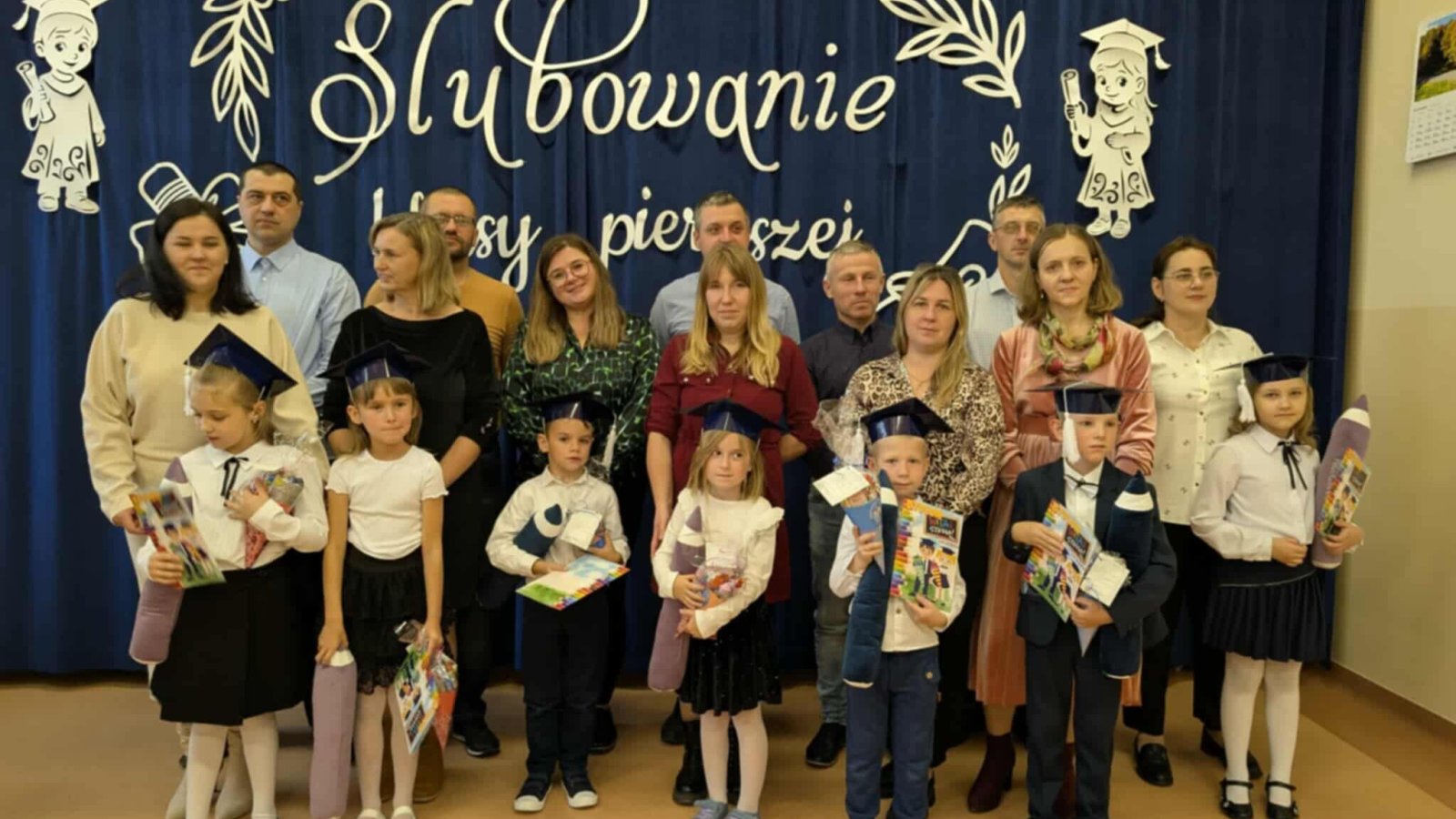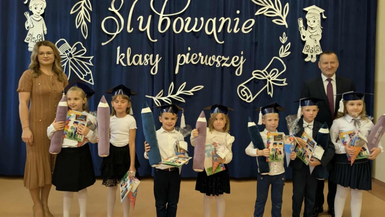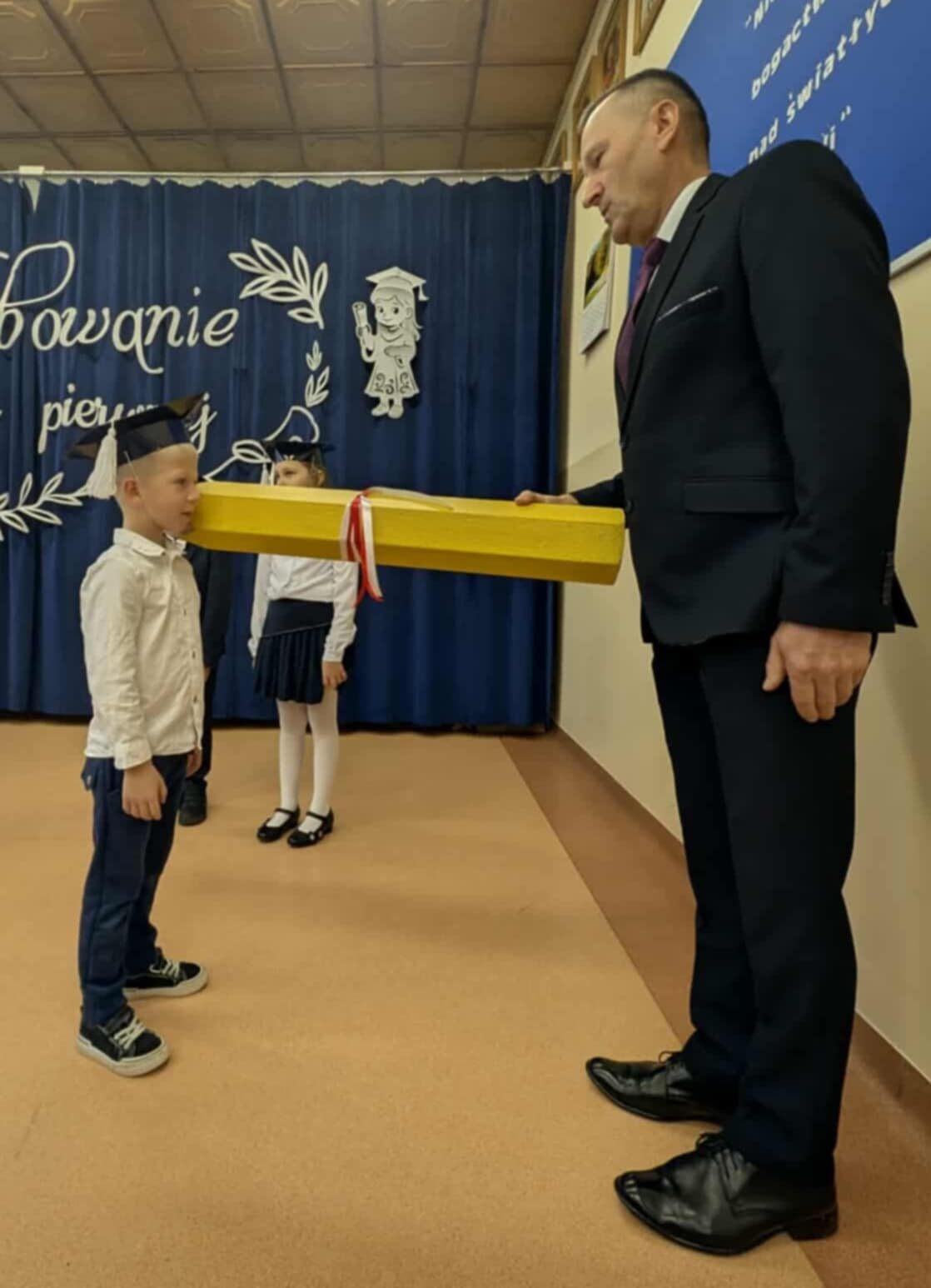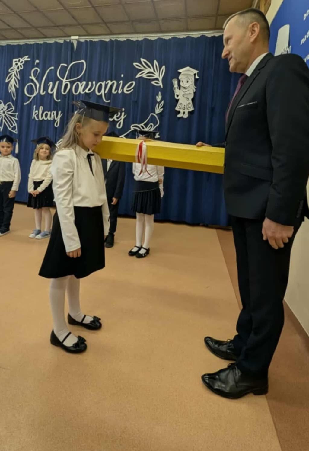 Najważniejszym momentem uroczystości było złożenie ślubowania na sztandar szkoły. Pierwszoklasiści ślubowali być pilnymi i uczciwymi uczniami, szanować nauczycieli, rodziców i kolegów oraz dbać o dobre imię swojej szkoły. Po wypowiedzeniu słów ślubowania pan dyrektor Stanisław Saj, dokonał symbolicznego aktu pasowania na ucznia, dotykając ramienia każdego dziecka dużym ołówkiem – symbolem nauki i mądrości.
