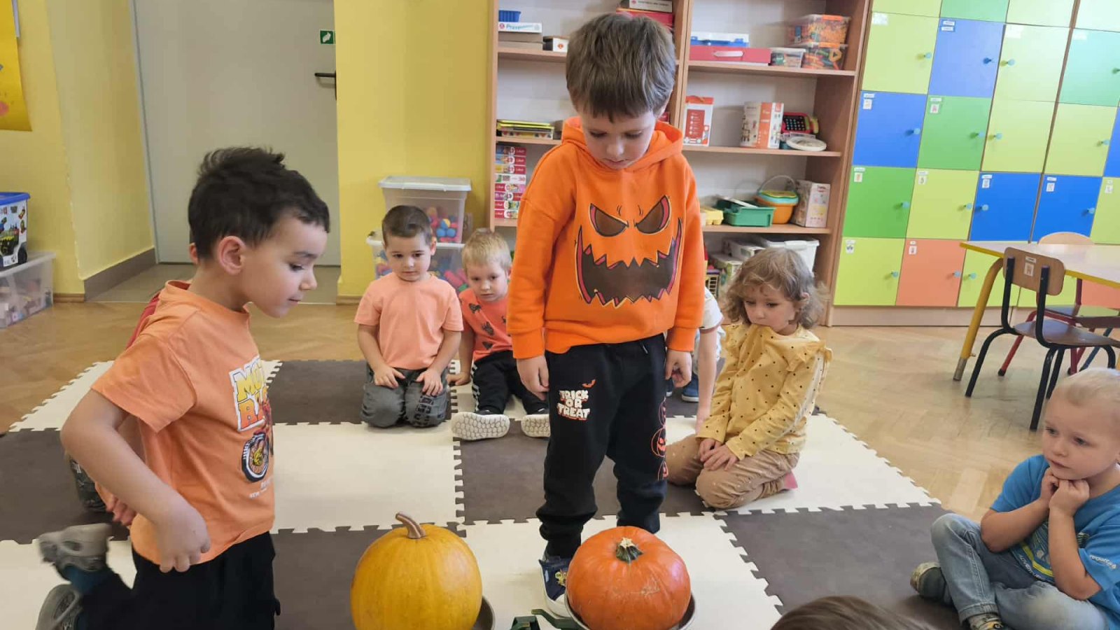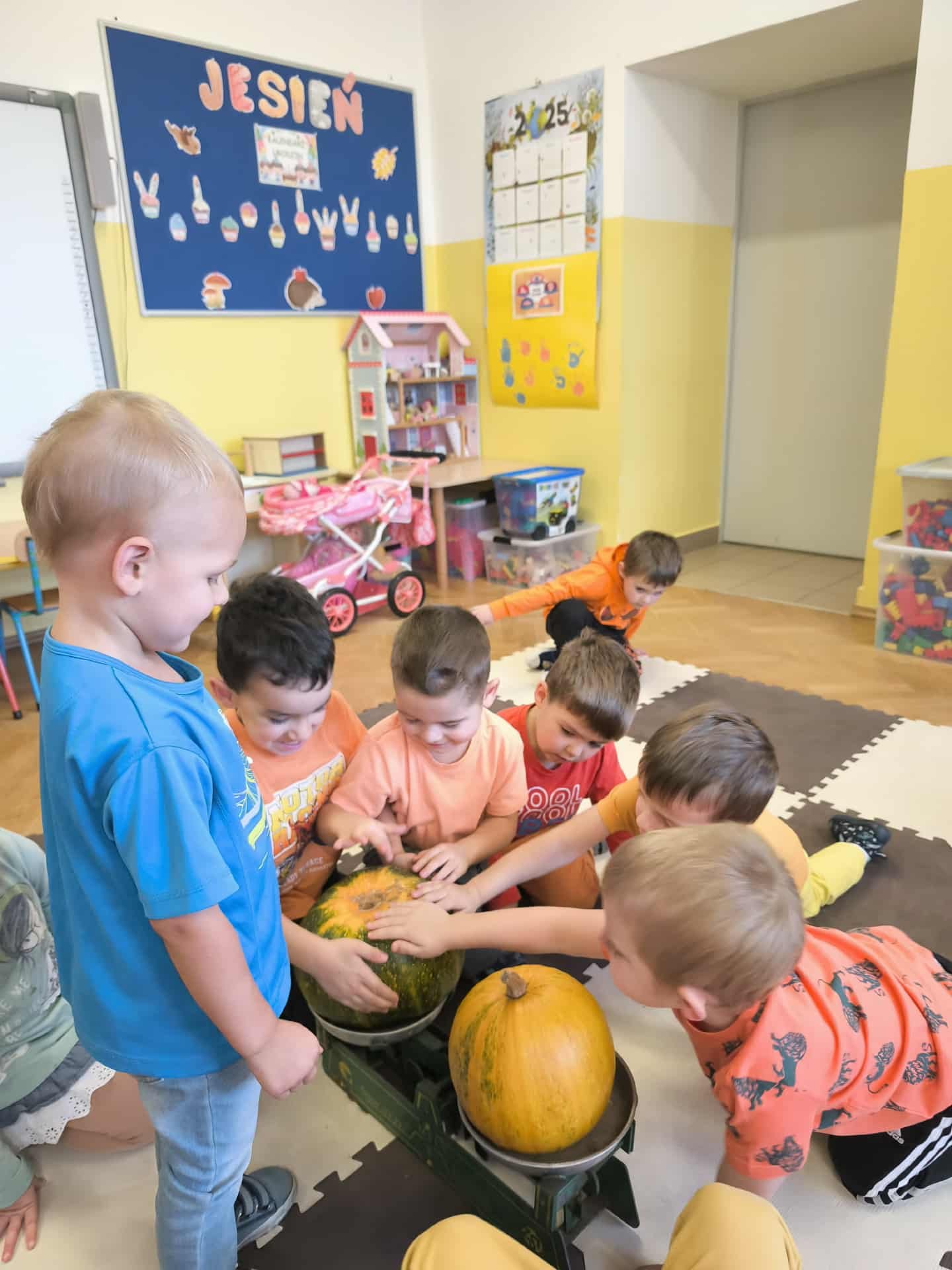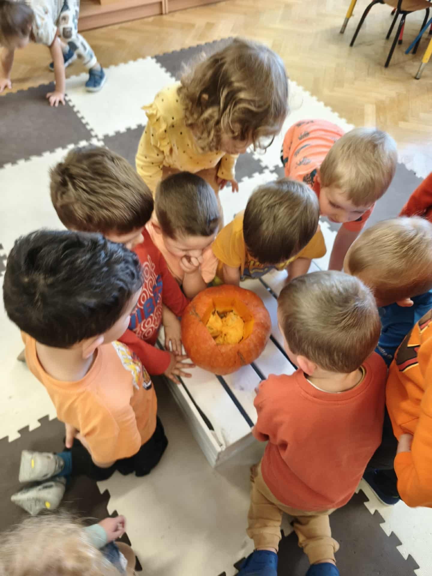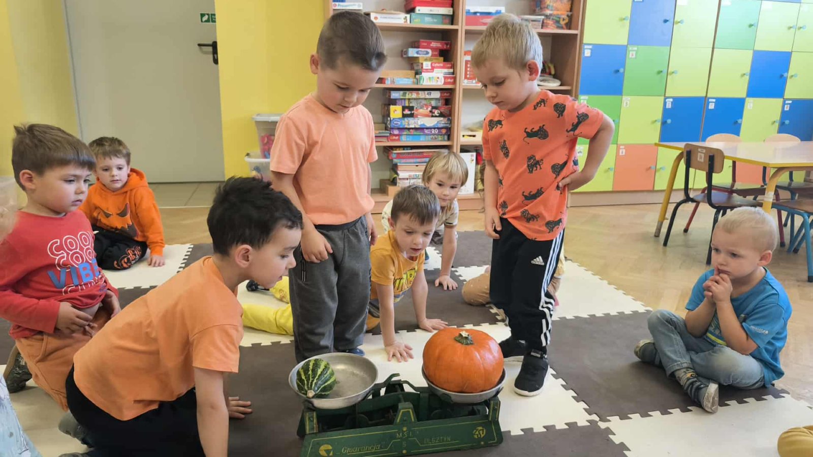 Podczas zajęć przedszkolaki uczestniczyły w wielu zabawach i aktywnościach związanych z dynią. Z dużym zainteresowaniem dzieci ważyły różne gatunki dyń używając do tego tradycyjnej wagi szalkowej, porównywały również wielkość i kształt dyń. Odkrywały, co znajduje się w ich wnętrzu. Przedszkolaki poznały jak dużo potraw i przysmaków można wykonać z dyni. Nie zabrakło też zabaw ruchowych – z dynią w roli głównej, które dostarczyły wszystkim mnóstwo śmiechu i pozytywnej energii.