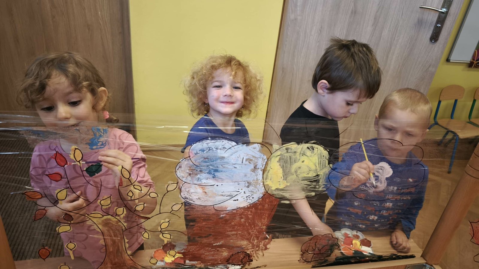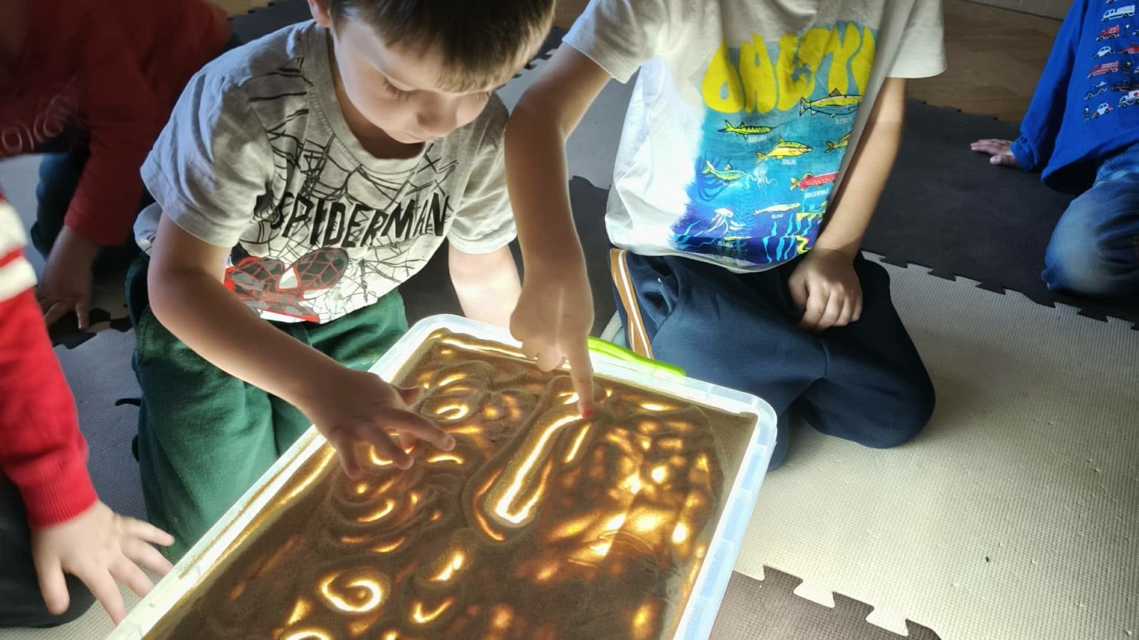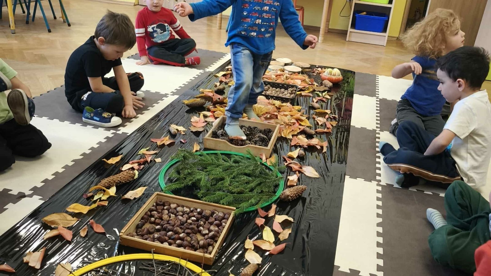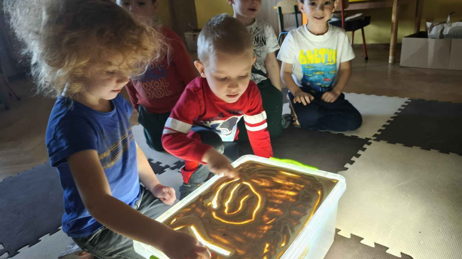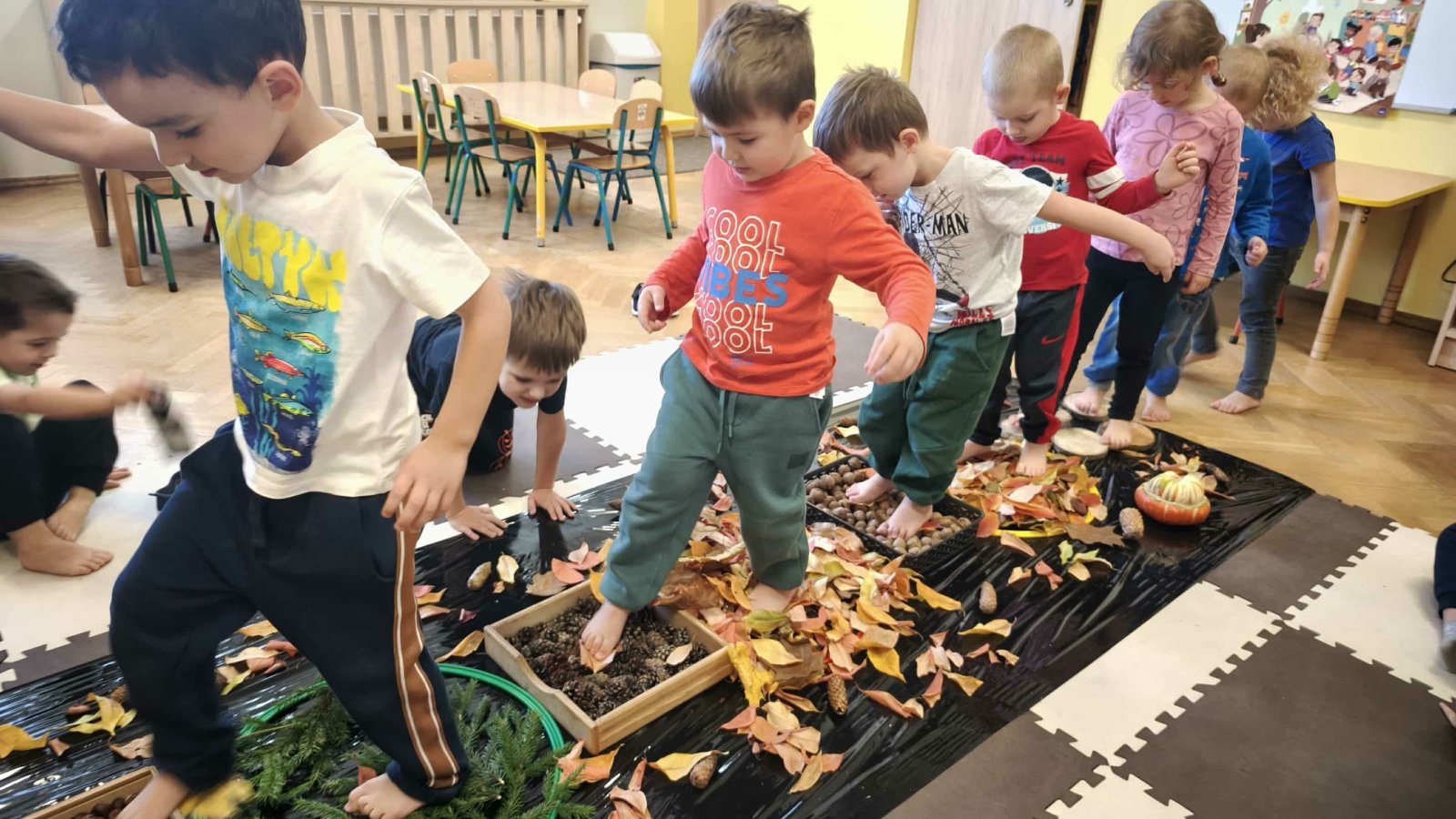 Jesień to idealny czas, aby zaprosić dzieci do odkrywania świata wszystkimi zmysłami. W przedszkolu powstała jesienna ścieżka sensoryczna, która nie tylko pobudzała ciekawość najmłodszych, lecz także wspierała ich rozwój motoryczny i poznawczy. Tor wypełniony był naturalnymi materiałami kojarzącymi się z jesienią: liśćmi, szyszkami czy kasztanami. Taka forma zabawy stymulowała zmysł dotyku, a jednocześnie rozwijała równowagę oraz koordynację ruchową. Świetną okazją do wzmacniania kreatywności, motoryki małej i zmysłu wzroku było również malowanie na folii czy kreślenie wzorów na piasku.