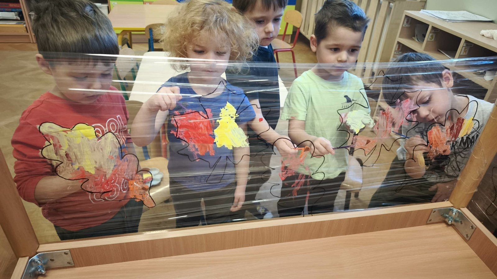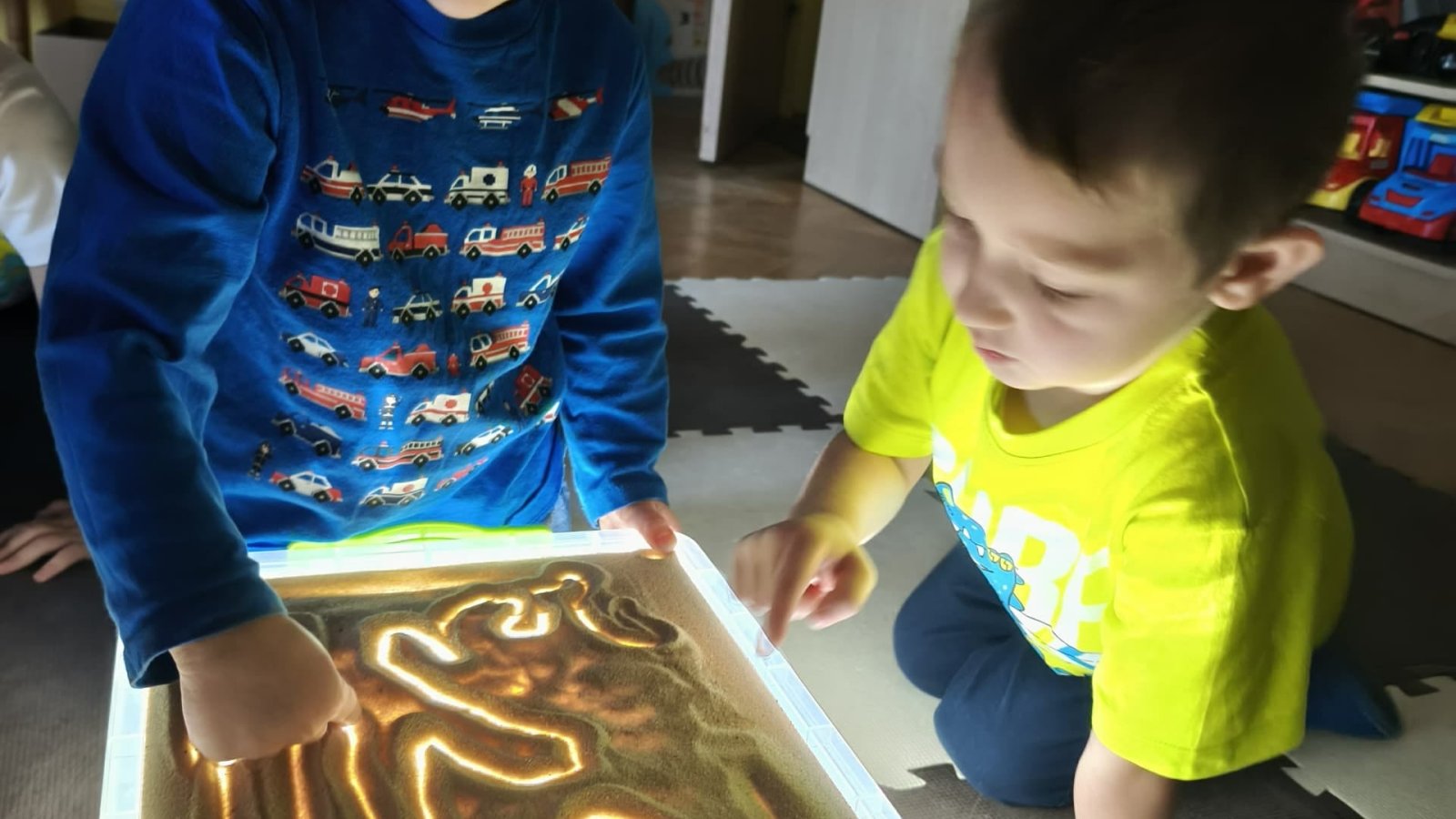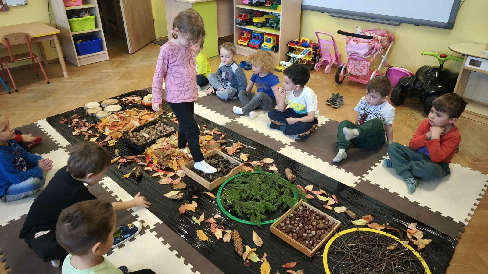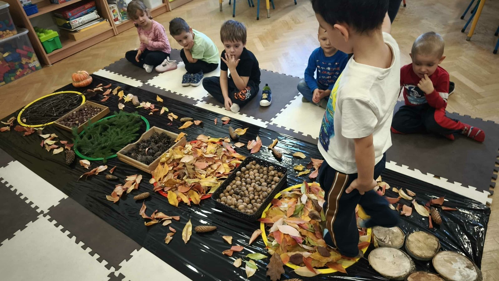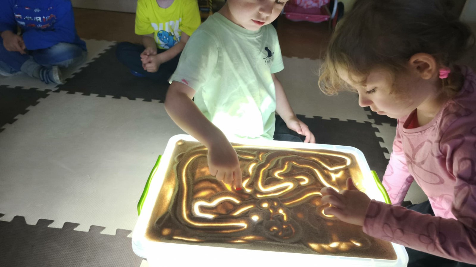 Jesień to idealny czas, aby zaprosić dzieci do odkrywania świata wszystkimi zmysłami. W przedszkolu powstała jesienna ścieżka sensoryczna, która nie tylko pobudzała ciekawość najmłodszych, lecz także wspierała ich rozwój motoryczny i poznawczy. Tor wypełniony był naturalnymi materiałami kojarzącymi się z jesienią: liśćmi, szyszkami czy kasztanami. Taka forma zabawy stymulowała zmysł dotyku, a jednocześnie rozwijała równowagę oraz koordynację ruchową. Świetną okazją do wzmacniania kreatywności, motoryki małej i zmysłu wzroku było również malowanie na folii czy kreślenie wzorów na piasku.