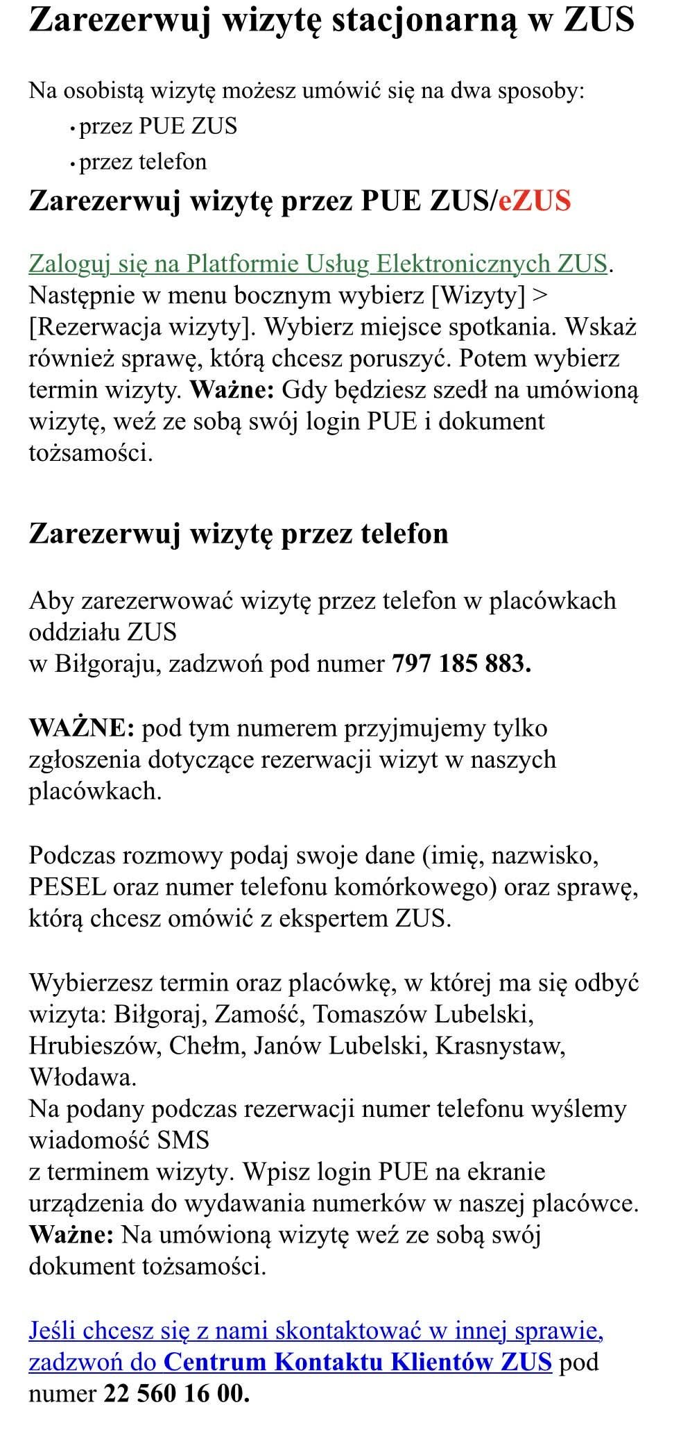 Na prośbę Zakładu Ubezpieczeń Społecznych Oddział w Biłgoraju przekazujemy informację o możliwości rezerwacji wizyt stacjonarnych w placówkach ZUS. Nowy model obsługi ma na celu poprawę jakości usług, skrócenie czasu oczekiwania oraz wygodniejszą obsługę klientów.