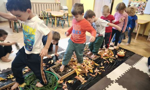 2025-11-20 Jesienna ścieżka sensoryczna – zabawy ze zmysłami w praktyce Jesień to idealny czas, aby zaprosić dzieci do odkrywania świata wszystkimi zmysłami. W przedszkolu powstała jesienna ścieżka sensoryczna, która nie tylko pobudzała ciekawość najmłodszych, lecz także wspierała ich rozwój motoryczny i poznawczy. Tor wypełniony był naturalnymi materiałami kojarzącymi się z jesienią: liśćmi, szyszkami czy kasztanami. Taka forma zabawy stymulowała zmysł dotyku, a jednocześnie rozwijała równowagę oraz koordynację ruchową. Świetną okazją do wzmacniania kreatywności, motoryki małej i zmysłu wzroku było również malowanie na folii czy kreślenie wzorów na piasku. Jesienne zabawy sensoryczne to nie tylko przyjemne spędzanie czasu, ale także cenne doświadczenia edukacyjne. Dzięki różnorodnym aktywnościom dzieci mogły poznawać świat angażując całe ciało i wszystkie zmysły – tak, jak najbardziej lubią. czytaj dalej »