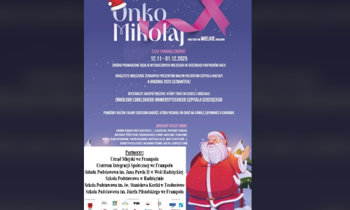 2025-11-22 Akcja OnkoMikołaj! Zbliżają się święta – czas radości, dobroci i pomagania innym. Nasza szkoła dołączyła do akcji OnkoMikołaj. W związku z tym, w dniach 24-27.11.2025 r., będziemy zbierać prezenty dla dzieci przebywających na oddziale onkologicznym Lubelskiego Uniwersyteckiego Szpitala Dziecięcego.