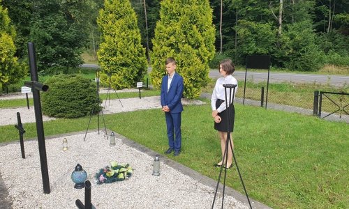 2021-09-02 A jeśli komu droga otwarta do nieba, Tym, co służą ojczyźnie... 1 września, w 82 rocznicę wybuchu II Wojny Światowej, uczniowie klasy VIII: Natalia Wójcik i Bartłomiej Wyroślak wraz z wychowawcą Panem Łukaszem Krawcem udali się na cmentarz wojenny na "Przykrej Górce", gdzie minutą ciszy, modlitwą i zapaleniem zniczy upamiętnili spoczywających na cmentarzu obrońców wolności Polski.