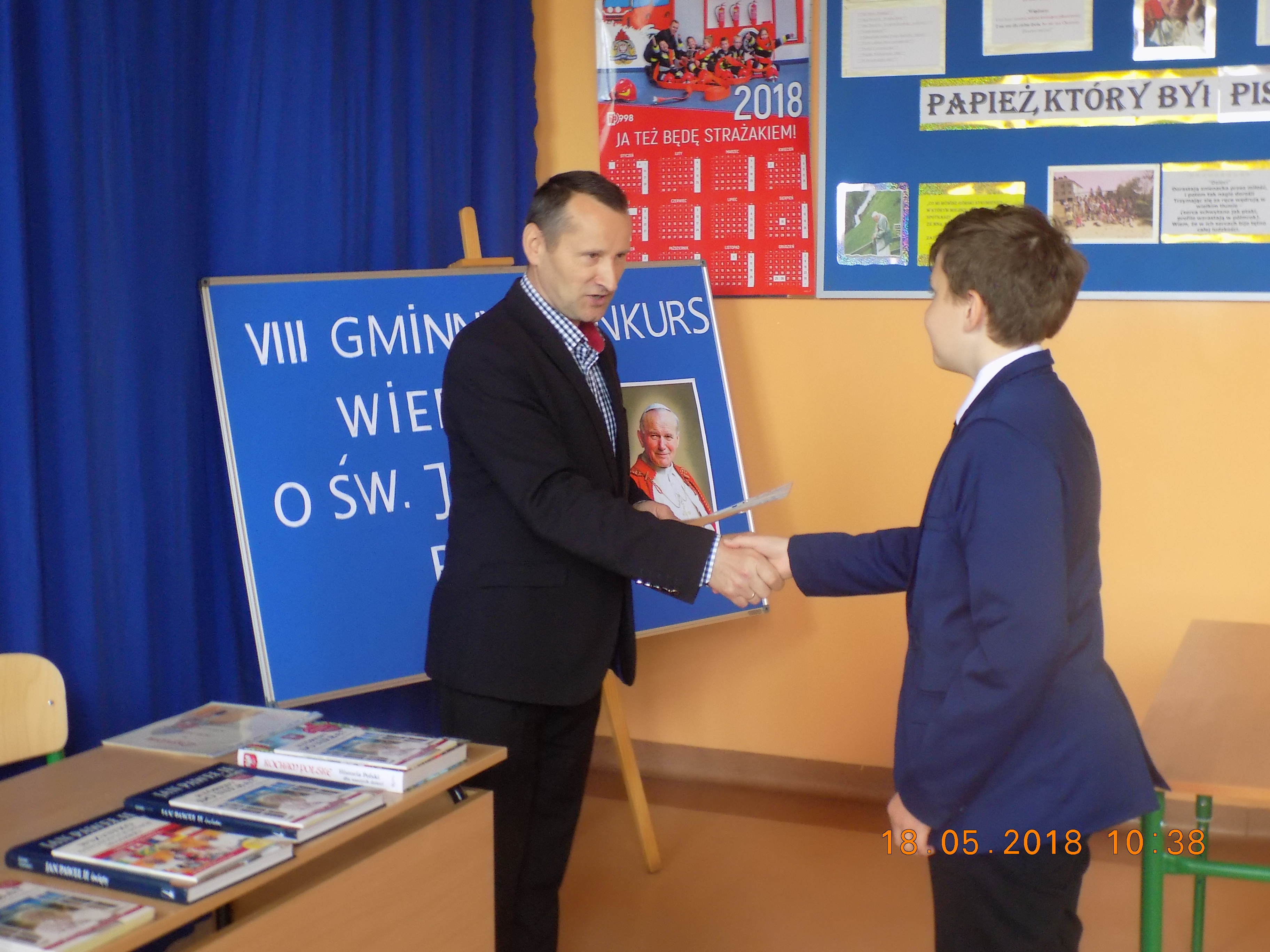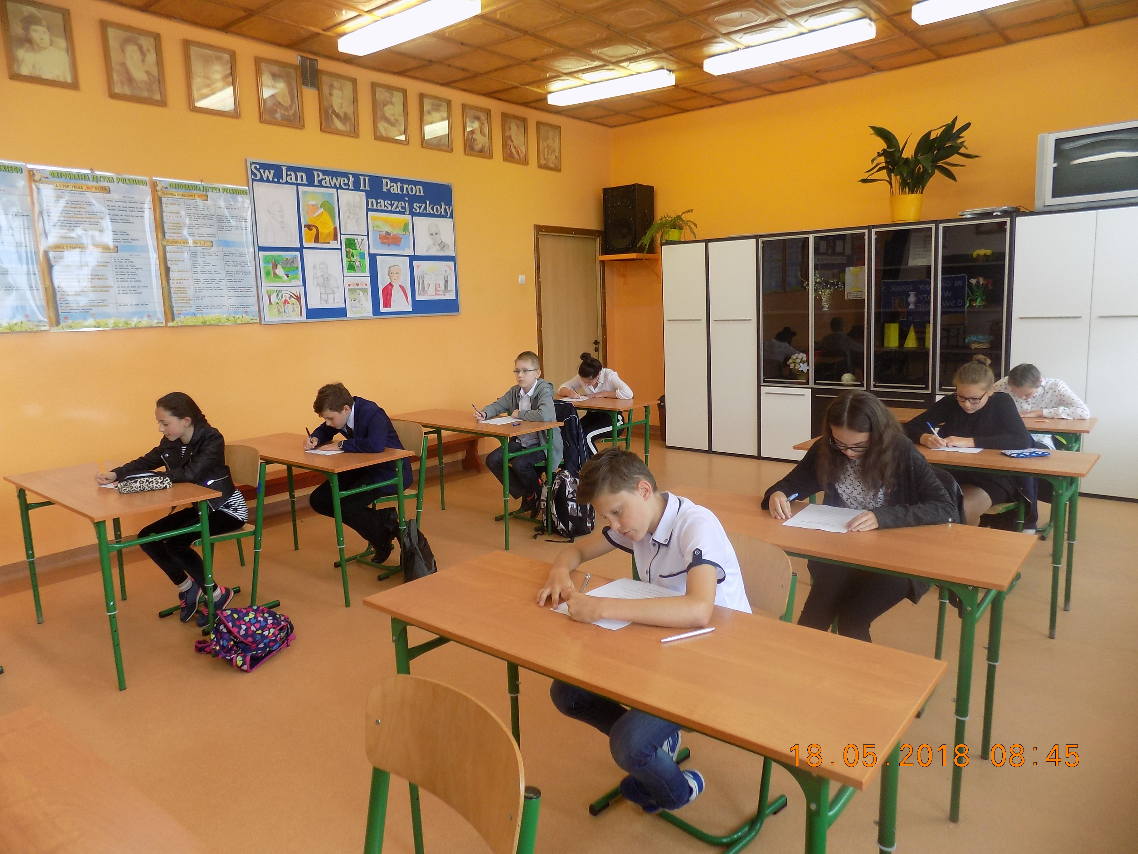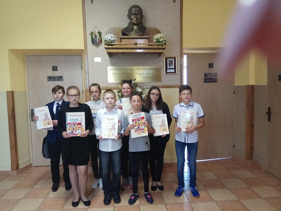 18 maja w naszej szkole odbył się już po raz VIII Gminny Konkurs Wiedzy o Św. Janie Pawle II dla szkół z gminy Frampol. Uczniowie zmagali się z pytaniami o życiu naszego Wielkiego Rodaka Św. Jana Pawła II.Komisja w skład której weszli wszyscy opiekunowie uczestników sprawdziła prace a dyrektor szkoły Stanisław Saj dokonał podsumowania i wręczył nagrody i dyplomy. Miejsce I przypadło uczniowi SZS we Frampolu Kacprowi Skibie. Miejsce II zajęła uczennica naszej szkoły Julia Czajka. Natomiast o miejscu III zdecydowała dogrywka w której uczestniczył nasz uczeń Rafał Czajka i Kacper Karwat z SZS we Frampolu.Ostatecznie miejsce III zdobył Kacper a Rafał musiał zadowolić się miejscem IV.