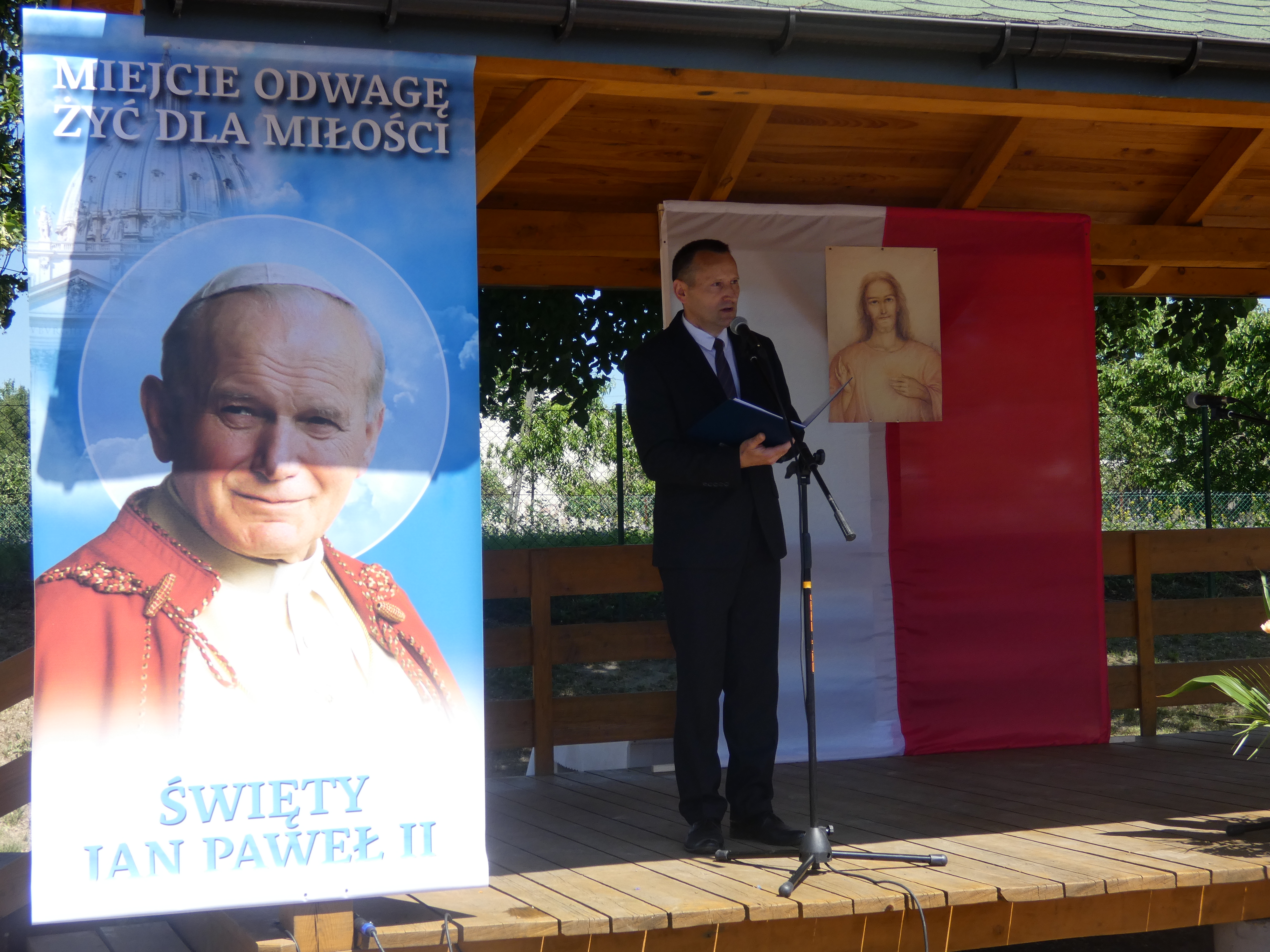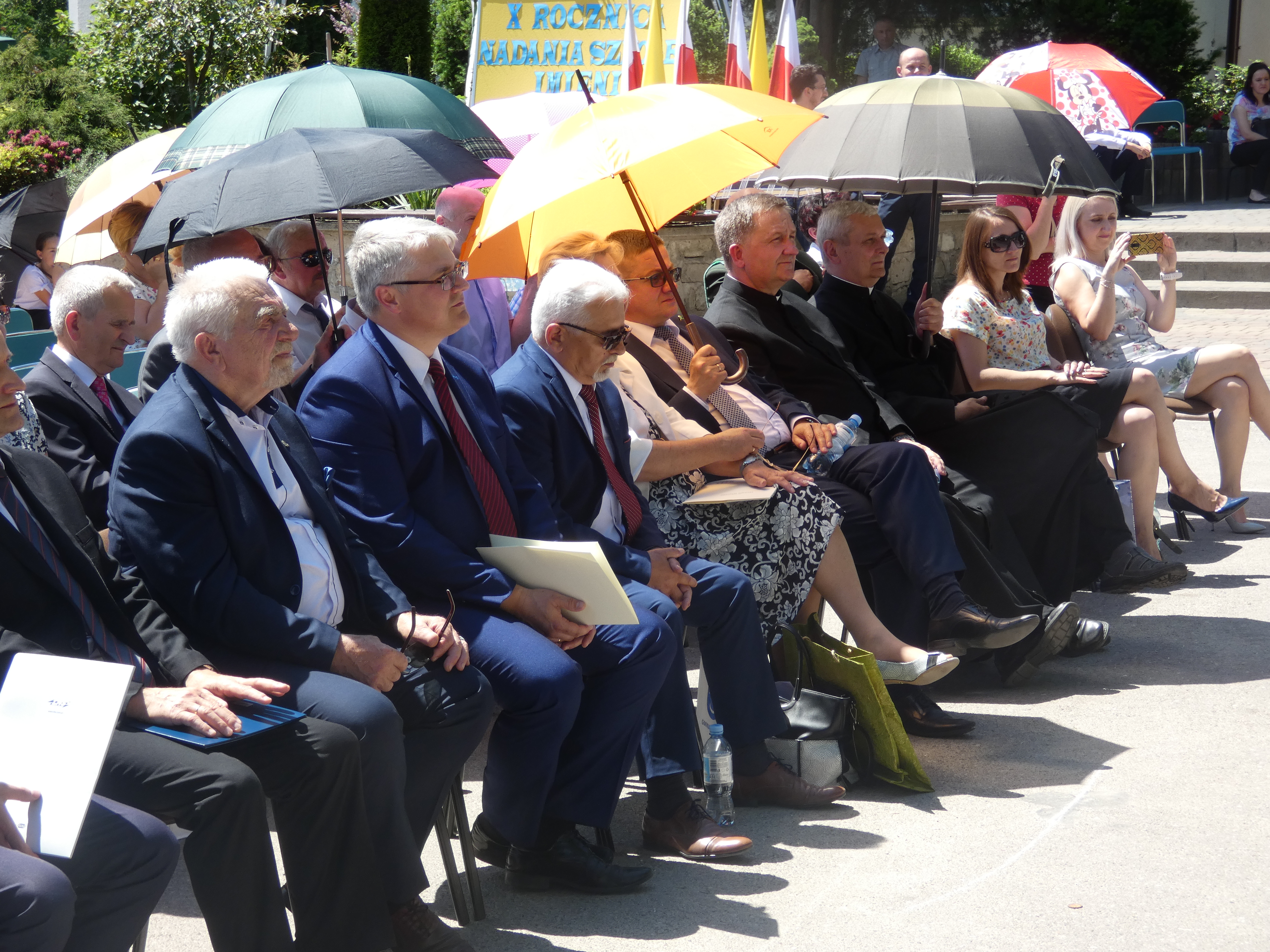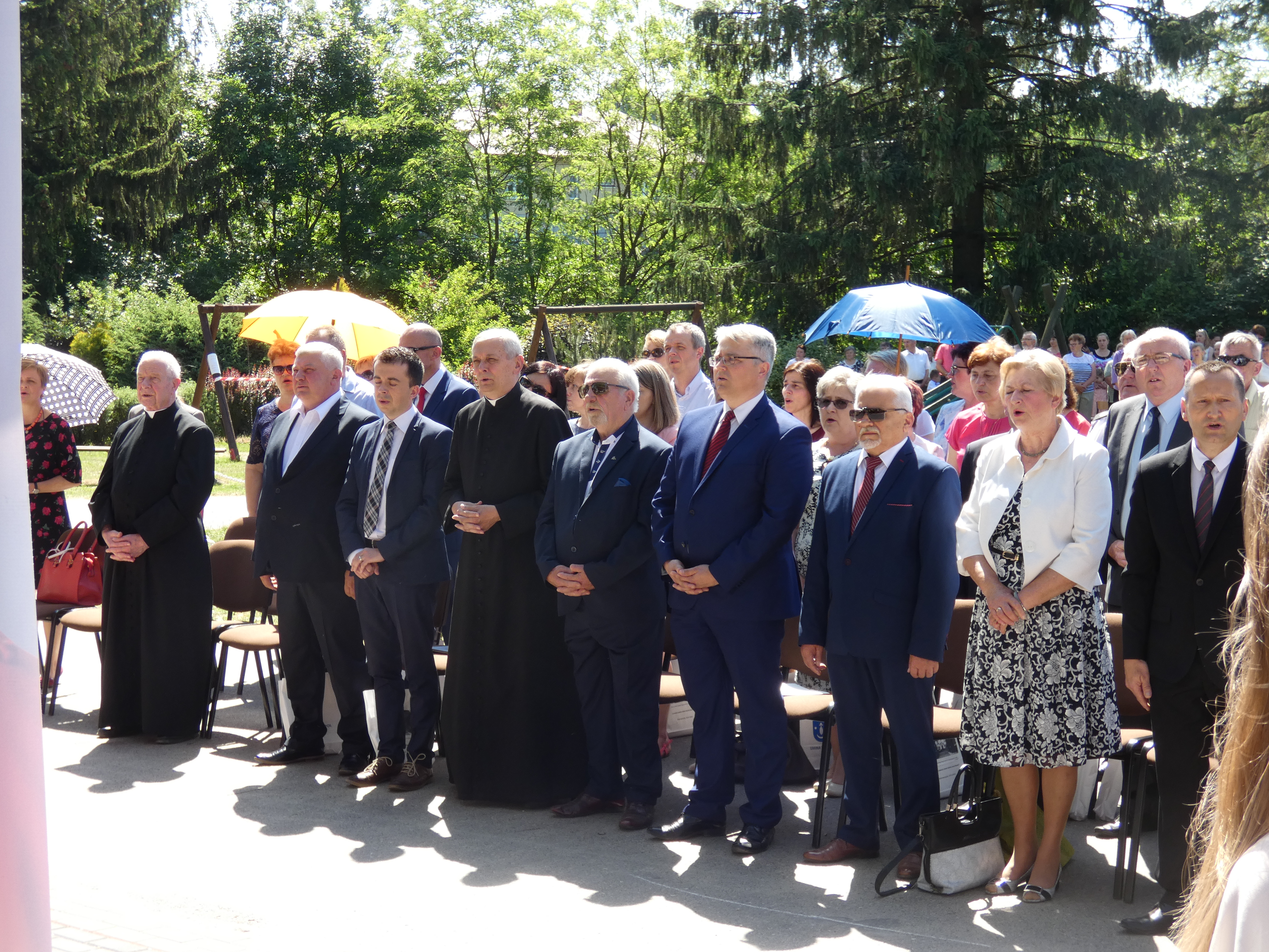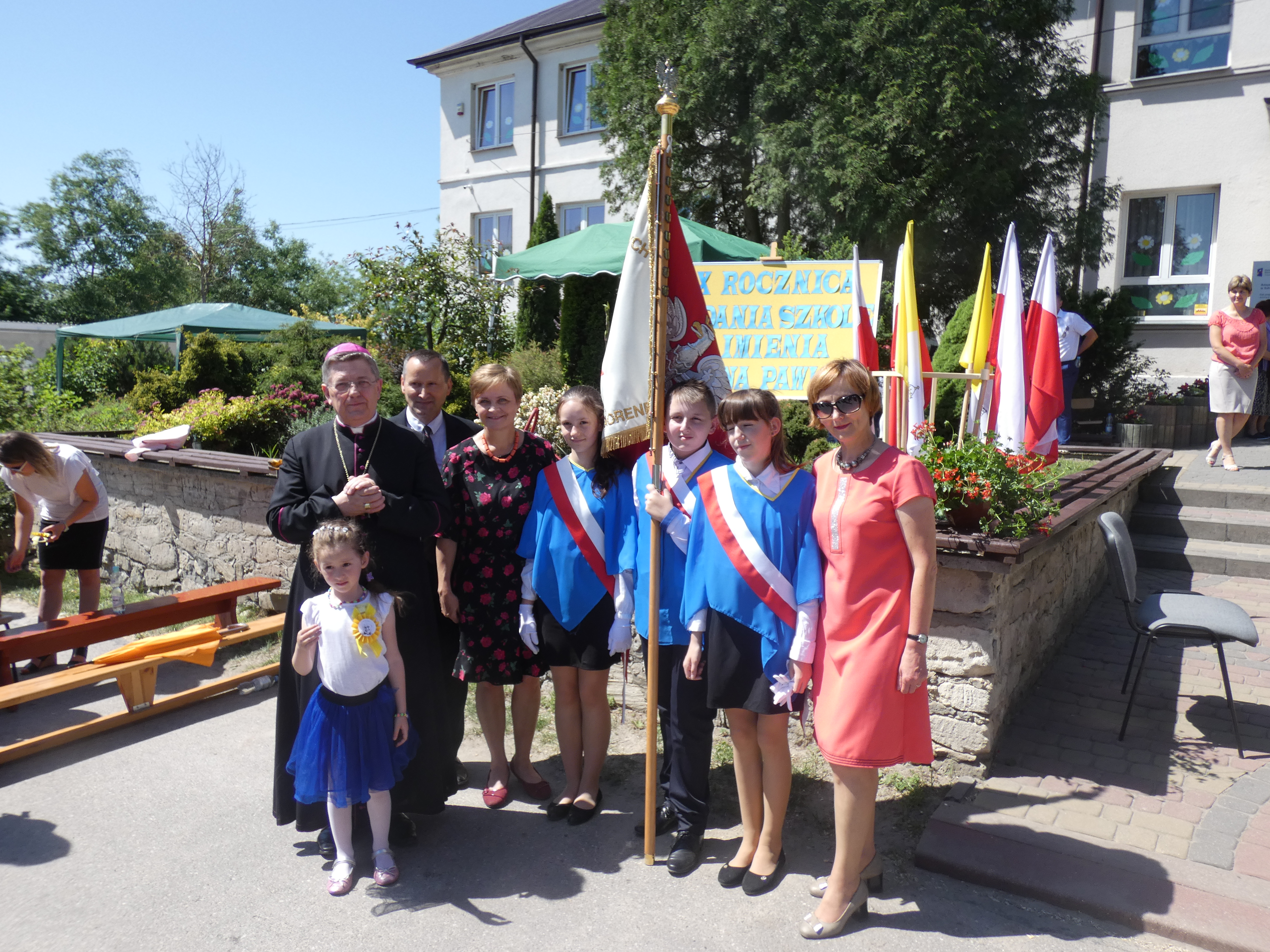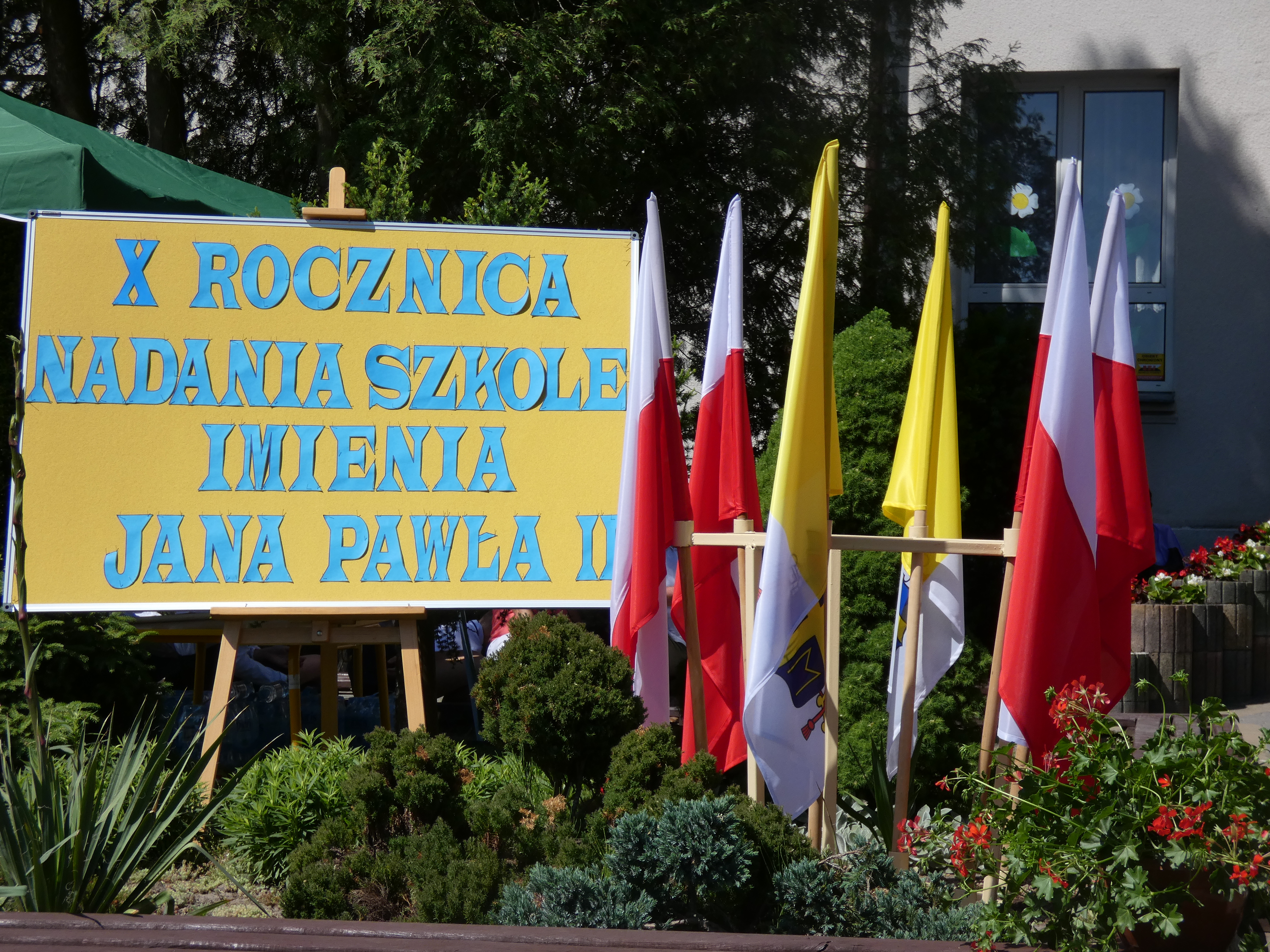 30 maja odbyły się obchody jubileuszowej X rocznicy nadania naszej szkole imienia Jana Pawła II. Uroczystość rozpoczęła się Mszą Świętą, której przewodniczył biskup pomocniczy naszej diecezji, Ksiądz Dr Hab. Mariusz Leszczyński. W homilii zwrócił się do zebranych gości, rodziców, uczniów i nauczycieli przypominając, czym jest służba Bogu, ludziom i Ojczyźnie. Po zakończeniu Mszy Świętej Dyrektor Szkoły Pan Stanisław Saj powitał wszystkich zebranych na uroczystości gości a następnie, w swoim bogatym w treści przemówieniu, wyjaśniał, w jaki sposób nasza szkoła realizuje w swej codziennej działalności przesłanie św. Jana Pawła II. Jego wystąpienie nawiązywało nie tylko do X rocznicy nadania szkole imienia Jana Pawła II, ale także do stulecia odzyskania przez Polskę niepodległości. Pan Dyrektor zwrócił szczególną uwagę na miłość wobec Ojczyzny, tak ważną w życiu każdego człowieka i przytoczył wypowiedź Jana Pawła II, która doskonale ukazuje nam współczesne znaczenie słowa patriotyzm: "Służba Ojczyźnie nie zawsze wymaga ofiary krwi, ale żąda także ofiary wytrwałej pracy, nauki, wychowania młodego pokolenia i pielęgnowania kultury." Na zakończenie swojej przemowy życzył, abyśmy czerpali z bogactwa, jakie zostawił nam Jan Paweł II i patrząc na osobę Papieża Polaka, uczyli się miłości i patriotyzmu. Następnie dzieci z oddziału przedszkolnego, w imieniu całej społeczności uczniowskiej naszej szkoły, przywitały wszystkich przepięknie zatańczonym polonezem, który zachwycił naszych gości. Kolejną wzruszającą częścią jubileuszu był koncert w wykonaniu chórku szkolnego. Po występach artystycznych krótkie przemówienia wygłosiło wielu z licznie przybyłych gości.