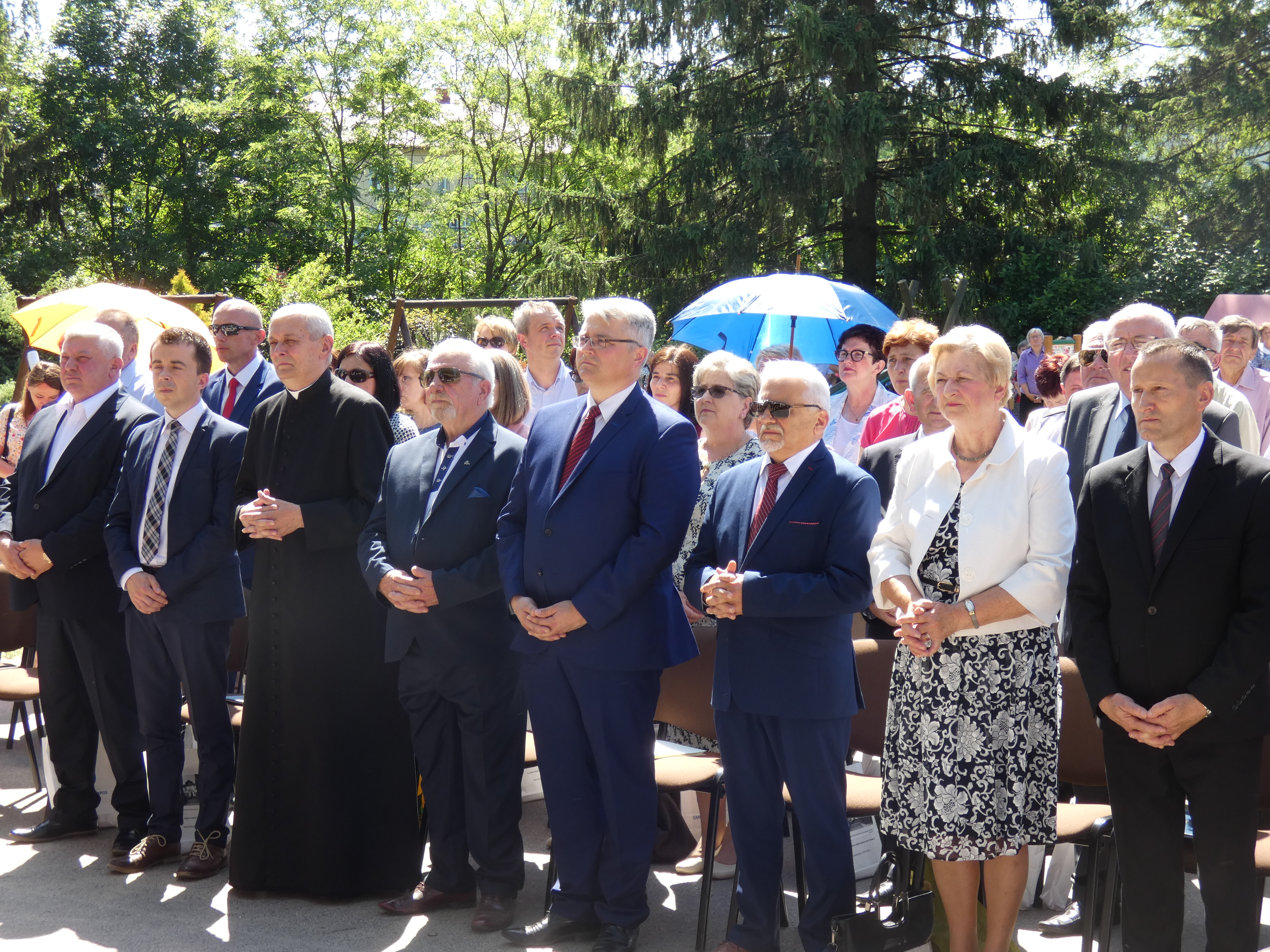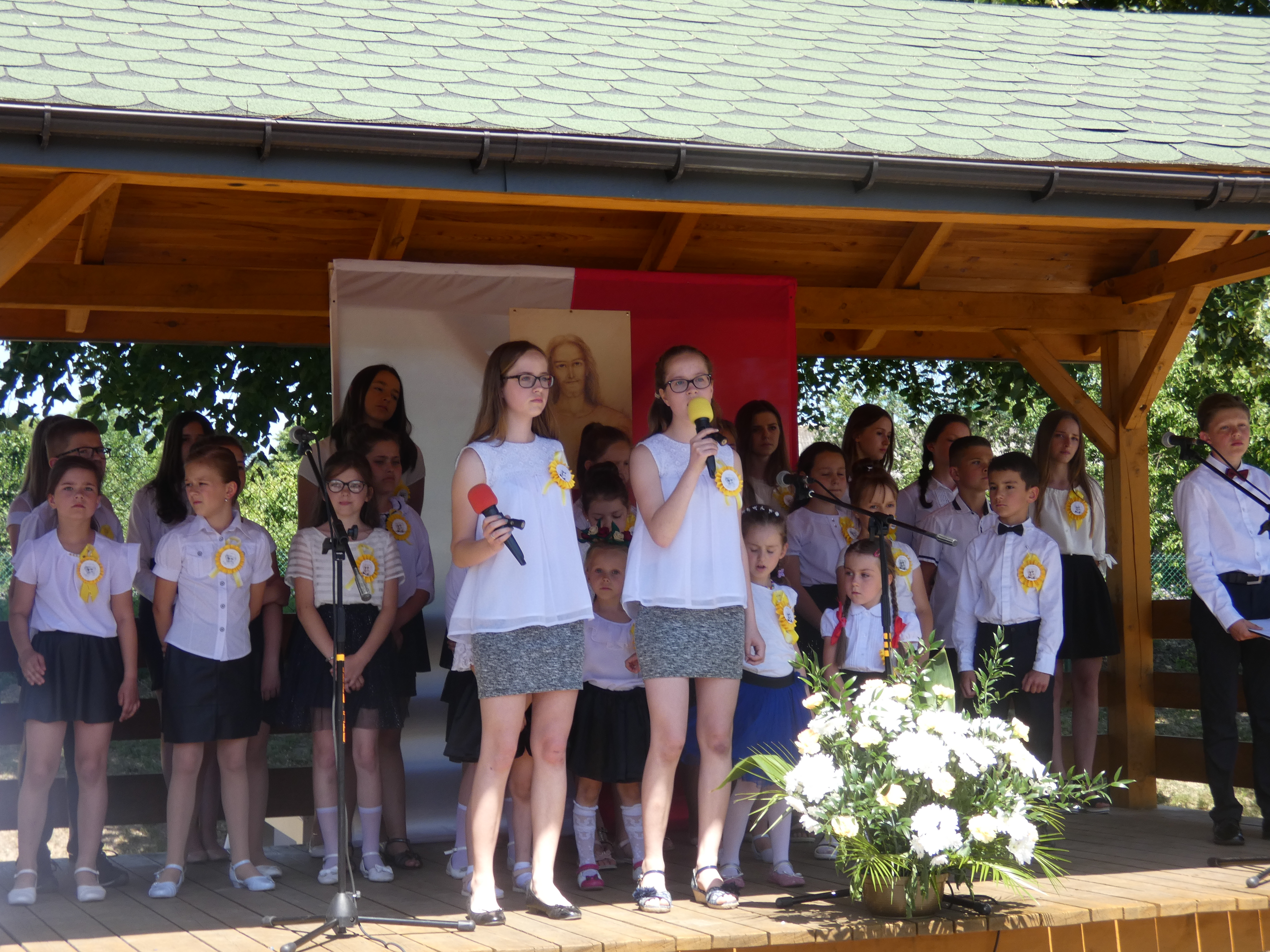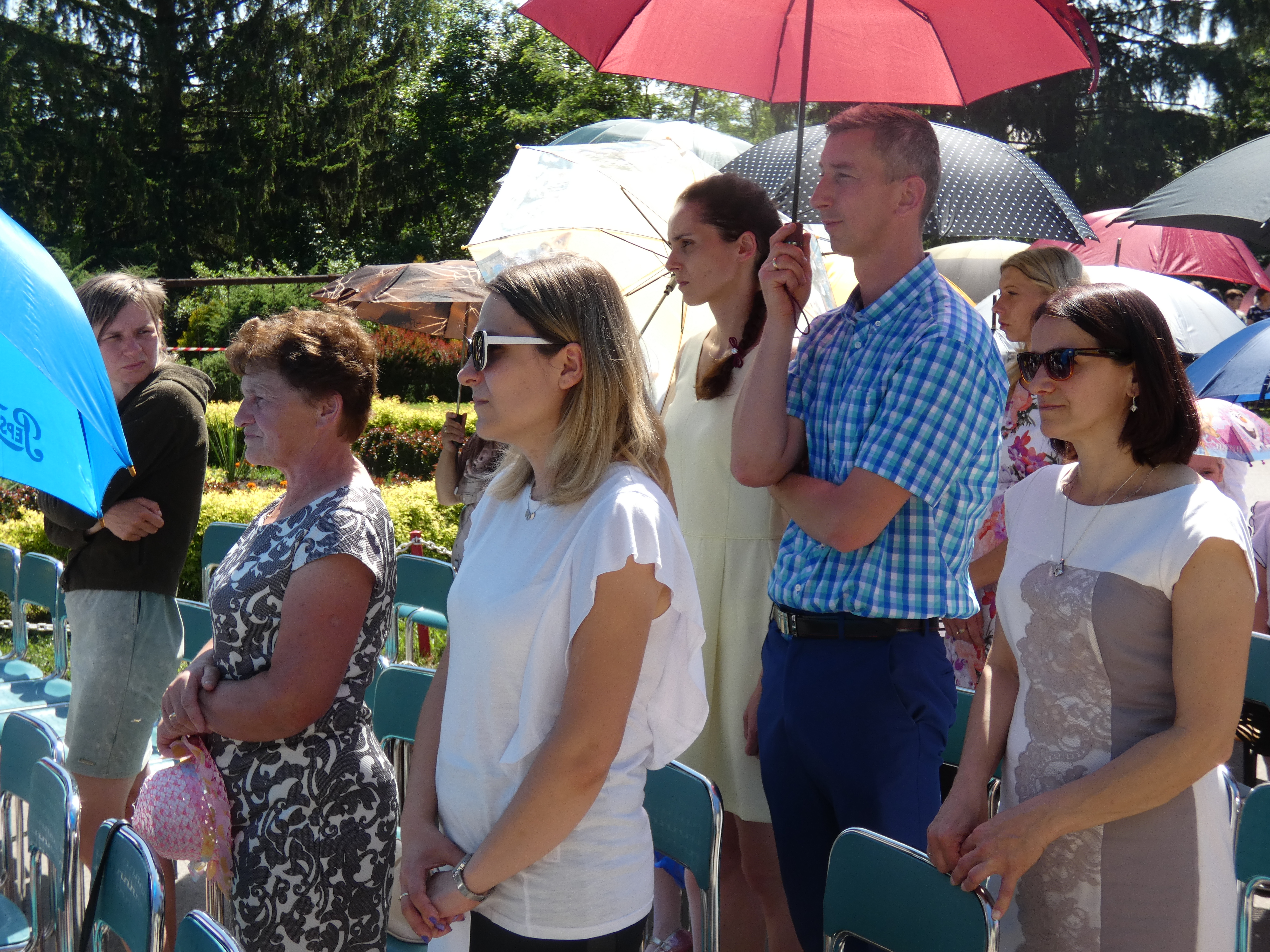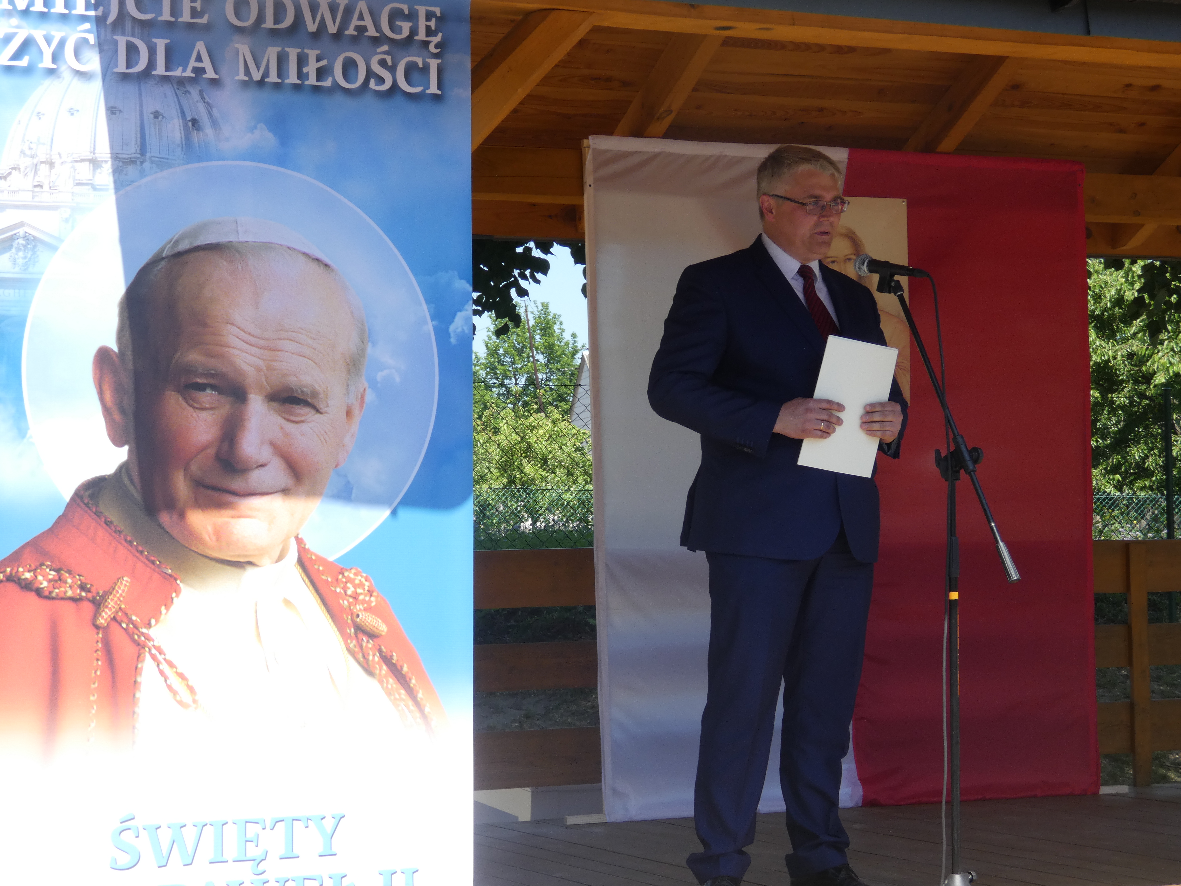 30 maja odbyły się obchody jubileuszowej X rocznicy nadania naszej szkole imienia Jana Pawła II. Uroczystość rozpoczęła się Mszą Świętą, której przewodniczył biskup pomocniczy naszej diecezji, Ksiądz Dr Hab. Mariusz Leszczyński. W homilii zwrócił się do zebranych gości, rodziców, uczniów i nauczycieli przypominając, czym jest służba Bogu, ludziom i Ojczyźnie. Po zakończeniu Mszy Świętej Dyrektor Szkoły Pan Stanisław Saj powitał wszystkich zebranych na uroczystości gości a następnie, w swoim bogatym w treści przemówieniu, wyjaśniał, w jaki sposób nasza szkoła realizuje w swej codziennej działalności przesłanie św. Jana Pawła II. Jego wystąpienie nawiązywało nie tylko do X rocznicy nadania szkole imienia Jana Pawła II, ale także do stulecia odzyskania przez Polskę niepodległości. Pan Dyrektor zwrócił szczególną uwagę na miłość wobec Ojczyzny, tak ważną w życiu każdego człowieka i przytoczył wypowiedź Jana Pawła II, która doskonale ukazuje nam współczesne znaczenie słowa patriotyzm: "Służba Ojczyźnie nie zawsze wymaga ofiary krwi, ale żąda także ofiary wytrwałej pracy, nauki, wychowania młodego pokolenia i pielęgnowania kultury." Na zakończenie swojej przemowy życzył, abyśmy czerpali z bogactwa, jakie zostawił nam Jan Paweł II i patrząc na osobę Papieża Polaka, uczyli się miłości i patriotyzmu. Następnie dzieci z oddziału przedszkolnego, w imieniu całej społeczności uczniowskiej naszej szkoły, przywitały wszystkich przepięknie zatańczonym polonezem, który zachwycił naszych gości. Kolejną wzruszającą częścią jubileuszu był koncert w wykonaniu chórku szkolnego. Po występach artystycznych krótkie przemówienia wygłosiło wielu z licznie przybyłych gości.