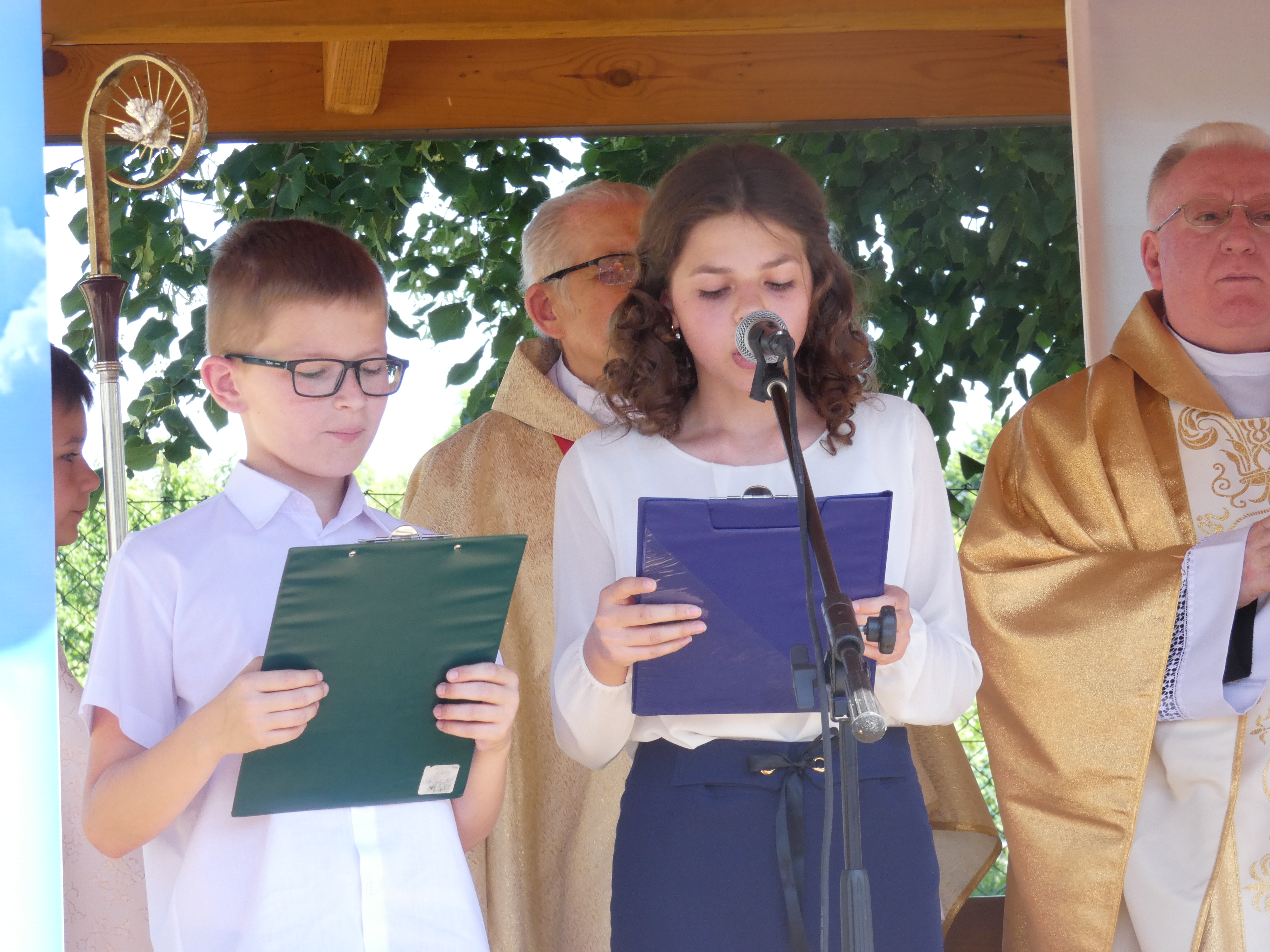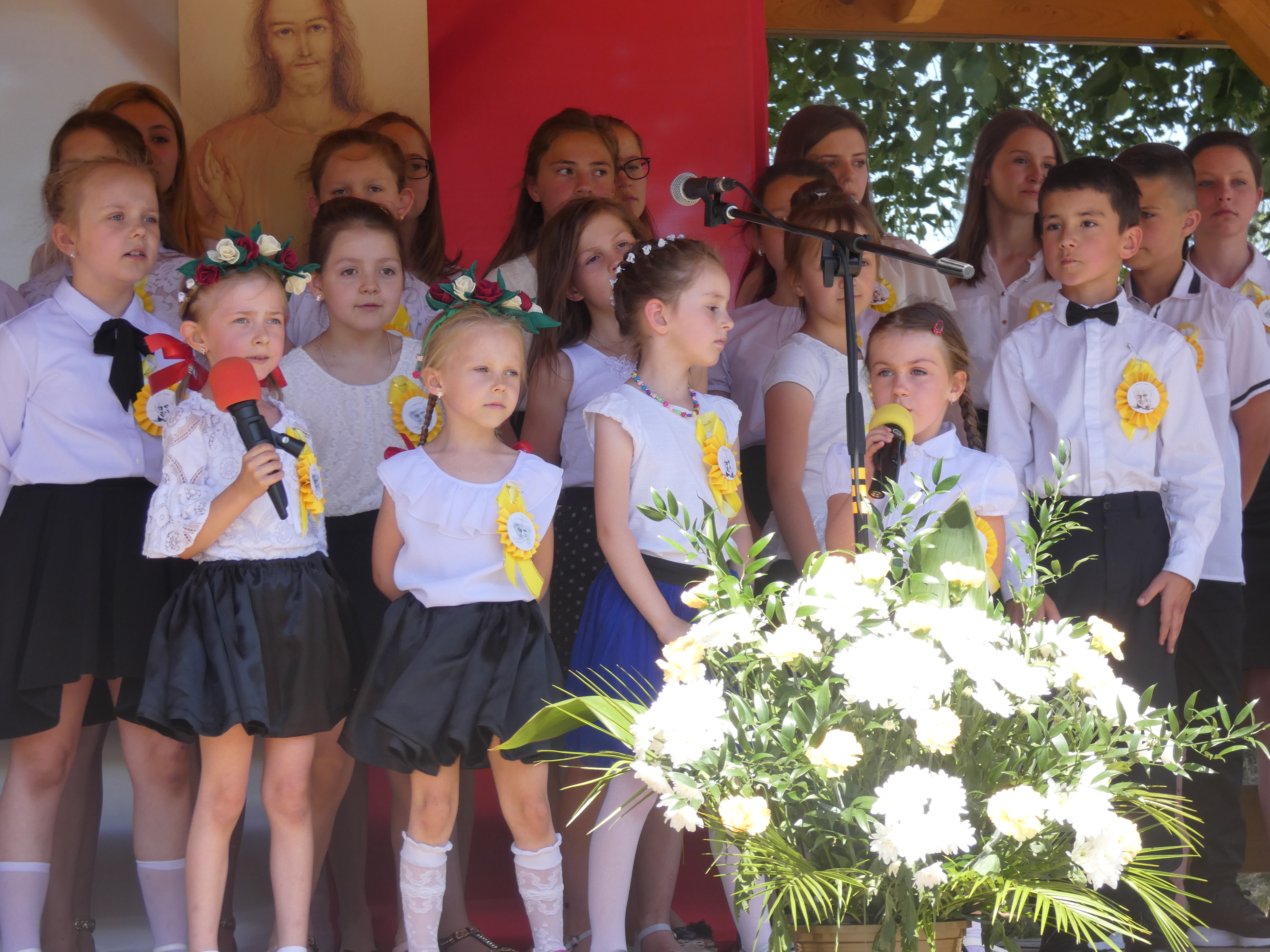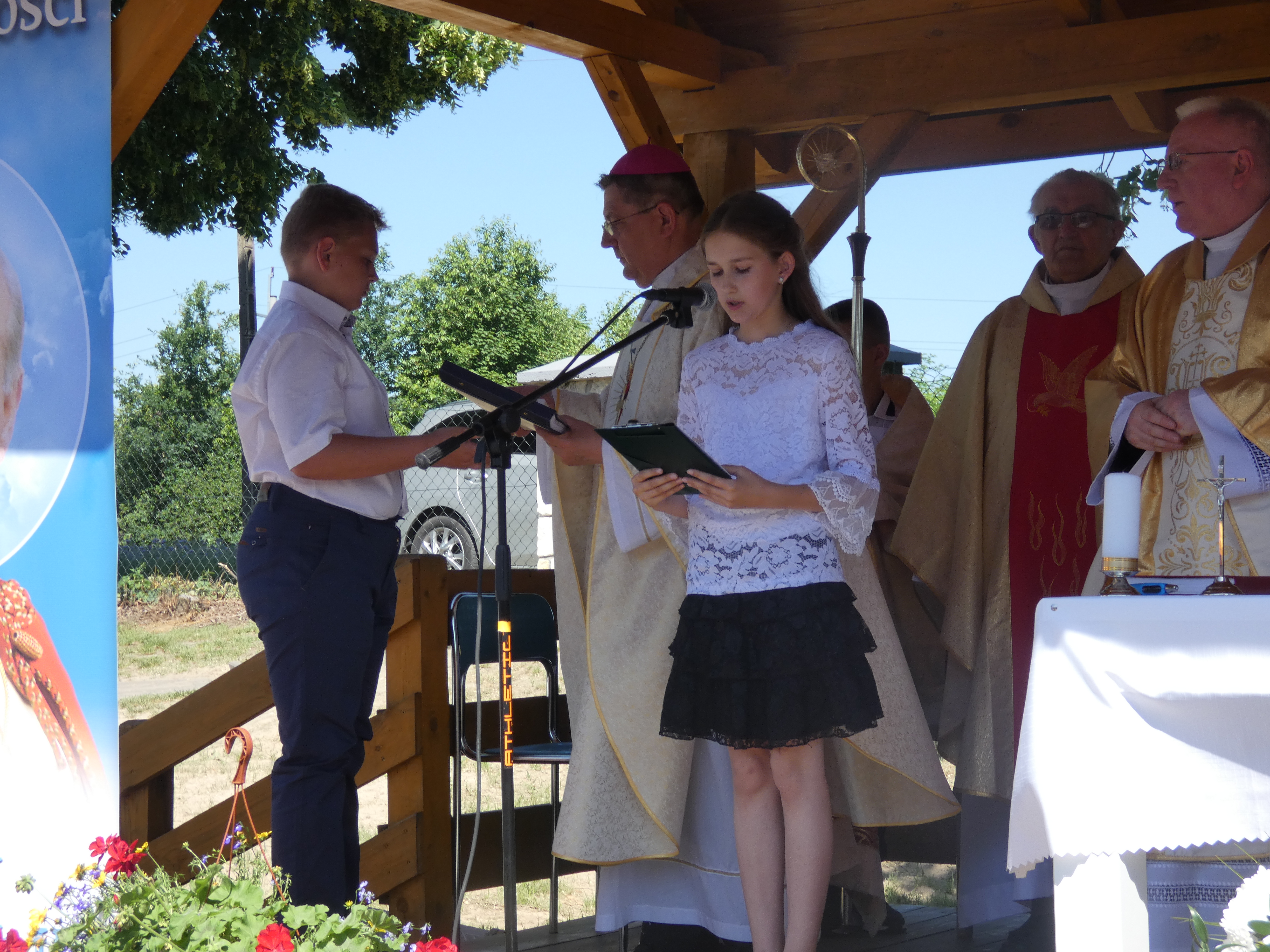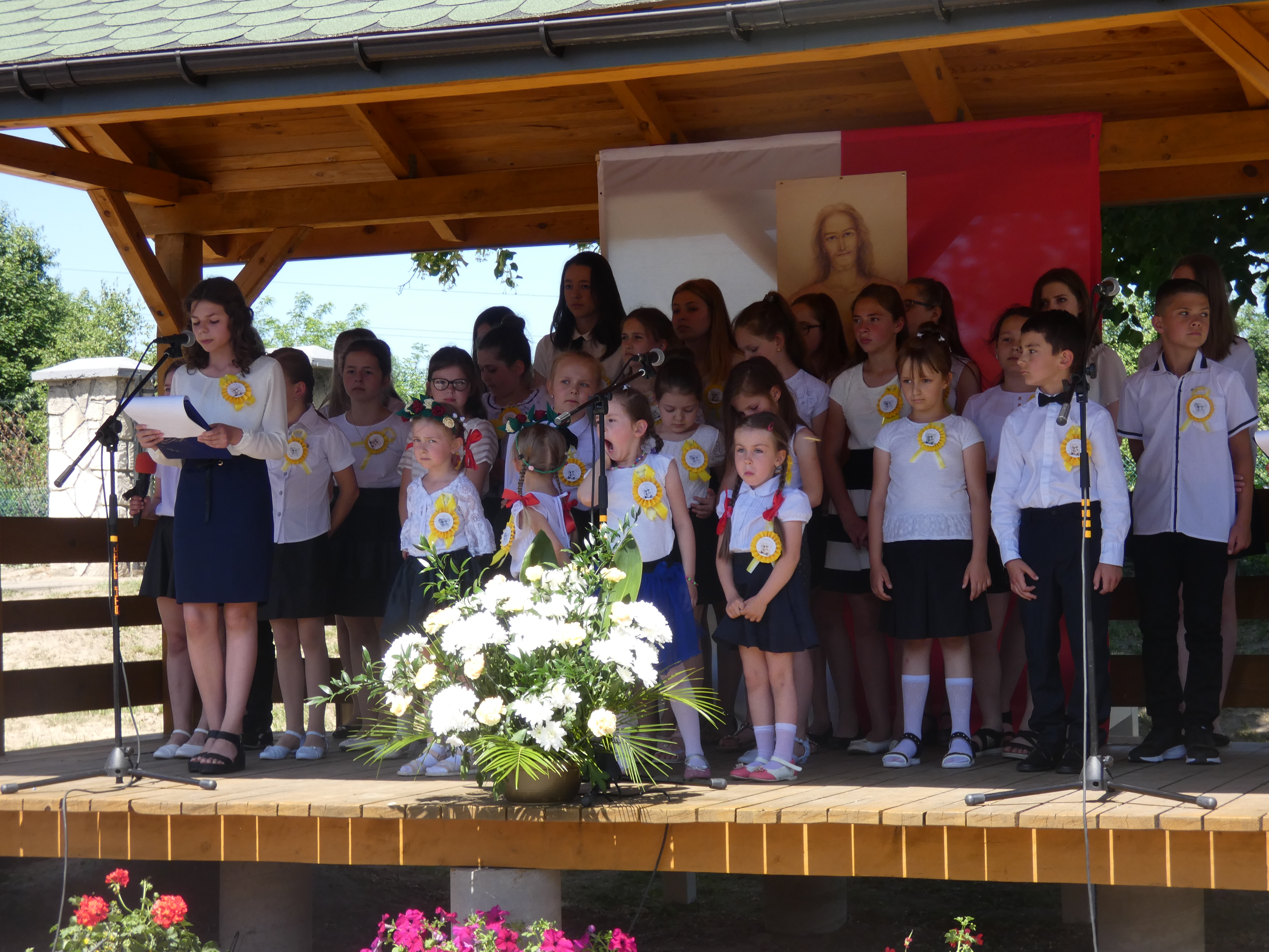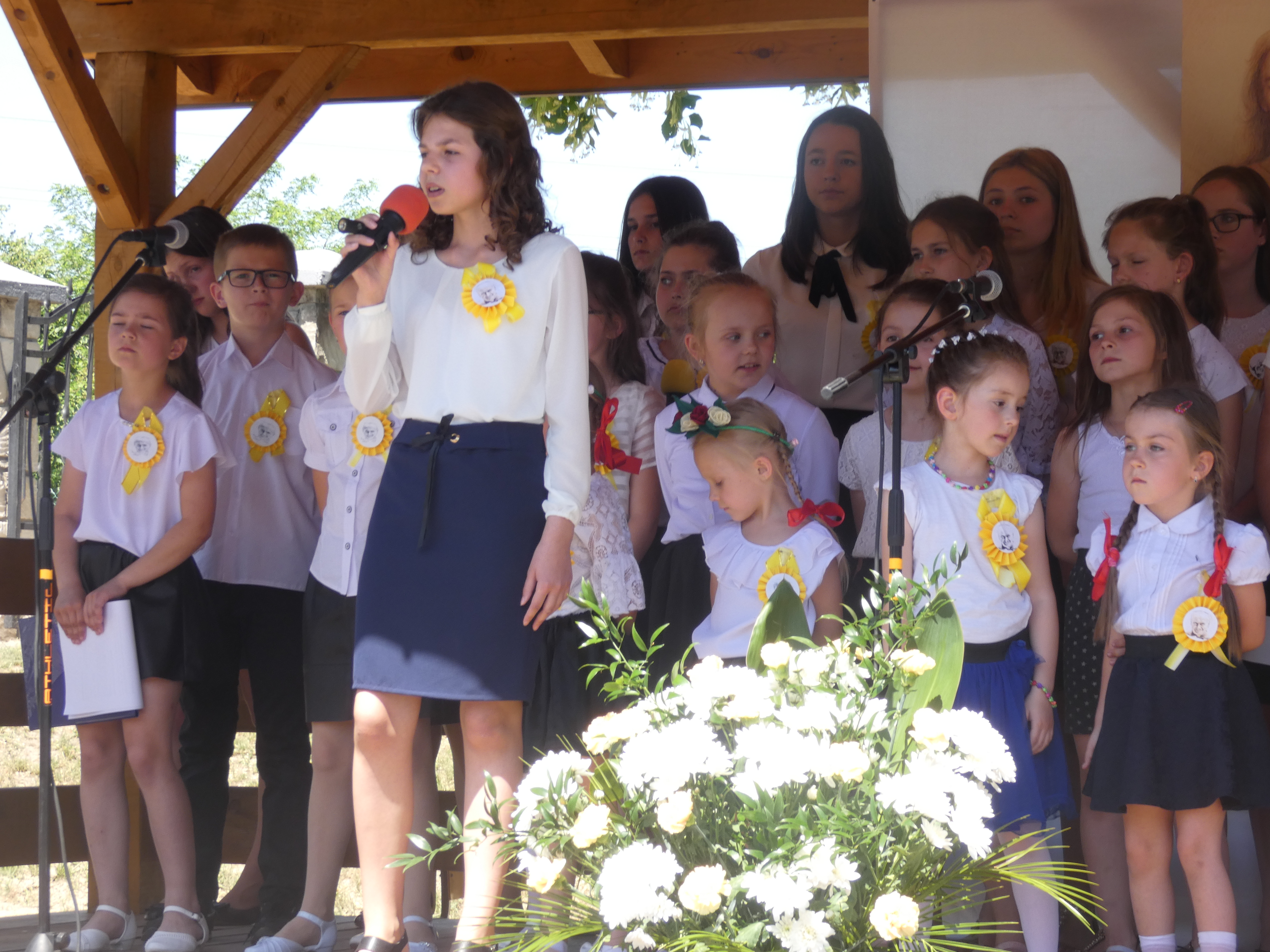 30 maja odbyły się obchody jubileuszowej X rocznicy nadania naszej szkole imienia Jana Pawła II. Uroczystość rozpoczęła się Mszą Świętą, której przewodniczył biskup pomocniczy naszej diecezji, Ksiądz Dr Hab. Mariusz Leszczyński. W homilii zwrócił się do zebranych gości, rodziców, uczniów i nauczycieli przypominając, czym jest służba Bogu, ludziom i Ojczyźnie. Po zakończeniu Mszy Świętej Dyrektor Szkoły Pan Stanisław Saj powitał wszystkich zebranych na uroczystości gości a następnie, w swoim bogatym w treści przemówieniu, wyjaśniał, w jaki sposób nasza szkoła realizuje w swej codziennej działalności przesłanie św. Jana Pawła II. Jego wystąpienie nawiązywało nie tylko do X rocznicy nadania szkole imienia Jana Pawła II, ale także do stulecia odzyskania przez Polskę niepodległości. Pan Dyrektor zwrócił szczególną uwagę na miłość wobec Ojczyzny, tak ważną w życiu każdego człowieka i przytoczył wypowiedź Jana Pawła II, która doskonale ukazuje nam współczesne znaczenie słowa patriotyzm: "Służba Ojczyźnie nie zawsze wymaga ofiary krwi, ale żąda także ofiary wytrwałej pracy, nauki, wychowania młodego pokolenia i pielęgnowania kultury." Na zakończenie swojej przemowy życzył, abyśmy czerpali z bogactwa, jakie zostawił nam Jan Paweł II i patrząc na osobę Papieża Polaka, uczyli się miłości i patriotyzmu. Następnie dzieci z oddziału przedszkolnego, w imieniu całej społeczności uczniowskiej naszej szkoły, przywitały wszystkich przepięknie zatańczonym polonezem, który zachwycił naszych gości. Kolejną wzruszającą częścią jubileuszu był koncert w wykonaniu chórku szkolnego. Po występach artystycznych krótkie przemówienia wygłosiło wielu z licznie przybyłych gości.