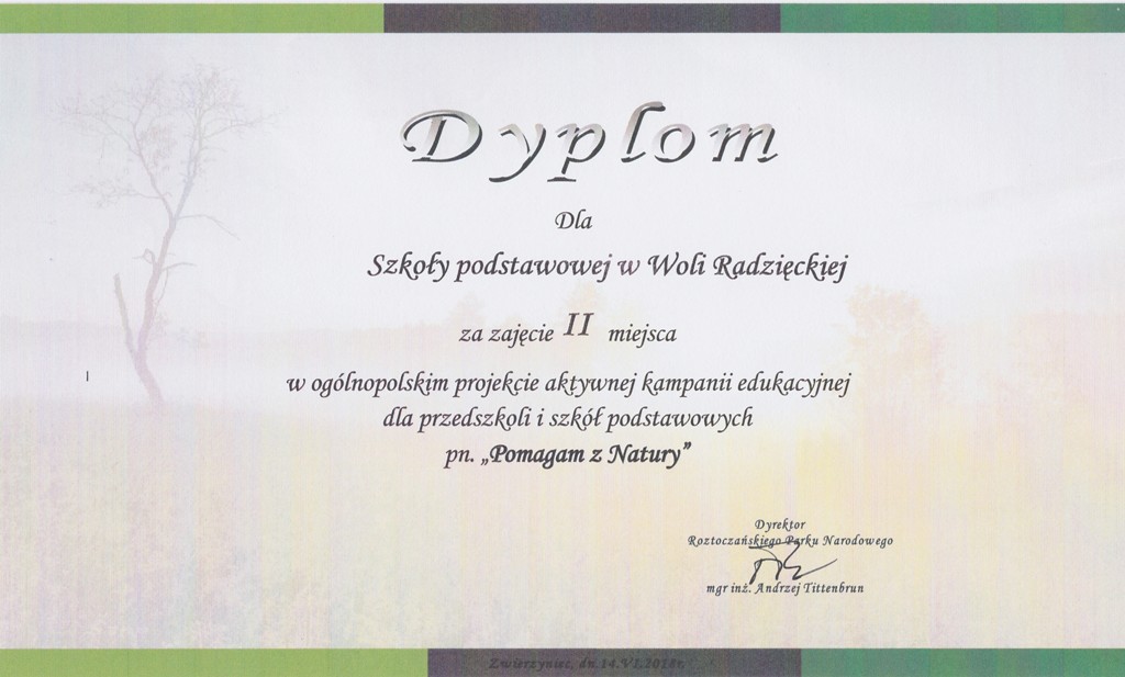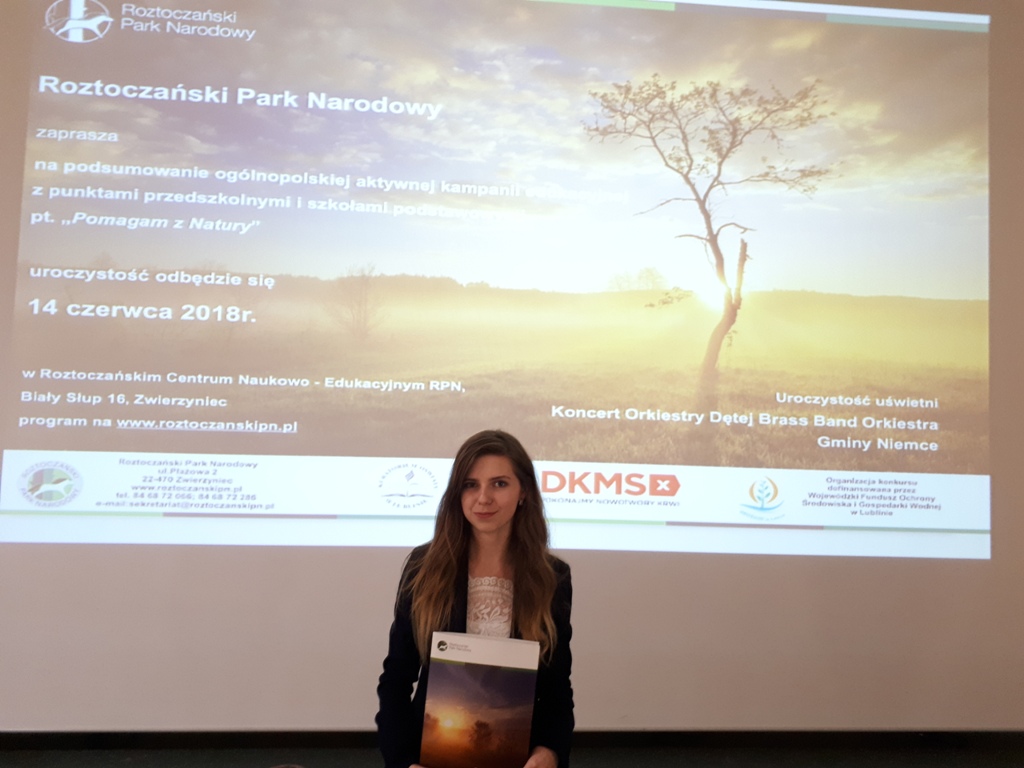 14 czerwca uczniowie klas III i IV oraz uczennica kl. VII Karolina Brzozowska uczestniczyli w podsumowaniu konkursu "Pomagam z natury", który odbył się w Ośrodku Edukacyjno-Muzealnym Roztoczańskiego Parku Narodowego w Zwierzyńcu.