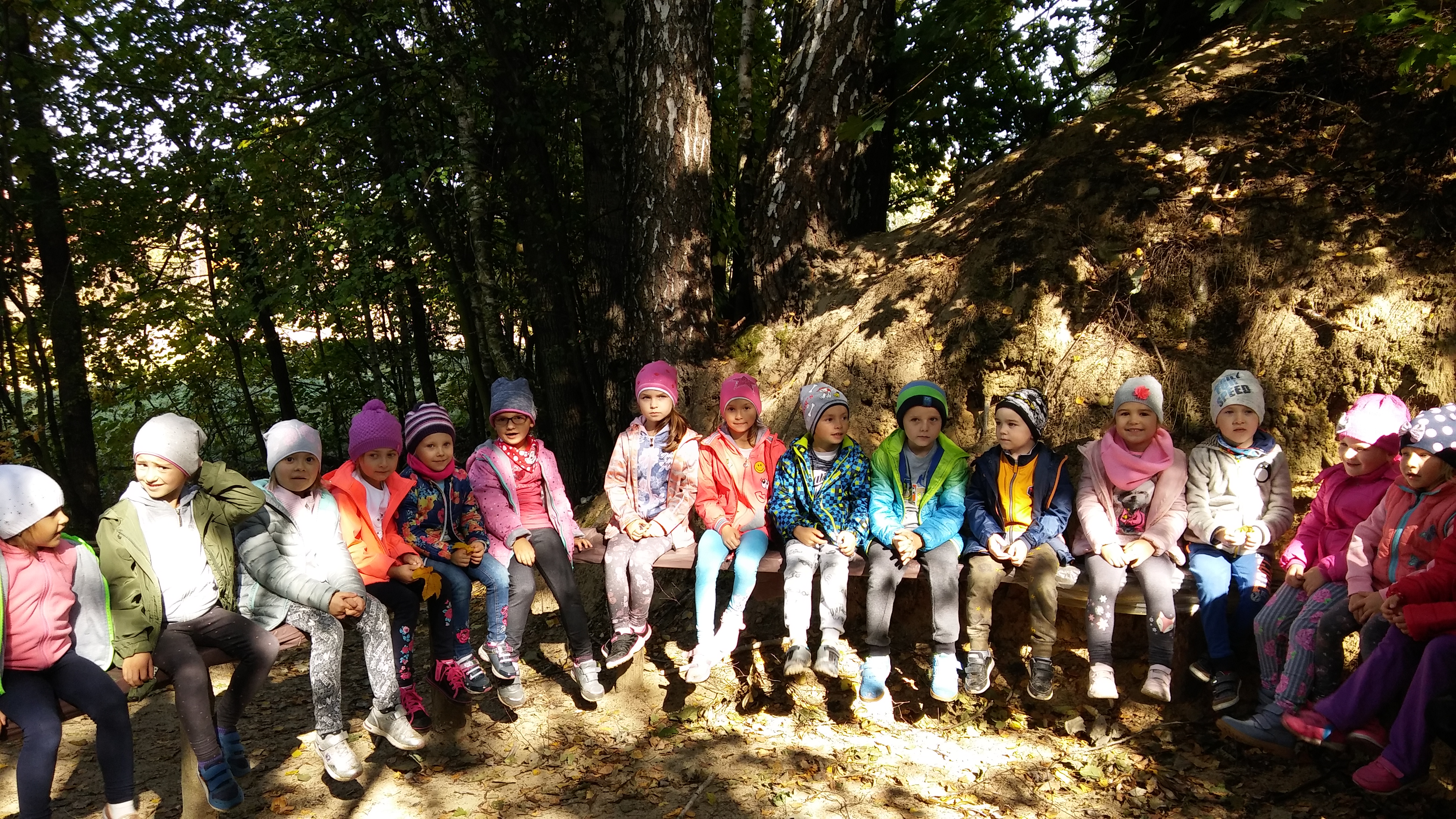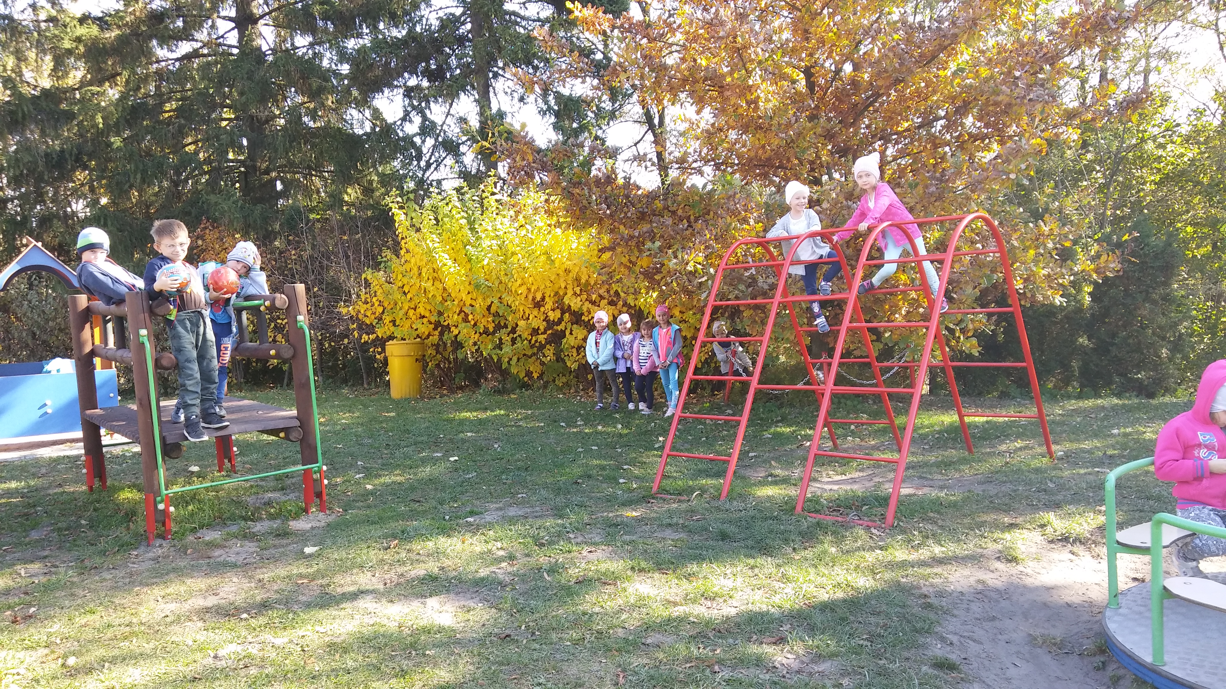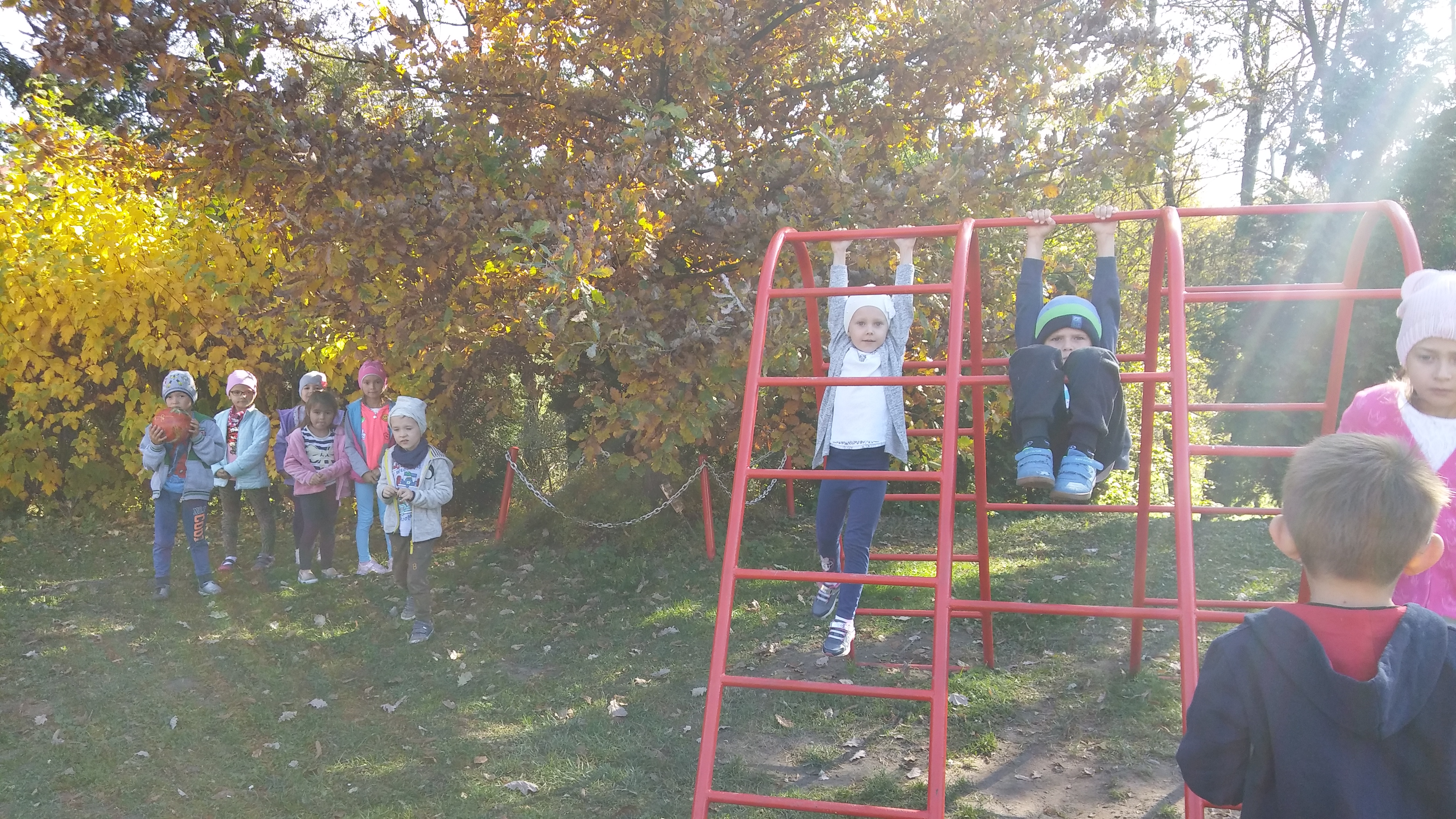 Jesień to piękna pora roku. Przedszkolaki korzystając ze słonecznej aury spacerują i bawią się w ogrodzie przedszkolnym. Dzieci zbierają dary jesieni: kolorowe liście, kasztany, żołędzie, szyszki z których wykonają później prace plastyczne.  Spacery po okolicy pozwalają również zaobserwować zmieniającą się przyrodę. Najwięcej radości dają jednak maluchom zabawy na placu zabaw.