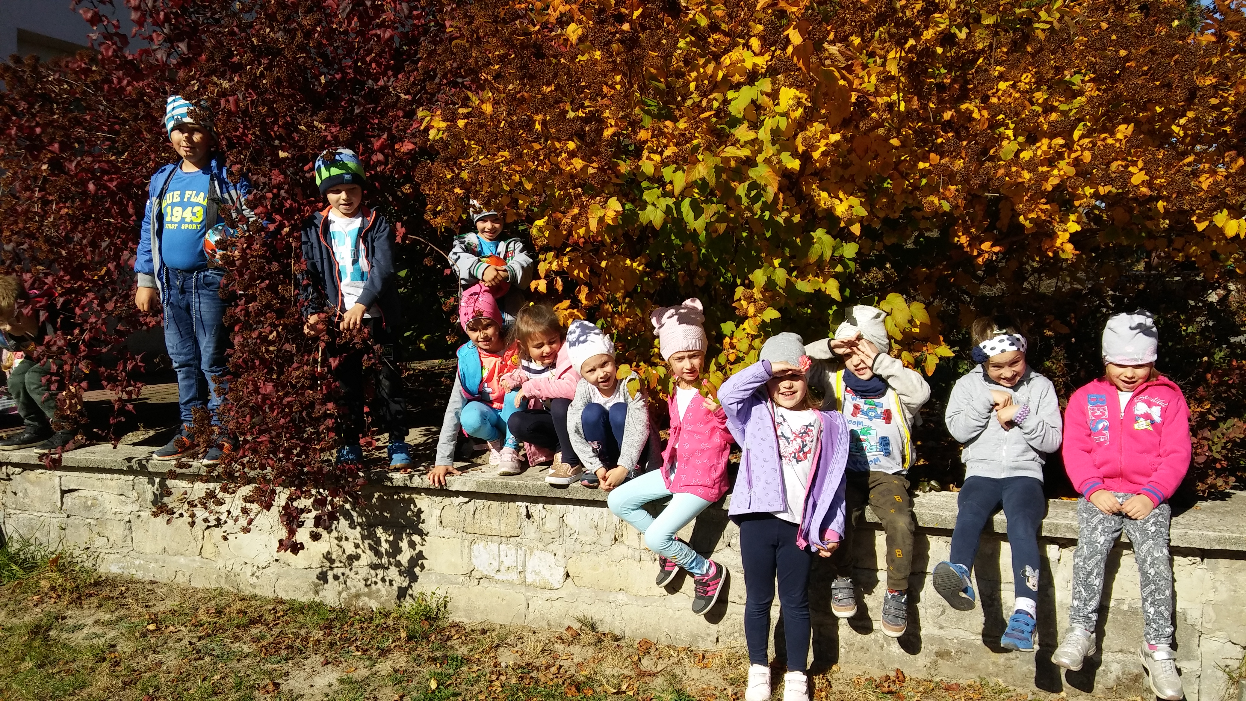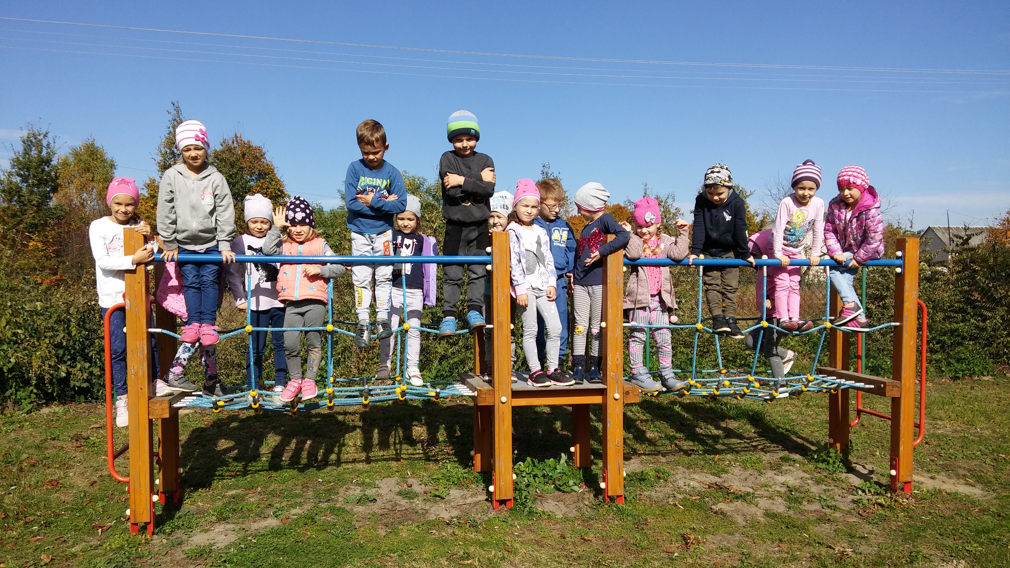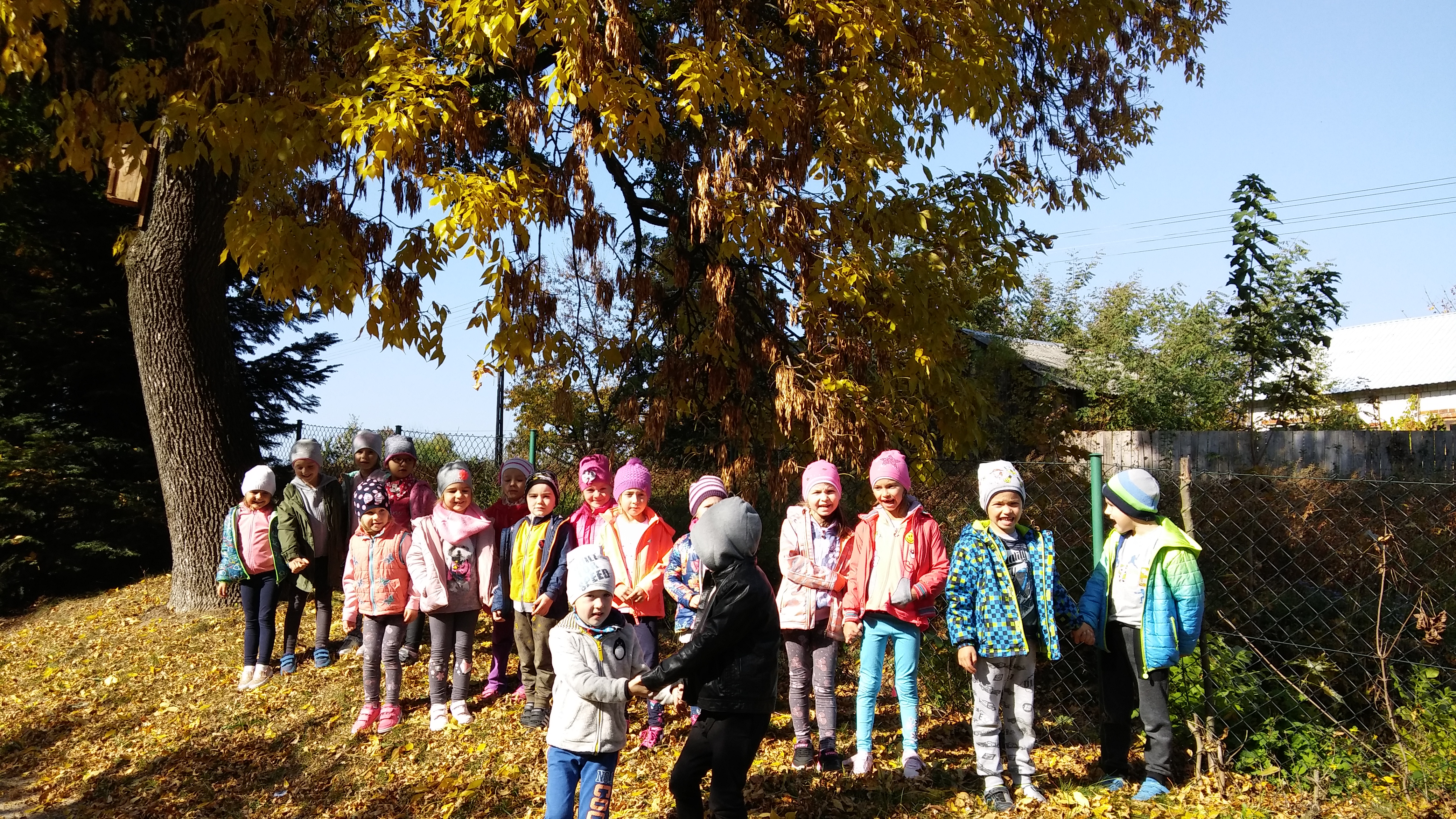 Jesień to piękna pora roku. Przedszkolaki korzystając ze słonecznej aury spacerują i bawią się w ogrodzie przedszkolnym. Dzieci zbierają dary jesieni: kolorowe liście, kasztany, żołędzie, szyszki z których wykonają później prace plastyczne. Spacery po okolicy pozwalają również zaobserwować zmieniającą się przyrodę. Najwięcej radości dają jednak maluchom zabawy na placu zabaw.