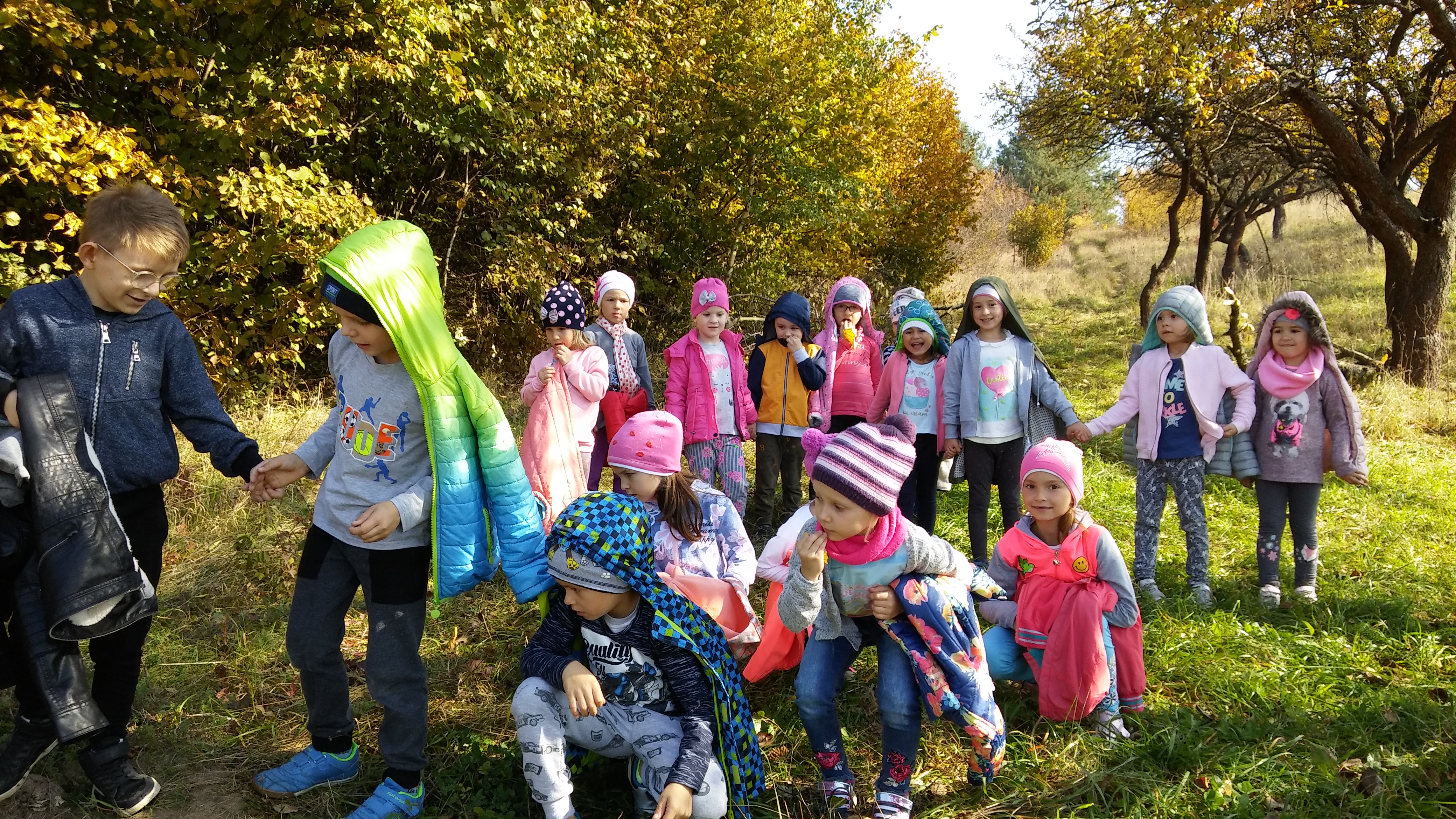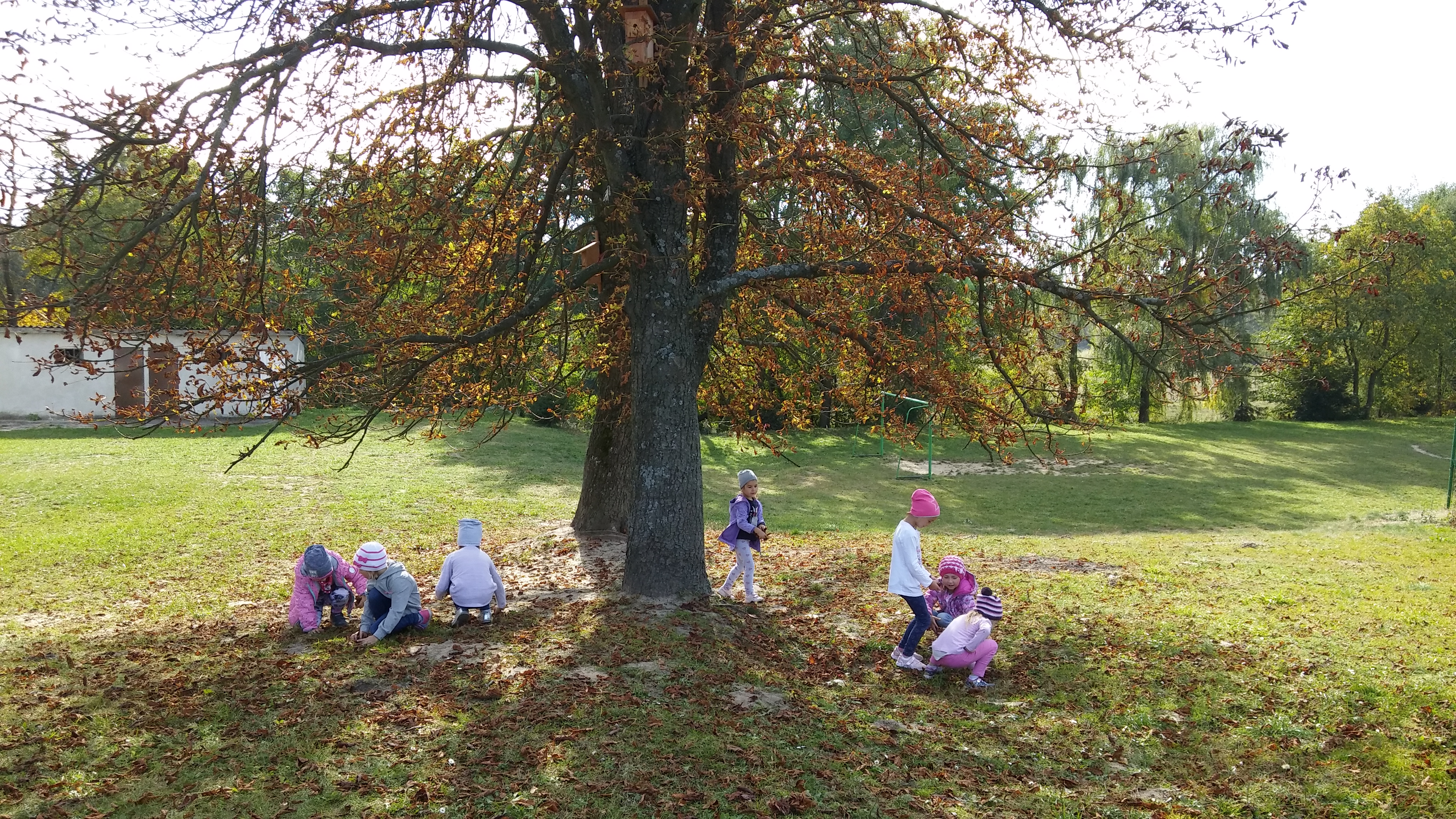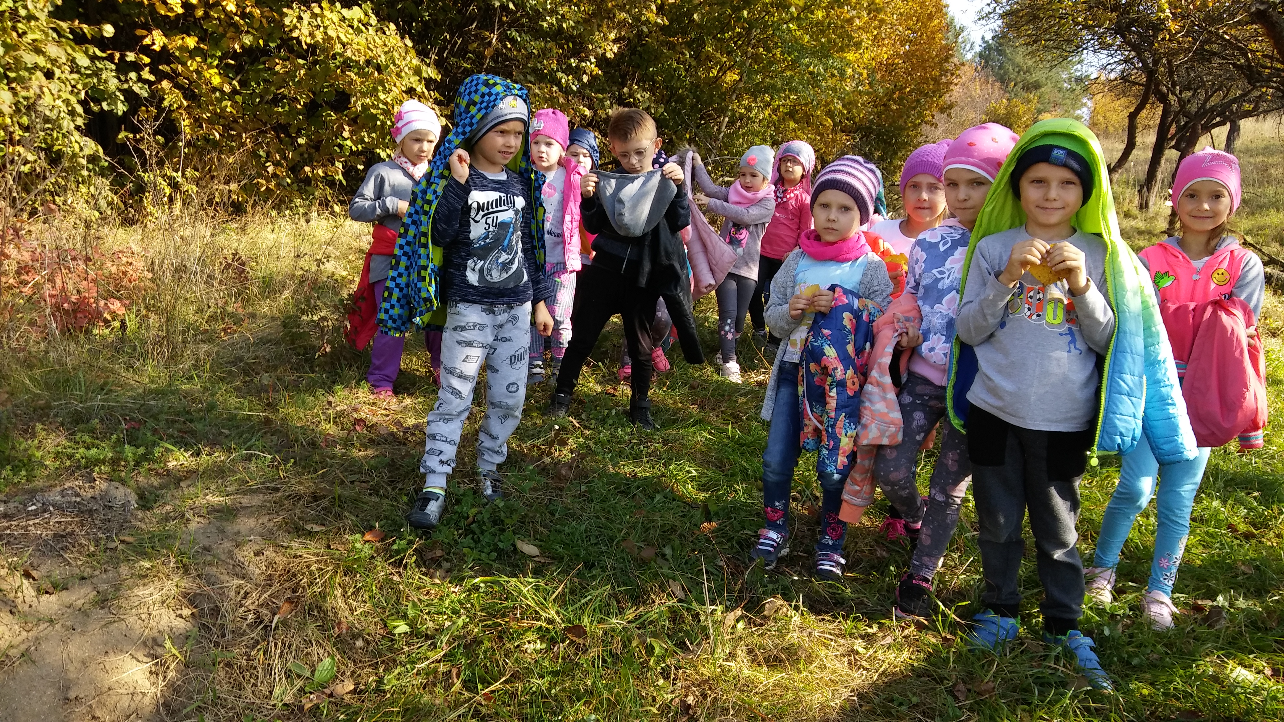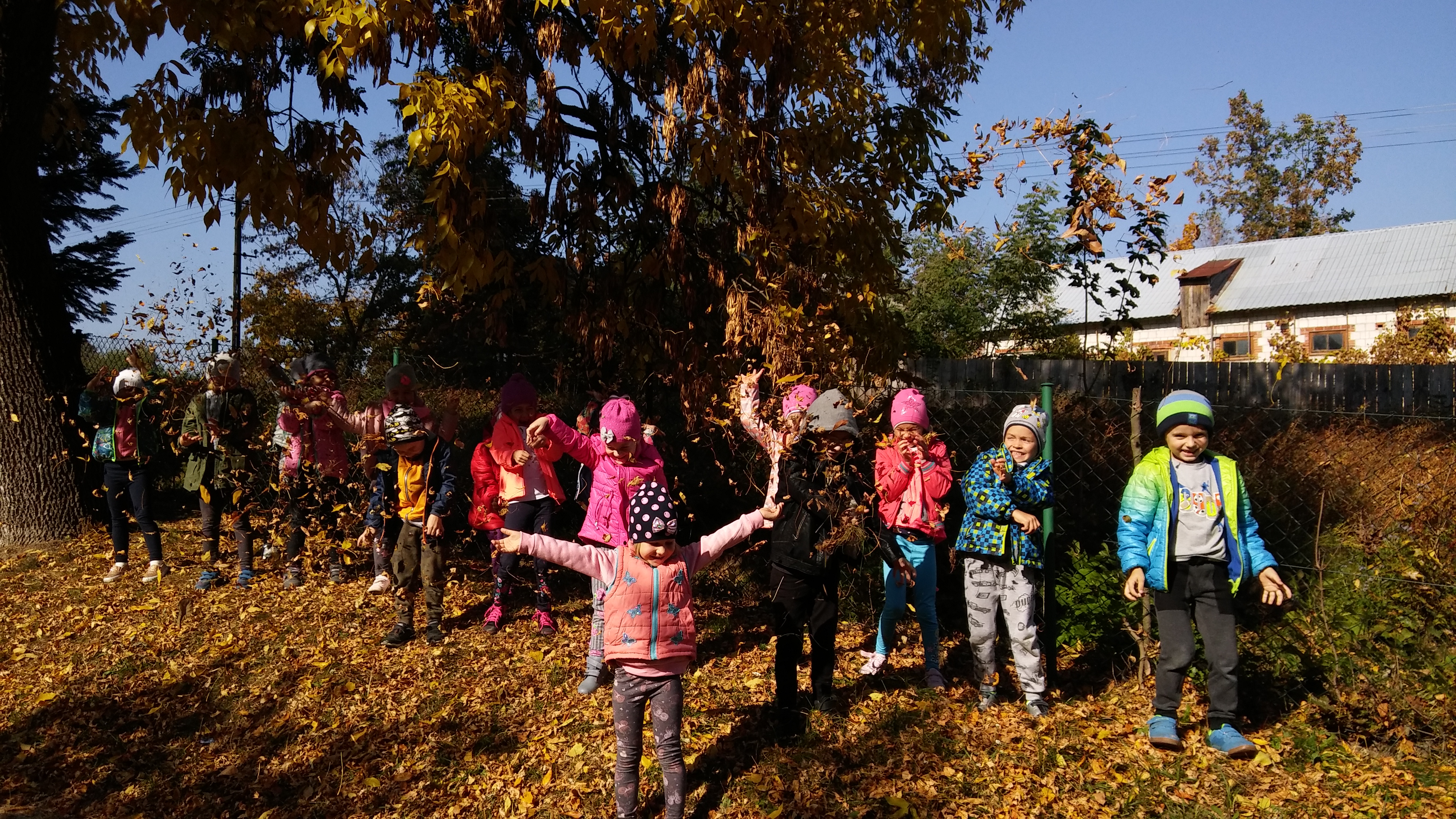 Jesień to piękna pora roku. Przedszkolaki korzystając ze słonecznej aury spacerują i bawią się w ogrodzie przedszkolnym. Dzieci zbierają dary jesieni: kolorowe liście, kasztany, żołędzie, szyszki z których wykonają później prace plastyczne. Spacery po okolicy pozwalają również zaobserwować zmieniającą się przyrodę. Najwięcej radości dają jednak maluchom zabawy na placu zabaw.