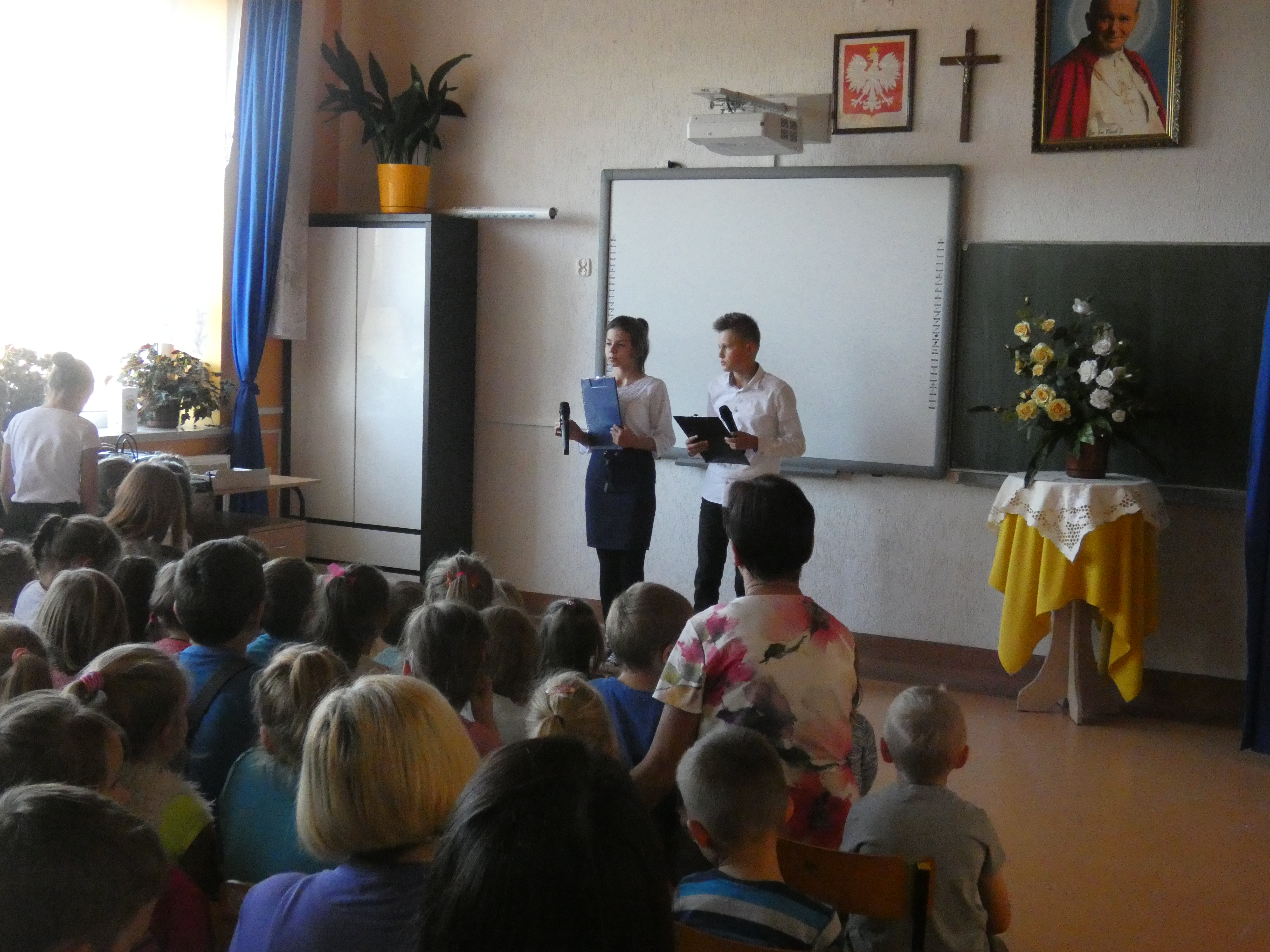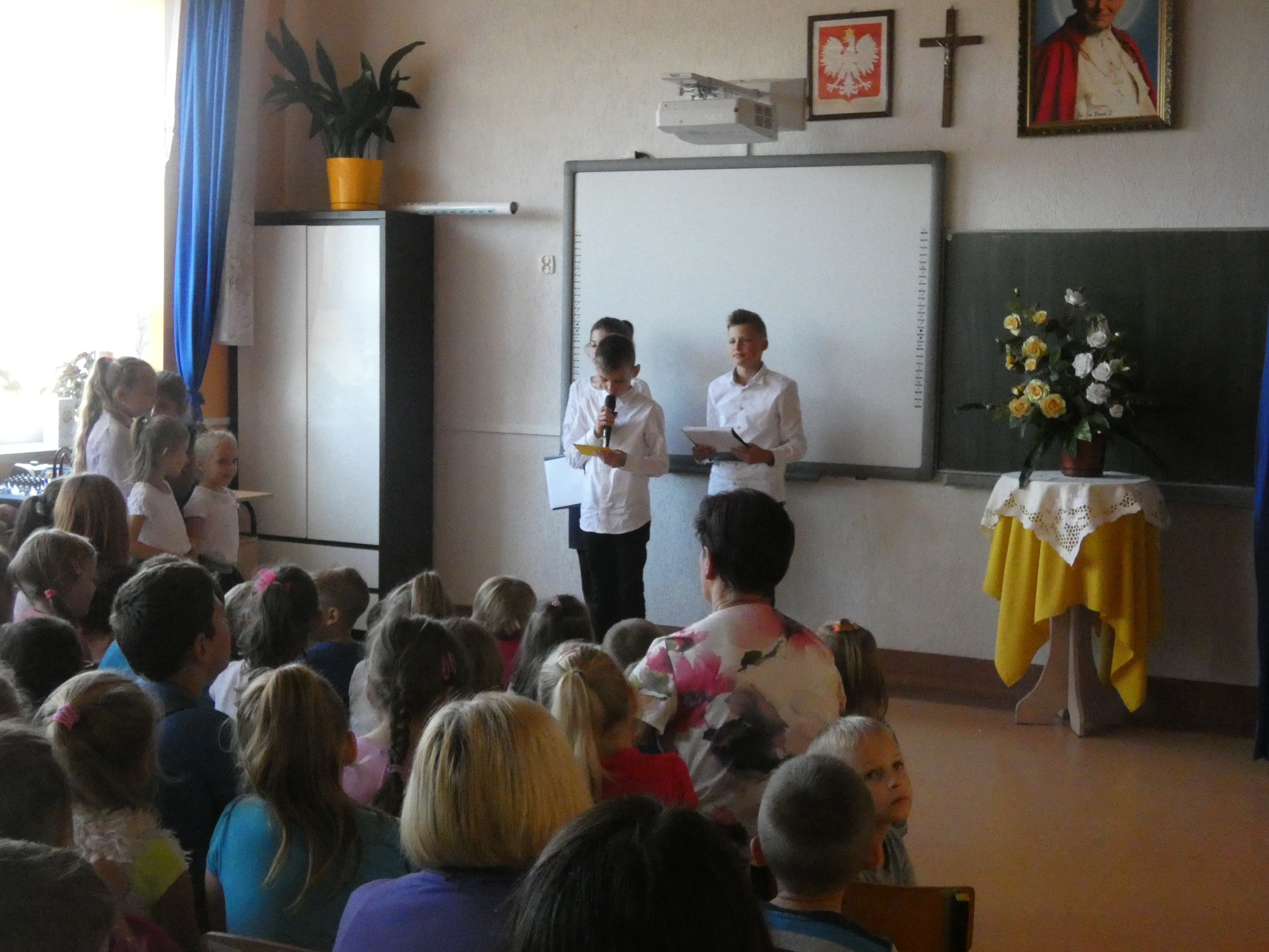 W nauczaniu Papieża wielokrotnie przewijał się temat Ojcostwa. Zawsze ukazywał Boga jako kochającego Ojca. Sam także stał się Ojcem dla wielu, najpierw jako kapłan a następnie jako Papież. Dla Jana Pawła II, tak jak i dla wielu Polaków, drogie było także słowo Ojczyzna, szczególnie w tym roku, gdy przeżywamy Setną Rocznicę Odzyskania Niepodległości. Na zakończenie, w duchowej łączności z Janem Pawłem II - Patronem naszej szkoły, odśpiewaliśmy Hymn Rodziny Szkół. Dziękujemy ks. proboszczowi Adamowi Czupichowi za obecność na naszej uroczystości.