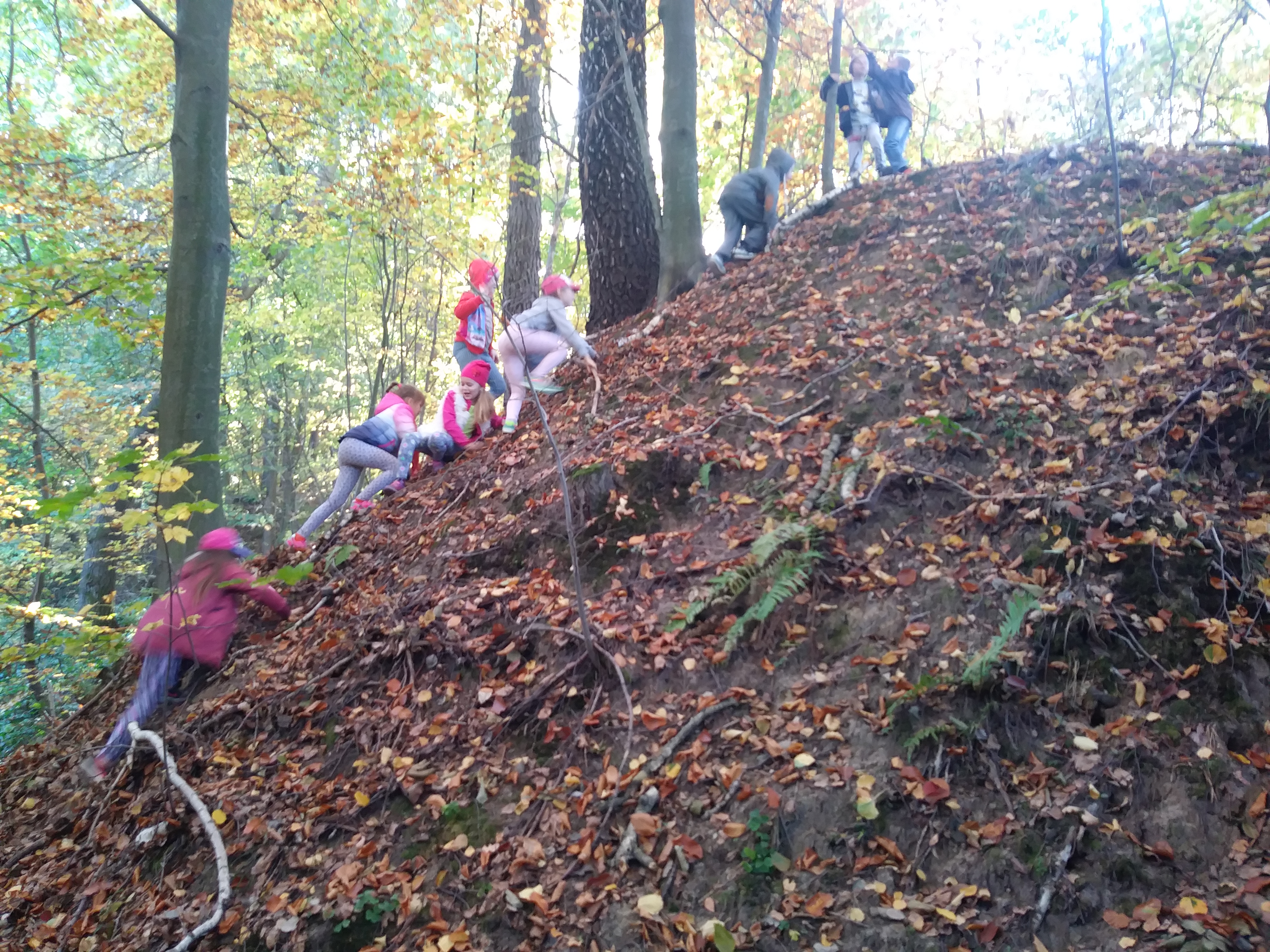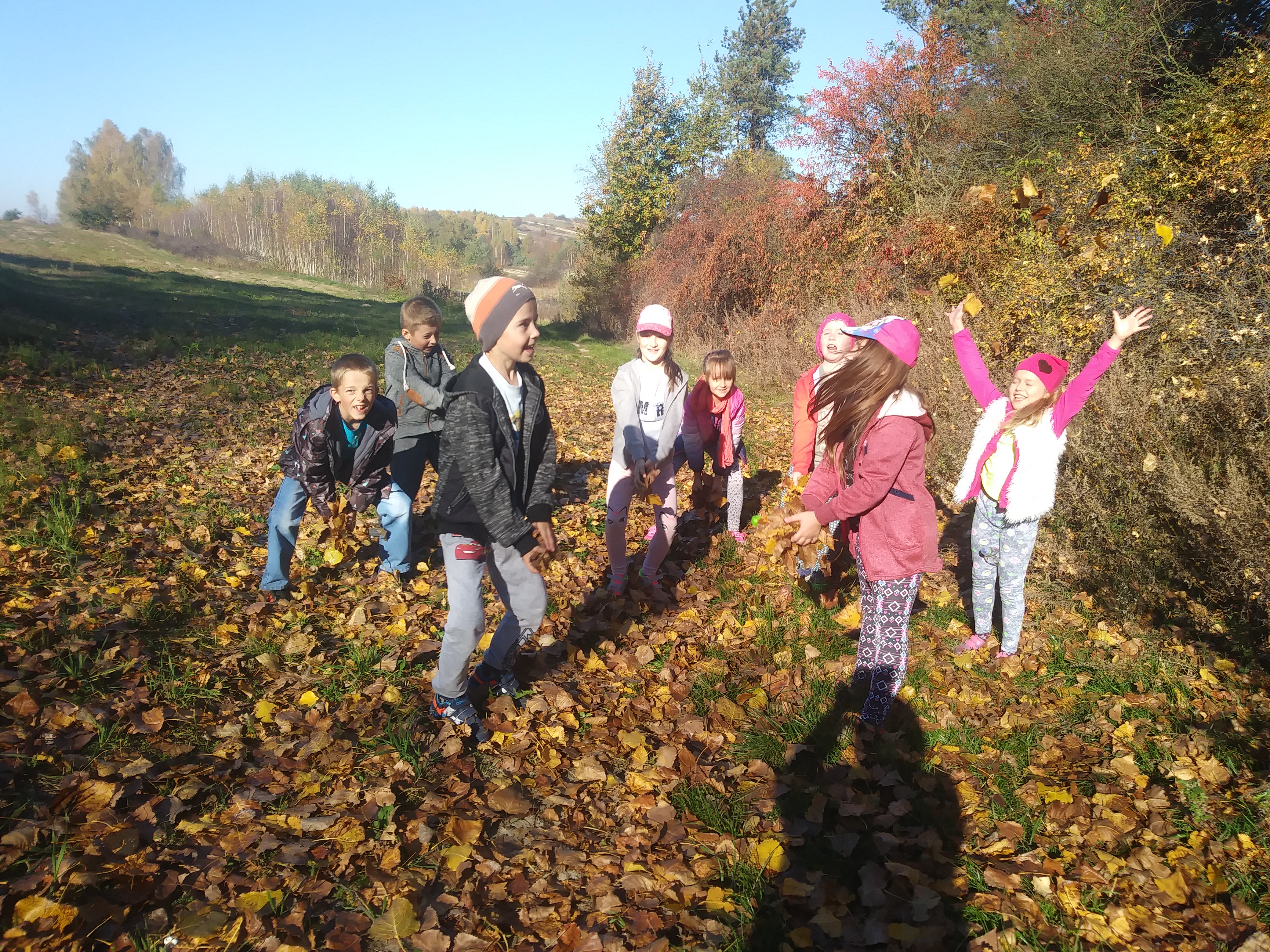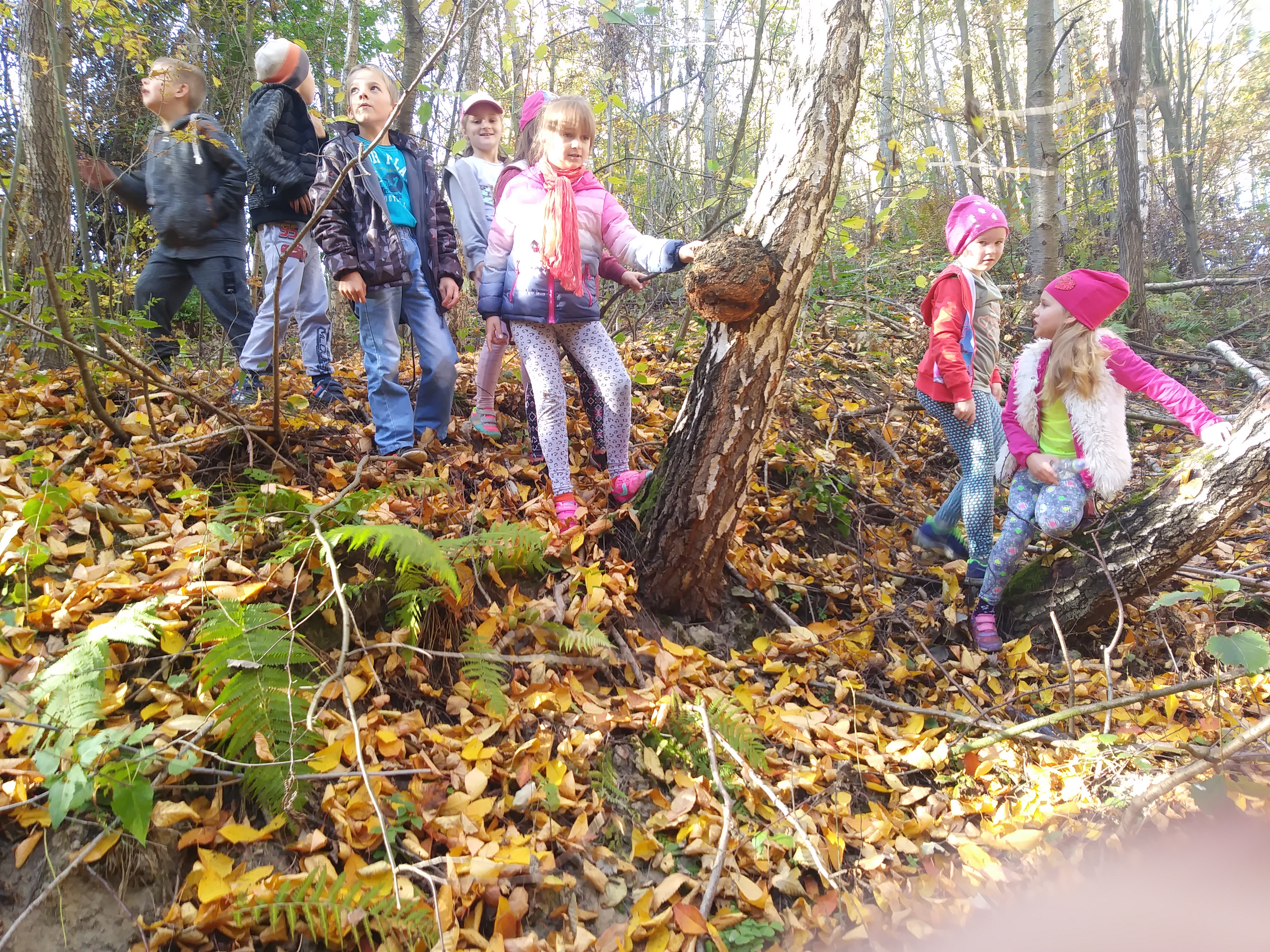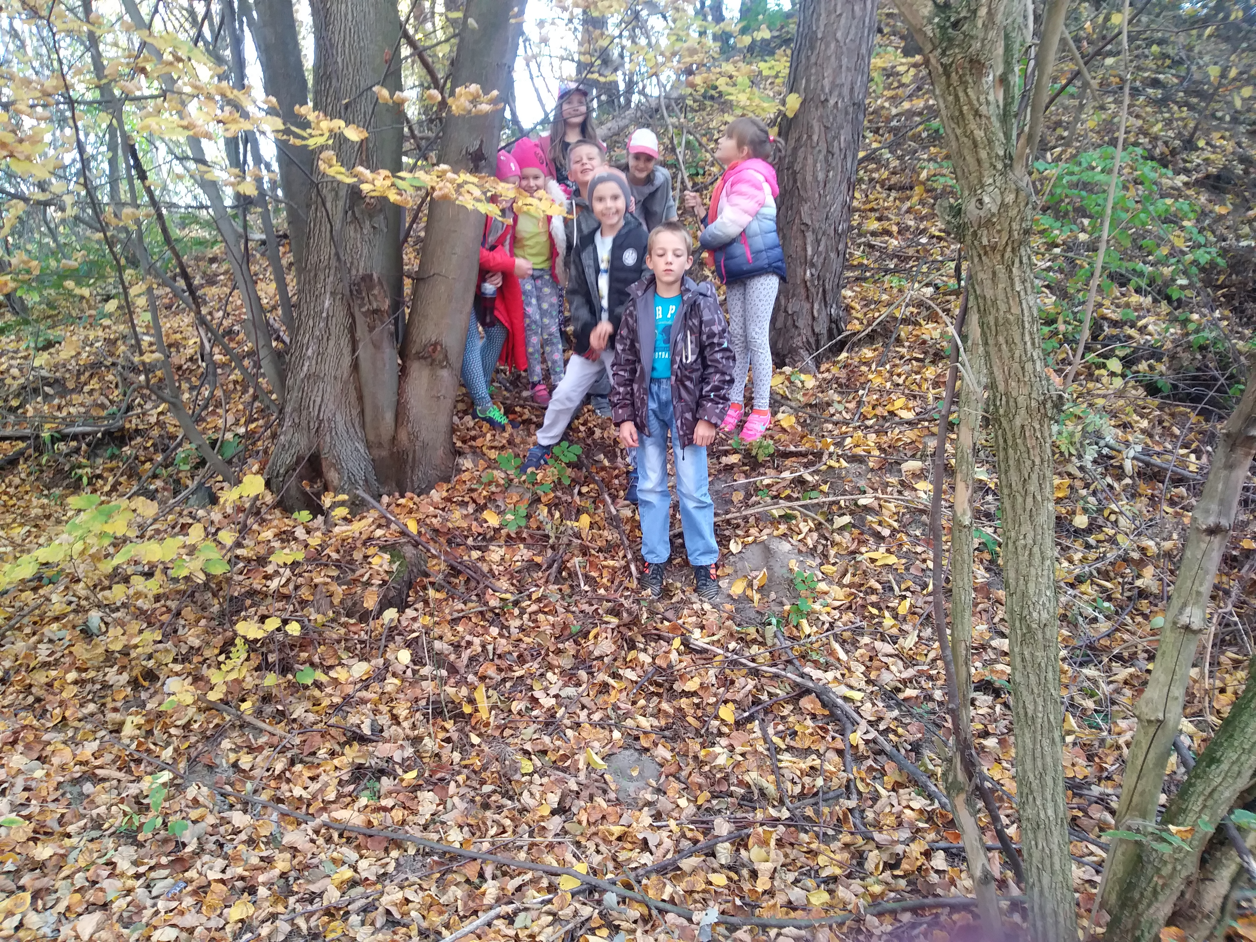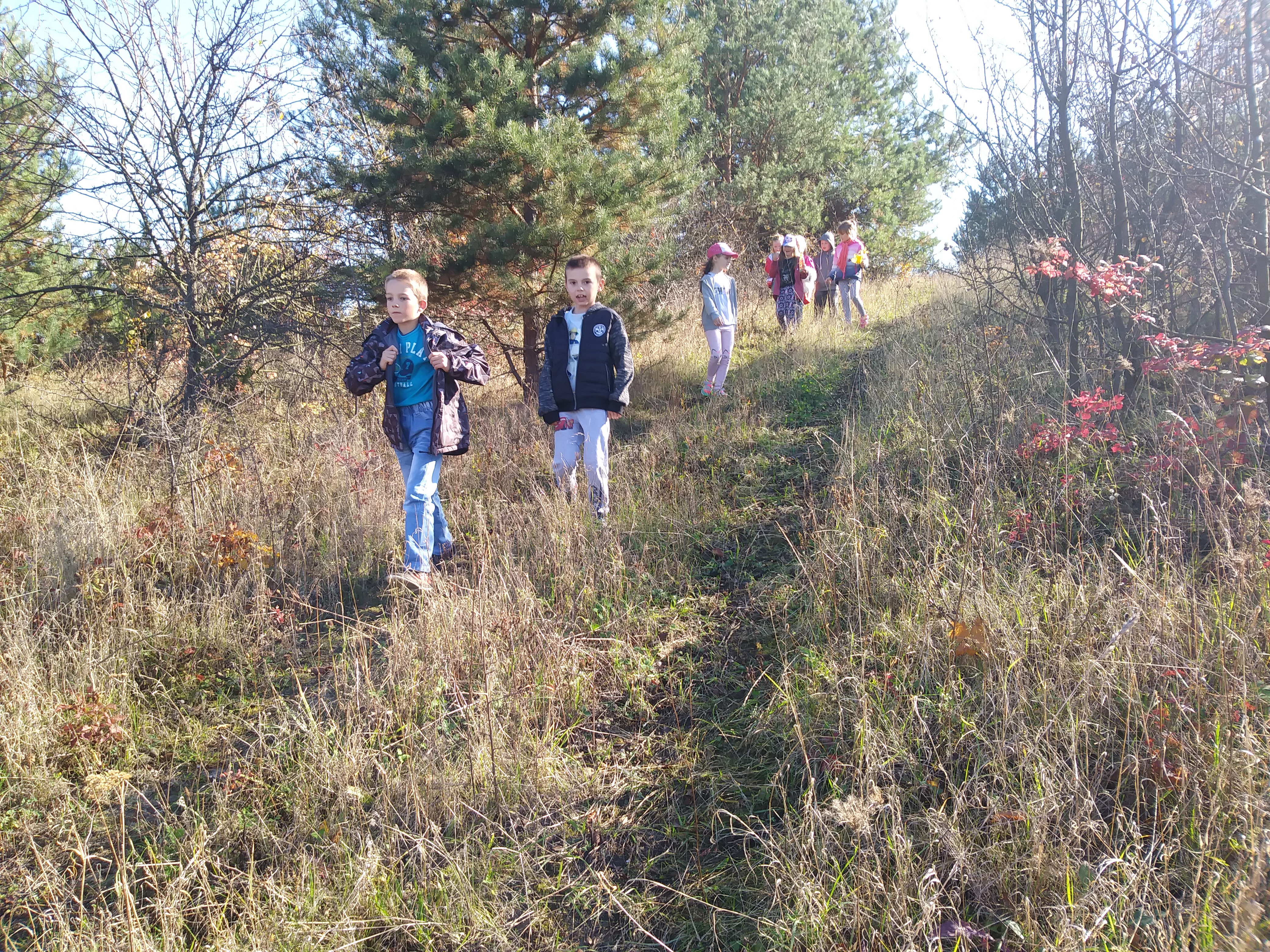 Korzystając z pięknej, słonecznej pogody, 16 października klasa II wybrała się na wycieczkę do lasu. Dzieci wykazały się wiedzą na temat ochrony przyrody, doskonale wiedzą, że w lesie nie wolno zostawiać śmieci, rozpalać ognisk, hałasować, płoszyć zwierząt. Spacerując po lesie obserwowały przyrodę i zachodzące jesienią zmiany. Rozpoznawały drzewa, słuchały odgłosów lasu, obserwowały ślady zwierząt. Pagórki i wąwozy wzbudziły chęć do wspinaczek. Z pobliskiej górki podziwiały piękno naszego regionu podczas złotej, polskiej jesieni. Z wycieczki wrócili zmęczeni, ale pełni wrażeń i ochoty na kolejny spacer. Była to wspaniała lekcja przyrody w terenie.