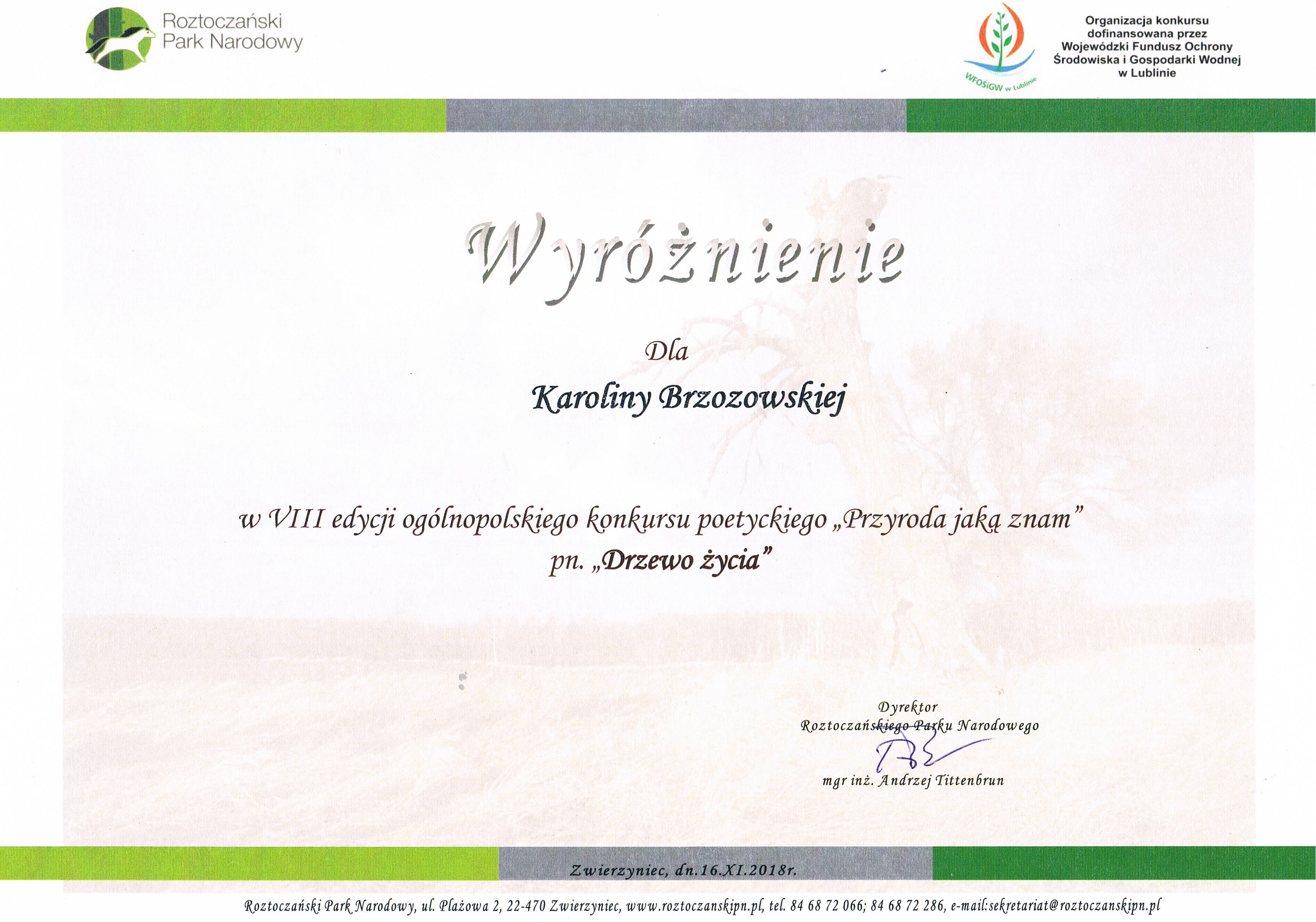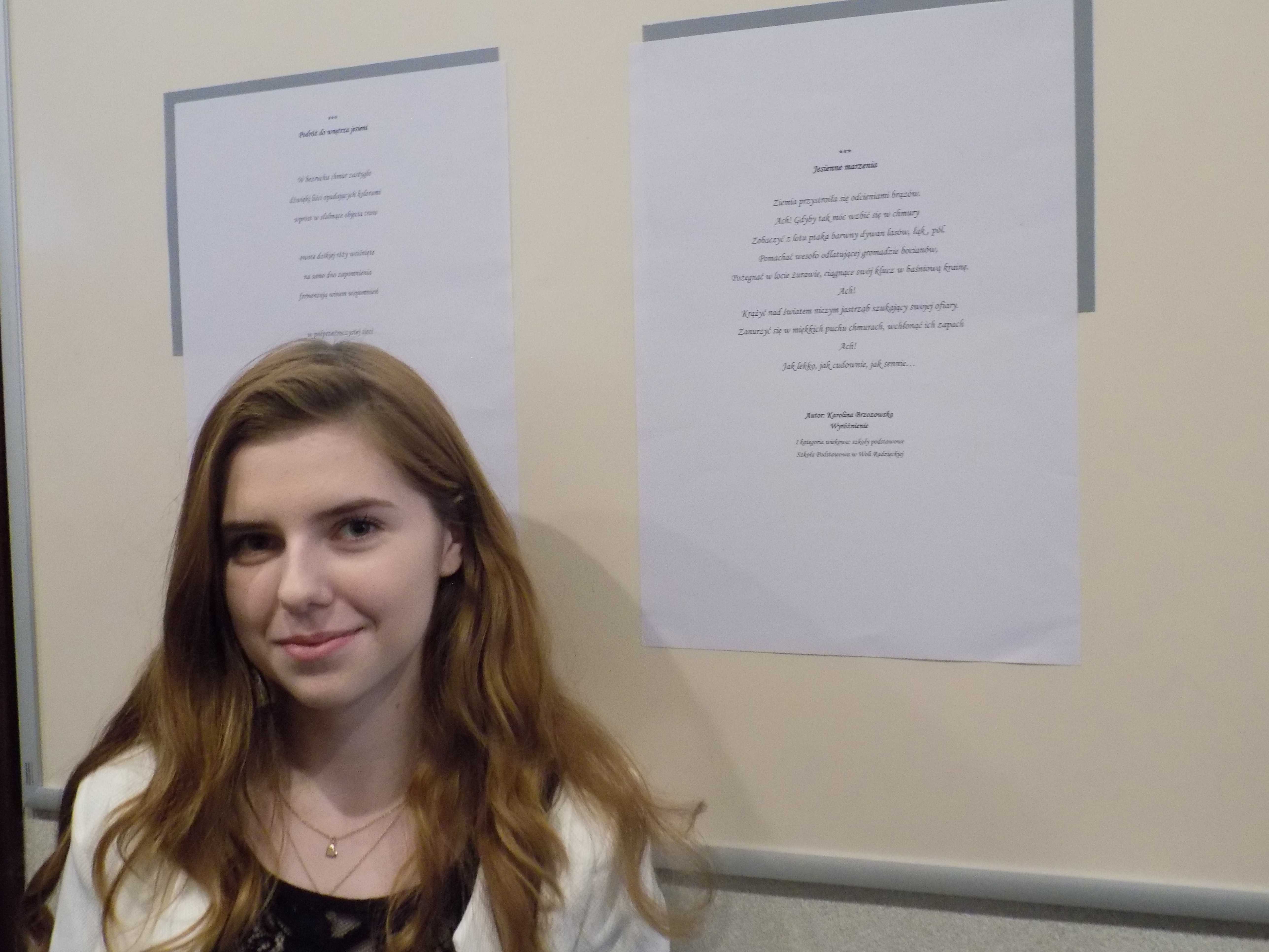 W miniony piątek, 16 listopada, w Ośrodku Edukacyjno-Muzealnym RPN odbyło się uroczyste podsumowanie VIII edycji ogólnopolskiego konkursu poetyckiego pn.: "Drzewo życia." W kategorii szkół podstawowych w konkursie wzięło udział 63 uczniów z 12 szkół, którzy nadesłali łącznie aż 73 utwory literackie. W gronie młodych poetów znalazła się również Karolina Brzozowska, która po raz koleiny wykazała się swoim talentem poetyckim i stworzyła nastrojowy wiersz, dzięki któremu zdobyła wyróżnienie w konkursie. Gratulujemy i życzymy dalszych sukcesów!