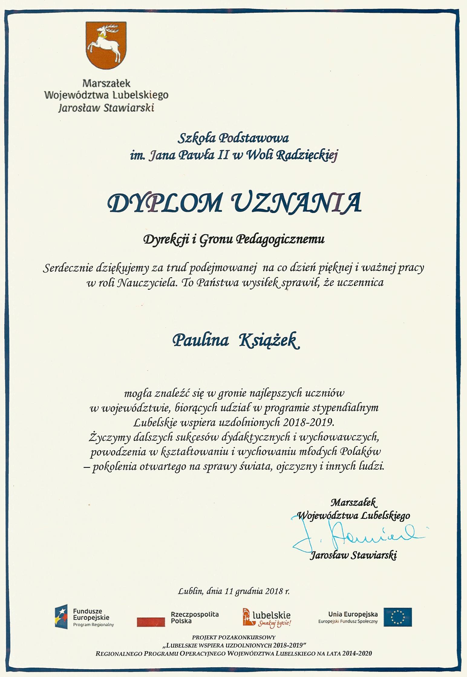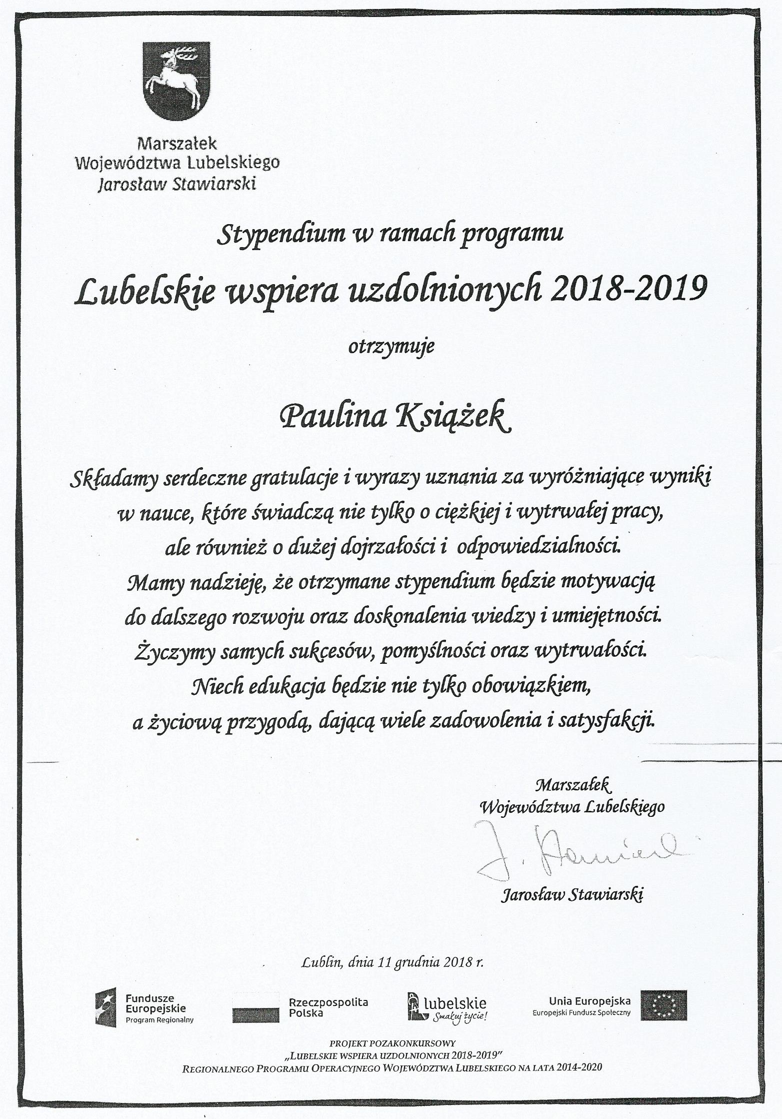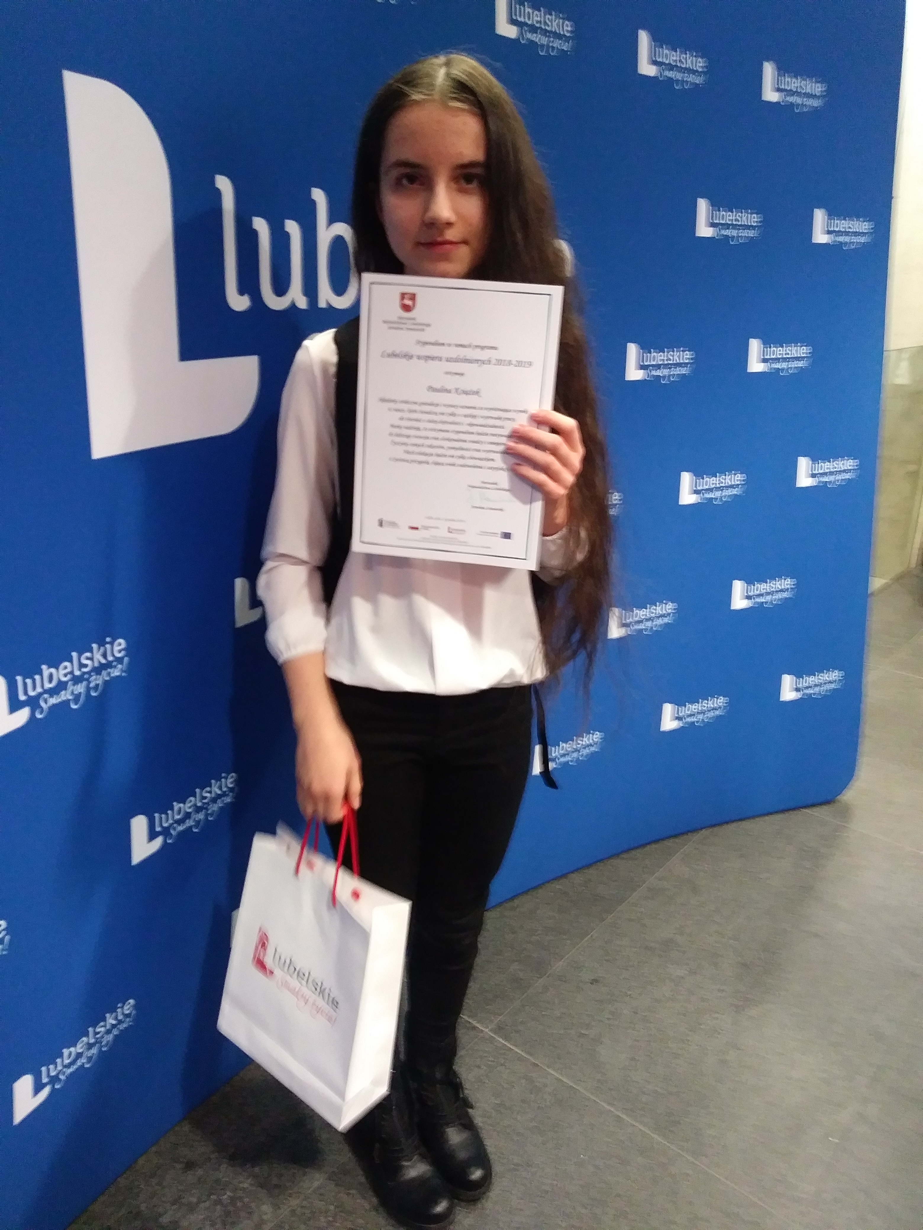 Paulina Książek stypendystką programu skierowanego do szczególnie uzdolnionych uczniów "Lubelskie wspiera uzdolnionych 2018-2019"
