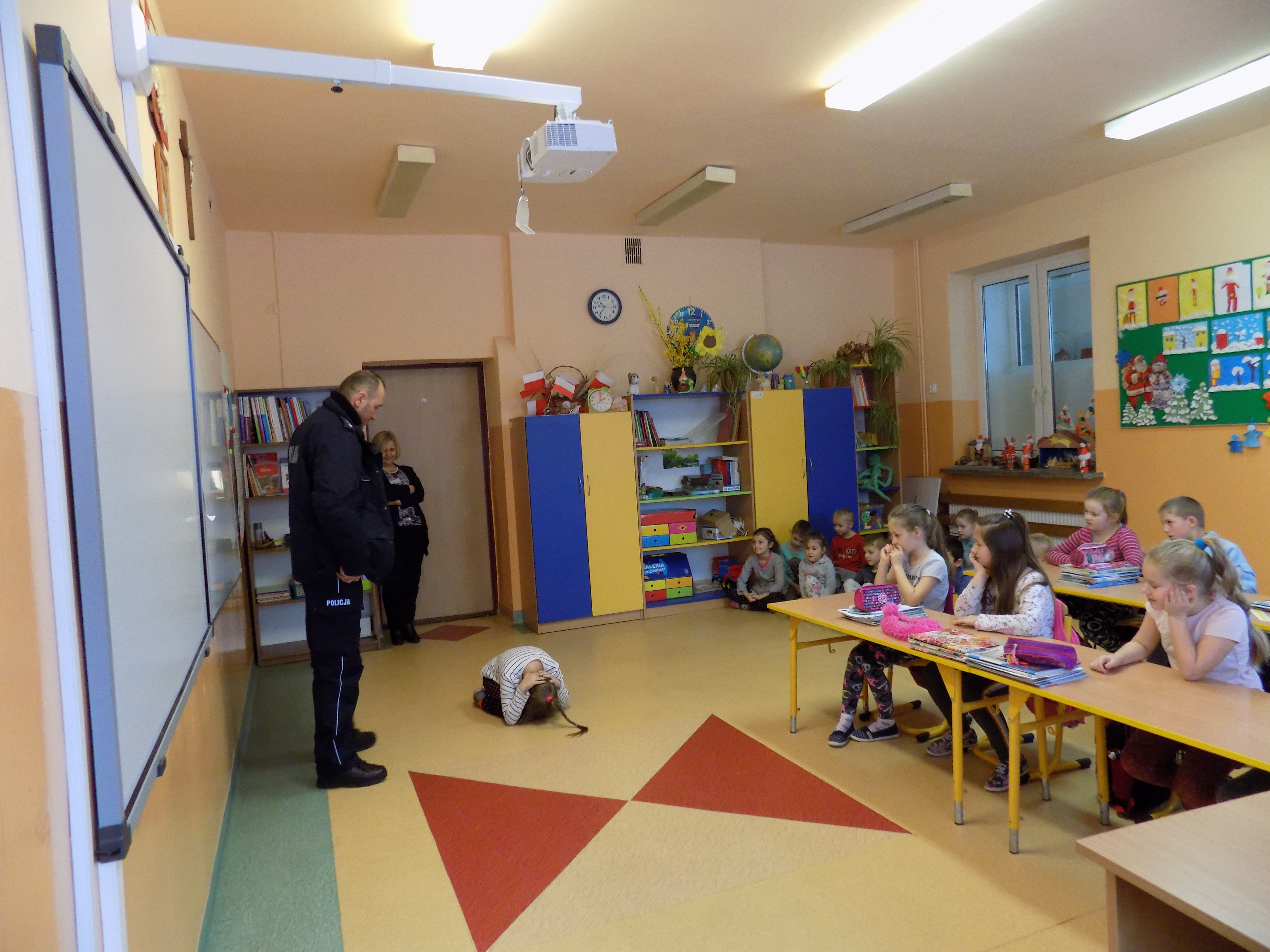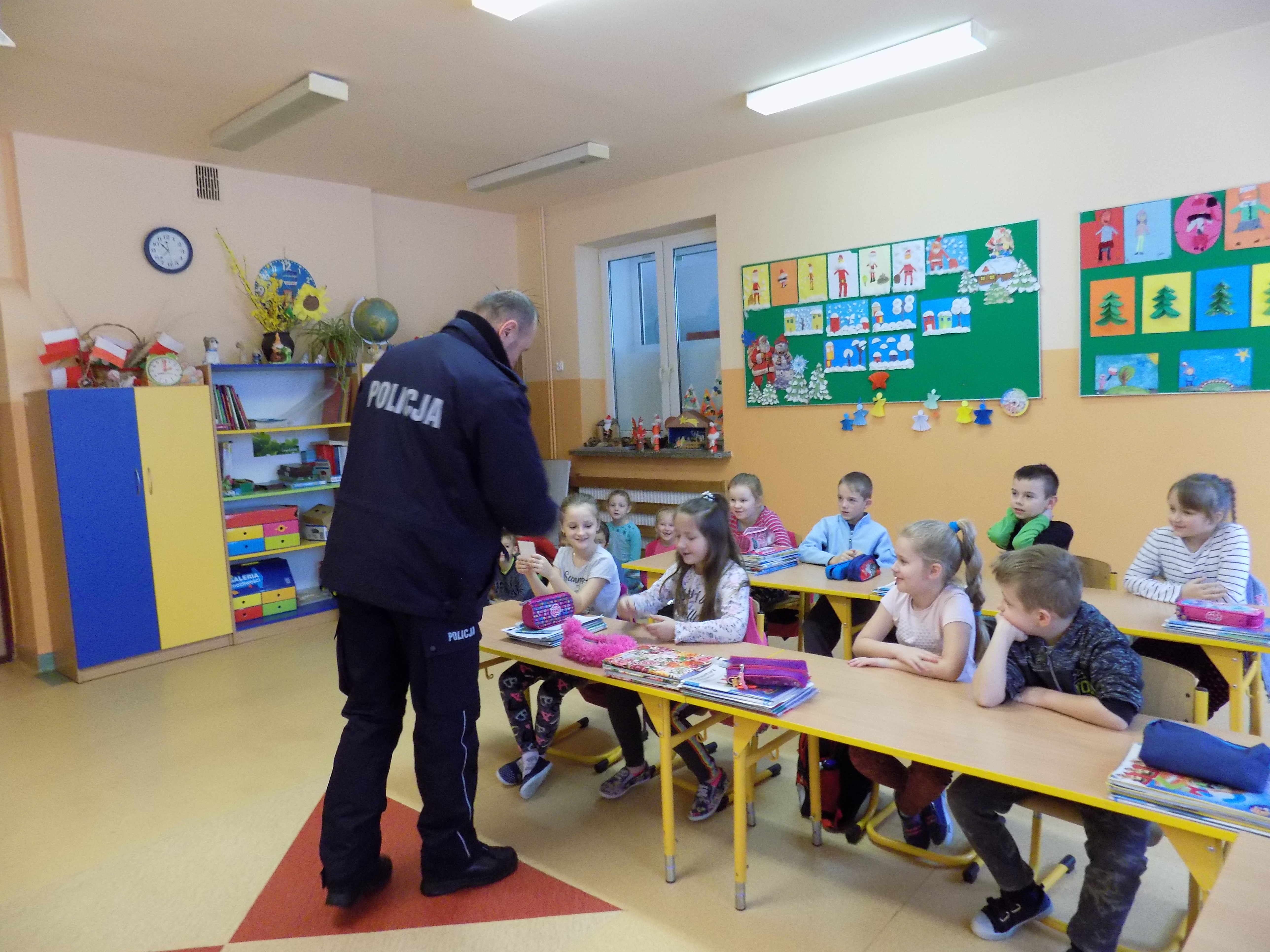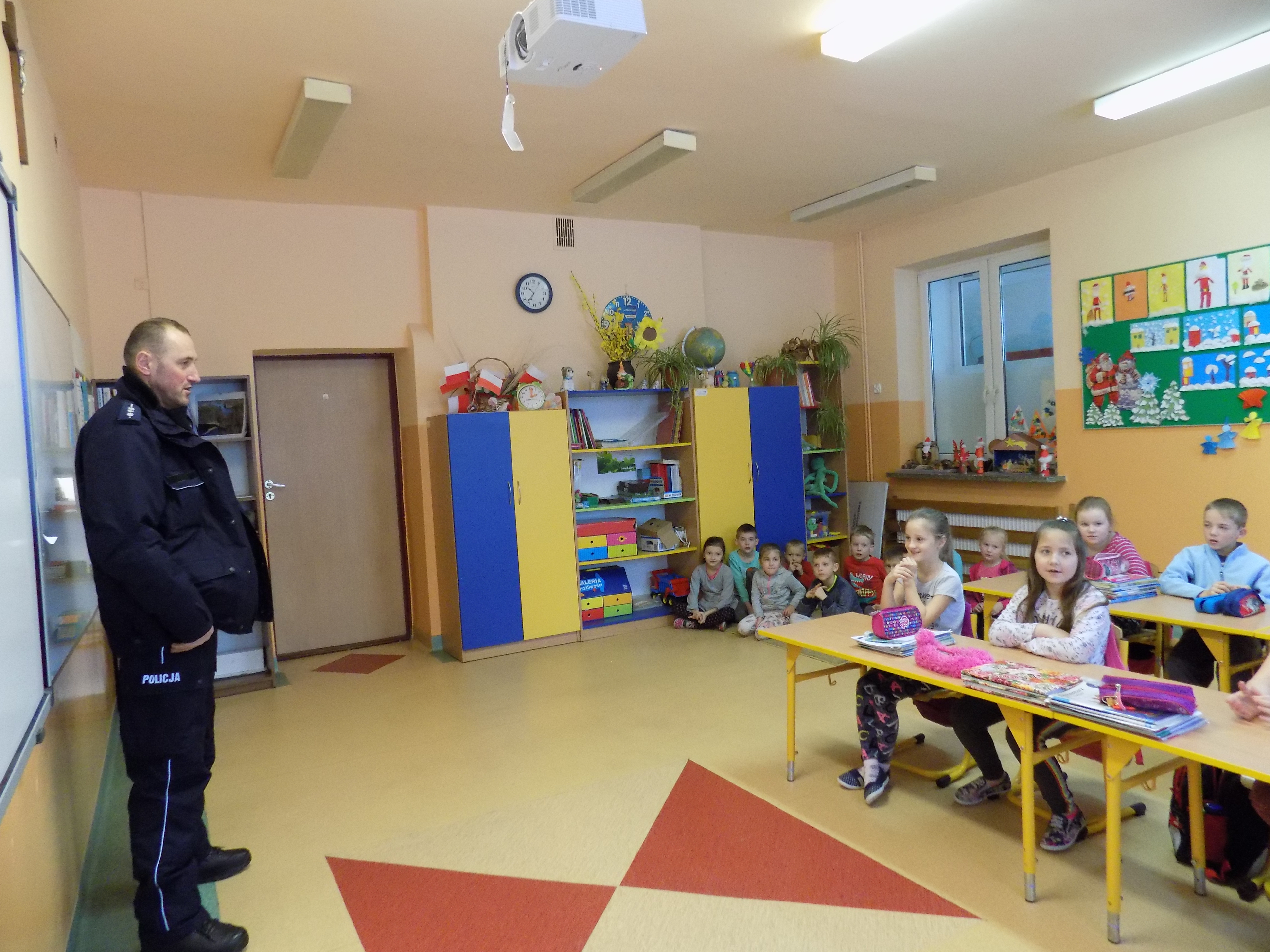 18 grudnia dzieci z oddziałów przedszkolnych oraz klas I i II odwiedzili policjanci. Jeden z nich rozmawiał z dziećmi o bezpieczeństwie na drogach, o tym jak należy prawidłowo przechodzić przez jezdnię oraz przypomniał o korzyściach noszenia ubrań posiadających elementy odblaskowe. Zwrócił też uwagę na zachowanie bezpieczeństwa podczas zabaw zimowych. Dzieci z dużym zainteresowaniem słuchały rad i wskazówek policjanta. Aktywnie włączały się też do rozmowy i dzieliły się swoimi doświadczeniami.
