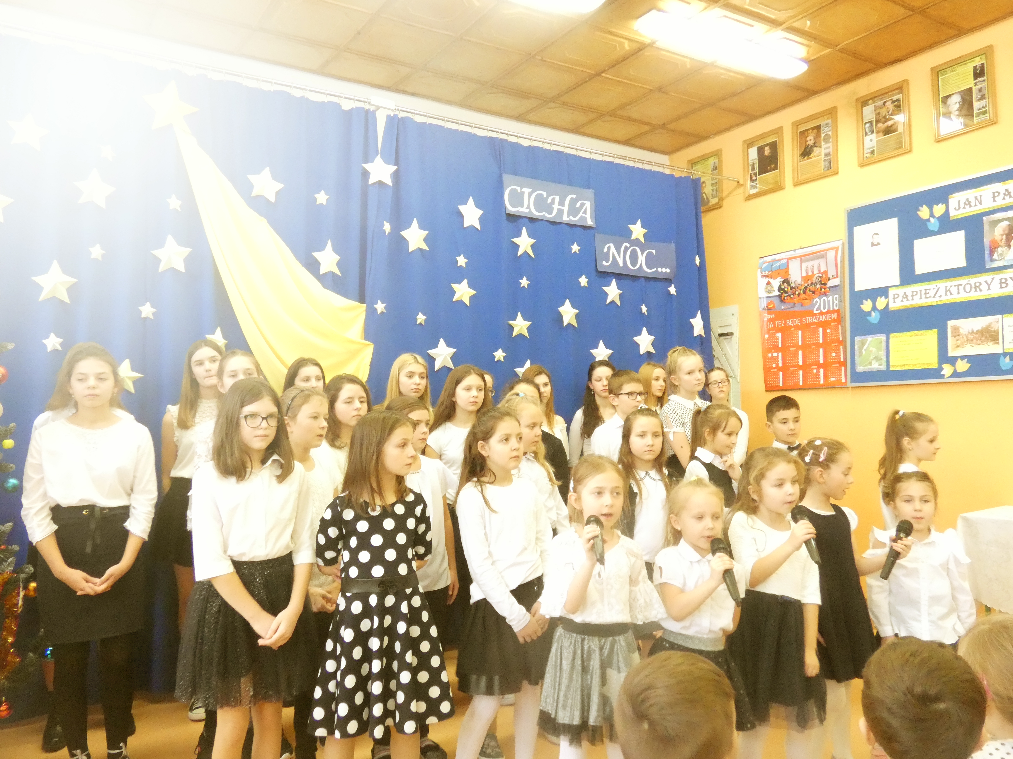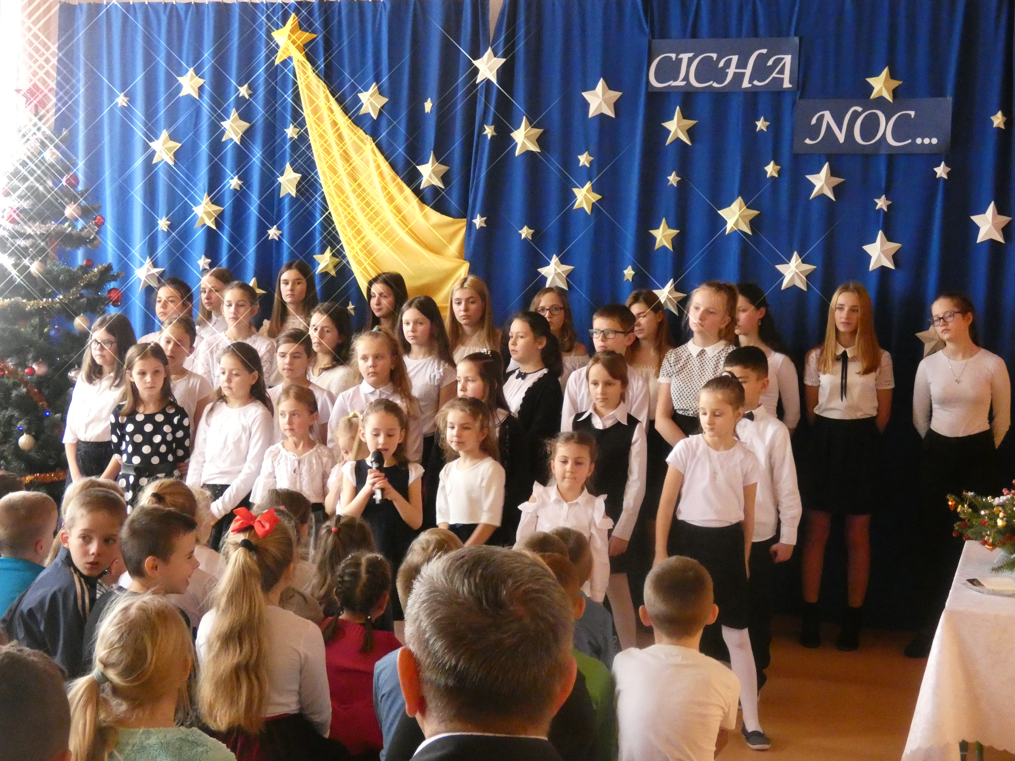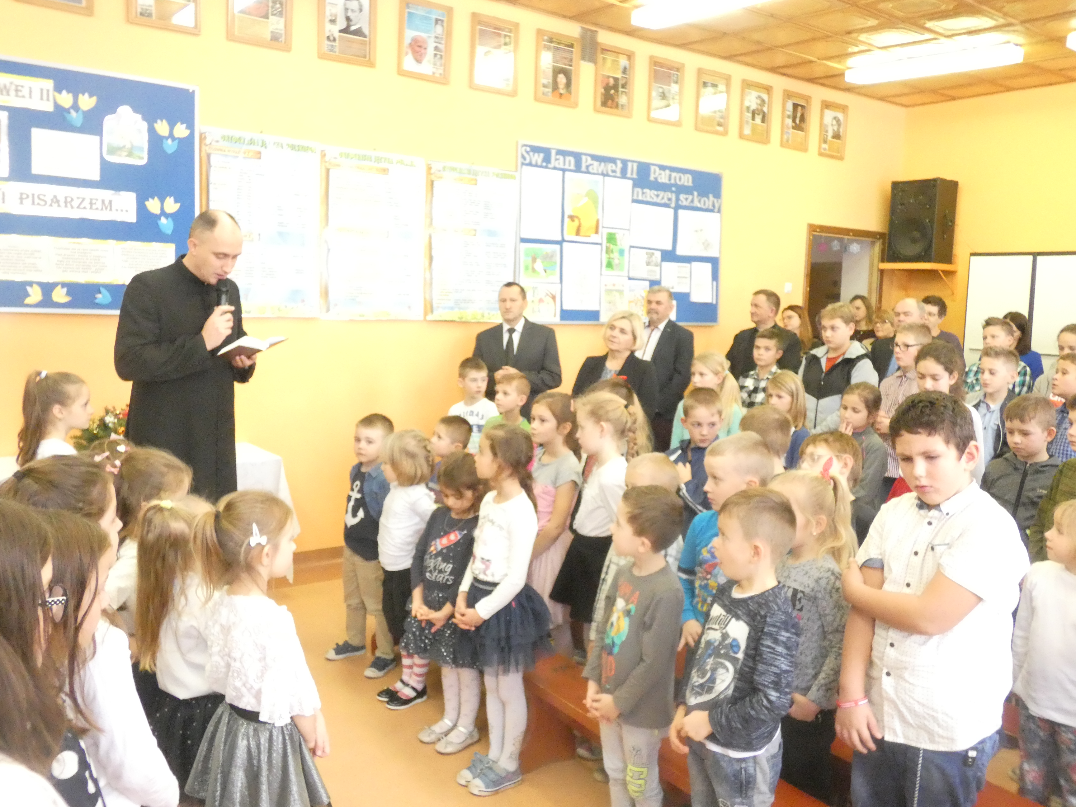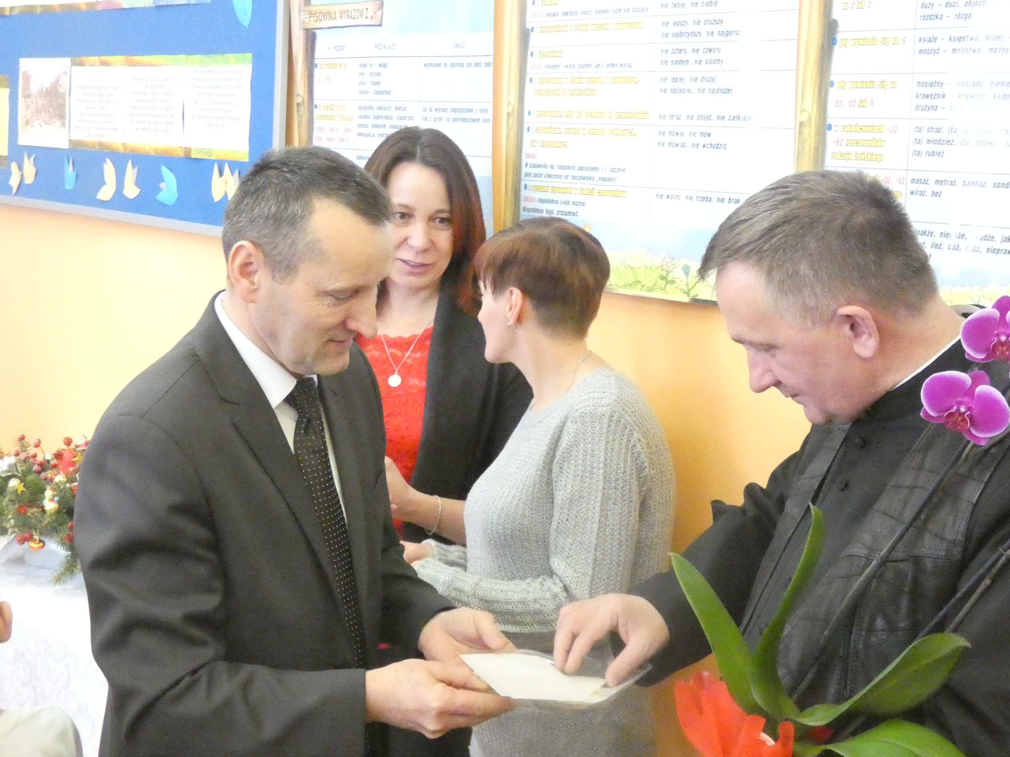 21 grudnia odbyło się w naszej szkole coroczne spotkanie wigilijne poprzedzające Święta Bożego Narodzenia. Była to odpowiednia chwila, aby podzielić się opłatkiem, a przy okazji złożyć sobie świąteczne życzenia. Uroczystości szkolne rozpoczęły się od spotkań klasowych. Następnie wszyscy uczniowie wraz z zaproszonymi gośćmi, nauczycielami i pracownikami obsługi zgromadzili się na uroczystości szkolnej w klasie VIII. Wśród zaproszonych gości byli: proboszcz parafii w Radzięcinie - ks. Adam Czupich wraz z wikarym ks. Krzysztofem Paluchem, przedstawiciele Rady Rodziców z przewodniczącą - panią Teodorą Rapa i jej zastępcą - panią Barbarą Łata. Przybył także emerytowany nauczyciel - pan Feliks Kuna. Głównym punktem uroczystość szkolnej był koncert kolęd w wykonaniu chórku szkolnego i jego solistów. Po raz pierwszy jako solistki wystąpiły uczennice kl."O" - Marcelina Brzozowska, Lena Leśniewska i Weronika Bielak. W dalszej części spotkania wigilijnego życzenia świąteczne do zebranych skierowali: Pan Dyrektor, Ksiądz Proboszcz oraz Przewodnicząca Rady Rodziców. Na zakończenie uroczystości Pan Dyrektor symbolicznie podzielił się opłatkiem z zaproszonymi gośćmi oraz Przewodniczącym Samorządu Uczniowskiego, a następnie złożył życzenie imieninowe księdzu Adamowi.
