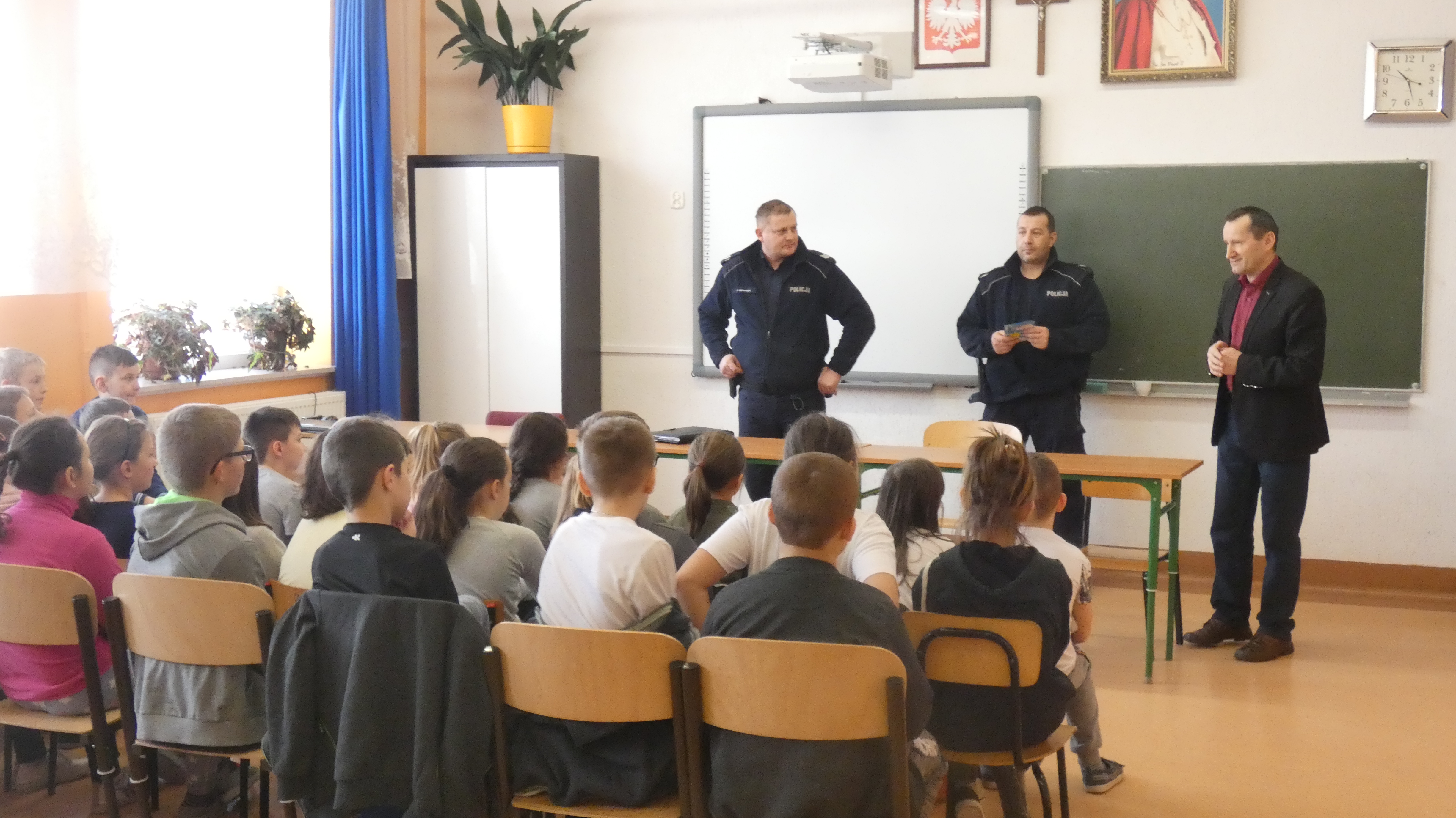 7 lutego w naszej szkole odbyło się spotkanie z policjantami dla uczniów klas IV-VIII. Funkcjonariusze przypomnieli o różnych zagrożeniach, na które mogą być narażeni uczniowie w trakcie ferii zimowych. Skupili się na omówieniu zasad bezpieczeństwa podczas uprawiania sportów zimowych i zabaw na świeżym powietrzu. Przestrzegali przed ślizganiem się na skutych lodem rzekach i stawach oraz ostrzegali przed zjeżdżaniem z górek znajdujących się blisko ulic i rzek. Policjanci nawiązali również do problemów związanych z cyberprzemocą oraz przedstawili możliwe konsekwencje niewłaściwych zachowań młodzieży. Mamy nadzieję, że słowa, które skierowali do naszych uczniów pozostaną w ich pamięci i będą dla nich przestrogą na długi czas. Następnie odbyło się krótkie spotkanie, w którym uczestniczyli wszyscy uczniowie, począwszy od oddziału przedszkolnego dzieci 5-6-letnich. Przewodniczący Samorządu Uczniowskiego jeszcze raz przedstawił 10 najważniejszych zasad bezpieczeństwa w czasie odpoczynku zimowego. Uczniowie klas I-VIII otrzymali też kamizelki ostrzegawcze współfinansowane ze środków Funduszu Sprawiedliwości w ramach ogólnopolskiej kampanii edukacyjno-informacyjnej "Bezpieczna droga."