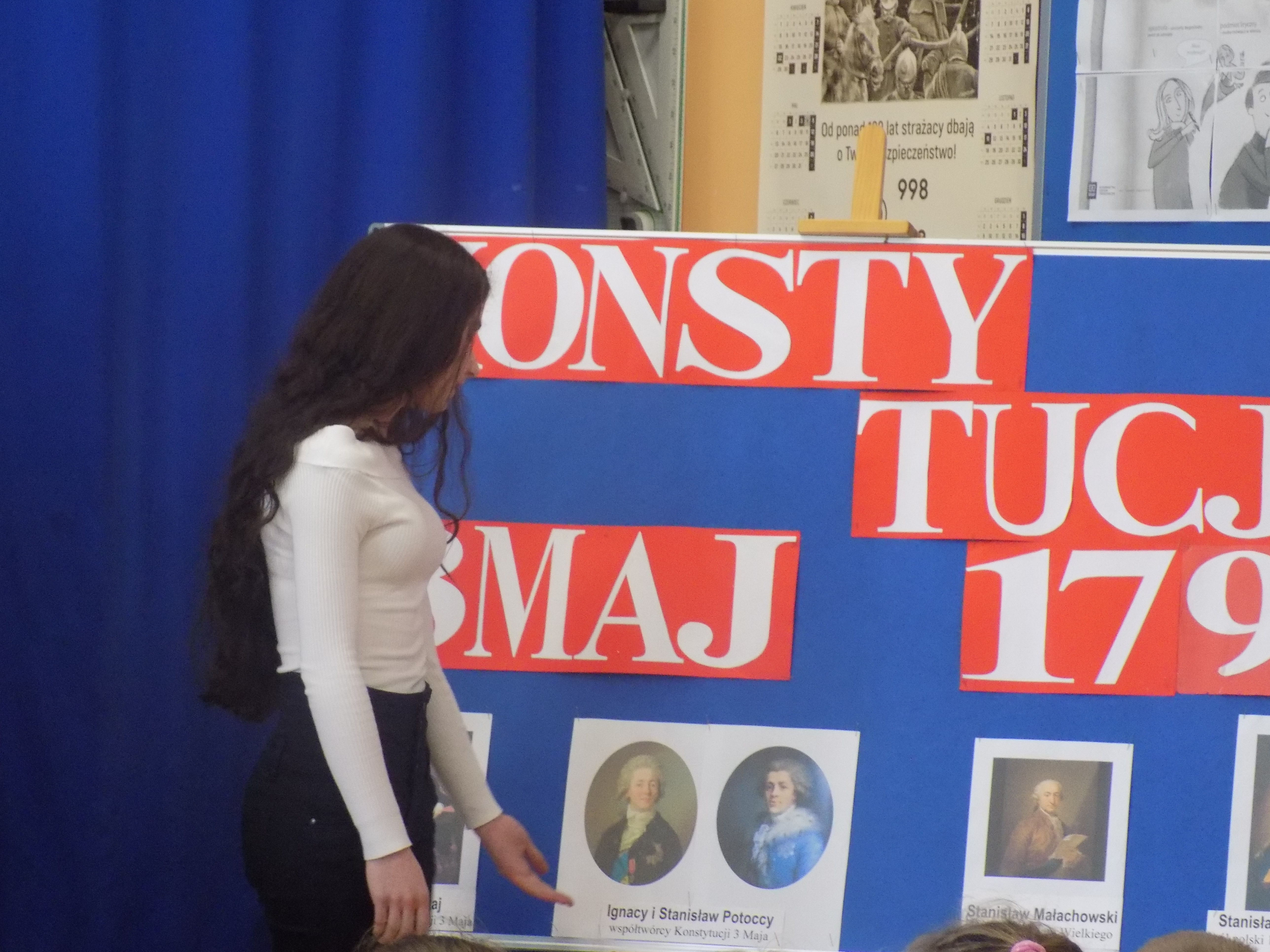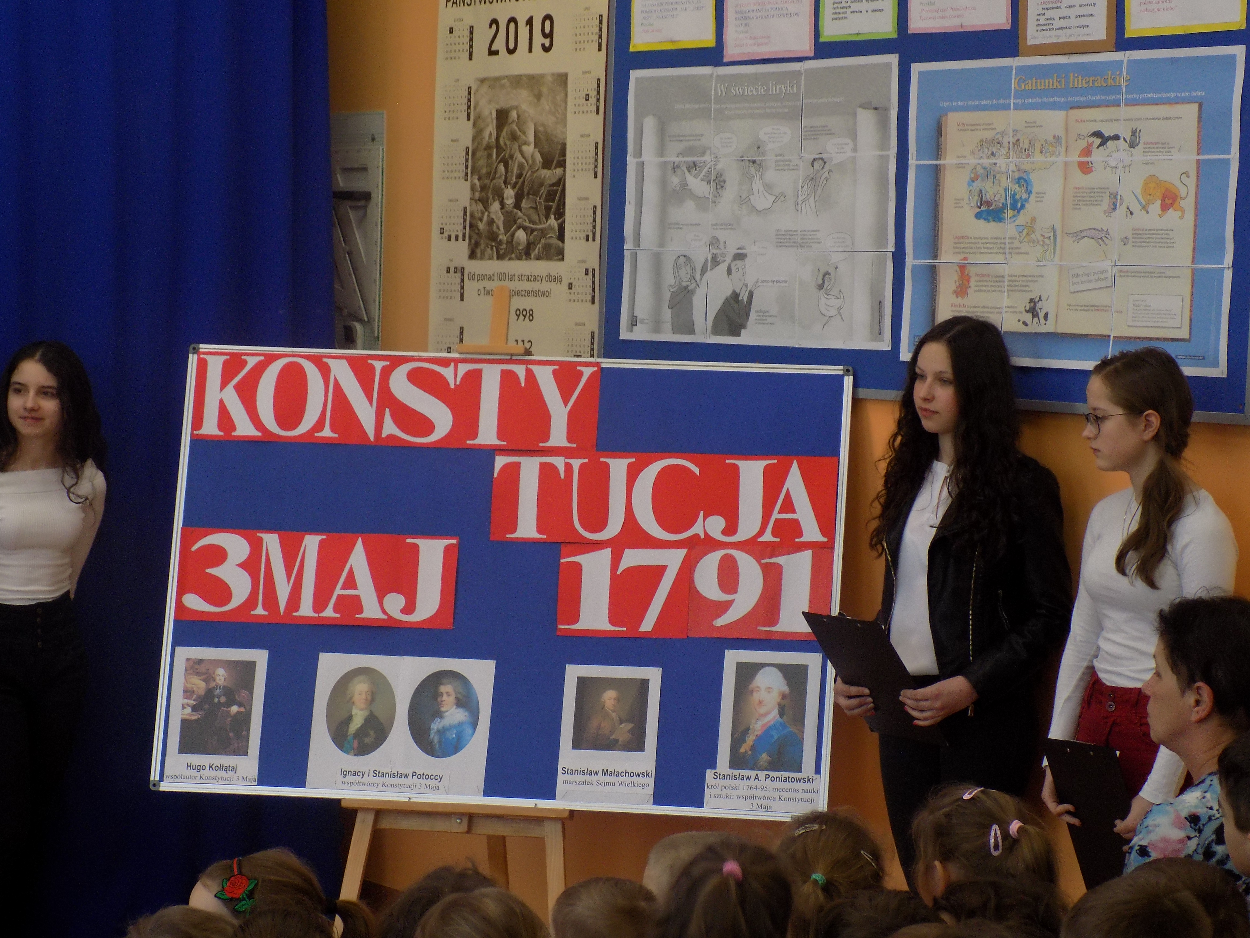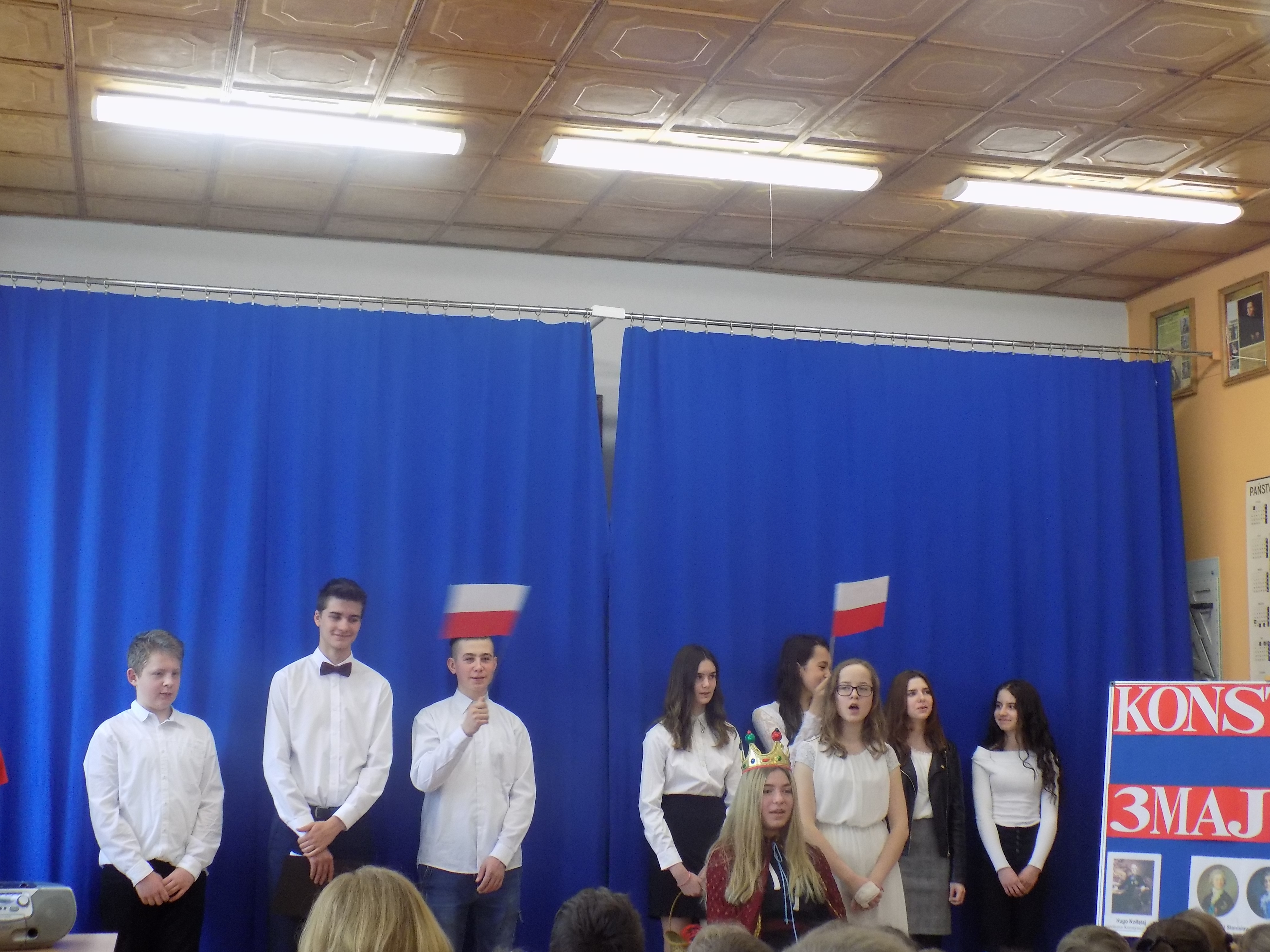 W dniu 6 maja, po kilkudniowym weekendzie, cała społeczność szkolna wraz z nauczycielami spotkała się na uroczystym apelu, by uczcić wyjątkową 228 rocznicę uchwalenia Konstytucji 3 Maja. Na początku wszyscy uroczyście odśpiewali nasz hymn narodowy. Uczniowie z klasy VIII i VII przedstawili inscenizację, wspominając najważniejsze wydarzenia związane z uchwaleniem Konstytucji. „Duch historii”, który pojawił się na scenie, król, również inni „aktorzy” deklamujący wiersze i inne teksty, uświadomili nam słuchaczom, jak ważną ustawą w dziejach naszego narodu była Konstytucja 3 Maja. Pamiętajmy o tym!!!