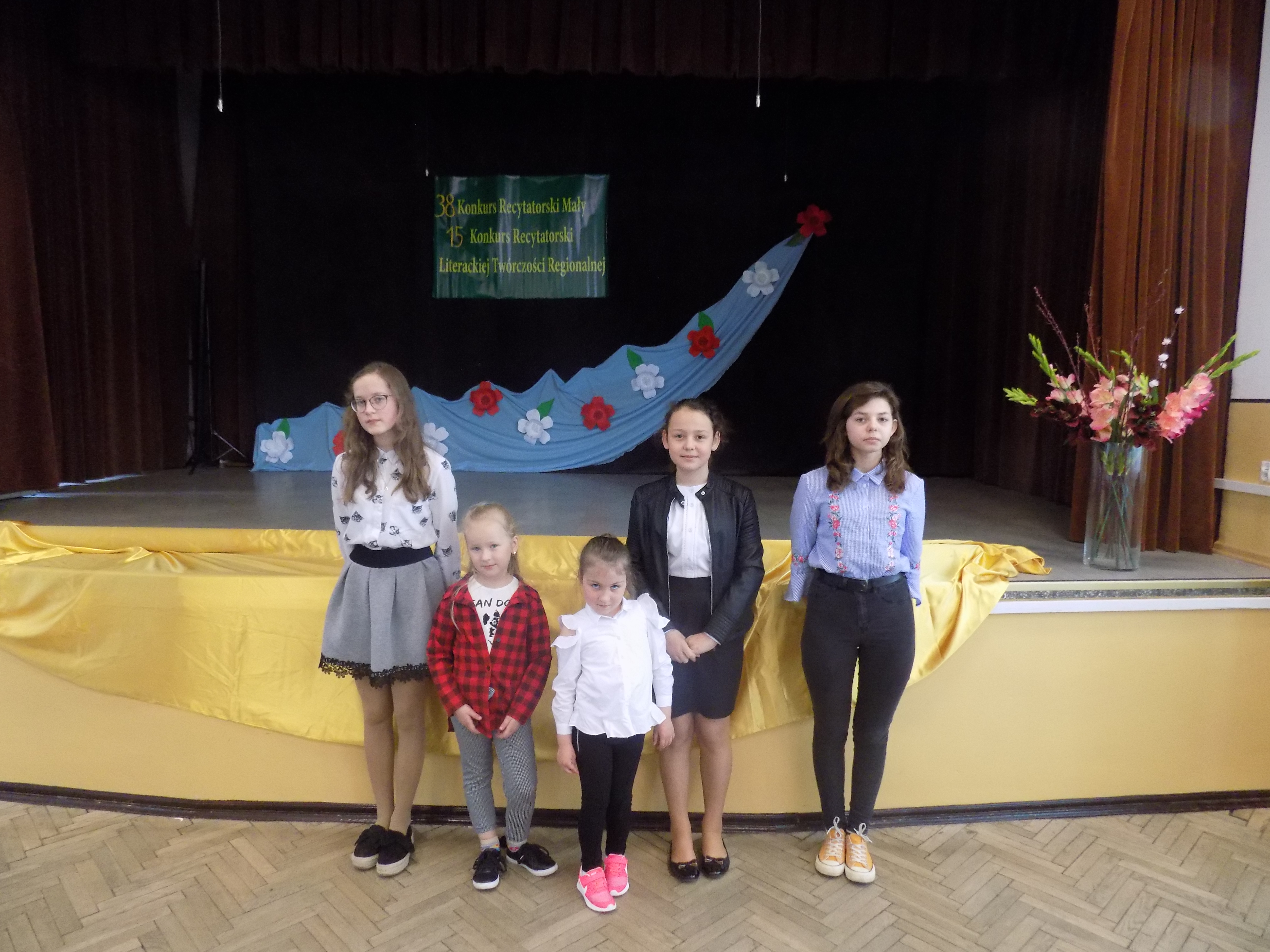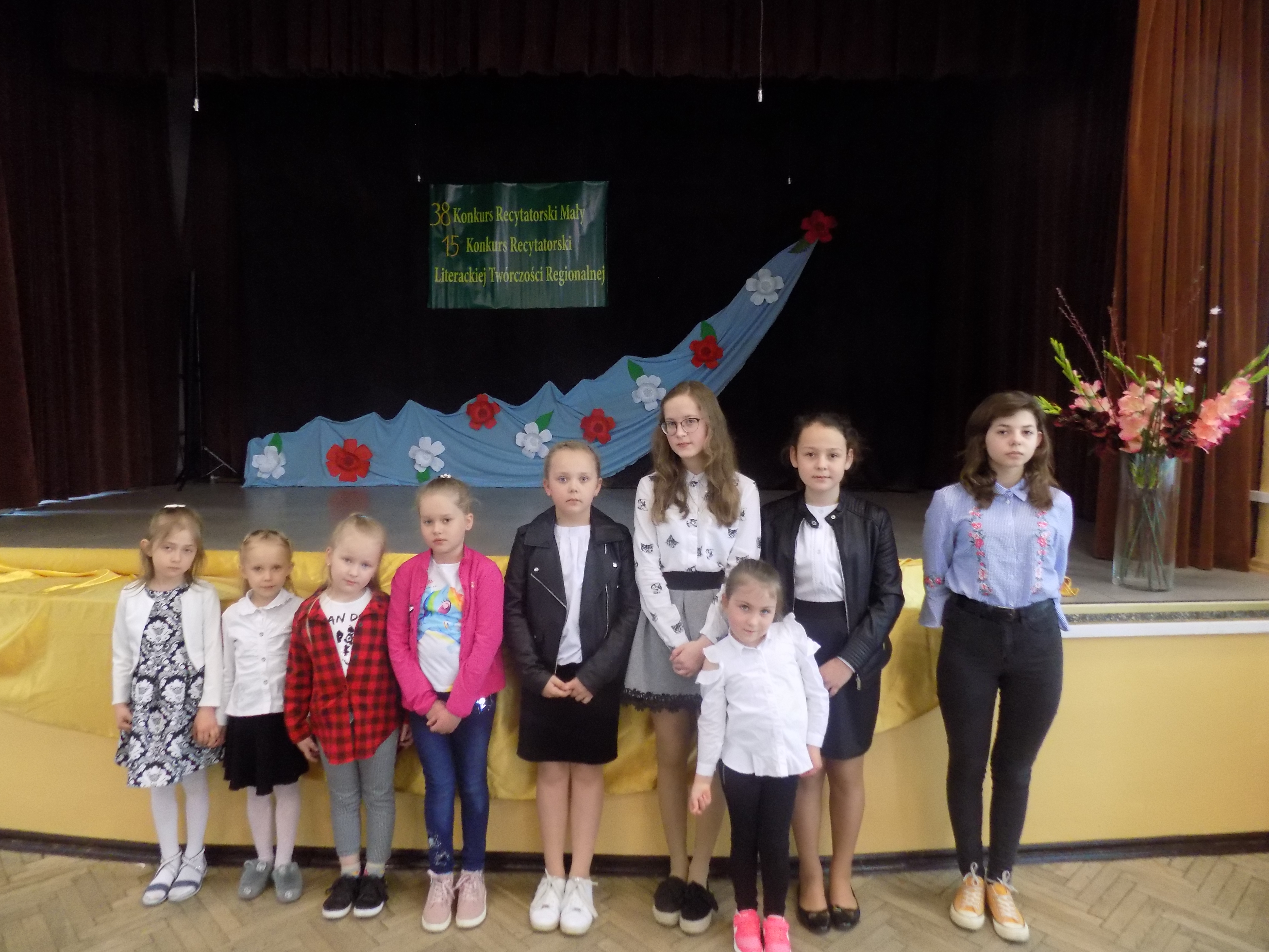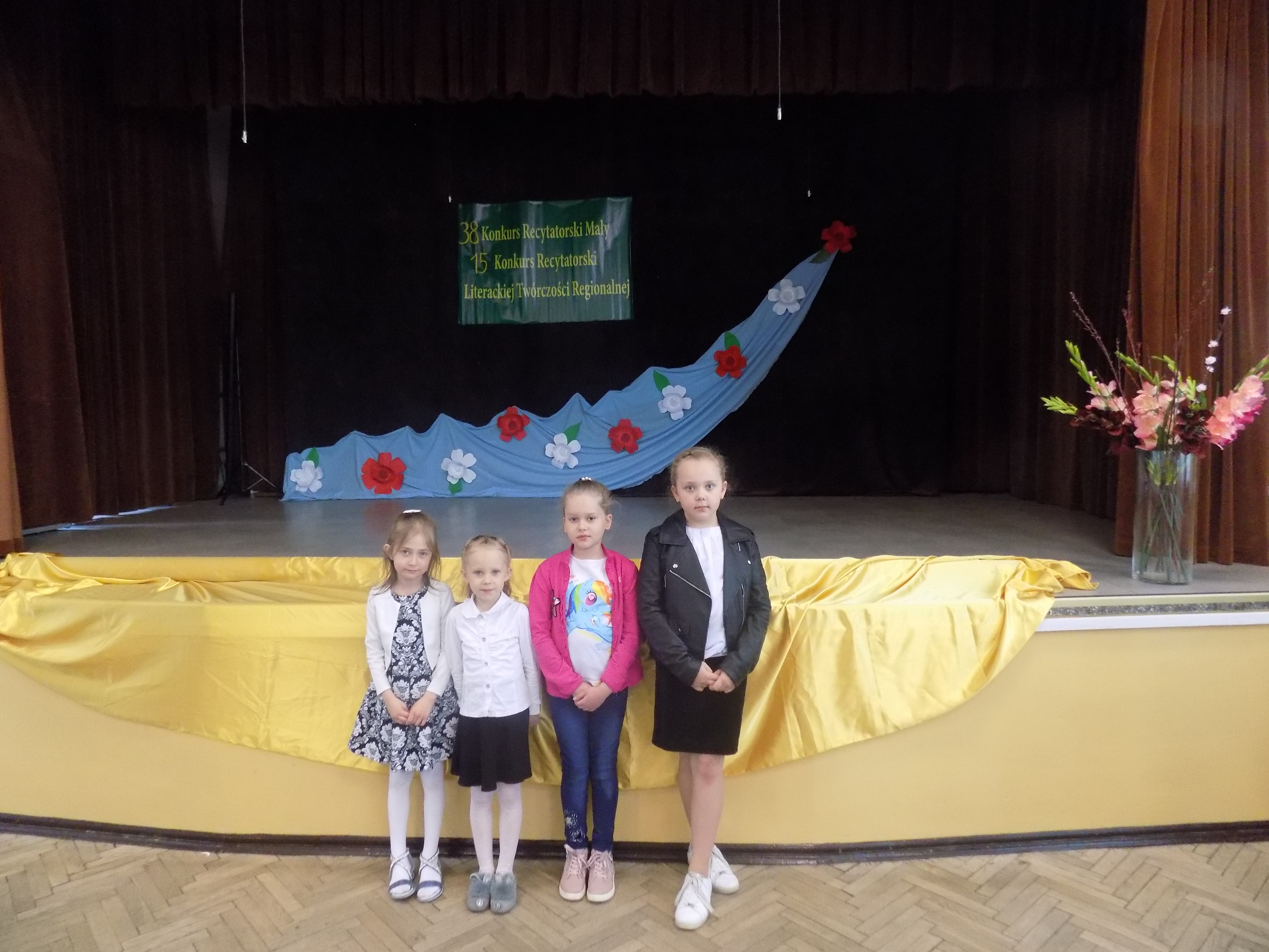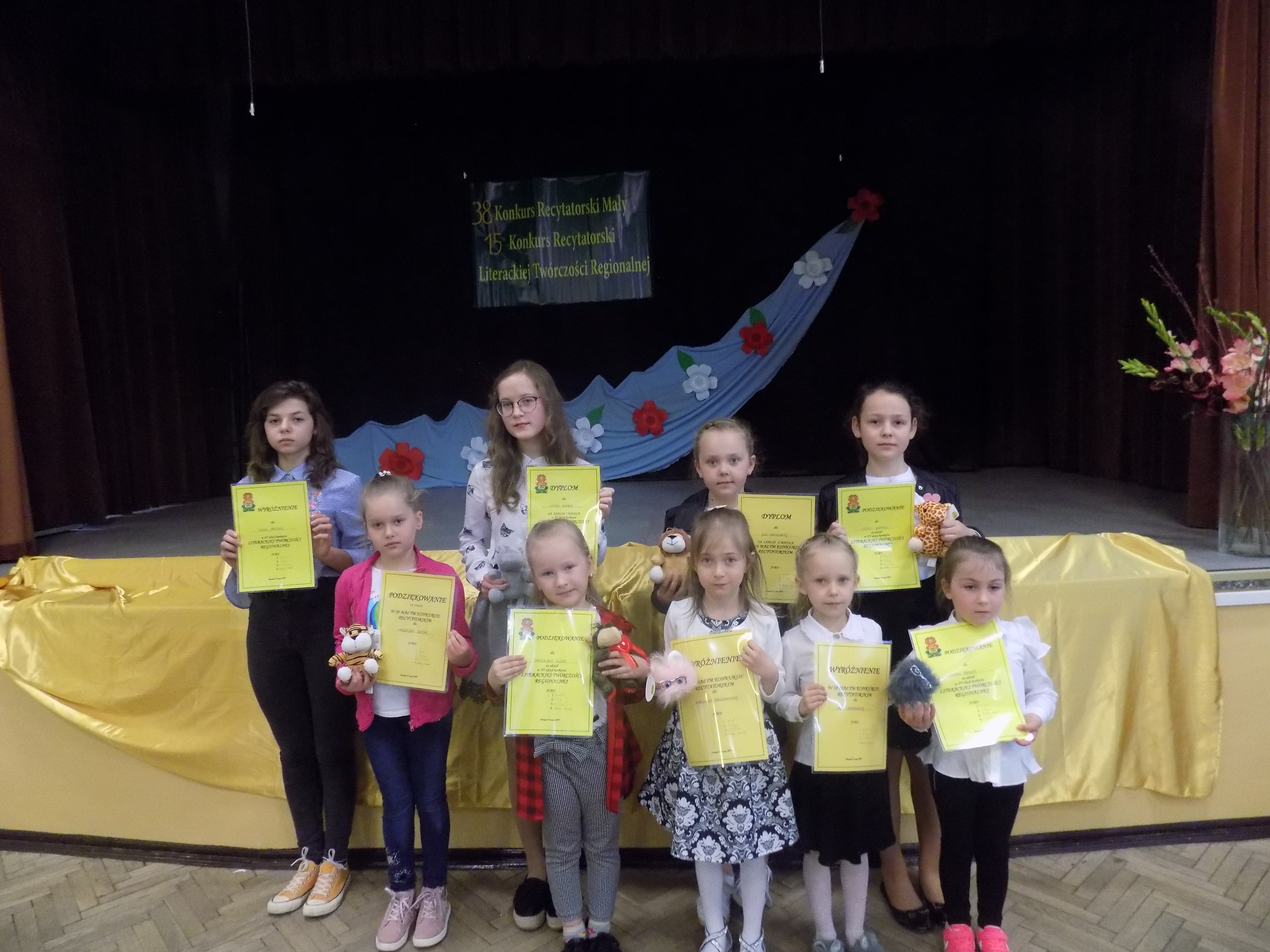 Decyzją jury Julia Leśniewska z klasy IV zakwalifikowała się do etapu powiatowego XXXVIII Małego Konkursu Recytatorskiego, uplasowała się na II miejscu. Pozostałe recytatorki tego konkursu: Magdalena Kozak z klasy II, Marcelina Brzozowska i Lena Leśniewska z oddziału przedszkolnego, które równie pięknie na scenie prezentowały wybrane wiersze i zdobyły wyróżnienie.