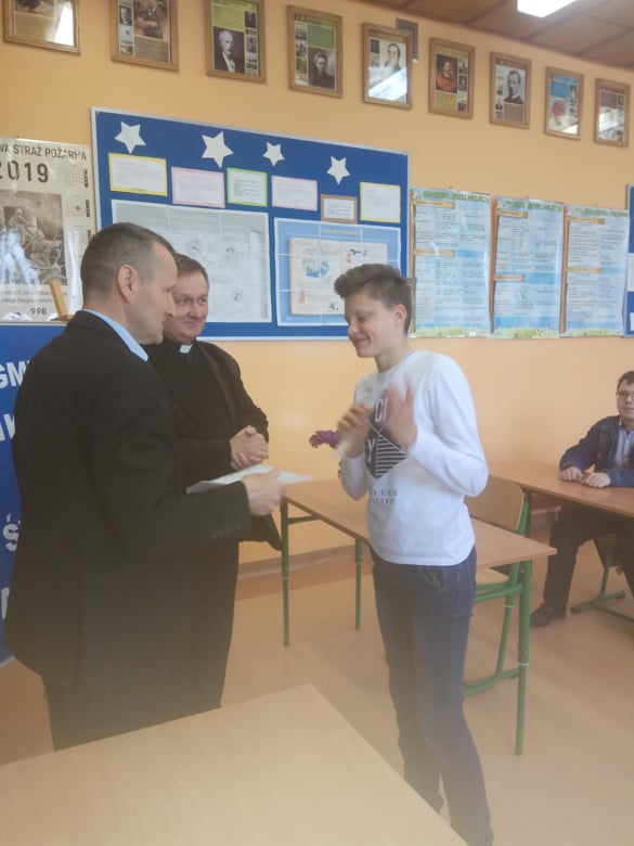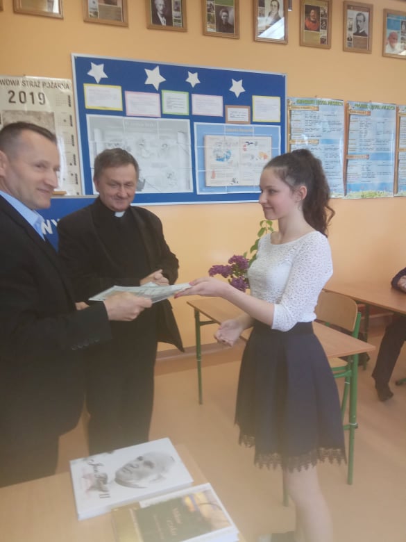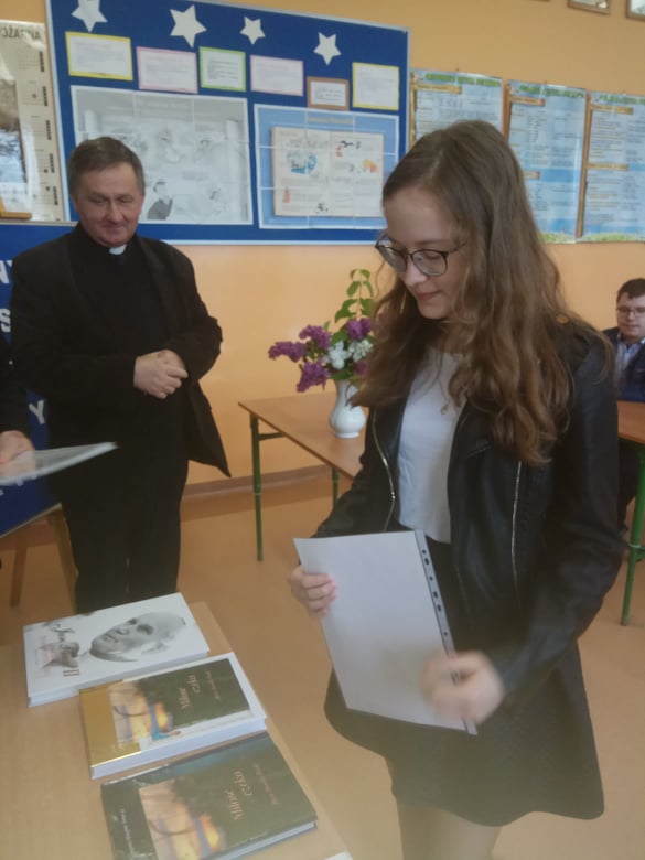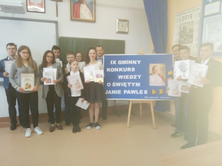 17 maja w naszej szkole odbył się IX Gminny Konkurs Wiedzy o Świętym Janie Pawle II. Do konkursu przystąpili uczniowie ze wszystkich szkół naszej gminy. Po pisemnych zmaganiach z testem składającym się z 30 pytań, komisja konkursowa wyłoniła zwycięzców. Miejsce I zdobył Kacper Skiba z kl. VIII SZS we Frampolu,natomiast pozostałe miejsca na podium przypadły naszym uczennicom : II miejsce dla Julii Czajki z kl.VIII, a miejsce III dla Wiktorii Kaziród kl.VIII. W konkursie wziął także udział Rafał Czajka z kl. VII. Wszyscy uczestnicy konkursu otrzymali nagrody książkowe oraz dyplomy. Serdeczne podziękowania składamy proboszczowi Parafii Radzięcin ks. Adamowi Czupichowi za ufundowanie nagród, oraz pracę w komisji konkursowej.