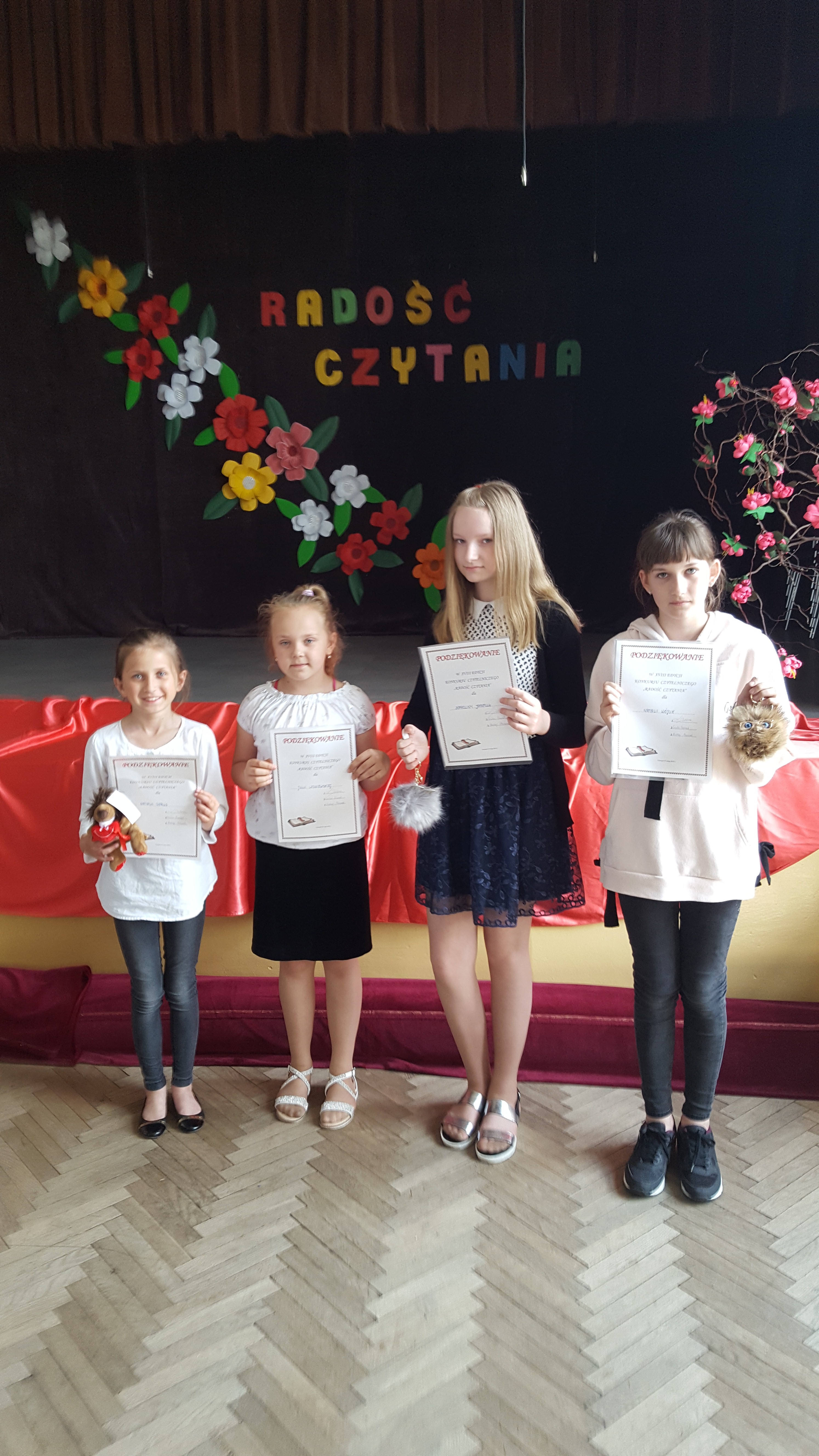 W MGOK-y we Frampolu odbyły się czytelnicze eliminacje konkursowe do etapu powiatowego, w których jak co roku wzięliśmy udział. Organizatorem konkursu "Radość czytania" jest od wielu już lat Powiatowa Biblioteka Publiczna w Biłgoraju we współpracy z bibliotekami z terenu powiatu. Uczennice: Julia Leśniewska i Natalia Deruś z klasy IV oraz Natalia Wójcik z kl. V i Karolina Jarmuł z kl. VI reprezentowały naszą szkołę, za piękne czytanie wybranych fragmentów książek otrzymały od organizatorów podziękowania i maskotki.