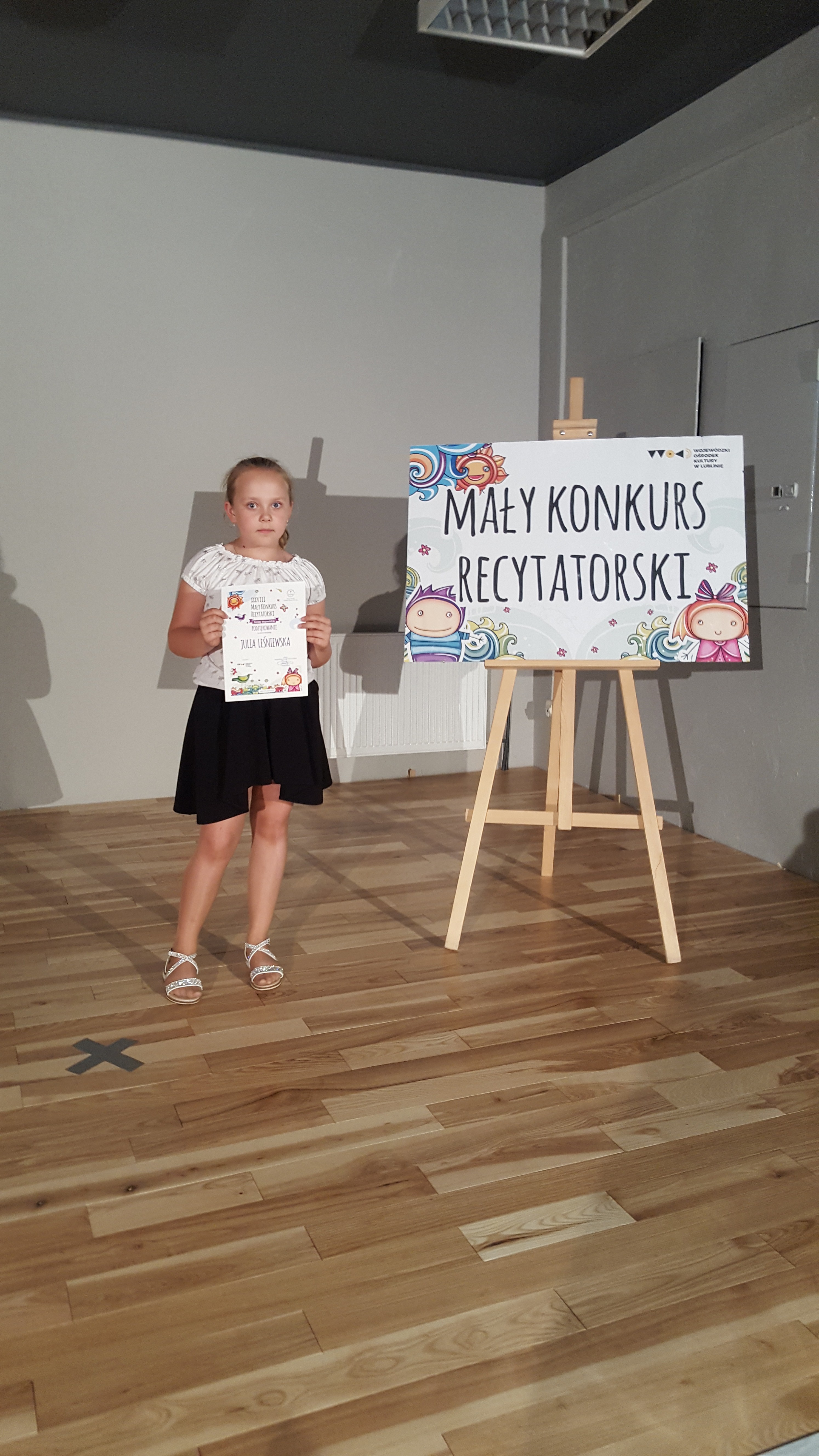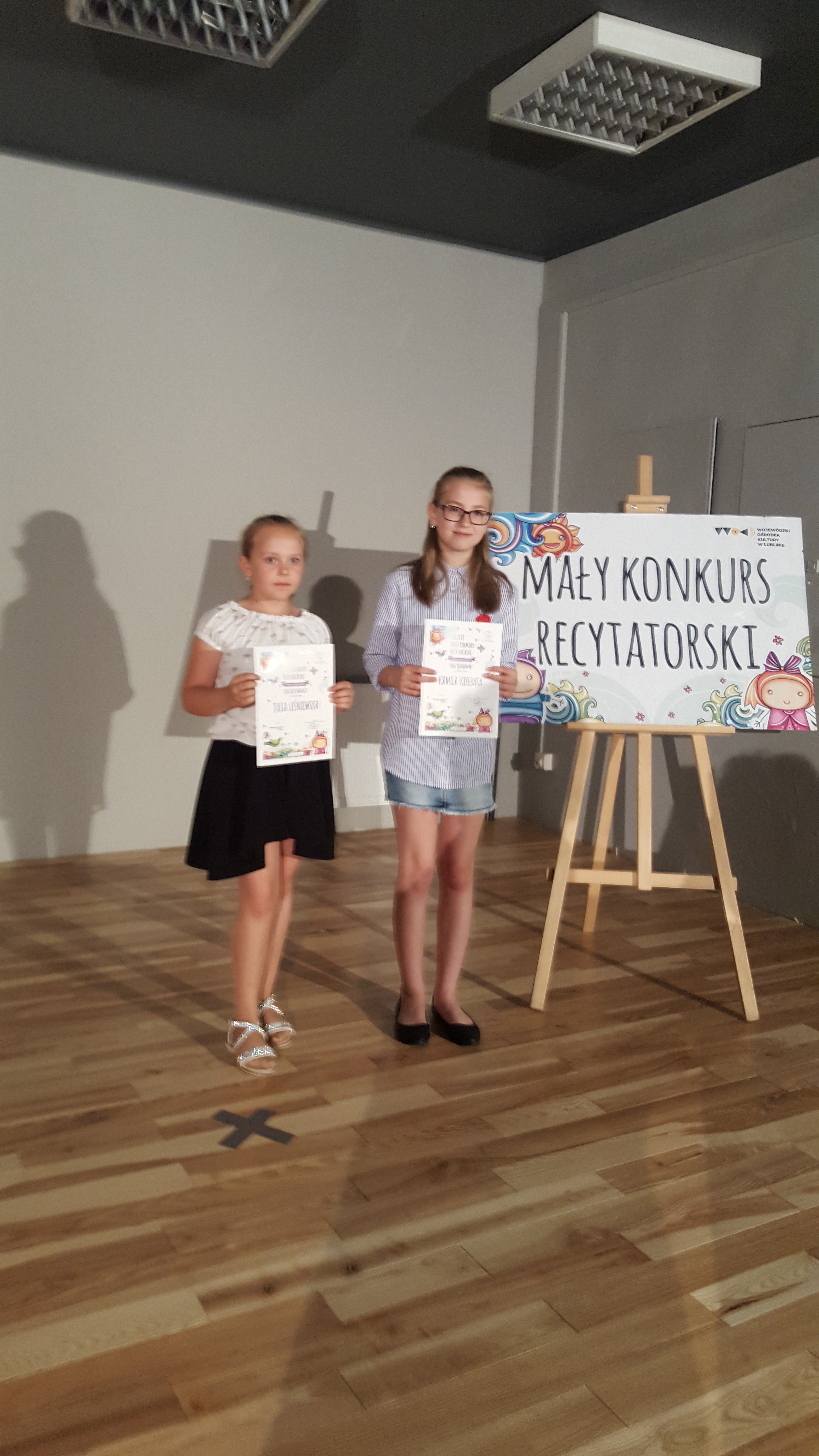 W dniu 5 czerwca 2019 mieliśmy zaszczyt wziąć udział w Koncercie Laureatów Turnieju Wojewódzkiego w siedzibie WOK-y w Lublinie. Mały Konkurs Recytatorski odbywa się pod honorowym patronatem Lubelskiego Kuratora Oświaty Pani Teresy Misiuk. Julia Leśniewska z klasy IV - finalistka etapu powiatowego - znalazła się wśród 56 najlepszych recytatorów w kategorii klas IV-VI w województwie. Nasza recytatorka dostarczyła publiczności wielu przyjemnych wrażeń, prezentując na scenie wiersz Jana Brzechwy „Na straganie”. W dowód uznania otrzymała od jury tym razem podziękowanie. Mamy nadzieję, że to dopiero początek pięknej i świadomej recytacji naszej uczennicy Julii. Życzymy sukcesów w kolejnych latach. Jak widać na zdjęciu, takie wyjazdy to też dobra okazja do zawierania nowych przyjaźni.