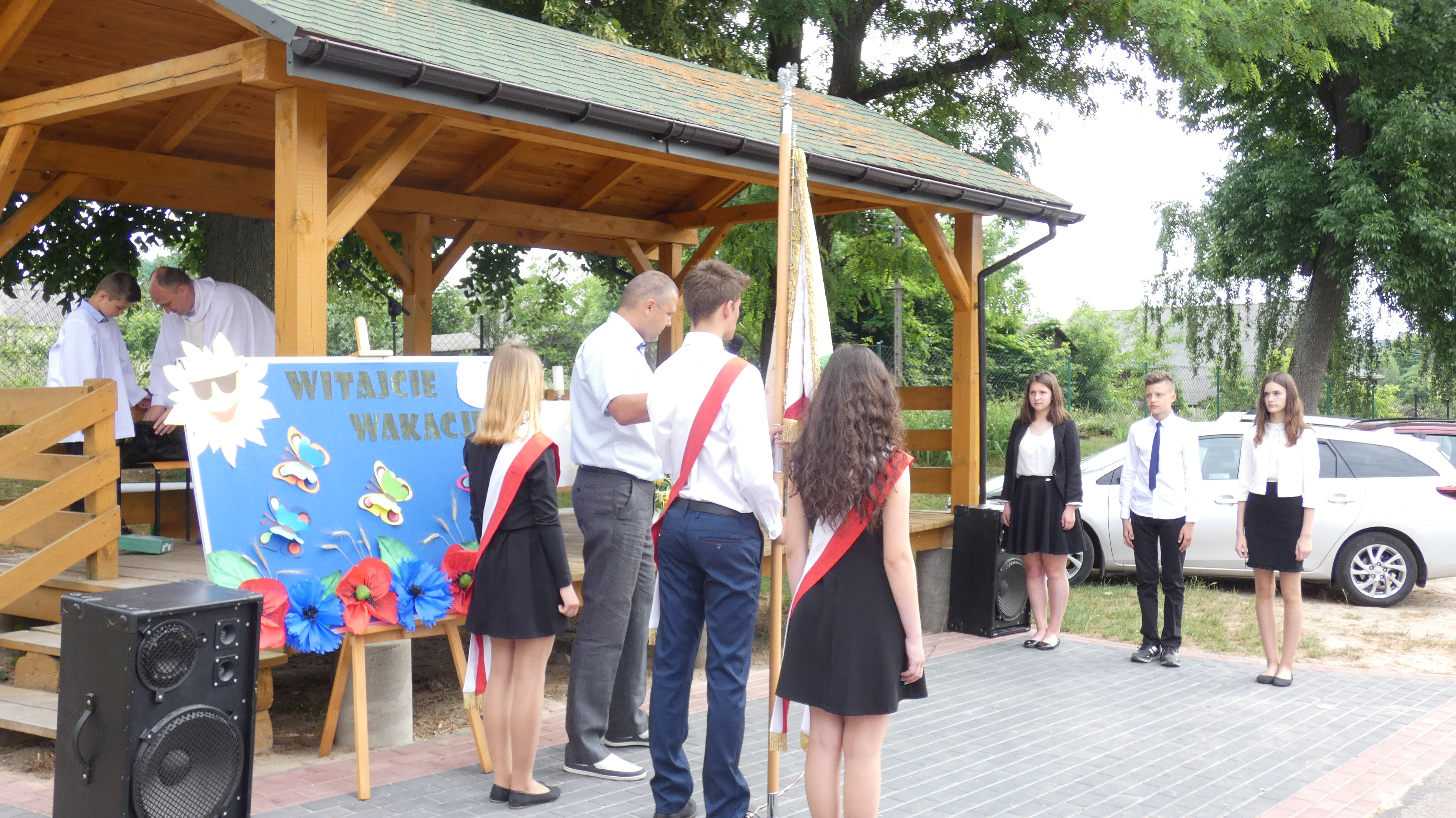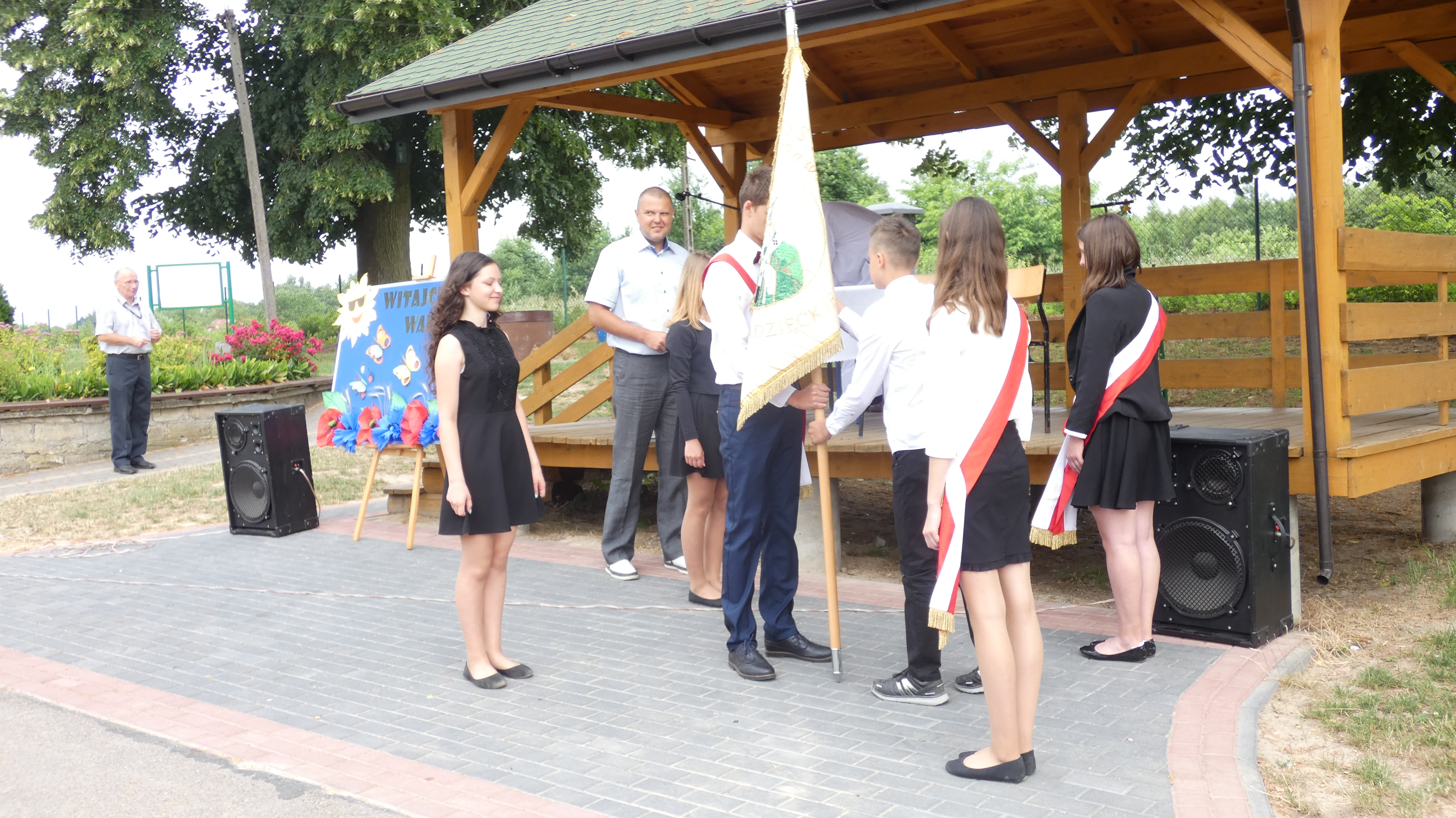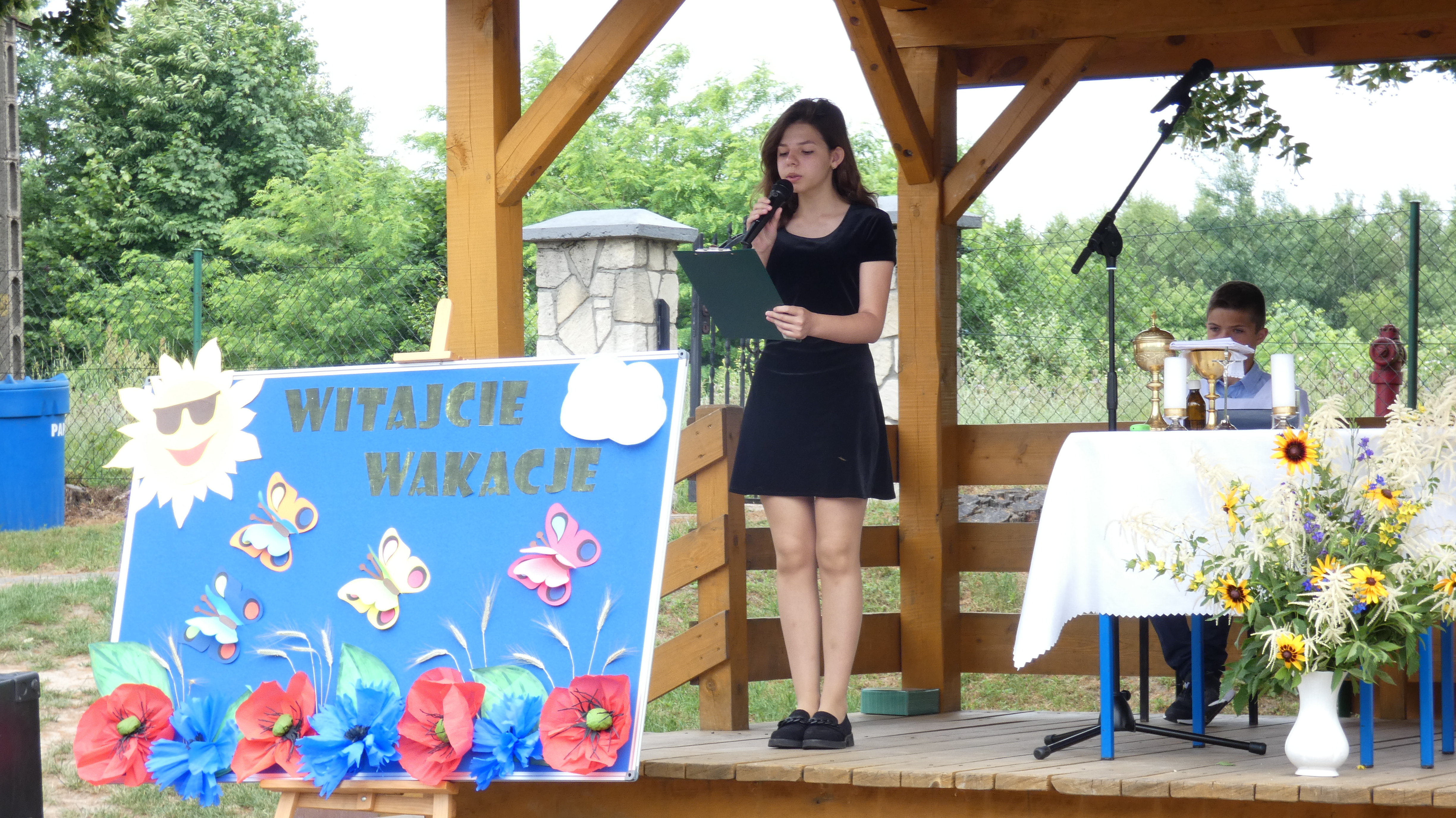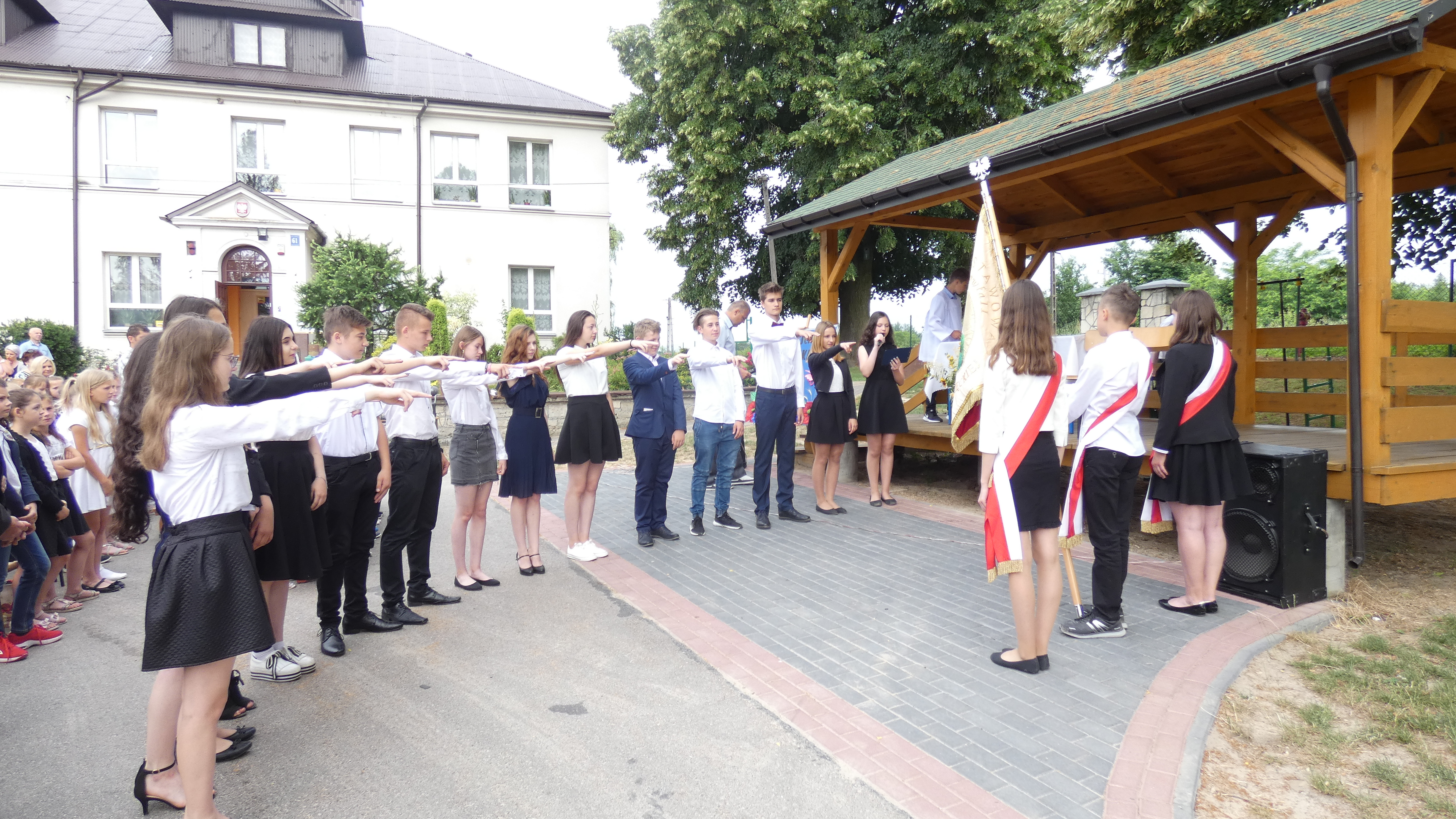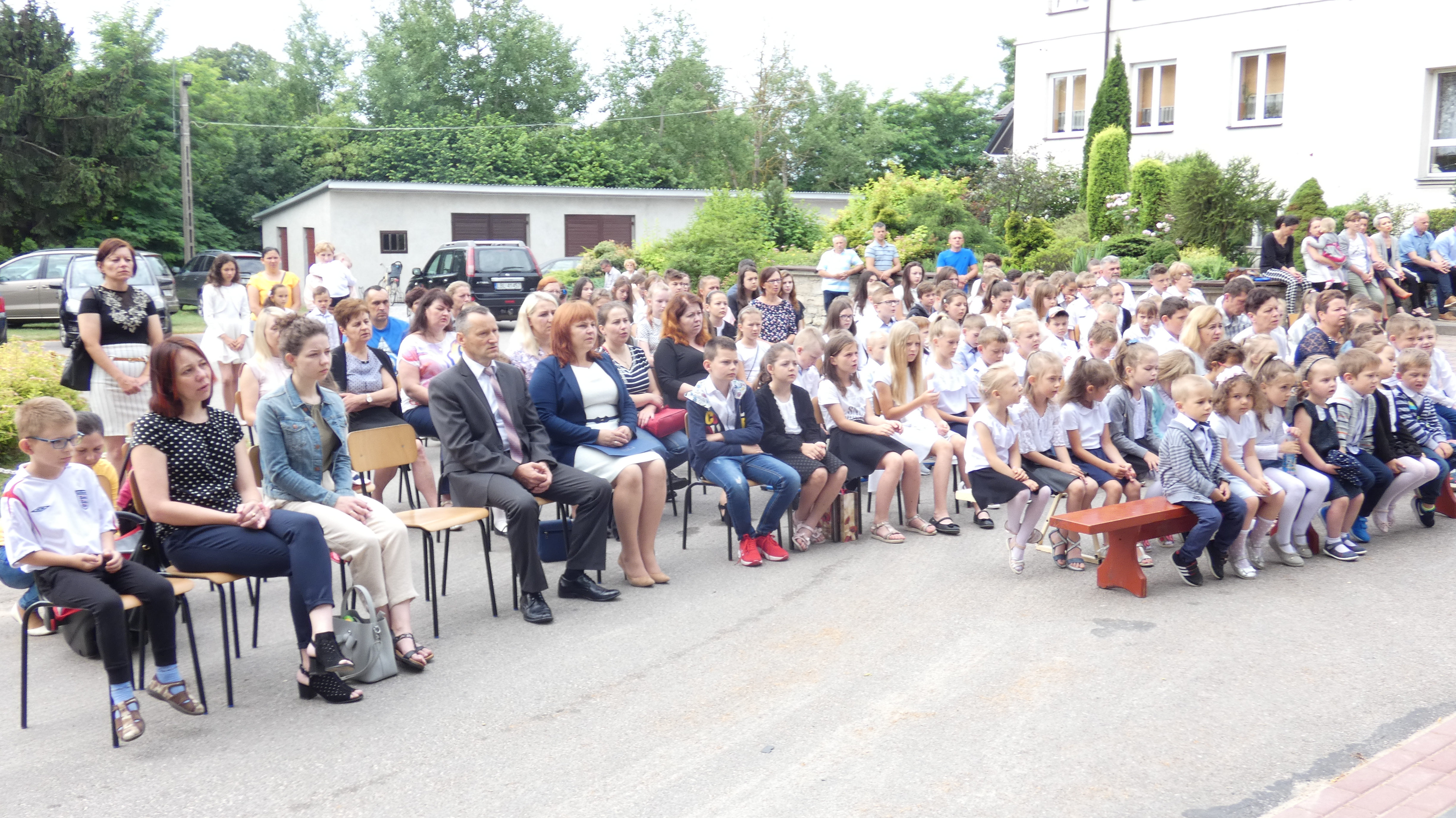 19 czerwca odbyło się w naszej szkole uroczyste zakończenie roku szkolnego. Rozpoczęło się ono wprowadzeniem pocztu sztandarowego, następnie odśpiewany został Mazurek Dąbrowskiego. Kolejnym punktem uroczystości była Msza Święta, którą odprawił Ks. Krzysztof Paluch z Radzięcina. Po jej zakończeniu odbyło się przekazanie sztandaru szkoły przez poczet klasy VIII, pocztowi klasy VII oraz ślubowanie absolwentów naszej szkoły. W dalszej kolejności głos zabrał Dyrektor Szkoły - mgr Stanisław Saj, który powitał zaproszonych gości i rodziców. Władze samorządowe reprezentowała Pani Anna Ruszczak - Sekretarz Gminy Frampol. Następną częścią uroczystości było wręczenie świadectw z wyróżnieniem oraz nagród książkowych i rzeczowych wyróżniającym się uczniom oraz listów gratulacyjnych i podziękowań ich rodzicom. Dokonał tego Dyrektora Szkoły w towarzystwie Pani Sekretarz, która jednocześnie w imieniu władz samorządowych podziękowała wyróżnionym uczniom, życząc udanych wakacji. Słowa podziękowania skierowała również w stronę nauczycieli. Na tym jednak uroczystość się nie zakończyła. Kolejnym jej elementem był okolicznościowy występ artystyczny w wykonaniu ósmoklasistów - "Dzień z życia ucznia w szkole." Pozwolił on nieco humorystycznie spojrzeć na dole i niedole życia ucznia w szkole. Jak stwierdzili wykonawcy, wszelka zbieżność postaci i sytuacji była raczej przypadkowa:) Występ spotkał się z żywiołową, połączoną ze śmiechem, reakcją publiczności i zyskał duże uznanie wśród zebranych. Po jego zakończeniu Dyrektor Szkoły podziękował absolwentom nie tylko za występ, ale też za przygotowywanie i udział w innych uroczystościach, imprezach, konkursach szkolnych i pozaszkolnych. Ostatnim punktem uroczystości było podziękowanie nauczycielom i paniom woźnym złożone przez ósmoklasistów. Zakończył się kolejny etap w życiu szkoły i kolejnego rocznika jej absolwentów, rocznika wyjątkowego. Pożegnaniu towarzyszyła radość, smutek i wzruszenie. W oczach części uczniów, rodziców, nauczycieli pojawiły się kropelki łez.