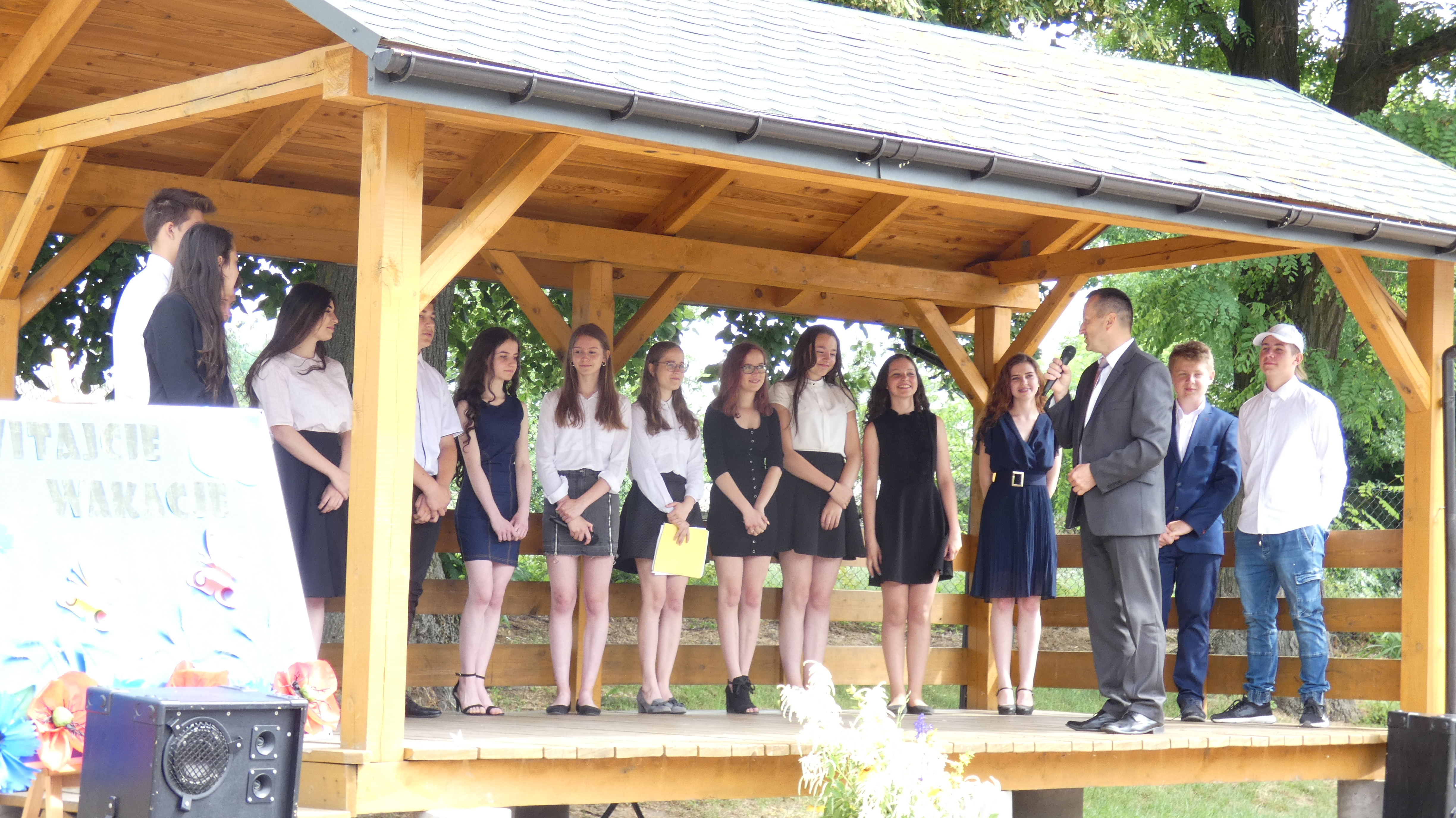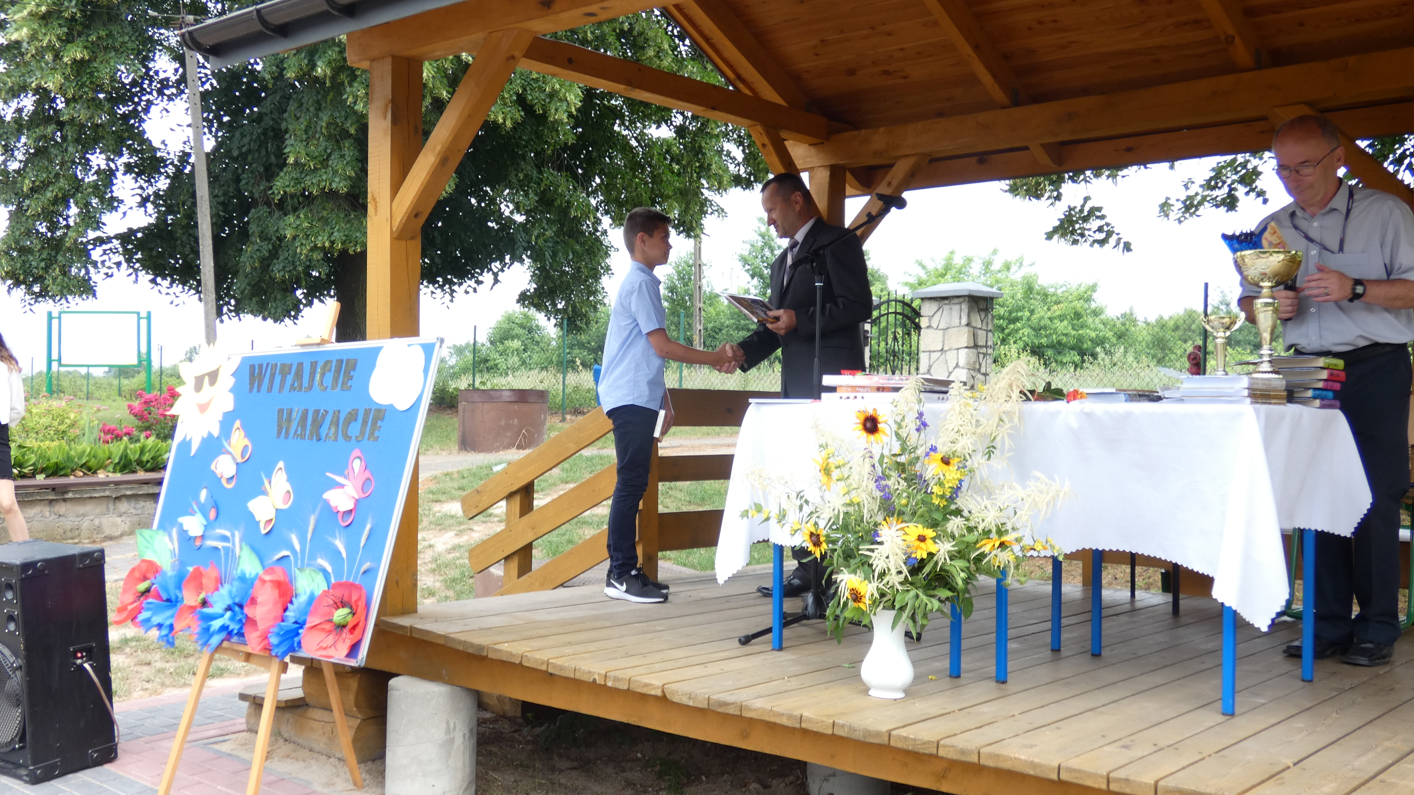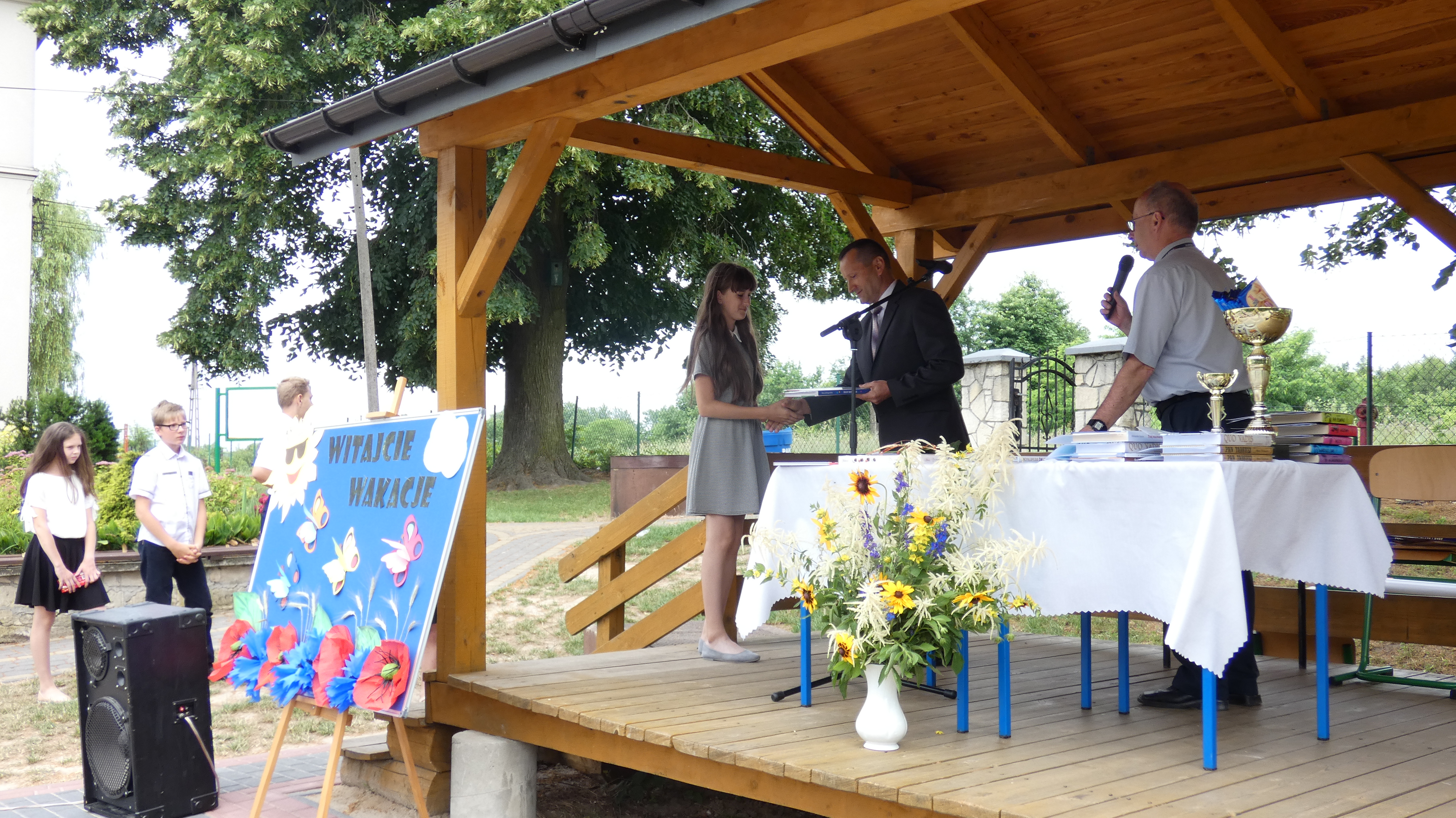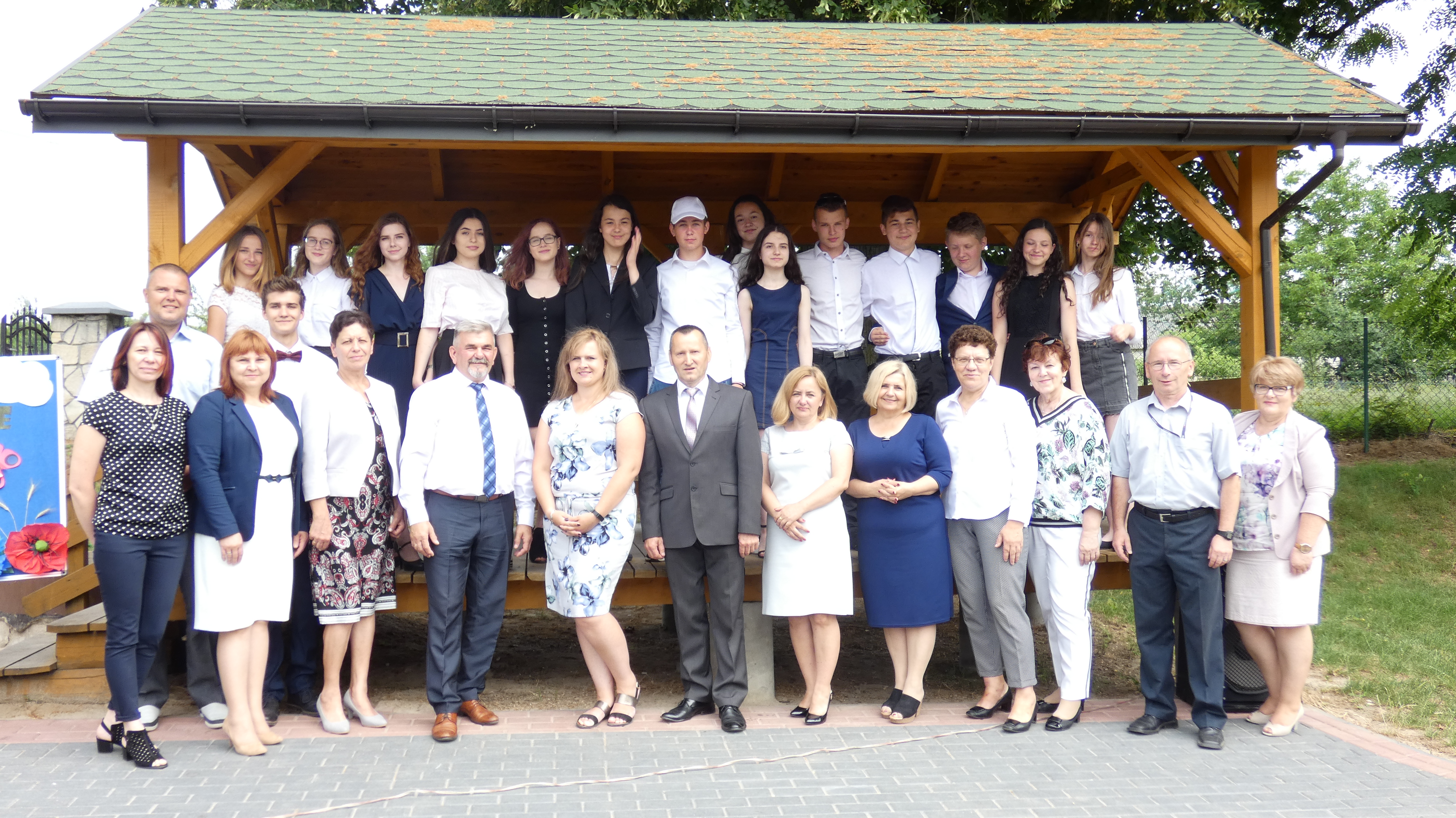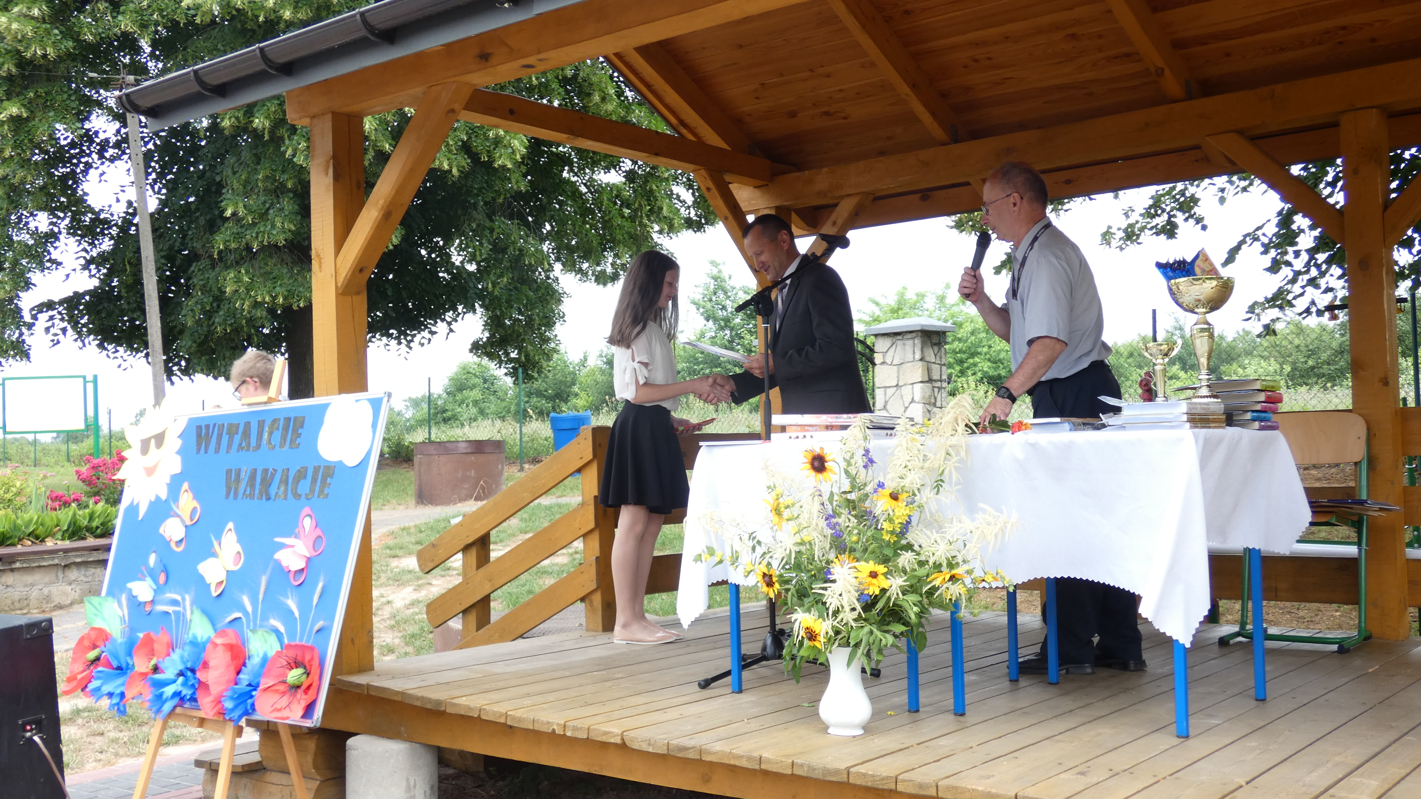 19 czerwca odbyło się w naszej szkole uroczyste zakończenie roku szkolnego. Rozpoczęło się ono wprowadzeniem pocztu sztandarowego, następnie odśpiewany został Mazurek Dąbrowskiego. Kolejnym punktem uroczystości była Msza Święta, którą odprawił Ks. Krzysztof Paluch z Radzięcina. Po jej zakończeniu odbyło się przekazanie sztandaru szkoły przez poczet klasy VIII, pocztowi klasy VII oraz ślubowanie absolwentów naszej szkoły. W dalszej kolejności głos zabrał Dyrektor Szkoły - mgr Stanisław Saj, który powitał zaproszonych gości i rodziców. Władze samorządowe reprezentowała Pani Anna Ruszczak - Sekretarz Gminy Frampol. Następną częścią uroczystości było wręczenie świadectw z wyróżnieniem oraz nagród książkowych i rzeczowych wyróżniającym się uczniom oraz listów gratulacyjnych i podziękowań ich rodzicom. Dokonał tego Dyrektora Szkoły w towarzystwie Pani Sekretarz, która jednocześnie w imieniu władz samorządowych podziękowała wyróżnionym uczniom, życząc udanych wakacji. Słowa podziękowania skierowała również w stronę nauczycieli. Na tym jednak uroczystość się nie zakończyła. Kolejnym jej elementem był okolicznościowy występ artystyczny w wykonaniu ósmoklasistów - "Dzień z życia ucznia w szkole." Pozwolił on nieco humorystycznie spojrzeć na dole i niedole życia ucznia w szkole. Jak stwierdzili wykonawcy, wszelka zbieżność postaci i sytuacji była raczej przypadkowa:) Występ spotkał się z żywiołową, połączoną ze śmiechem, reakcją publiczności i zyskał duże uznanie wśród zebranych. Po jego zakończeniu Dyrektor Szkoły podziękował absolwentom nie tylko za występ, ale też za przygotowywanie i udział w innych uroczystościach, imprezach, konkursach szkolnych i pozaszkolnych. Ostatnim punktem uroczystości było podziękowanie nauczycielom i paniom woźnym złożone przez ósmoklasistów. Zakończył się kolejny etap w życiu szkoły i kolejnego rocznika jej absolwentów, rocznika wyjątkowego. Pożegnaniu towarzyszyła radość, smutek i wzruszenie. W oczach części uczniów, rodziców, nauczycieli pojawiły się kropelki łez.