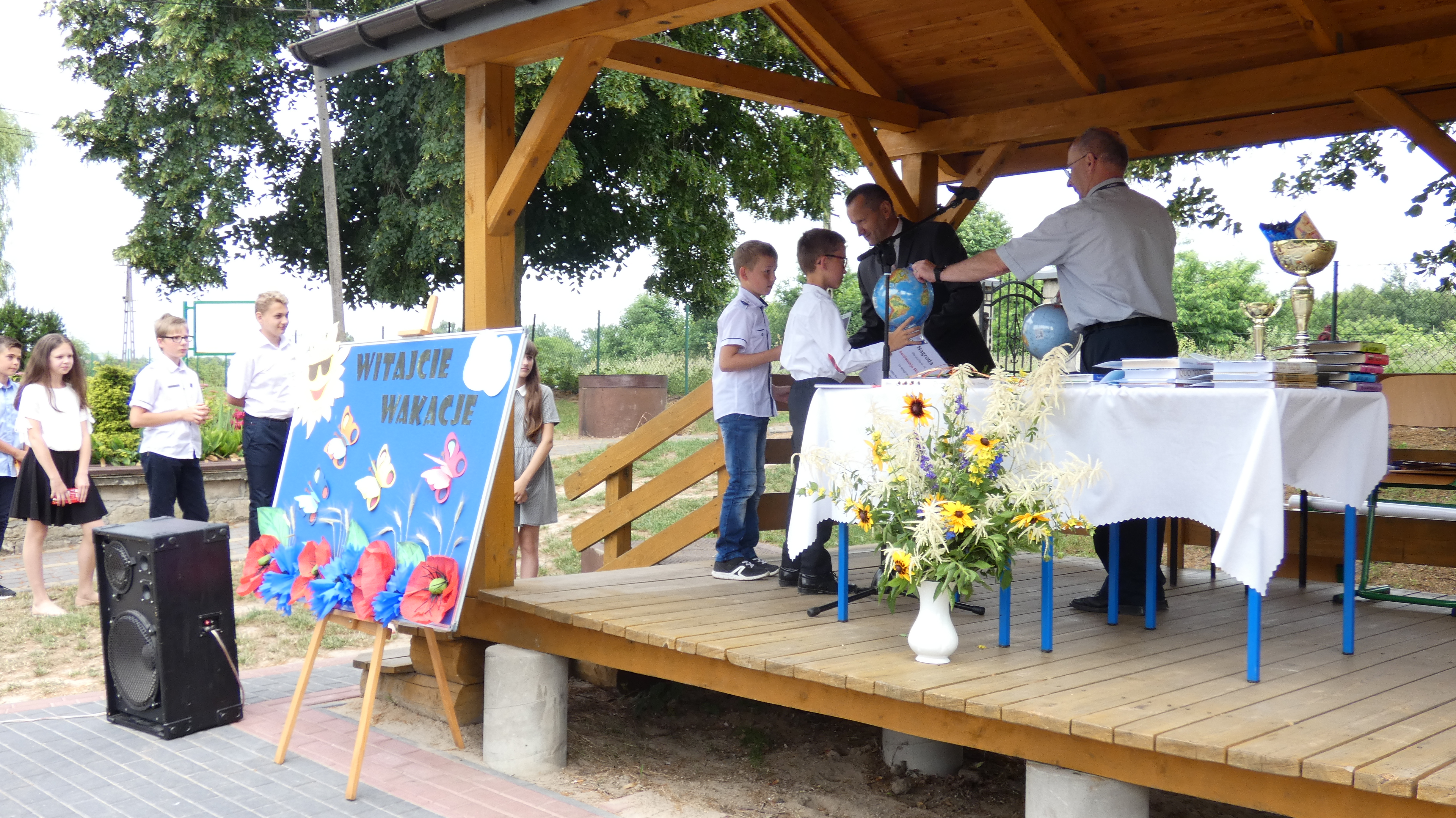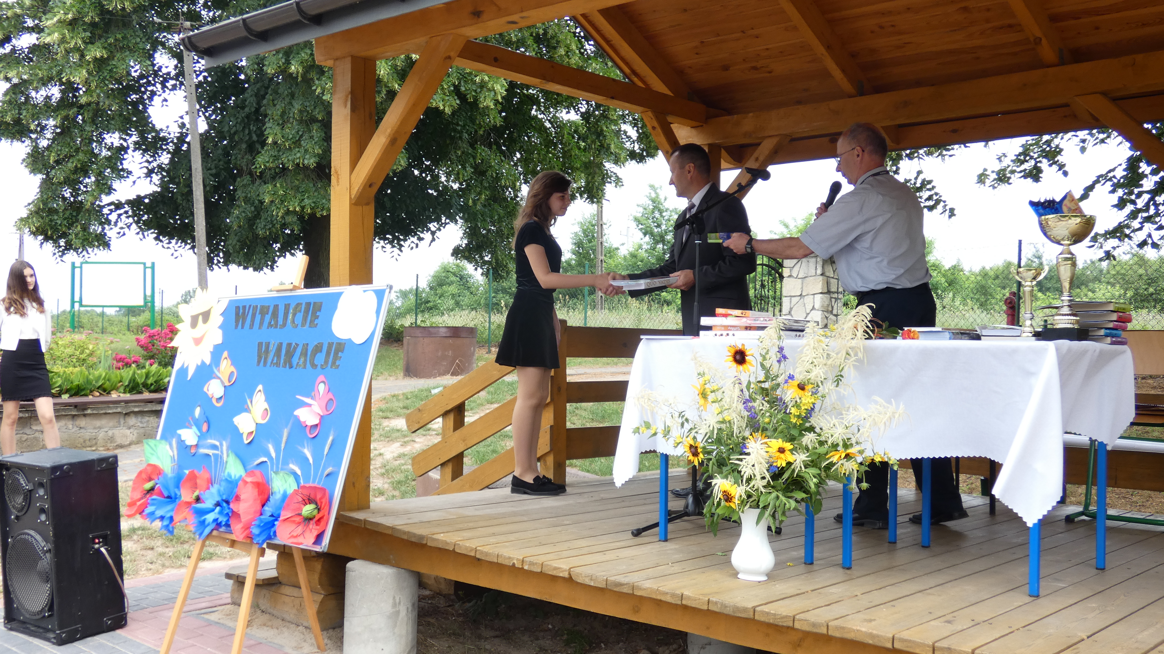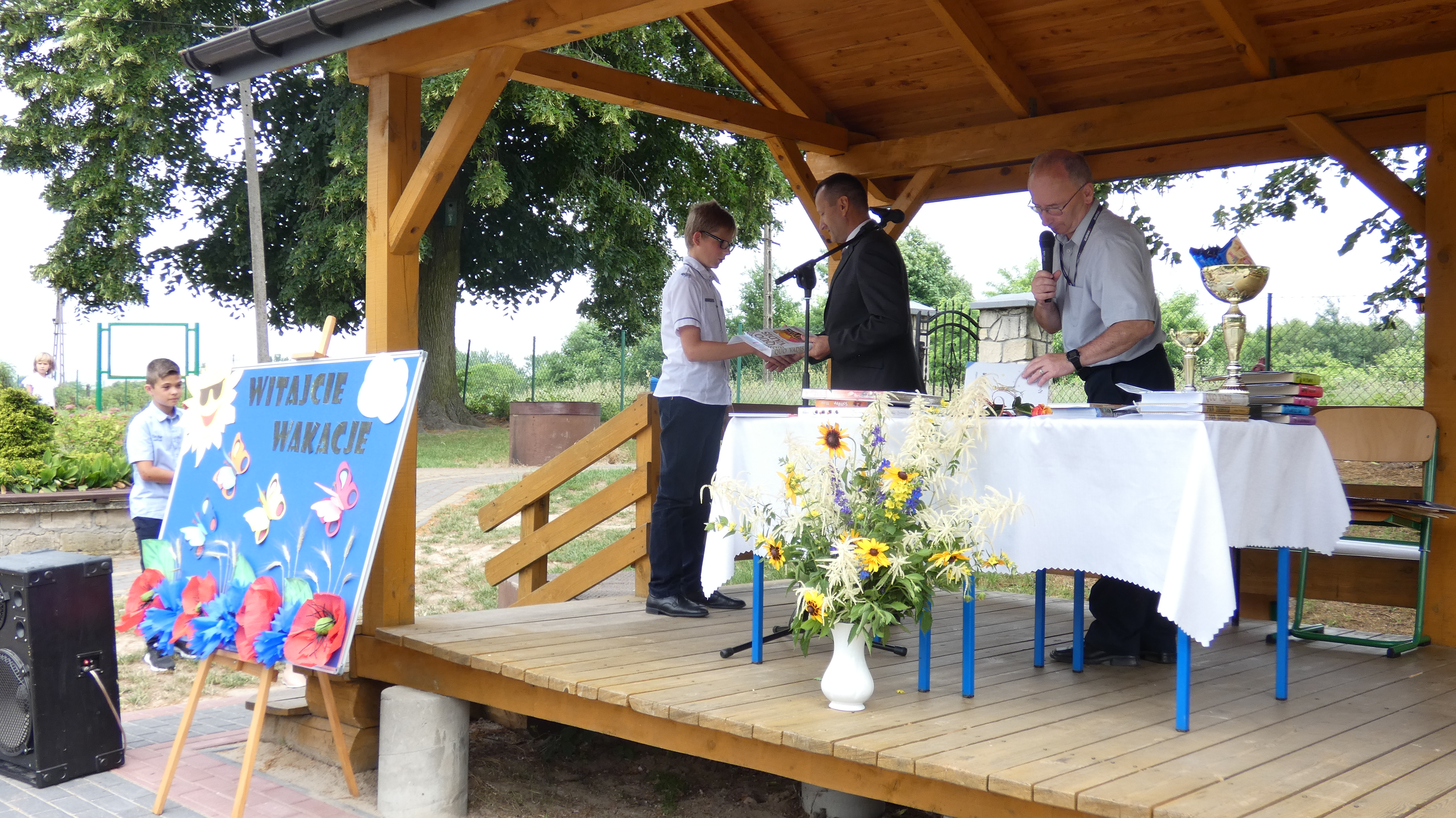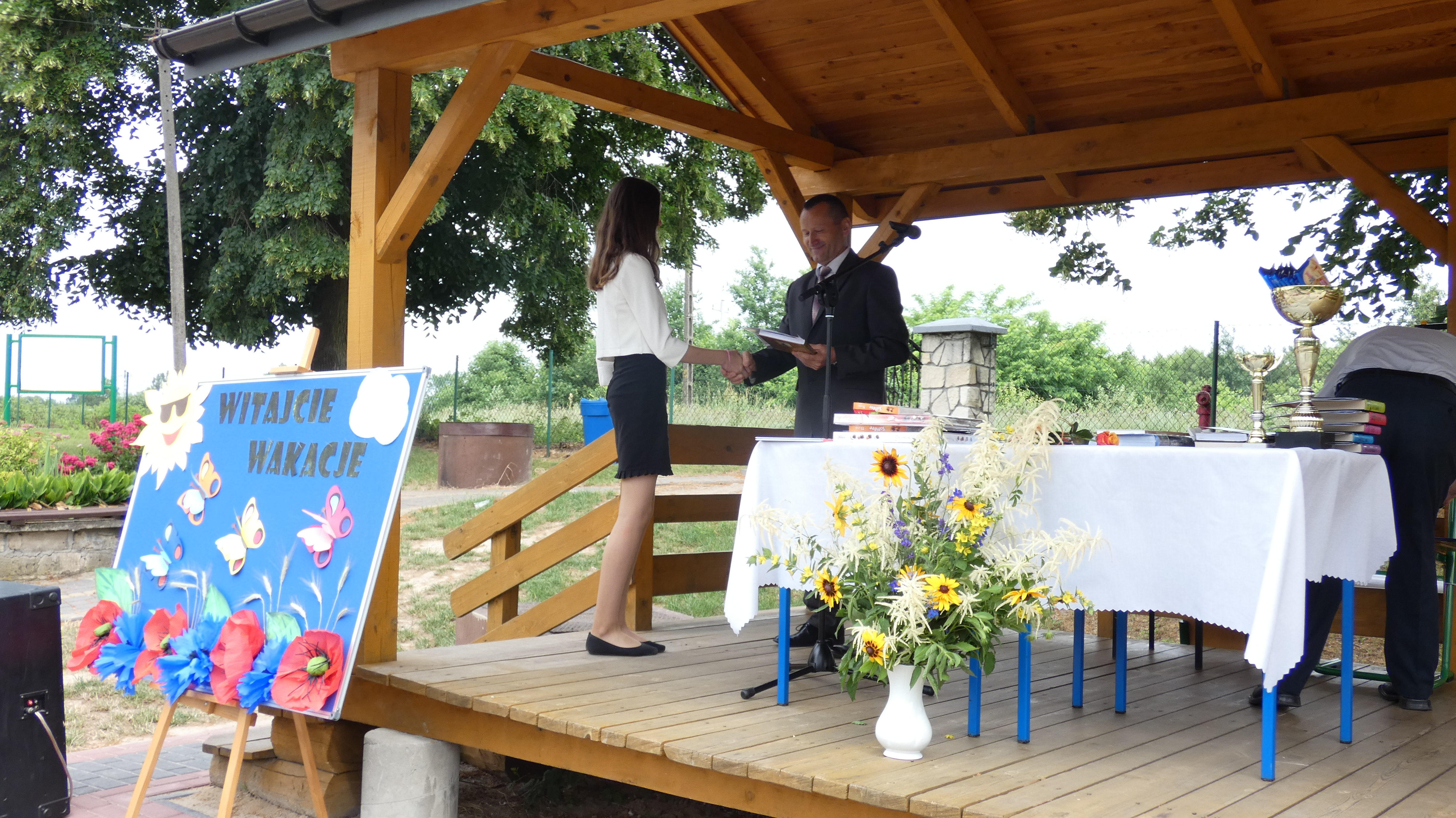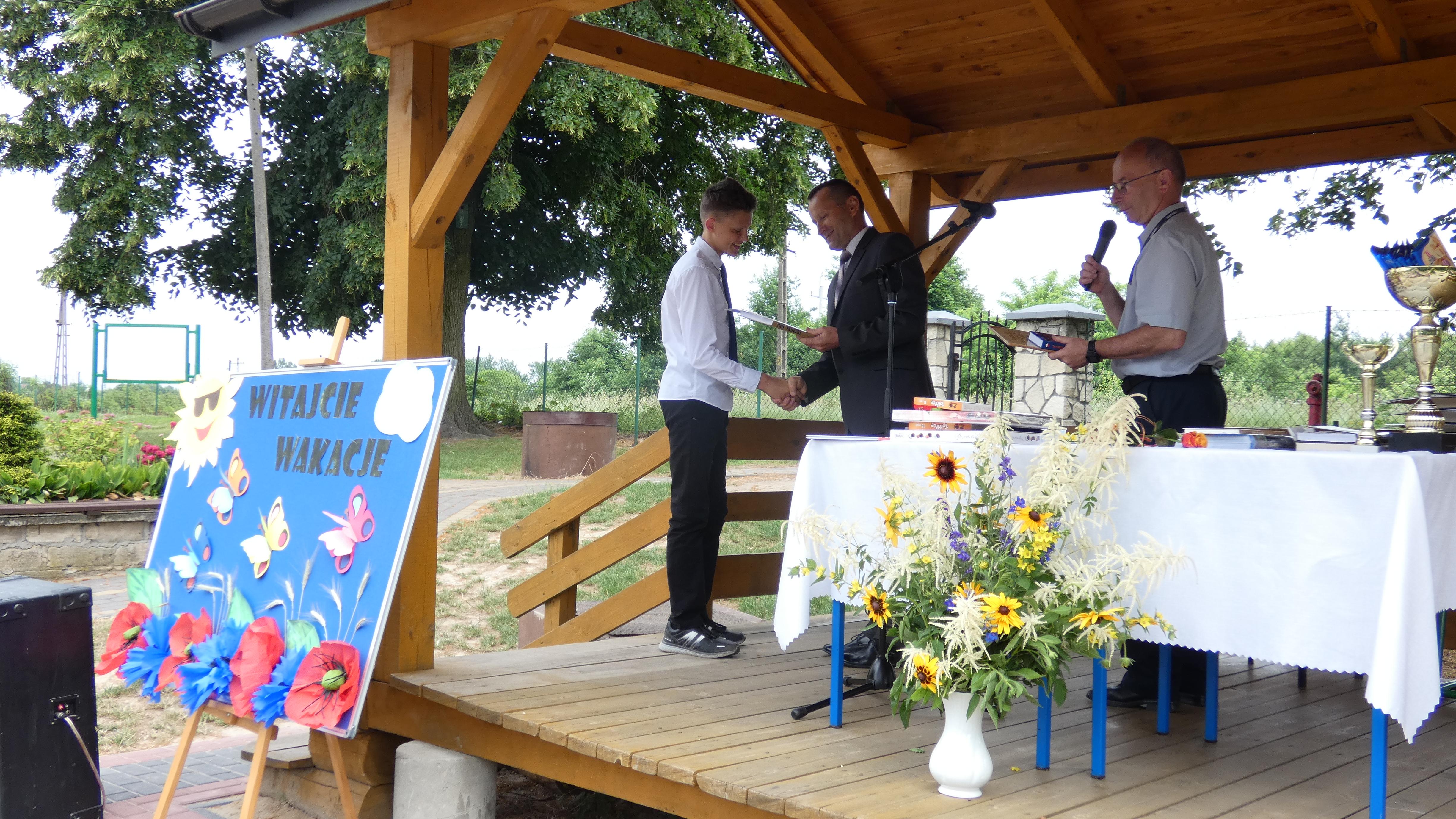 19 czerwca odbyło się w naszej szkole uroczyste zakończenie roku szkolnego. Rozpoczęło się ono wprowadzeniem pocztu sztandarowego, następnie odśpiewany został Mazurek Dąbrowskiego. Kolejnym punktem uroczystości była Msza Święta, którą odprawił Ks. Krzysztof Paluch z Radzięcina. Po jej zakończeniu odbyło się przekazanie sztandaru szkoły przez poczet klasy VIII, pocztowi klasy VII oraz ślubowanie absolwentów naszej szkoły. W dalszej kolejności głos zabrał Dyrektor Szkoły - mgr Stanisław Saj, który powitał zaproszonych gości i rodziców. Władze samorządowe reprezentowała Pani Anna Ruszczak - Sekretarz Gminy Frampol. Następną częścią uroczystości było wręczenie świadectw z wyróżnieniem oraz nagród książkowych i rzeczowych wyróżniającym się uczniom oraz listów gratulacyjnych i podziękowań ich rodzicom. Dokonał tego Dyrektora Szkoły w towarzystwie Pani Sekretarz, która jednocześnie w imieniu władz samorządowych podziękowała wyróżnionym uczniom, życząc udanych wakacji. Słowa podziękowania skierowała również w stronę nauczycieli. Na tym jednak uroczystość się nie zakończyła. Kolejnym jej elementem był okolicznościowy występ artystyczny w wykonaniu ósmoklasistów - "Dzień z życia ucznia w szkole." Pozwolił on nieco humorystycznie spojrzeć na dole i niedole życia ucznia w szkole. Jak stwierdzili wykonawcy, wszelka zbieżność postaci i sytuacji była raczej przypadkowa:) Występ spotkał się z żywiołową, połączoną ze śmiechem, reakcją publiczności i zyskał duże uznanie wśród zebranych. Po jego zakończeniu Dyrektor Szkoły podziękował absolwentom nie tylko za występ, ale też za przygotowywanie i udział w innych uroczystościach, imprezach, konkursach szkolnych i pozaszkolnych. Ostatnim punktem uroczystości było podziękowanie nauczycielom i paniom woźnym złożone przez ósmoklasistów. Zakończył się kolejny etap w życiu szkoły i kolejnego rocznika jej absolwentów, rocznika wyjątkowego. Pożegnaniu towarzyszyła radość, smutek i wzruszenie. W oczach części uczniów, rodziców, nauczycieli pojawiły się kropelki łez.
