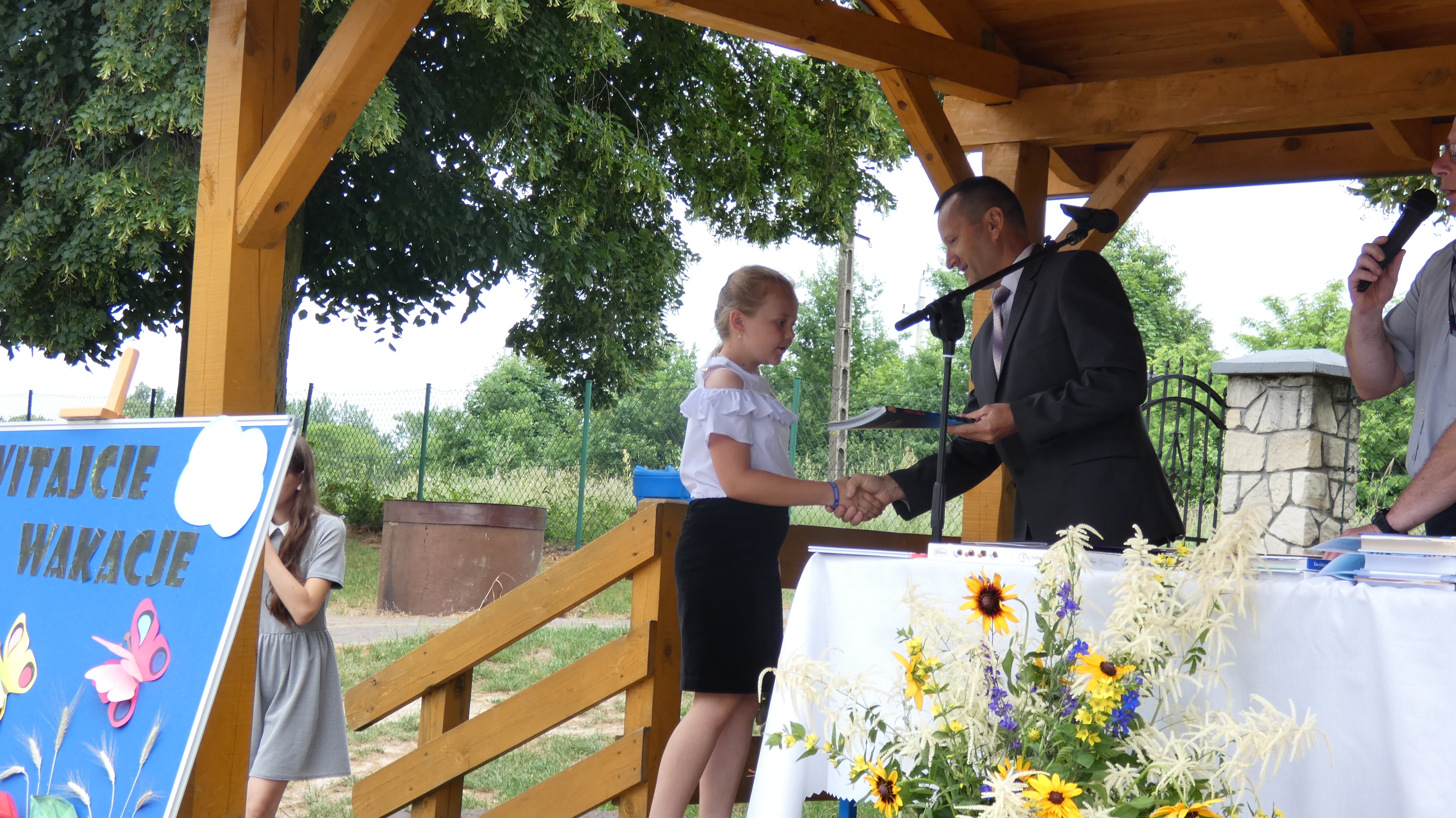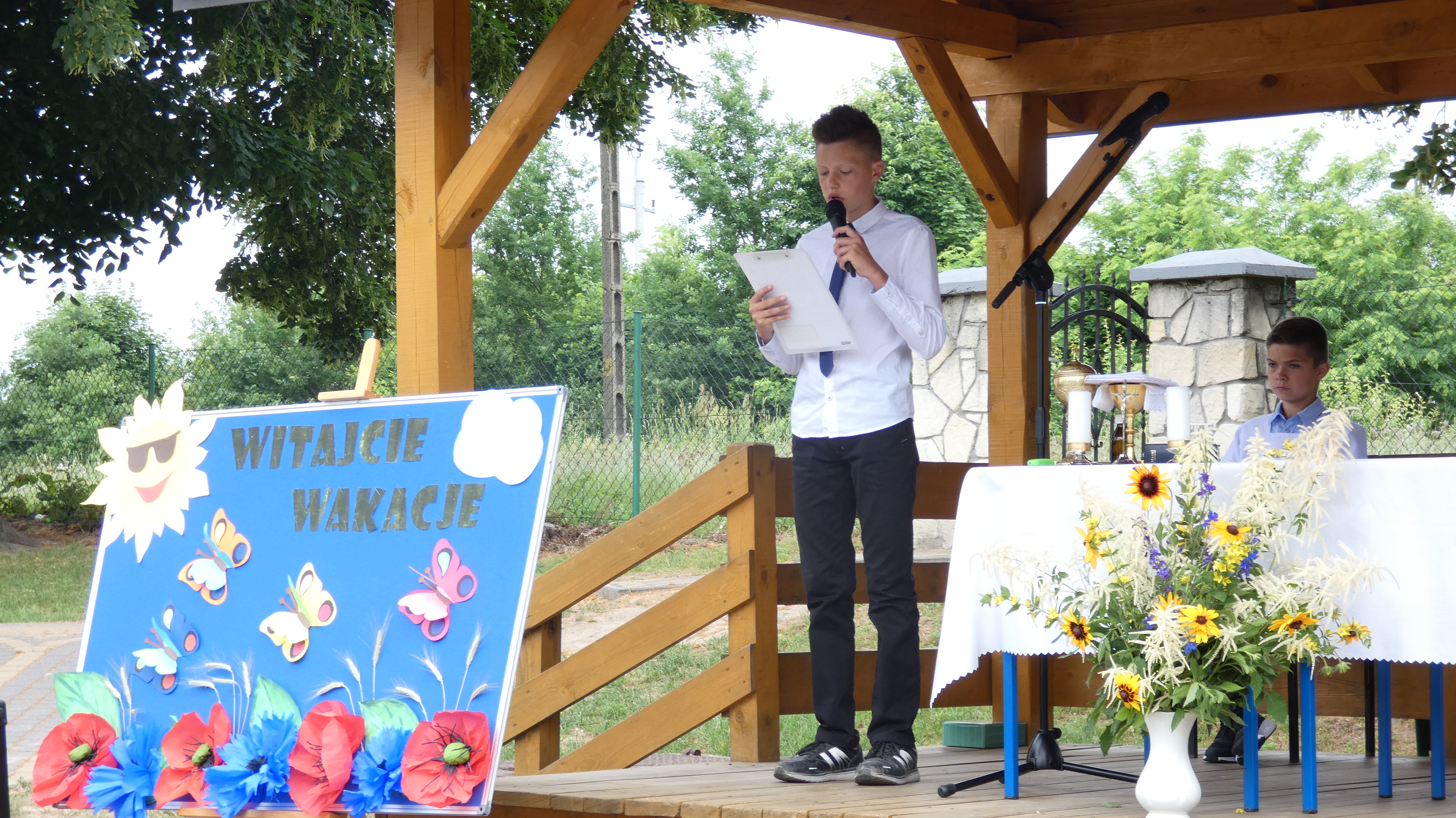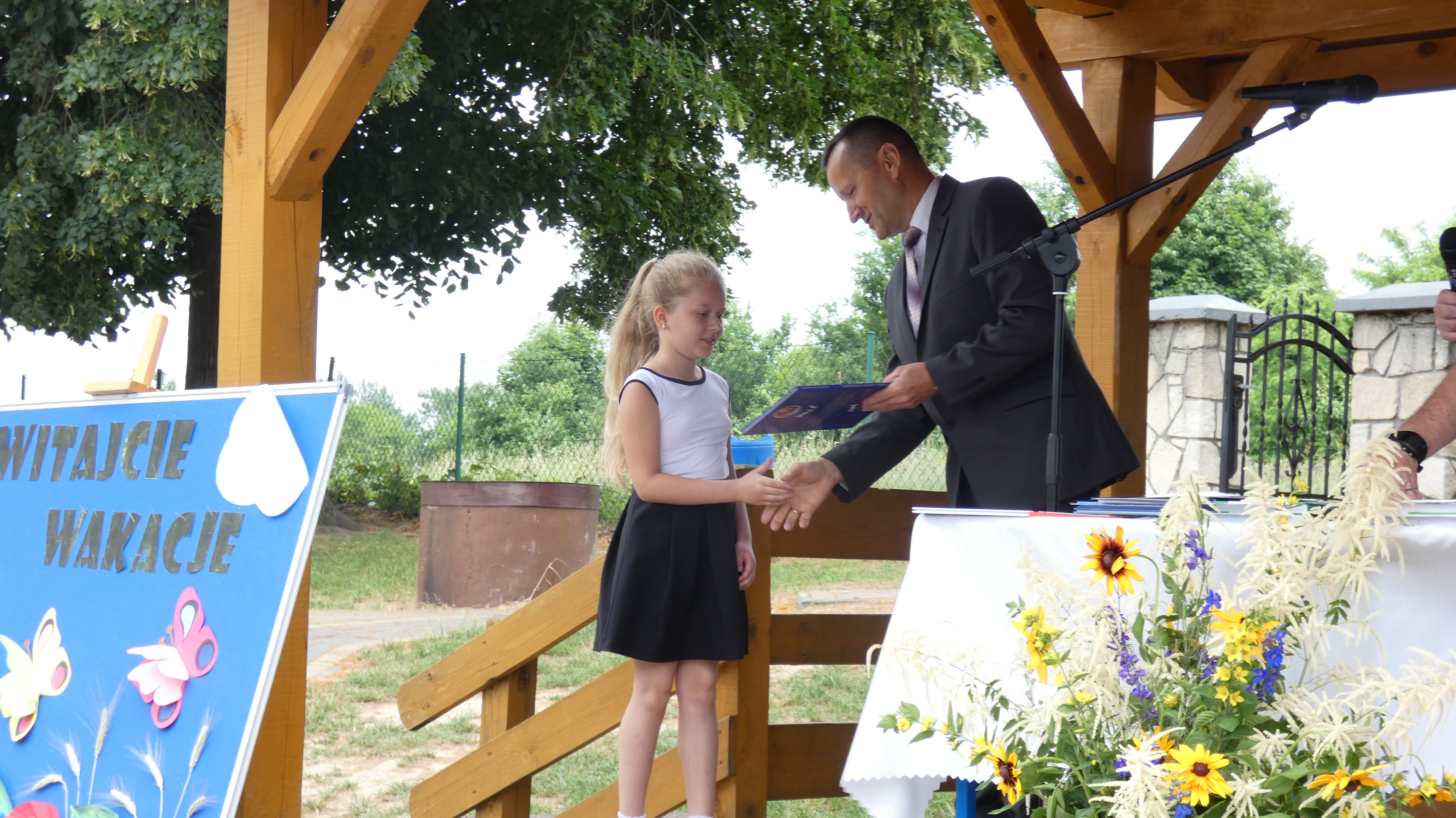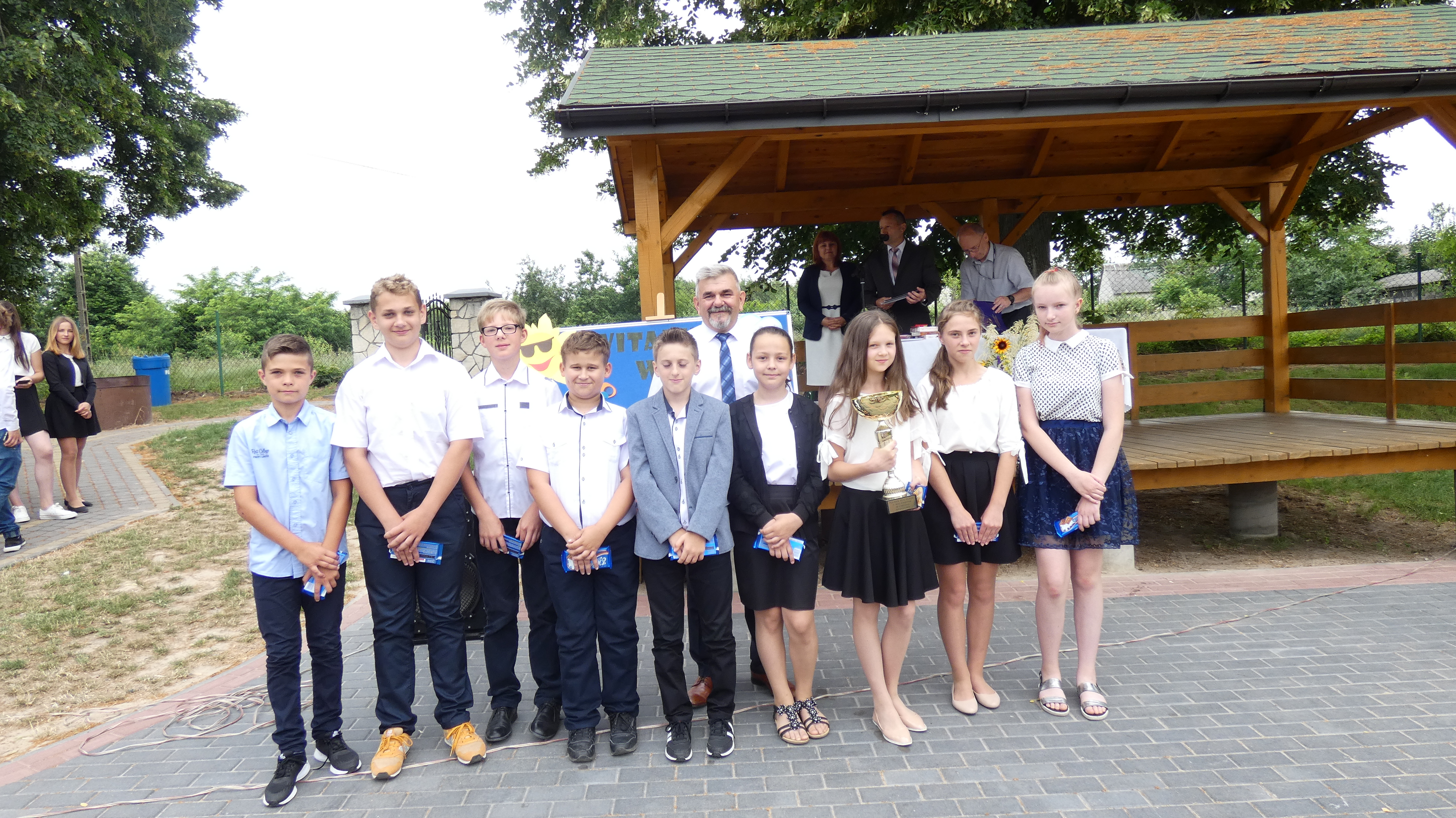 19 czerwca odbyło się w naszej szkole uroczyste zakończenie roku szkolnego. Rozpoczęło się ono wprowadzeniem pocztu sztandarowego, następnie odśpiewany został Mazurek Dąbrowskiego. Kolejnym punktem uroczystości była Msza Święta, którą odprawił Ks. Krzysztof Paluch z Radzięcina. Po jej zakończeniu odbyło się przekazanie sztandaru szkoły przez poczet klasy VIII, pocztowi klasy VII oraz ślubowanie absolwentów naszej szkoły. W dalszej kolejności głos zabrał Dyrektor Szkoły - mgr Stanisław Saj, który powitał zaproszonych gości i rodziców. Władze samorządowe reprezentowała Pani Anna Ruszczak - Sekretarz Gminy Frampol. Następną częścią uroczystości było wręczenie świadectw z wyróżnieniem oraz nagród książkowych i rzeczowych wyróżniającym się uczniom oraz listów gratulacyjnych i podziękowań ich rodzicom. Dokonał tego Dyrektora Szkoły w towarzystwie Pani Sekretarz, która jednocześnie w imieniu władz samorządowych podziękowała wyróżnionym uczniom, życząc udanych wakacji. Słowa podziękowania skierowała również w stronę nauczycieli. Na tym jednak uroczystość się nie zakończyła. Kolejnym jej elementem był okolicznościowy występ artystyczny w wykonaniu ósmoklasistów - "Dzień z życia ucznia w szkole." Pozwolił on nieco humorystycznie spojrzeć na dole i niedole życia ucznia w szkole. Jak stwierdzili wykonawcy, wszelka zbieżność postaci i sytuacji była raczej przypadkowa:) Występ spotkał się z żywiołową, połączoną ze śmiechem, reakcją publiczności i zyskał duże uznanie wśród zebranych. Po jego zakończeniu Dyrektor Szkoły podziękował absolwentom nie tylko za występ, ale też za przygotowywanie i udział w innych uroczystościach, imprezach, konkursach szkolnych i pozaszkolnych. Ostatnim punktem uroczystości było podziękowanie nauczycielom i paniom woźnym złożone przez ósmoklasistów. Zakończył się kolejny etap w życiu szkoły i kolejnego rocznika jej absolwentów, rocznika wyjątkowego. Pożegnaniu towarzyszyła radość, smutek i wzruszenie. W oczach części uczniów, rodziców, nauczycieli pojawiły się kropelki łez.