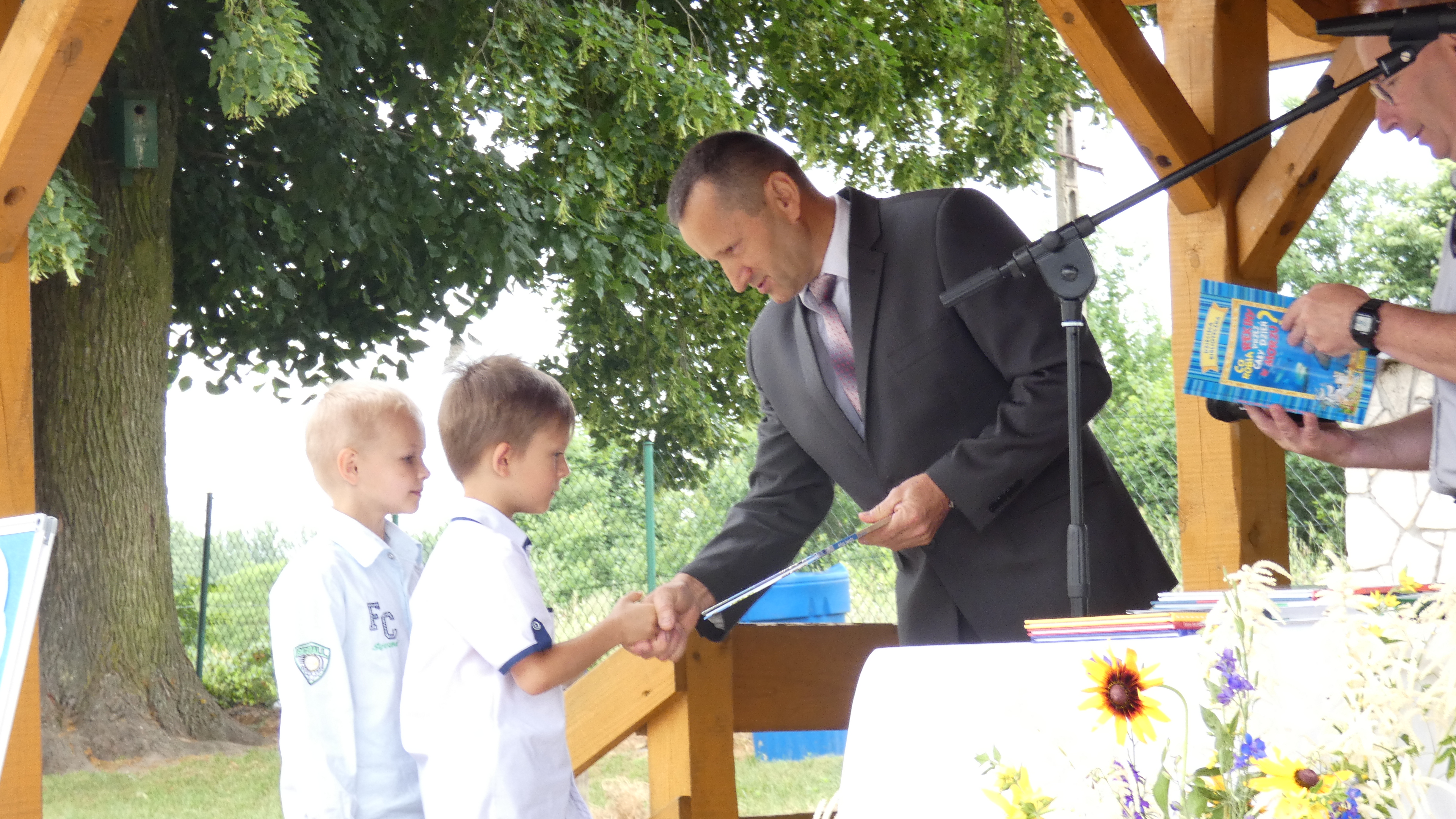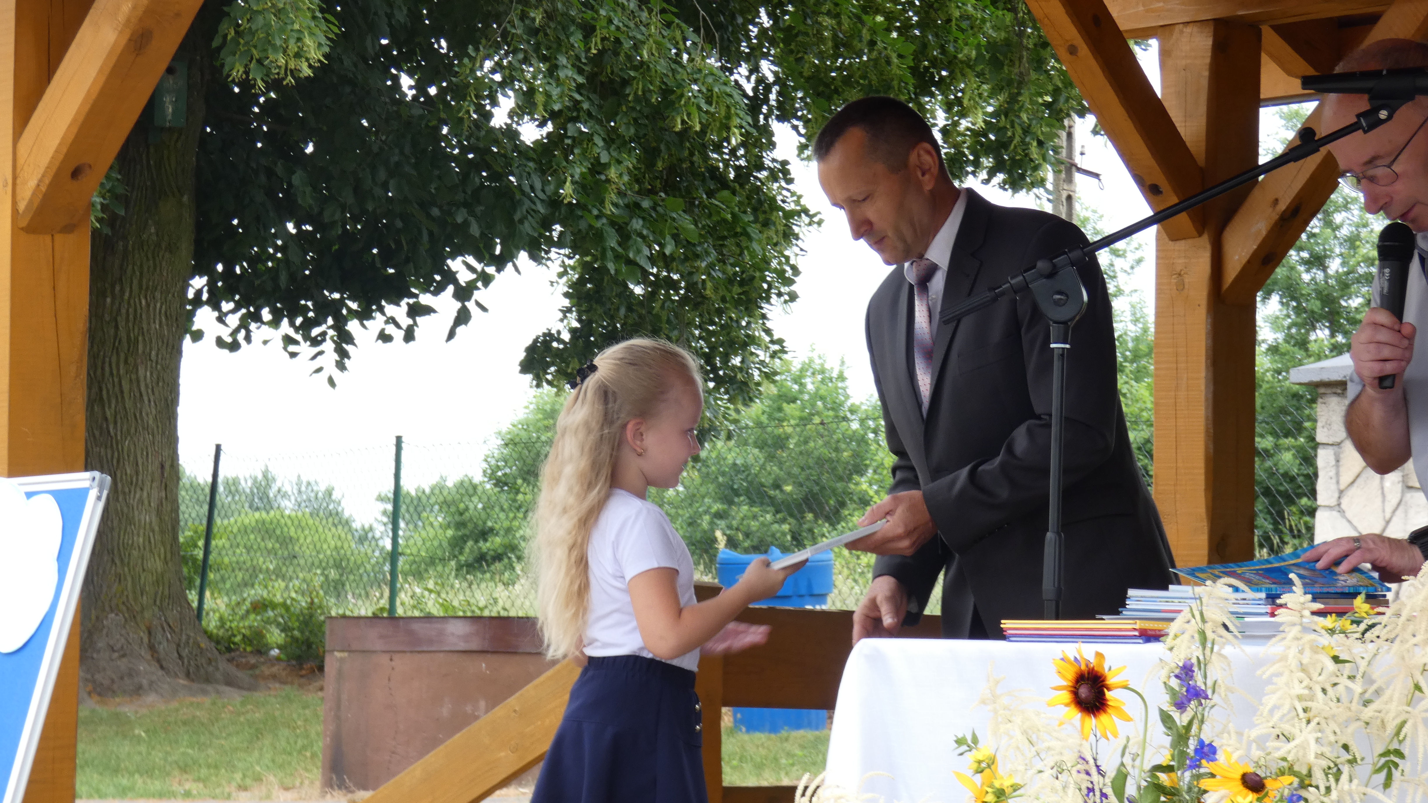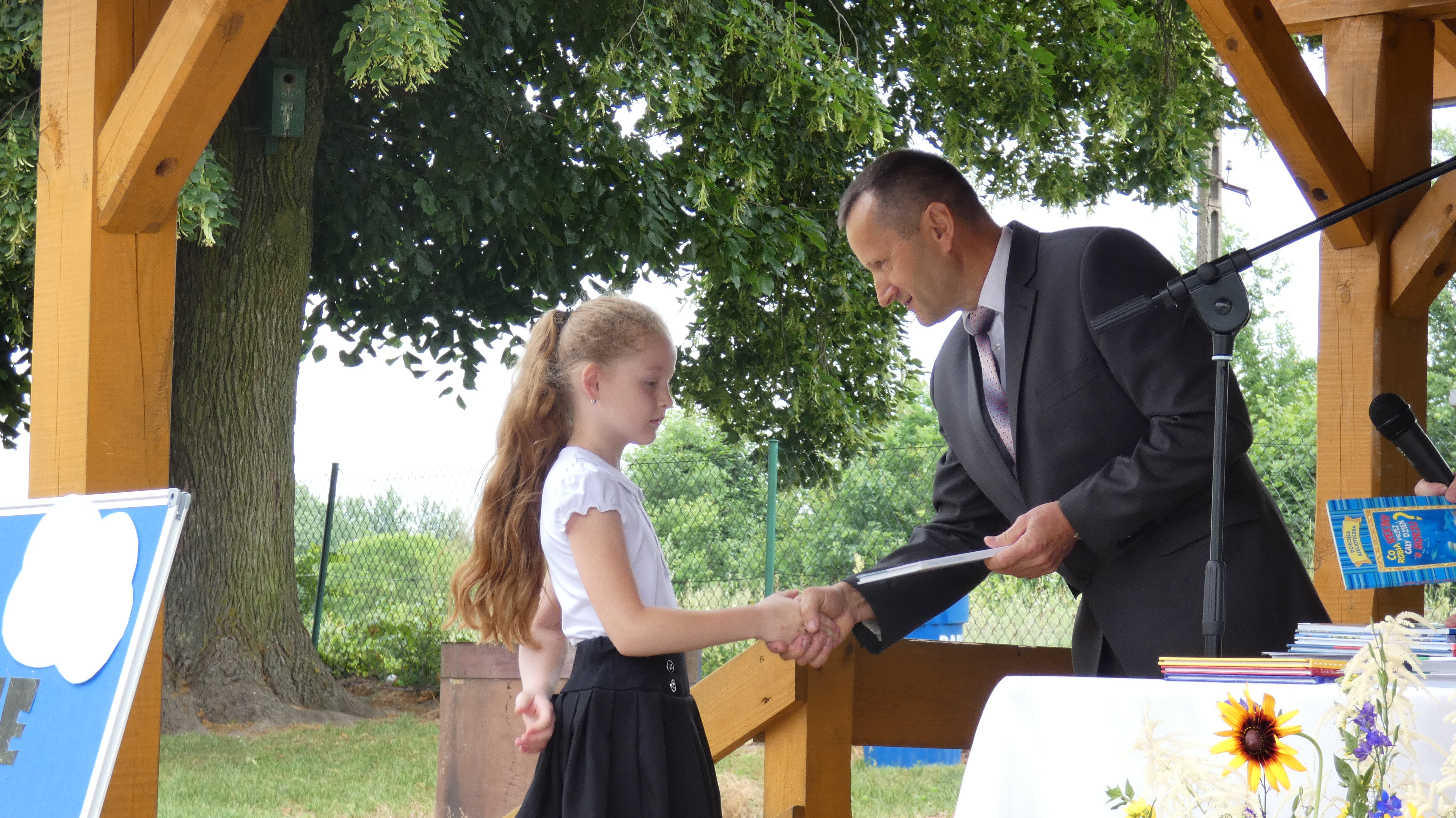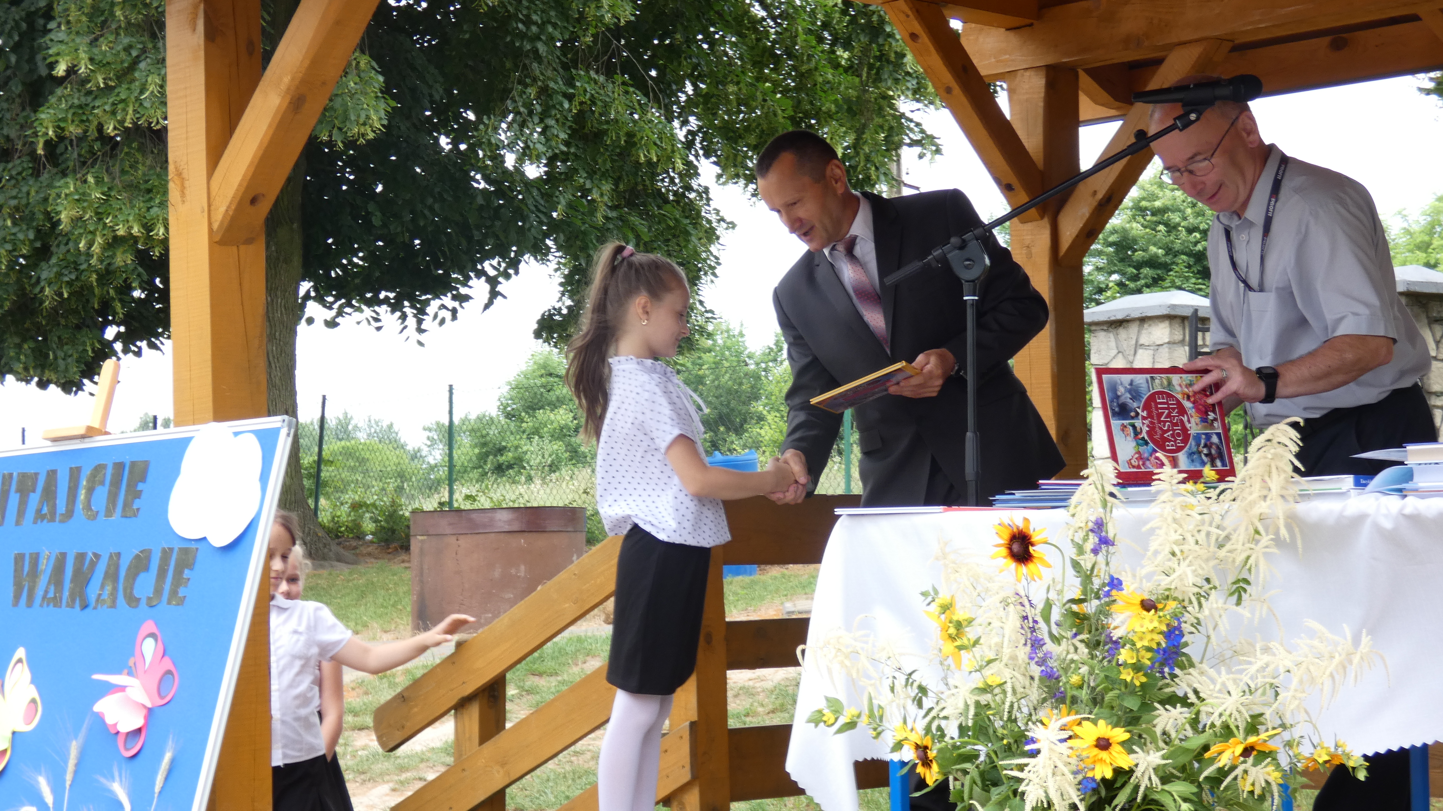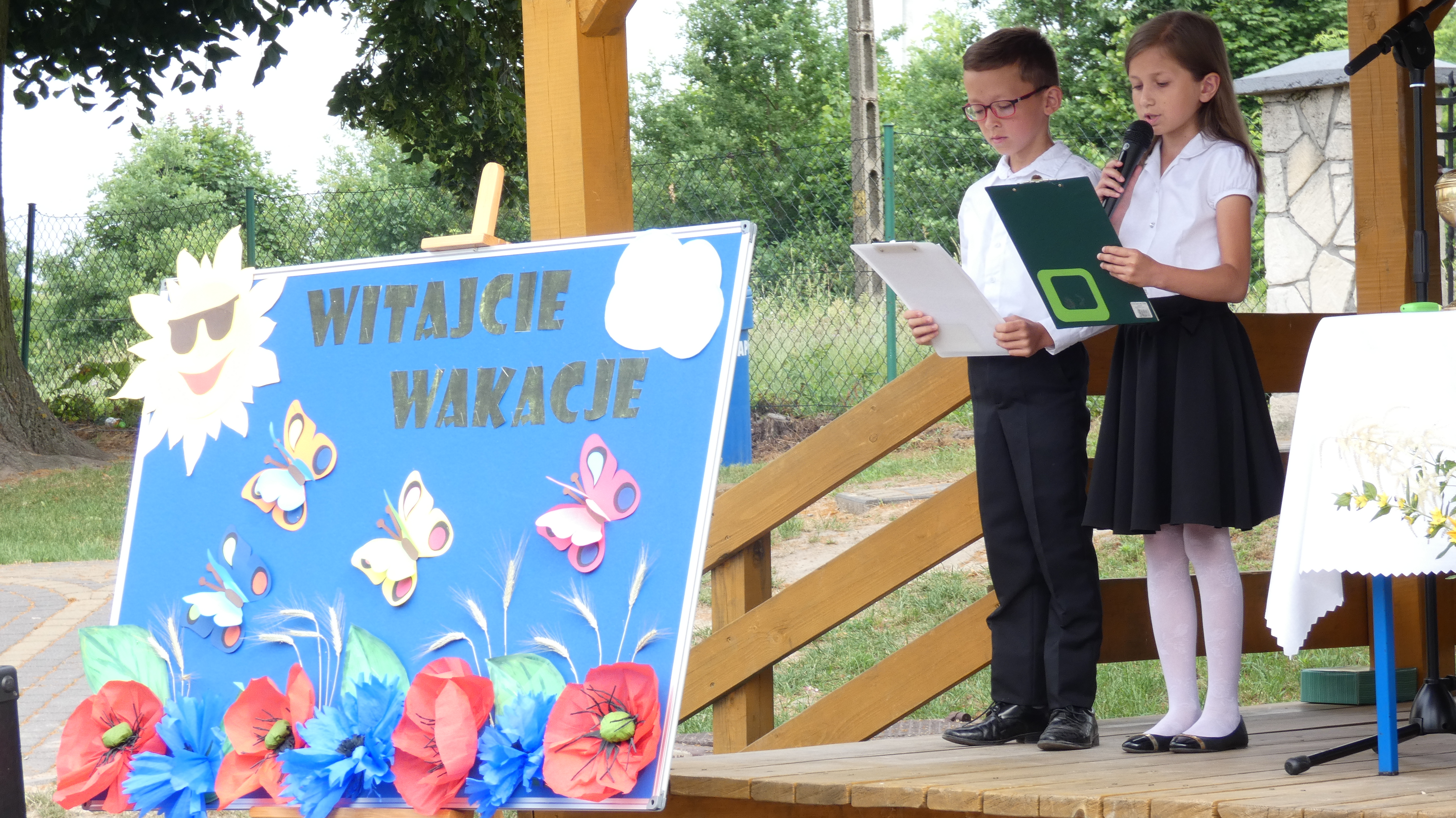 19 czerwca odbyło się w naszej szkole uroczyste zakończenie roku szkolnego. Rozpoczęło się ono wprowadzeniem pocztu sztandarowego, następnie odśpiewany został Mazurek Dąbrowskiego. Kolejnym punktem uroczystości była Msza Święta, którą odprawił Ks. Krzysztof Paluch z Radzięcina. Po jej zakończeniu odbyło się przekazanie sztandaru szkoły przez poczet klasy VIII, pocztowi klasy VII oraz ślubowanie absolwentów naszej szkoły. W dalszej kolejności głos zabrał Dyrektor Szkoły - mgr Stanisław Saj, który powitał zaproszonych gości i rodziców. Władze samorządowe reprezentowała Pani Anna Ruszczak - Sekretarz Gminy Frampol. Następną częścią uroczystości było wręczenie świadectw z wyróżnieniem oraz nagród książkowych i rzeczowych wyróżniającym się uczniom oraz listów gratulacyjnych i podziękowań ich rodzicom. Dokonał tego Dyrektora Szkoły w towarzystwie Pani Sekretarz, która jednocześnie w imieniu władz samorządowych podziękowała wyróżnionym uczniom, życząc udanych wakacji. Słowa podziękowania skierowała również w stronę nauczycieli. Na tym jednak uroczystość się nie zakończyła. Kolejnym jej elementem był okolicznościowy występ artystyczny w wykonaniu ósmoklasistów - "Dzień z życia ucznia w szkole." Pozwolił on nieco humorystycznie spojrzeć na dole i niedole życia ucznia w szkole. Jak stwierdzili wykonawcy, wszelka zbieżność postaci i sytuacji była raczej przypadkowa:) Występ spotkał się z żywiołową, połączoną ze śmiechem, reakcją publiczności i zyskał duże uznanie wśród zebranych. Po jego zakończeniu Dyrektor Szkoły podziękował absolwentom nie tylko za występ, ale też za przygotowywanie i udział w innych uroczystościach, imprezach, konkursach szkolnych i pozaszkolnych. Ostatnim punktem uroczystości było podziękowanie nauczycielom i paniom woźnym złożone przez ósmoklasistów. Zakończył się kolejny etap w życiu szkoły i kolejnego rocznika jej absolwentów, rocznika wyjątkowego. Pożegnaniu towarzyszyła radość, smutek i wzruszenie. W oczach części uczniów, rodziców, nauczycieli pojawiły się kropelki łez.