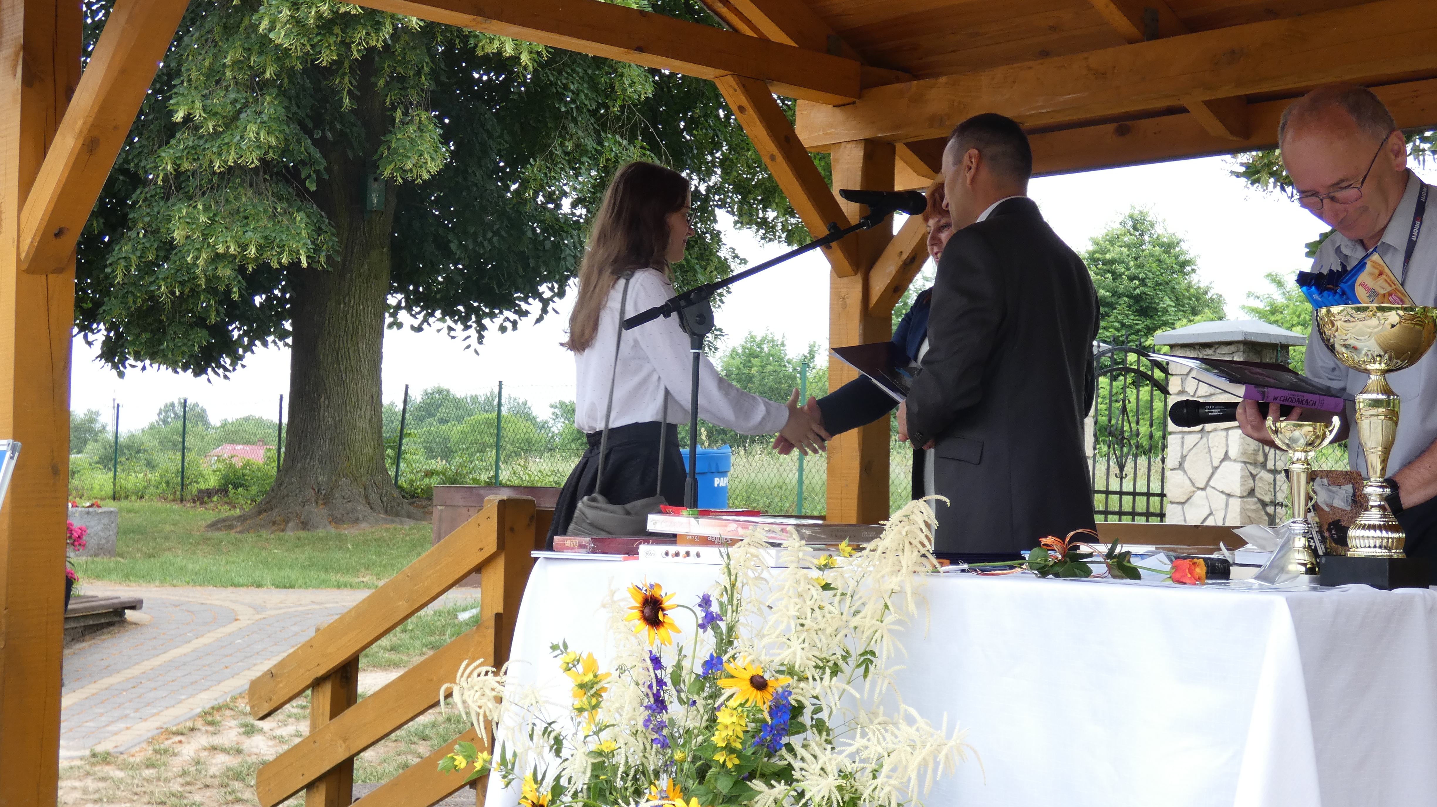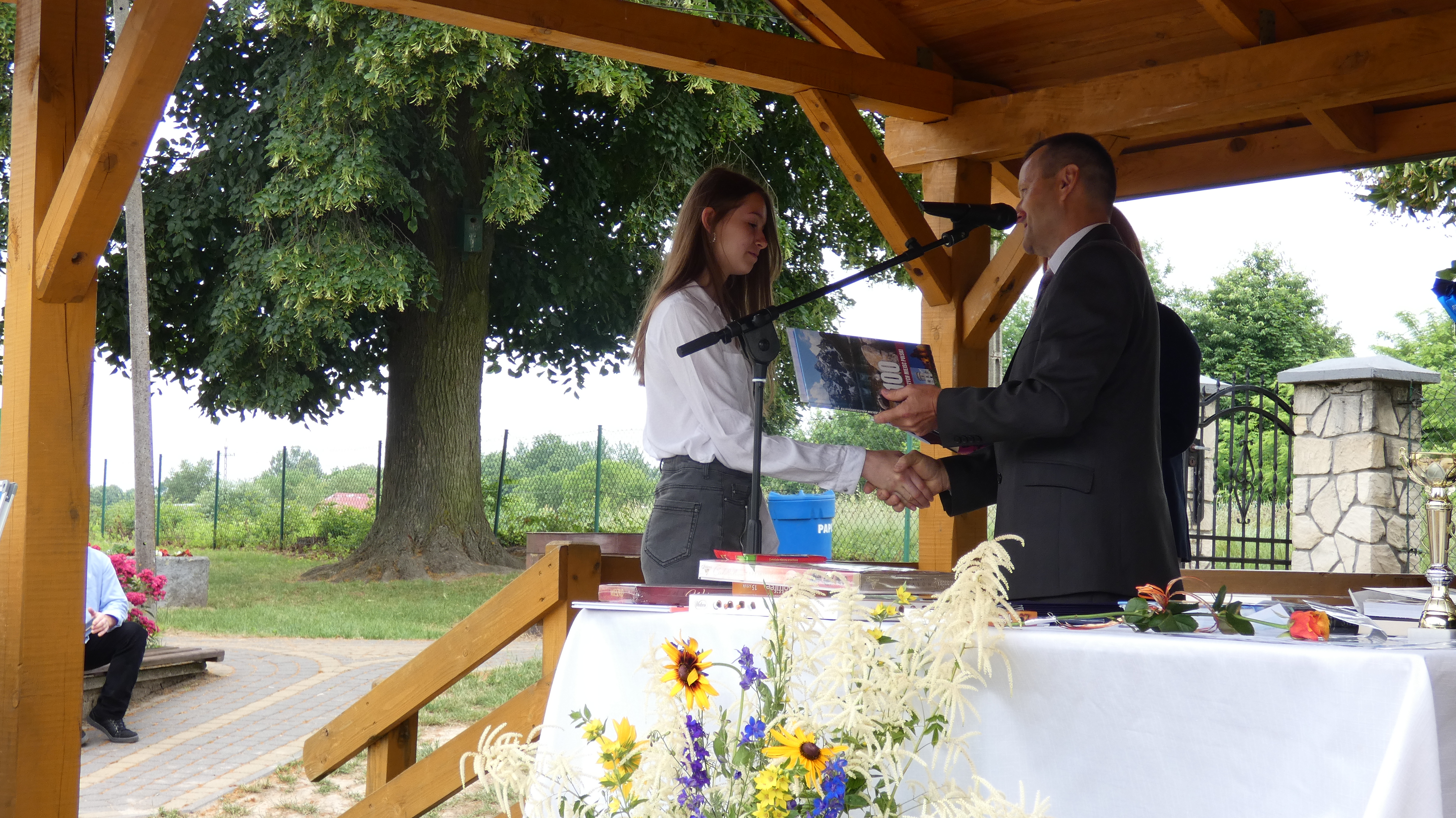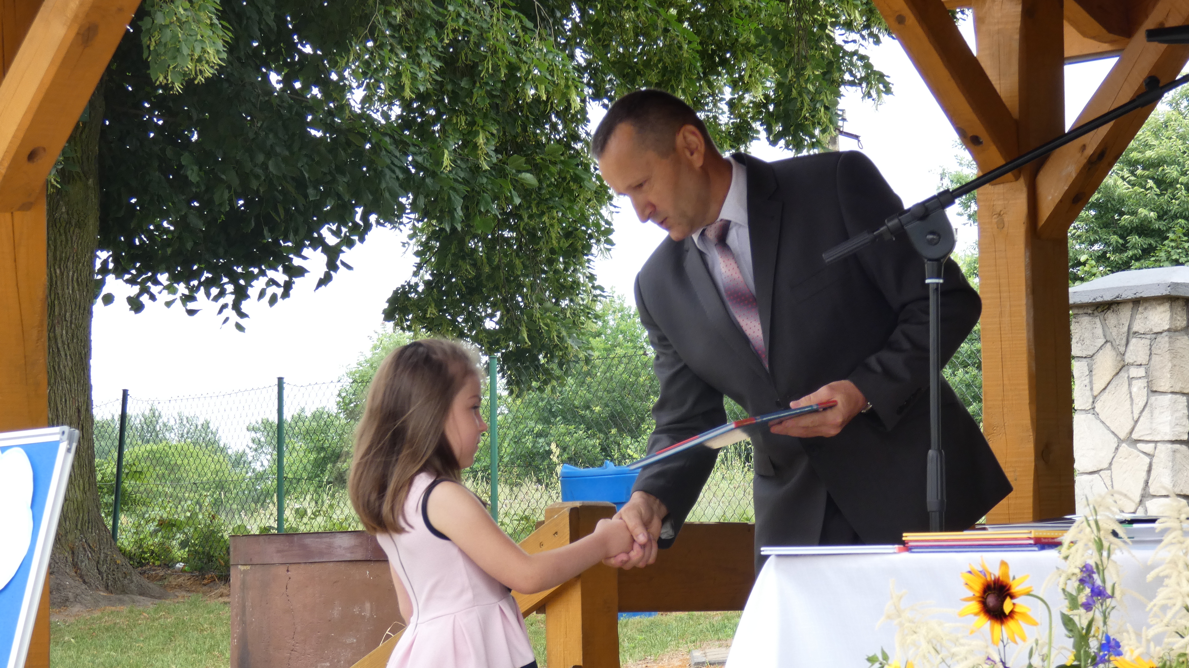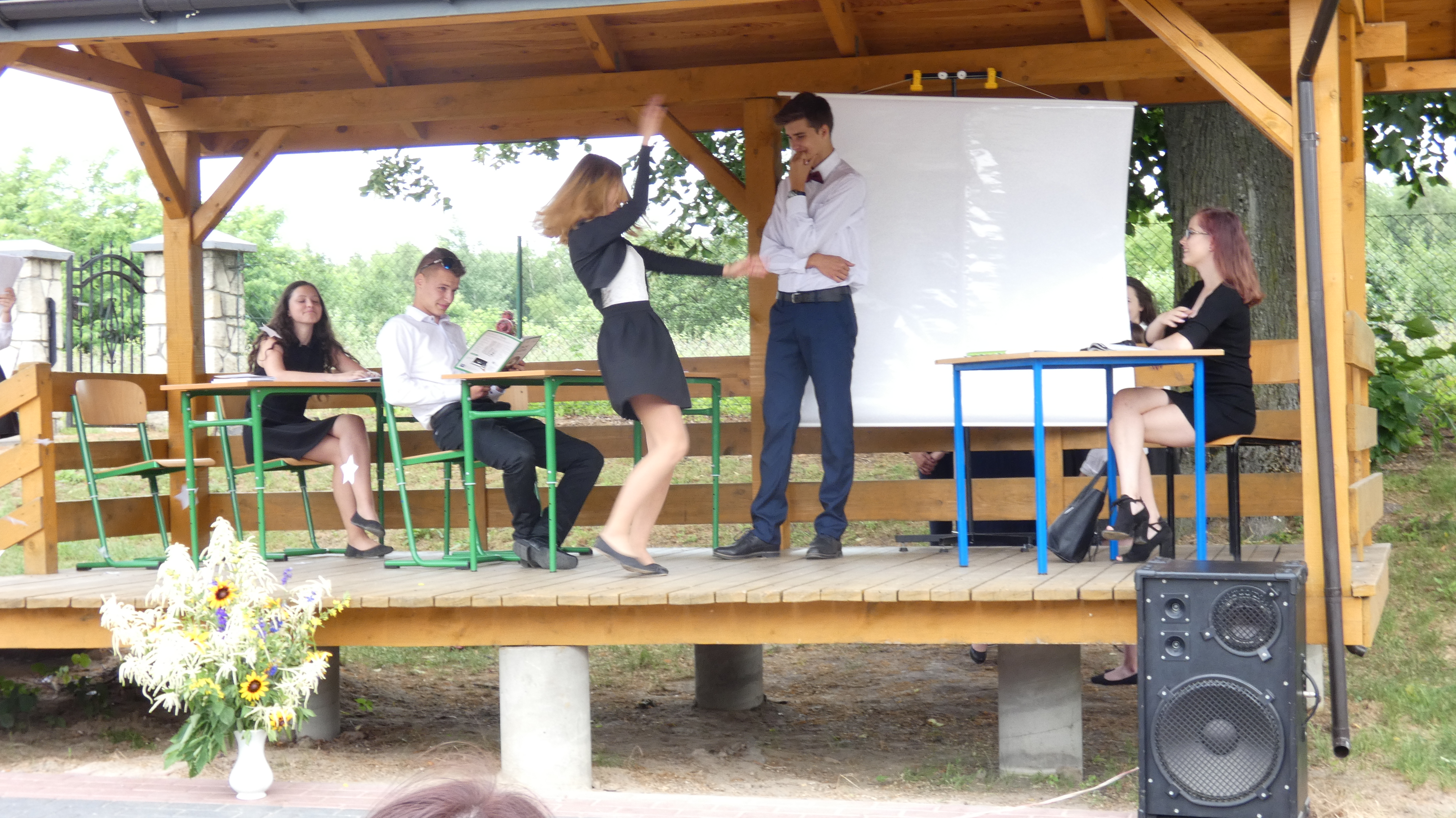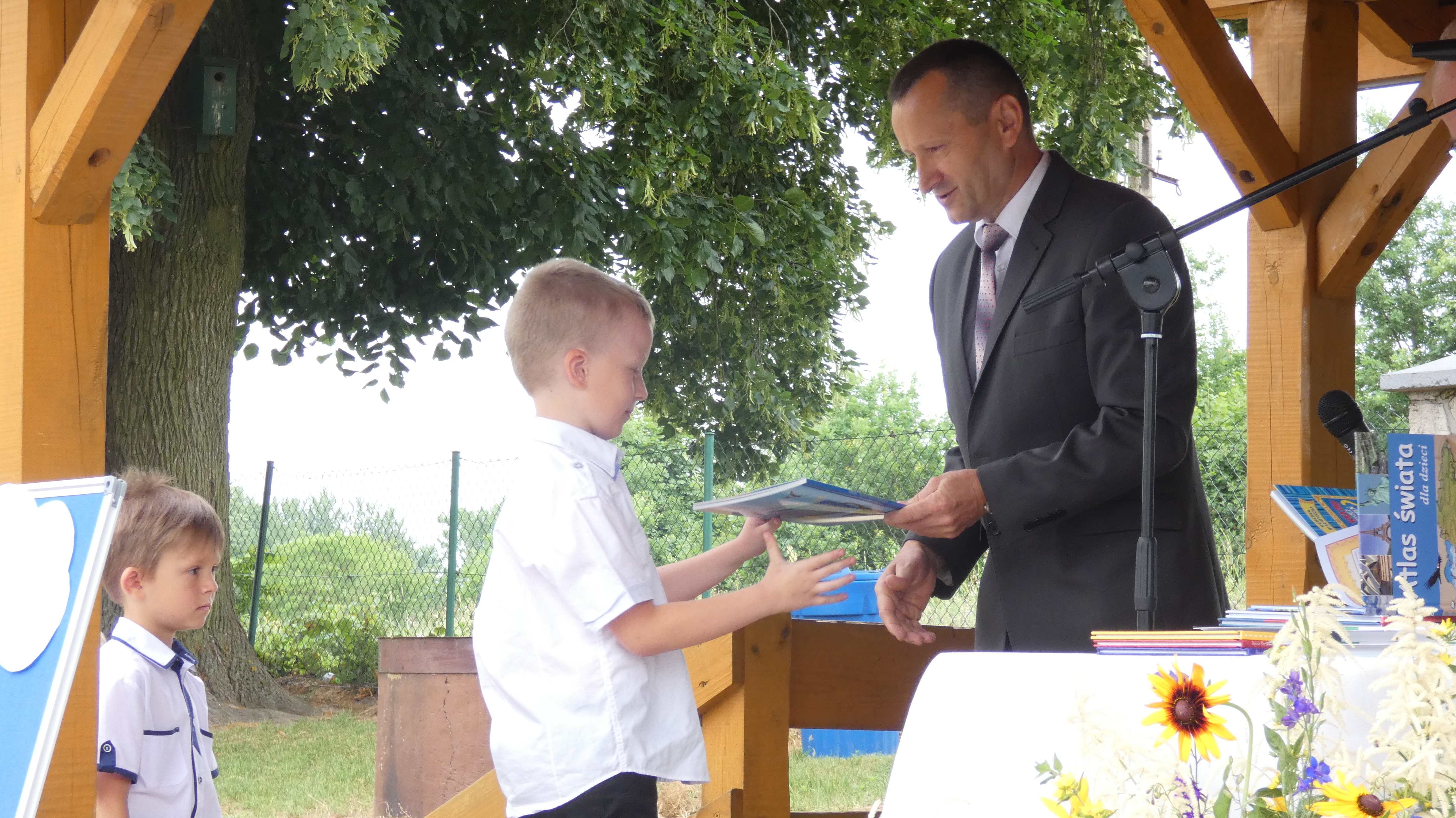 19 czerwca odbyło się w naszej szkole uroczyste zakończenie roku szkolnego. Rozpoczęło się ono wprowadzeniem pocztu sztandarowego, następnie odśpiewany został Mazurek Dąbrowskiego. Kolejnym punktem uroczystości była Msza Święta, którą odprawił Ks. Krzysztof Paluch z Radzięcina. Po jej zakończeniu odbyło się przekazanie sztandaru szkoły przez poczet klasy VIII, pocztowi klasy VII oraz ślubowanie absolwentów naszej szkoły. W dalszej kolejności głos zabrał Dyrektor Szkoły - mgr Stanisław Saj, który powitał zaproszonych gości i rodziców. Władze samorządowe reprezentowała Pani Anna Ruszczak - Sekretarz Gminy Frampol. Następną częścią uroczystości było wręczenie świadectw z wyróżnieniem oraz nagród książkowych i rzeczowych wyróżniającym się uczniom oraz listów gratulacyjnych i podziękowań ich rodzicom. Dokonał tego Dyrektora Szkoły w towarzystwie Pani Sekretarz, która jednocześnie w imieniu władz samorządowych podziękowała wyróżnionym uczniom, życząc udanych wakacji. Słowa podziękowania skierowała również w stronę nauczycieli. Na tym jednak uroczystość się nie zakończyła. Kolejnym jej elementem był okolicznościowy występ artystyczny w wykonaniu ósmoklasistów - "Dzień z życia ucznia w szkole." Pozwolił on nieco humorystycznie spojrzeć na dole i niedole życia ucznia w szkole. Jak stwierdzili wykonawcy, wszelka zbieżność postaci i sytuacji była raczej przypadkowa:) Występ spotkał się z żywiołową, połączoną ze śmiechem, reakcją publiczności i zyskał duże uznanie wśród zebranych. Po jego zakończeniu Dyrektor Szkoły podziękował absolwentom nie tylko za występ, ale też za przygotowywanie i udział w innych uroczystościach, imprezach, konkursach szkolnych i pozaszkolnych. Ostatnim punktem uroczystości było podziękowanie nauczycielom i paniom woźnym złożone przez ósmoklasistów. Zakończył się kolejny etap w życiu szkoły i kolejnego rocznika jej absolwentów, rocznika wyjątkowego. Pożegnaniu towarzyszyła radość, smutek i wzruszenie. W oczach części uczniów, rodziców, nauczycieli pojawiły się kropelki łez.