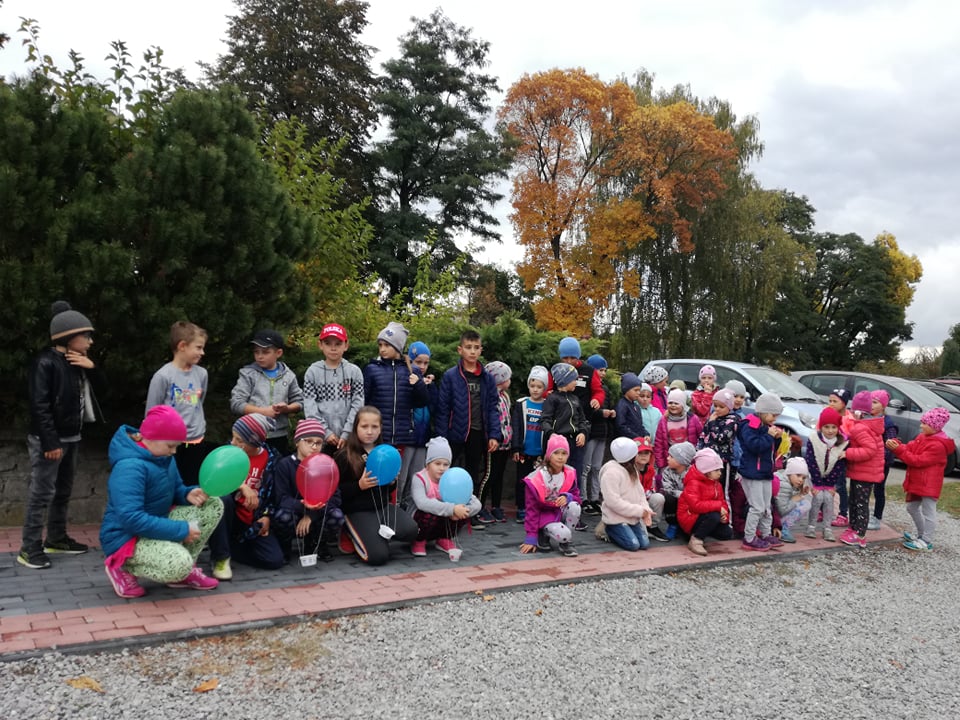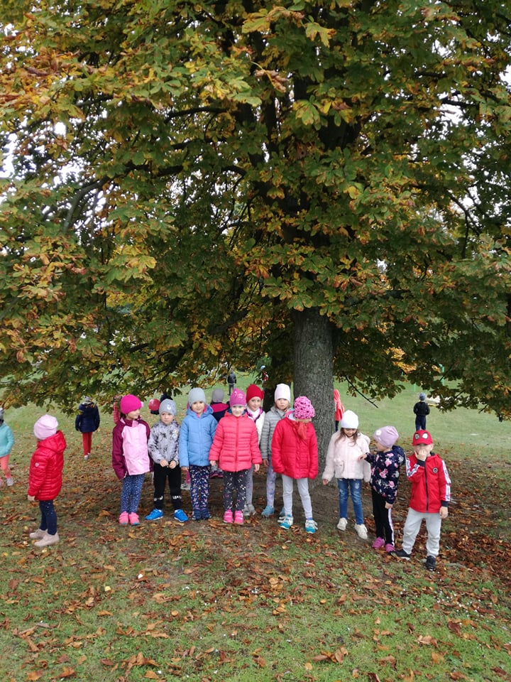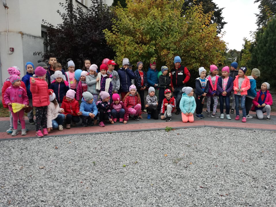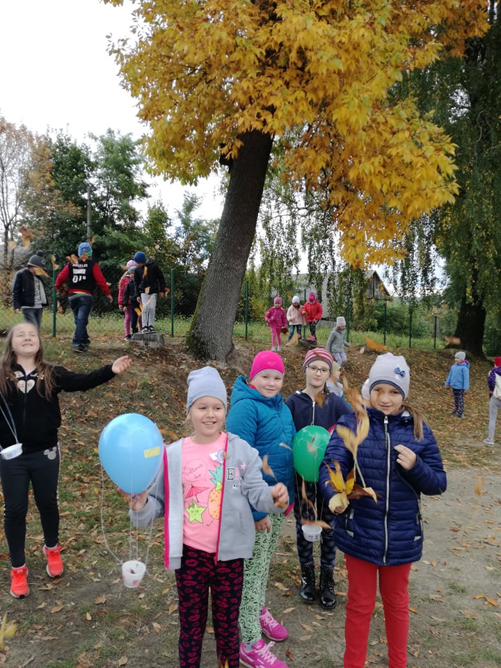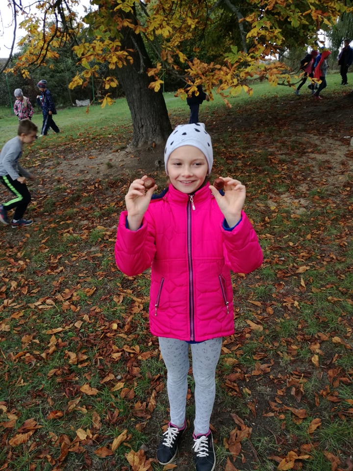 Dzieci z klas I-III i przedszkolaki wybrały się na spacer po najbliższej okolicy naszej szkoły, aby podziwiać piękna polską złotą jesień mieniącą się paletą barw od zieleni, poprzez żółć i czerwień, aż po brąz. Jesień jest także bogata w Dary Natury, owoce, warzywa, kasztany i żołędzie, których nie brakuje w przyszkolnym ogrodzie. Ze znalezisk dzieci zrobią wkrótce fantazyjne ozdoby do sali.