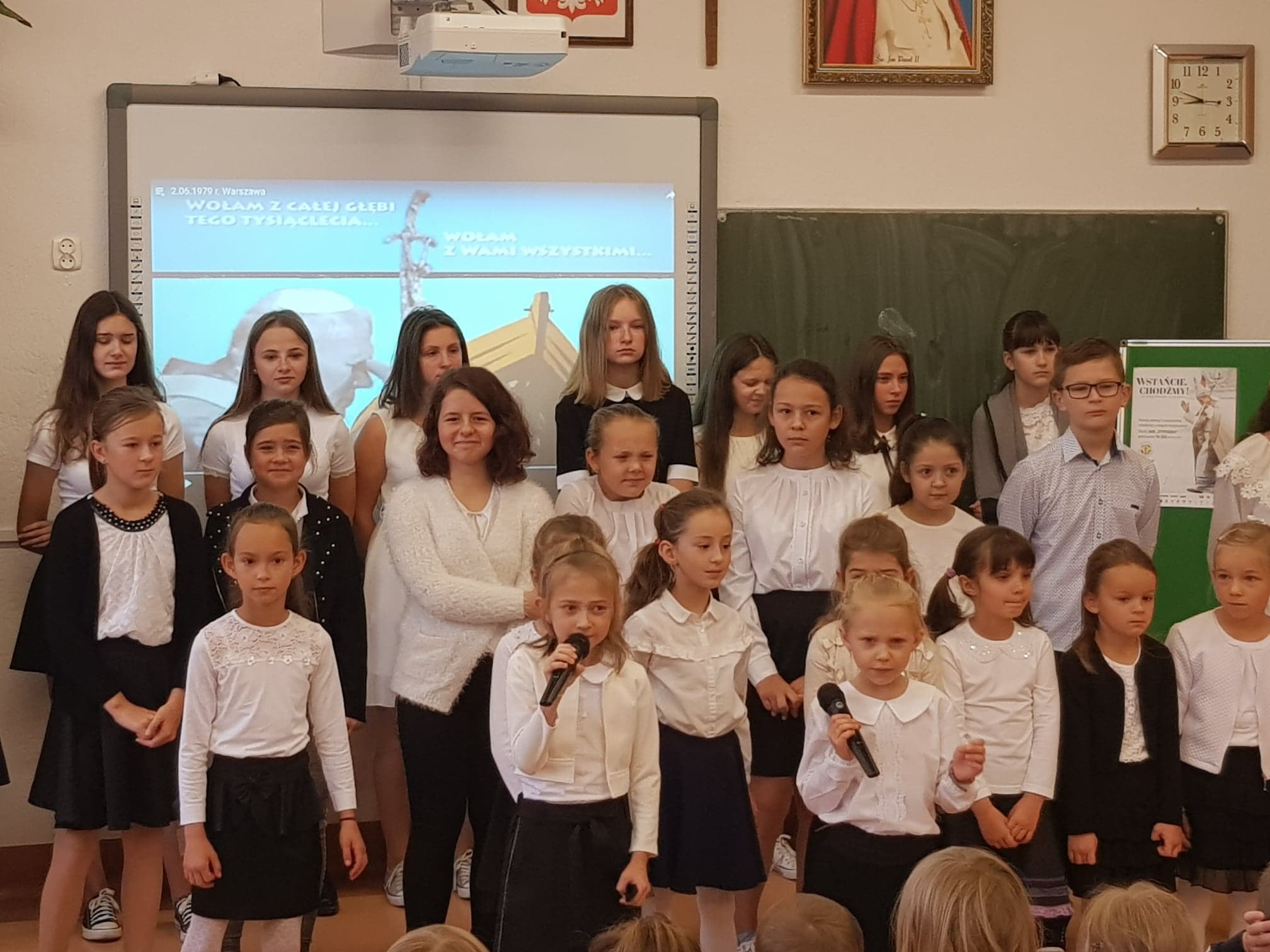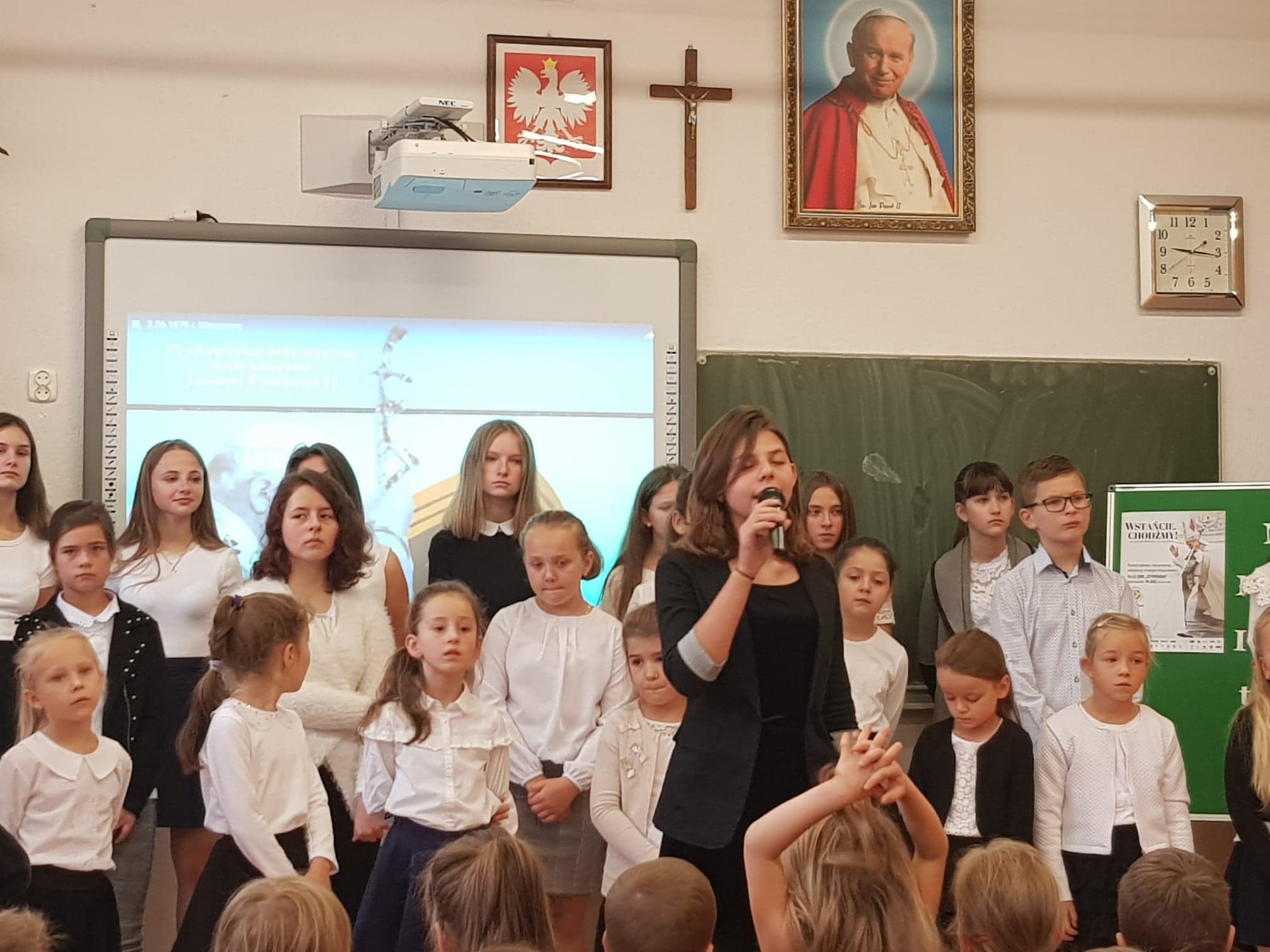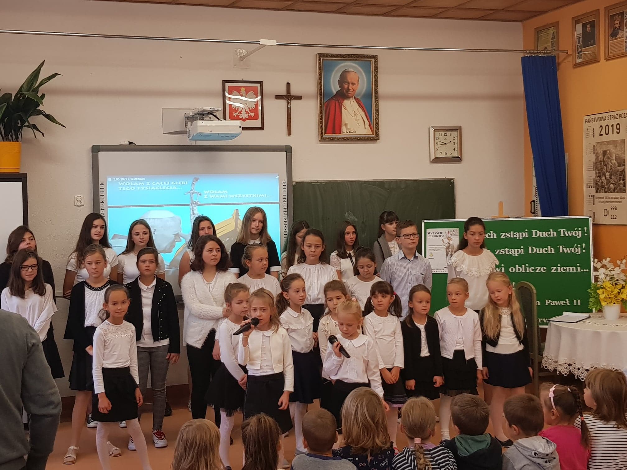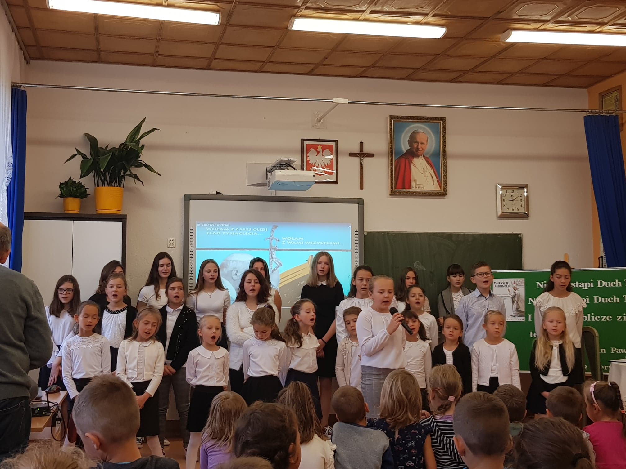 11 października odbyły się w naszej szkole obchody XIX Dnia Papieskiego pod hasłem "Wstańcie, chodźmy!" Zebrani na uroczystości uczniowie i nauczyciele wysłuchali części artystycznej, na którą złożył się koncert chórku szkolnego oraz krótka inscenizacja - wywiad dziennikarki ze Świętym Janem Pawłem II.
