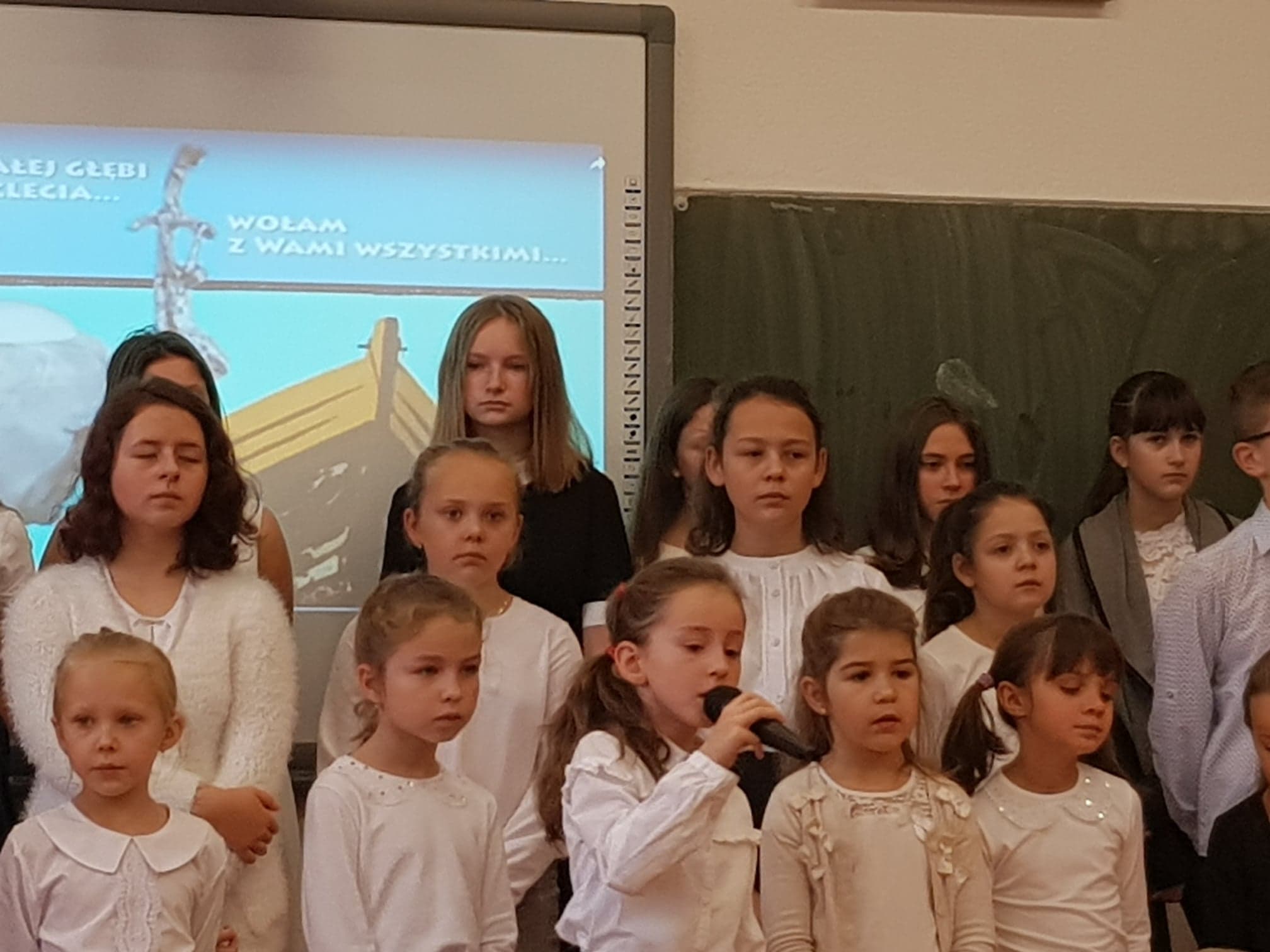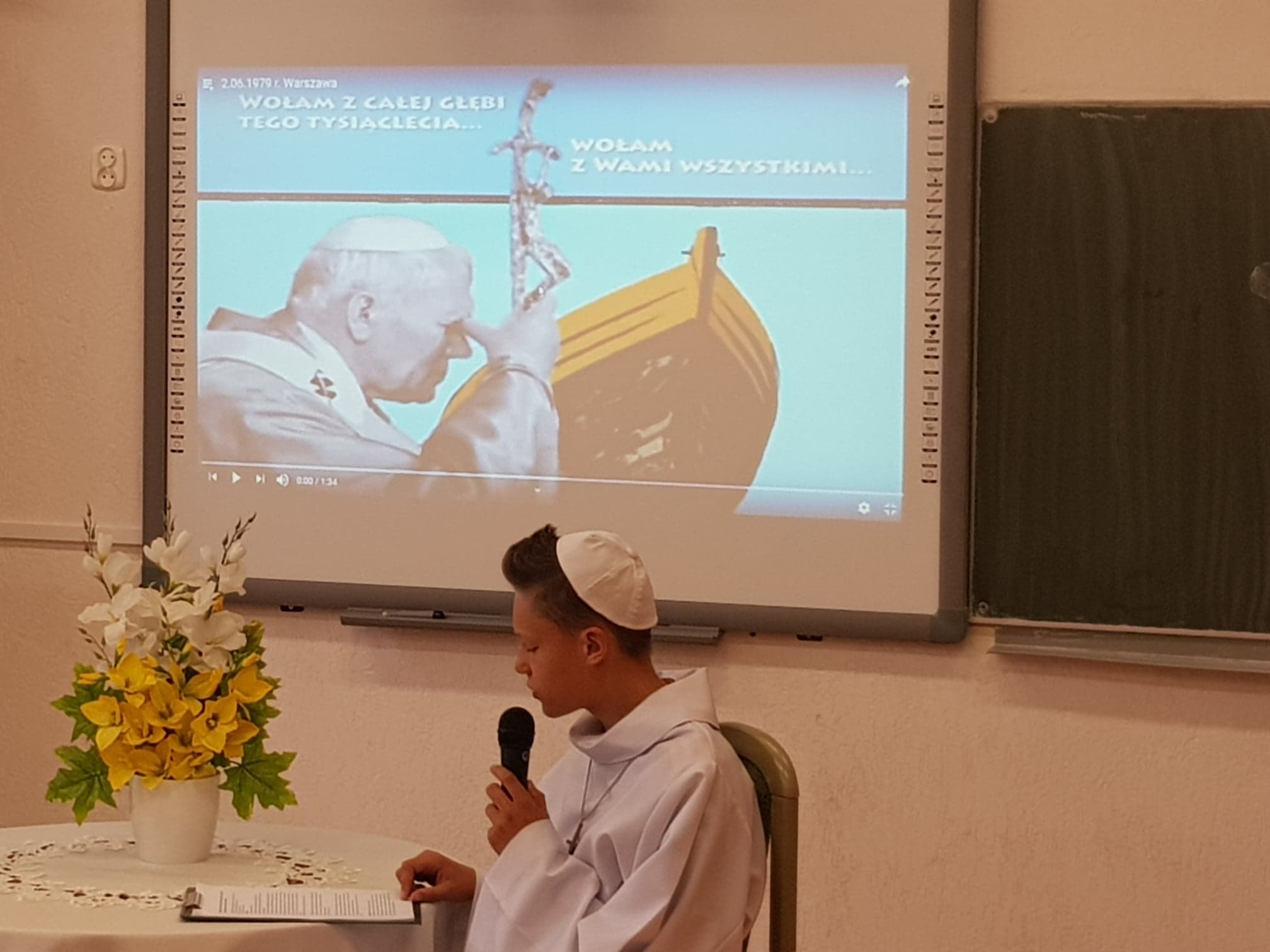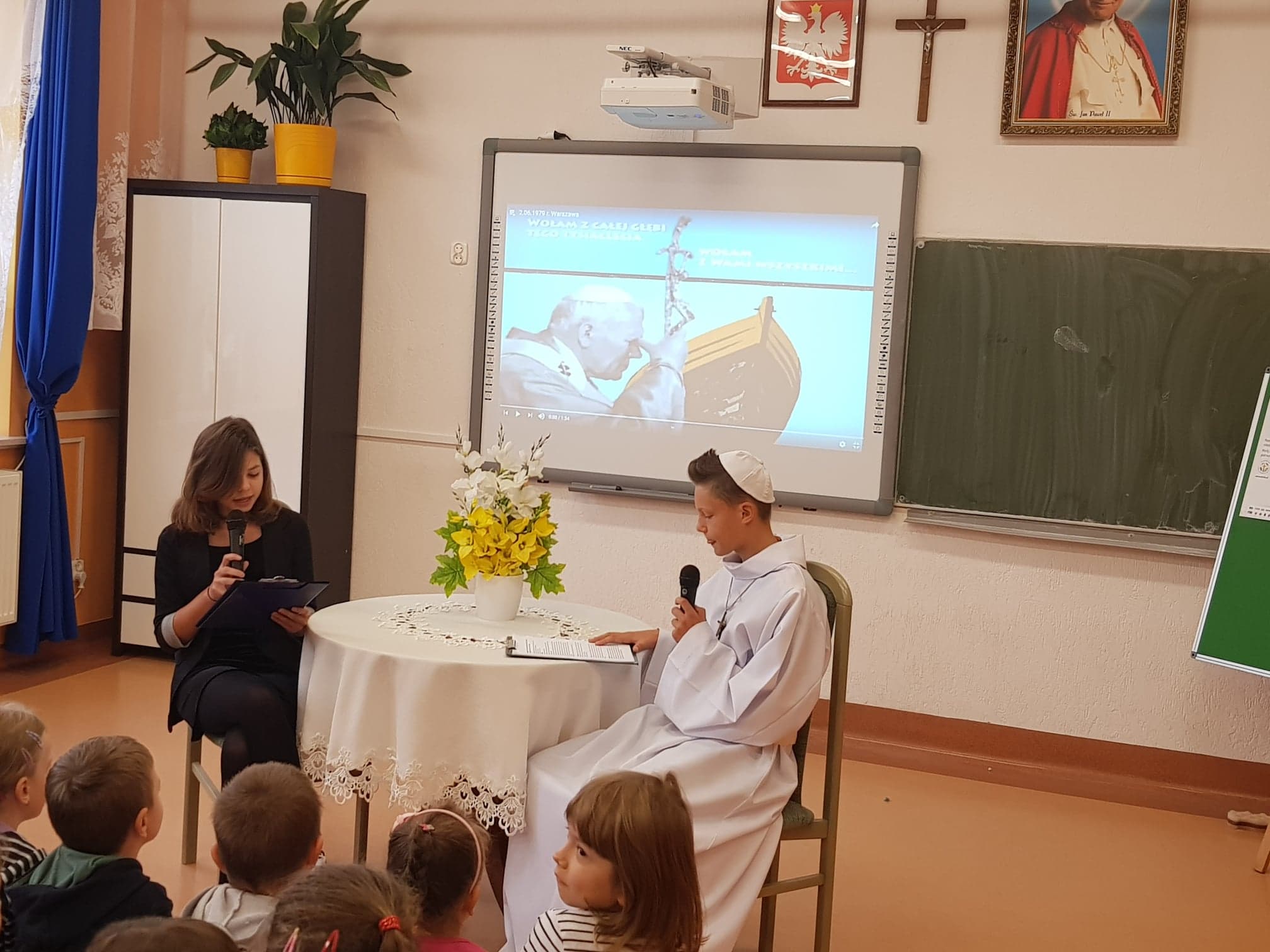 11 października odbyły się w naszej szkole obchody XIX Dnia Papieskiego pod hasłem "Wstańcie, chodźmy!" Zebrani na uroczystości uczniowie i nauczyciele wysłuchali części artystycznej, na którą złożył się koncert chórku szkolnego oraz krótka inscenizacja - wywiad dziennikarki ze Świętym Janem Pawłem II.
