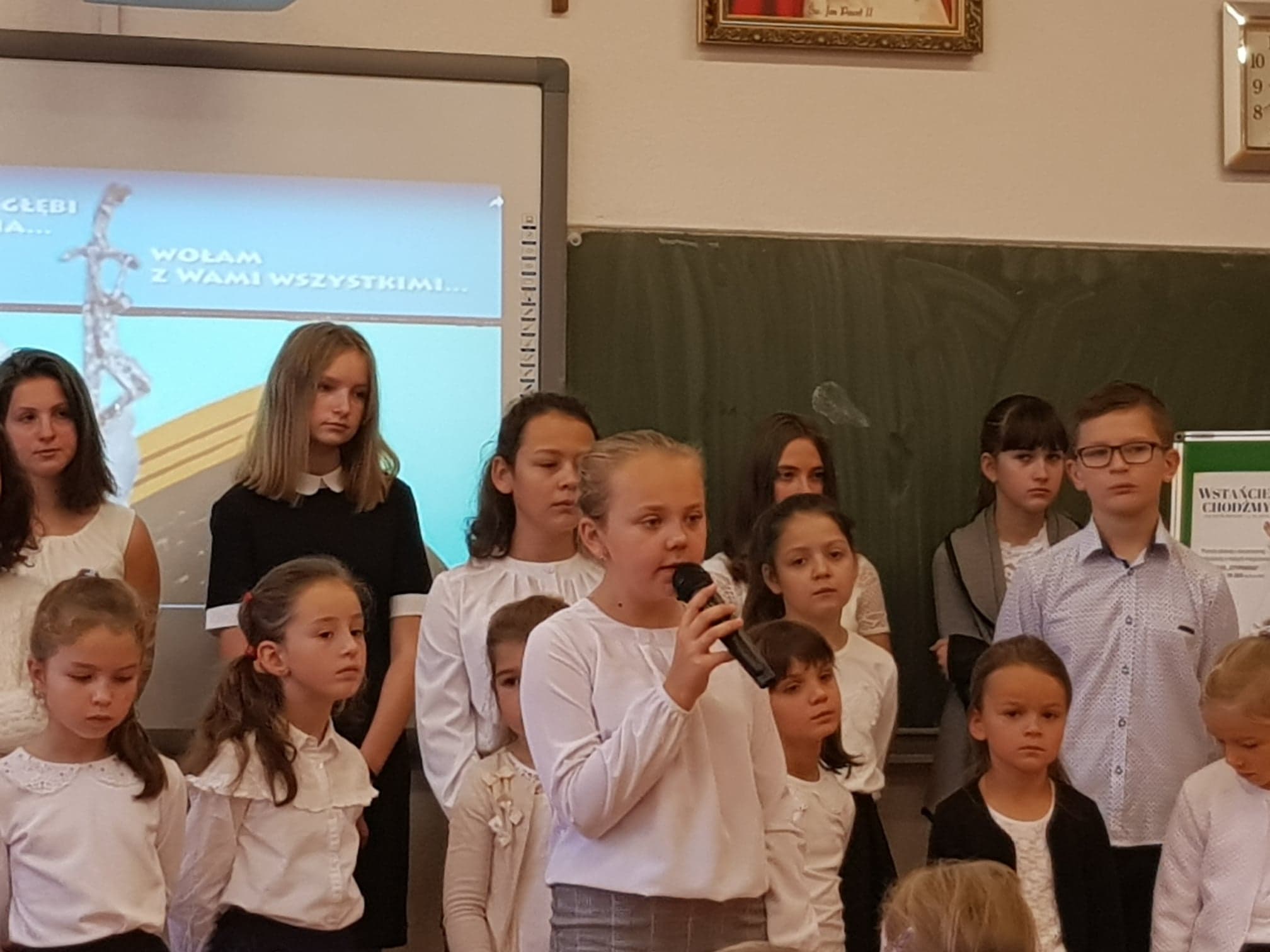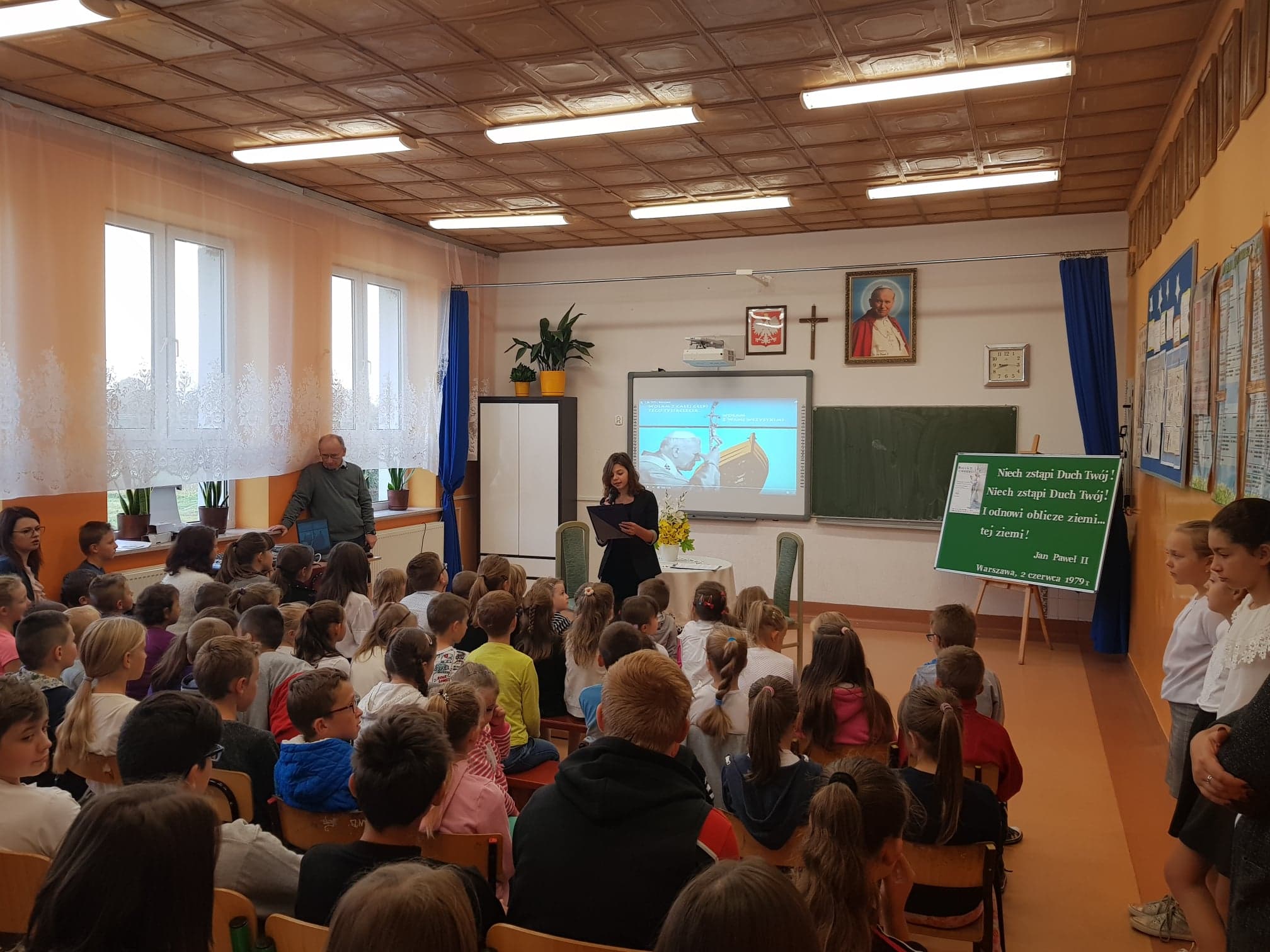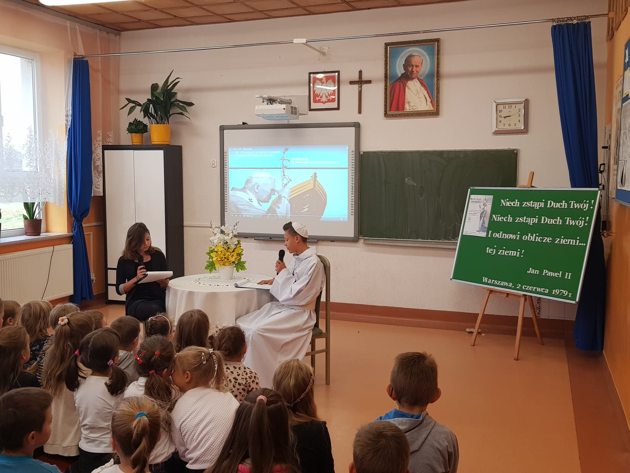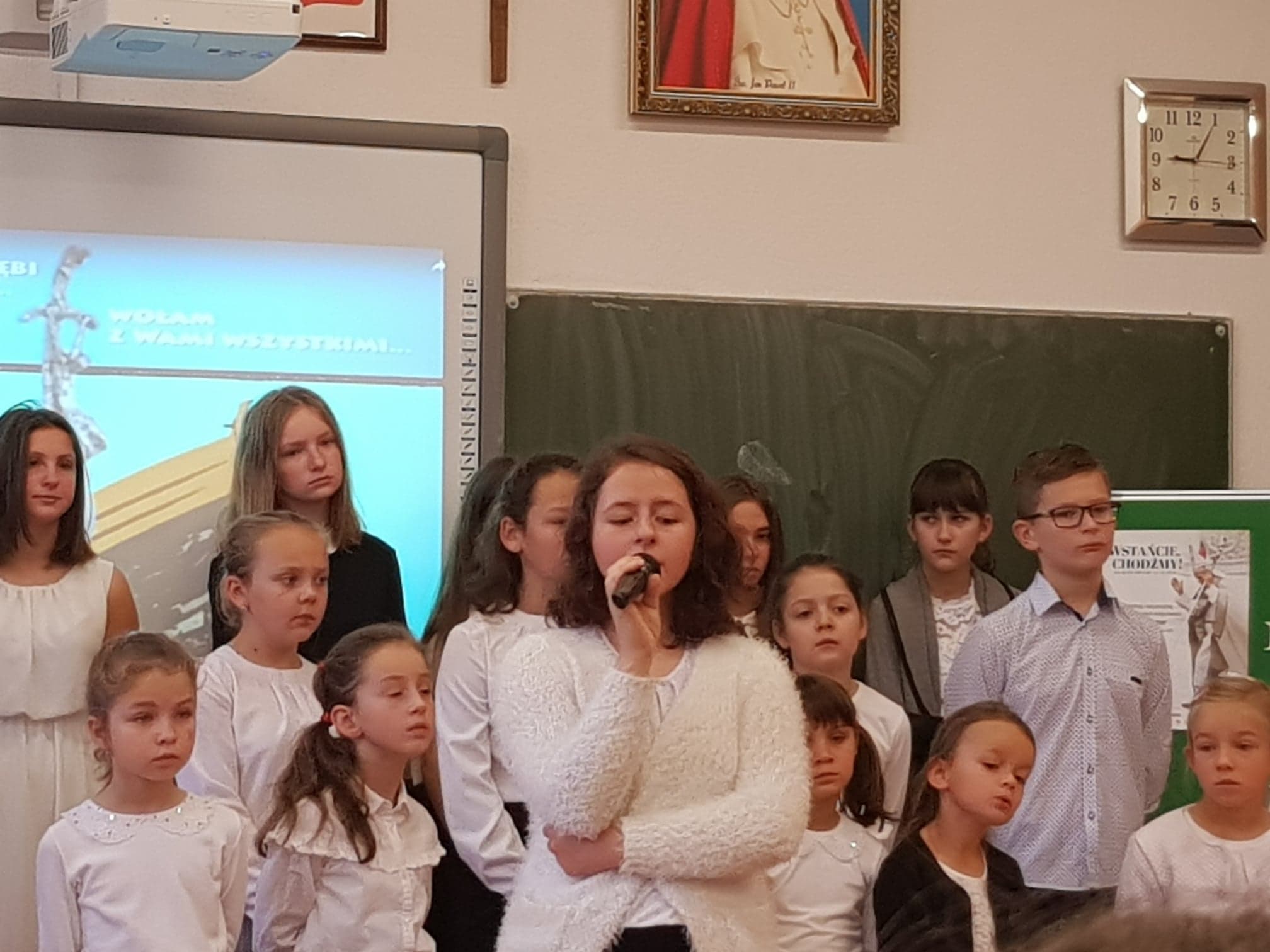 11 października odbyły się w naszej szkole obchody XIX Dnia Papieskiego pod hasłem "Wstańcie, chodźmy!" Zebrani na uroczystości uczniowie i nauczyciele wysłuchali części artystycznej, na którą złożył się koncert chórku szkolnego oraz krótka inscenizacja - wywiad dziennikarki ze Świętym Janem Pawłem II.