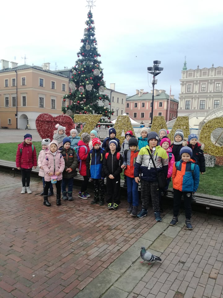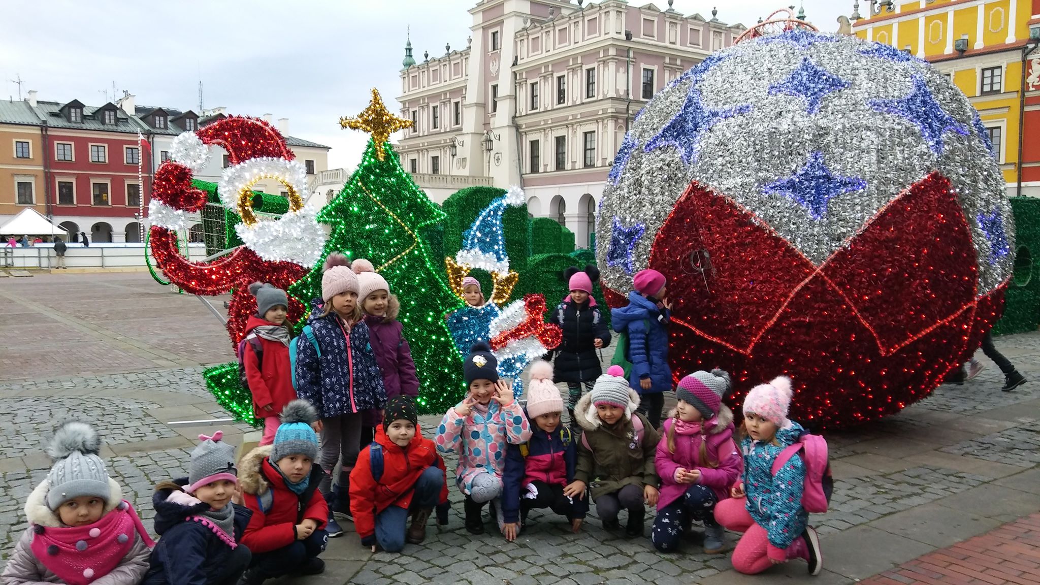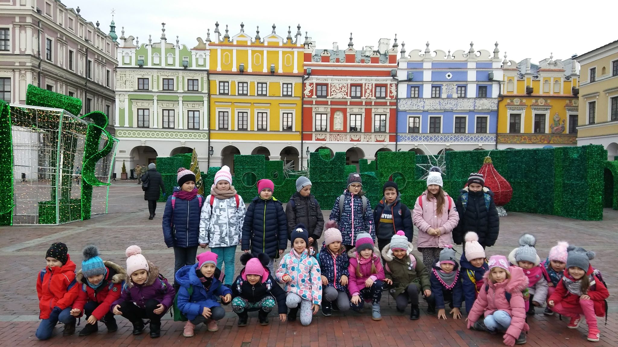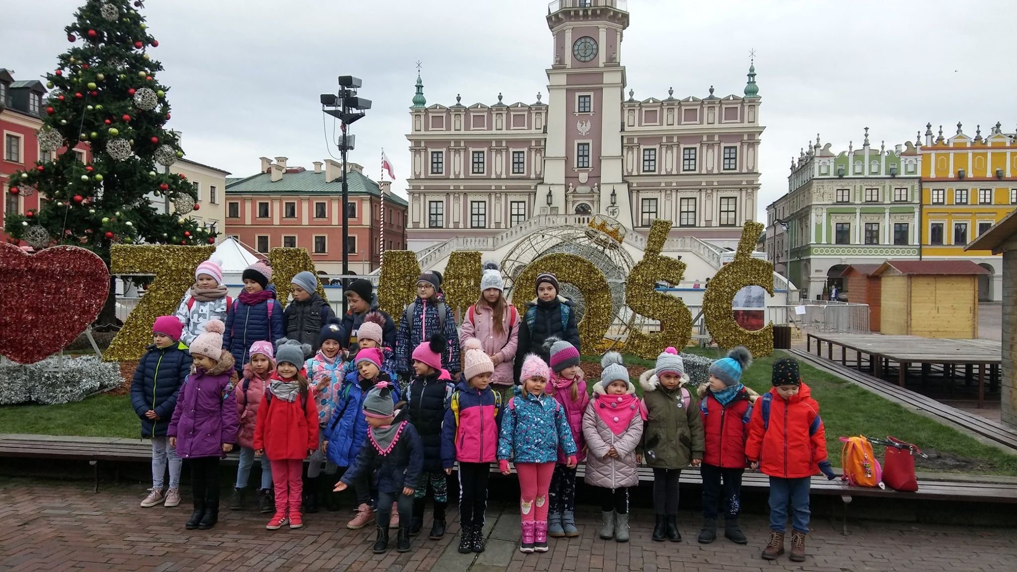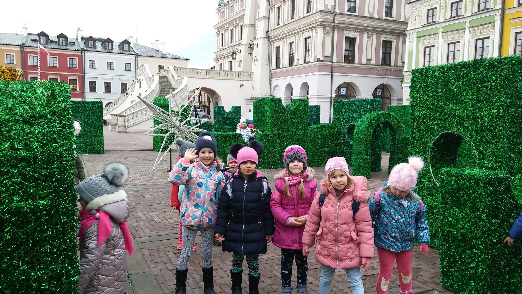 9 grudnia uczniowie klas I-III i przedszkolaki z oddziału 5-6 latków udały się na wycieczkę do Zamościa. W pierwszej kolejności obejrzeliśmy film animowany "Śnieżna paczka" w kinie "STYLOWY", dzieci były zachwycone wspaniałą historią dzielnego lisa, a zimowa sceneria wprowadziła nas w świąteczny nastrój. Następną atrakcją naszej wycieczki były warsztaty w manufakturze słodyczy "Tęcza". Dzieci z zaciekawieniem uczestniczyły w pokazach połączonych z warsztatami, podczas których przedstawiono cały proces powstawania słodyczy. Później każdy z uczestników wycieczki wykonał własnoręcznie swojego lizaka, a na koniec była degustacja cukierków powstałych na naszych oczach. Po wyczerpujących atrakcjach udaliśmy się na obiad do restauracji na Starówce, a potem na spacer po rynku wśród bożonarodzeniowych ozdób. Zmęczeni, ale w dobrych nastrojach wróciliśmy do domu.