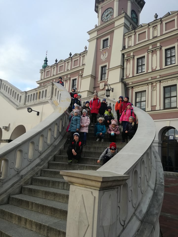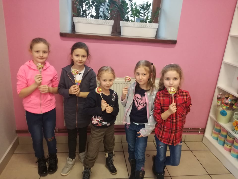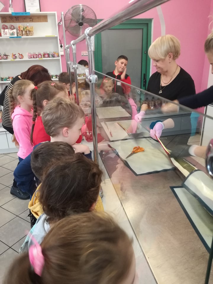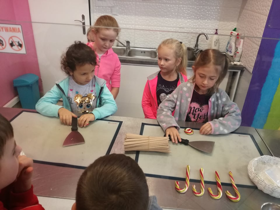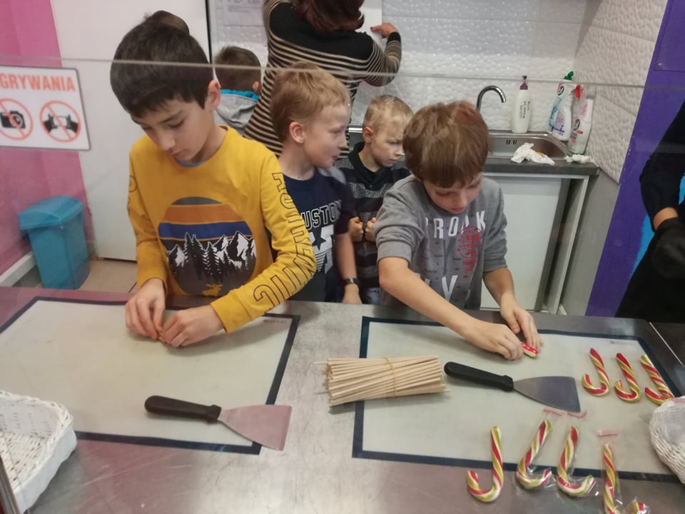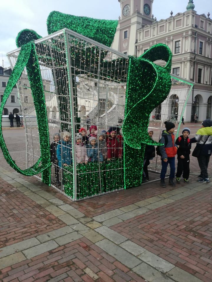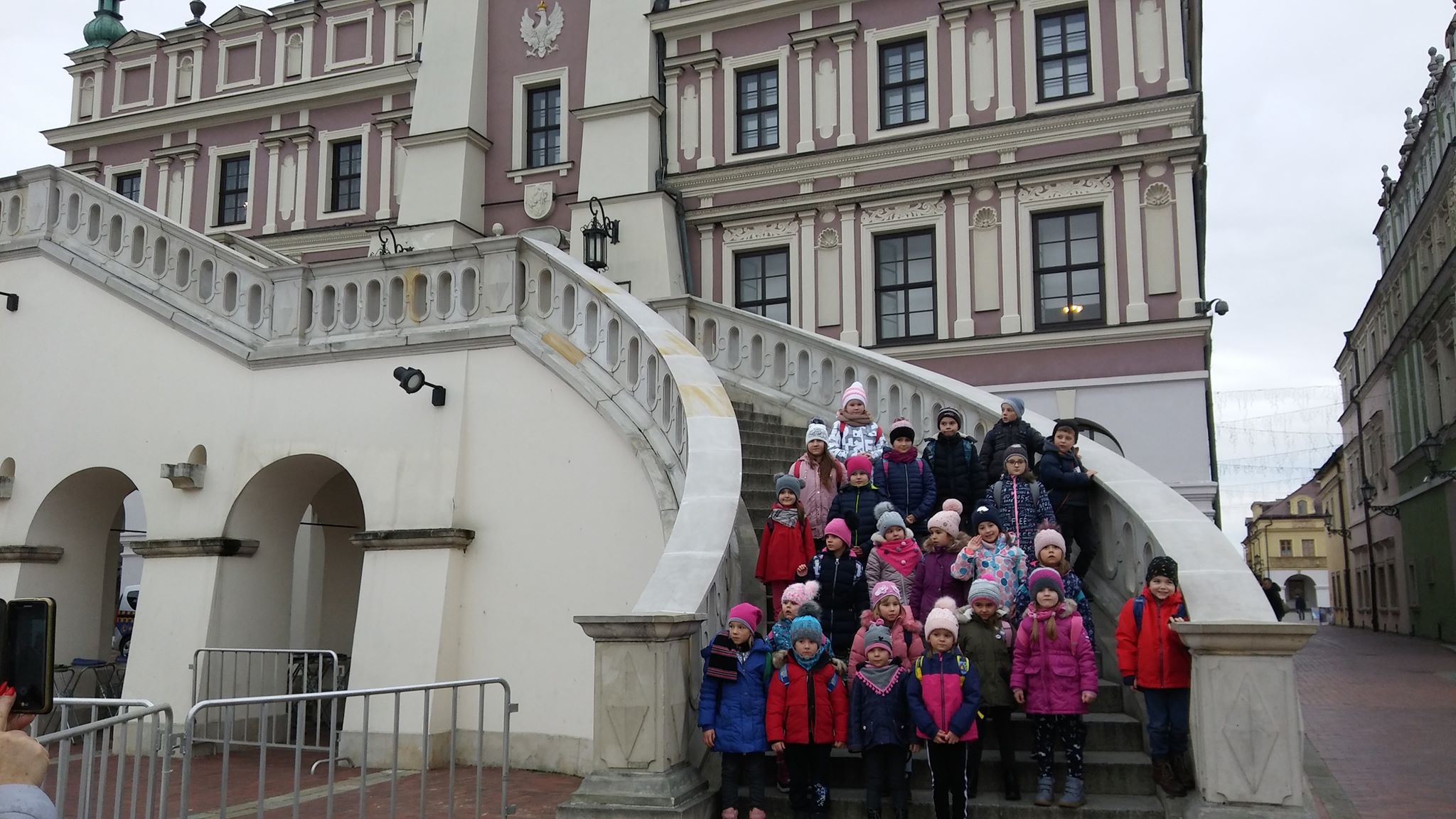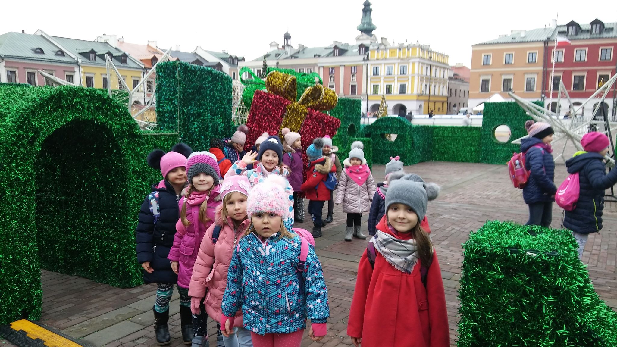 9 grudnia uczniowie klas I-III i przedszkolaki z oddziału 5-6 latków udały się na wycieczkę do Zamościa. W pierwszej kolejności obejrzeliśmy film animowany "Śnieżna paczka" w kinie "STYLOWY", dzieci były zachwycone wspaniałą historią dzielnego lisa, a zimowa sceneria wprowadziła nas w świąteczny nastrój. Następną atrakcją naszej wycieczki były warsztaty w manufakturze słodyczy "Tęcza". Dzieci z zaciekawieniem uczestniczyły w pokazach połączonych z warsztatami, podczas których przedstawiono cały proces powstawania słodyczy. Później każdy z uczestników wycieczki wykonał własnoręcznie swojego lizaka, a na koniec była degustacja cukierków powstałych na naszych oczach. Po wyczerpujących atrakcjach udaliśmy się na obiad do restauracji na Starówce, a potem na spacer po rynku wśród bożonarodzeniowych ozdób. Zmęczeni, ale w dobrych nastrojach wróciliśmy do domu.