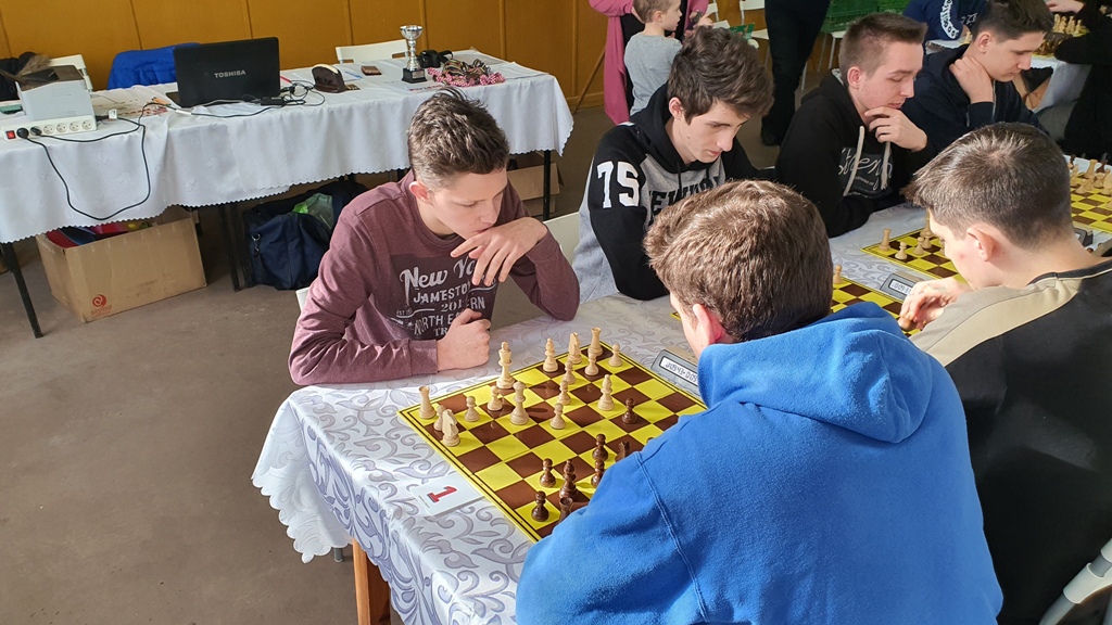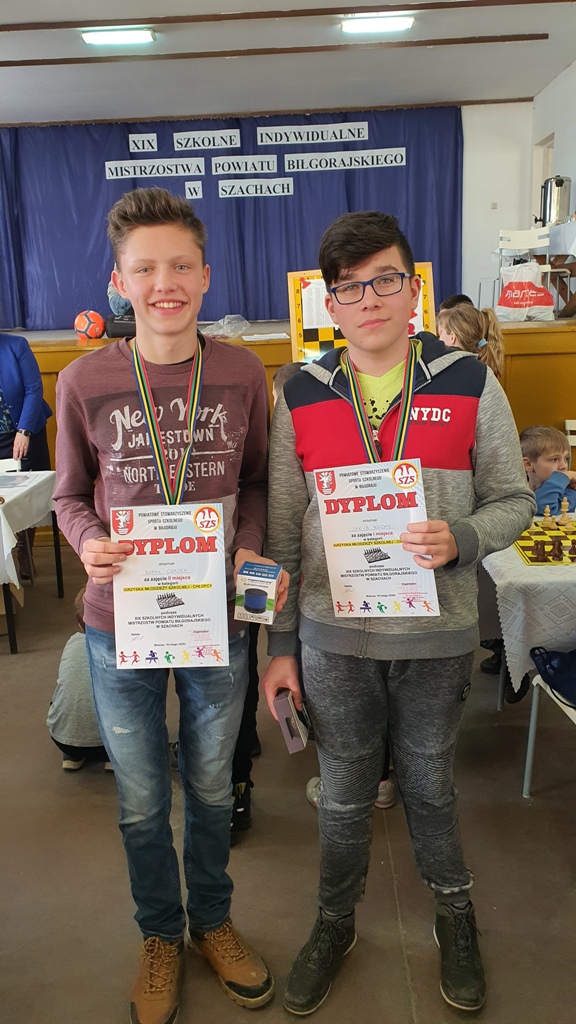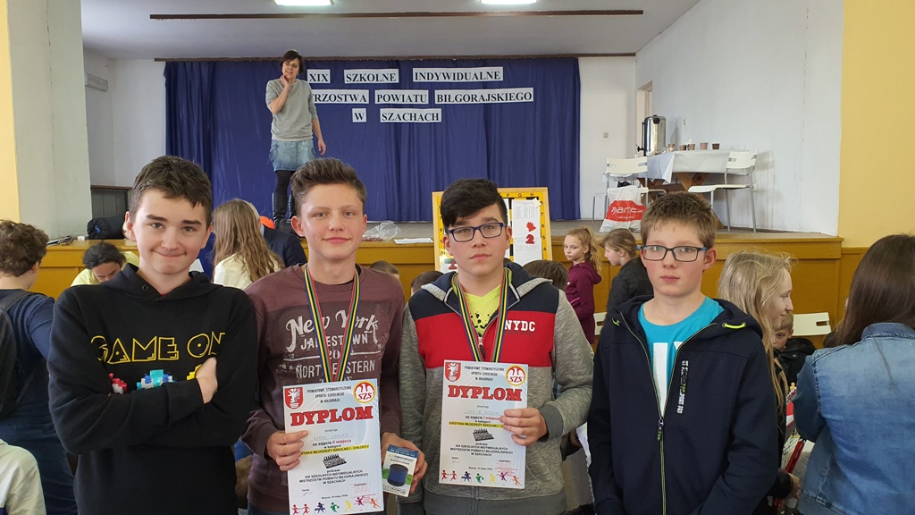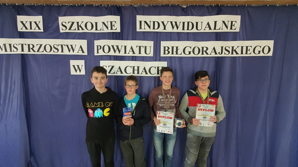Dwa pierwsze miejsca w swojej kategorii wiekowej zajęli uczniowie naszej szkoły w XIX SZKOLNYCH INDYWIDUALNYCH MISTRZOSTWACH POWIATU BIŁGORAJSKIEGO W SZACHACH. Dnia 18 lutego w GOSiR w Biszczy odbyły się kolejne mistrzostwa powiatowe w indywidualnych szachach. W zawodach udział wzięło ponad 100 uczniów ze szkół podstawowych i ponadpodstawowych naszego powiatu Naszą szkołę reprezentowało czterech chłopaków: Czajka Rafał, Kozak Jakub, Liwak Bartosz, Dubaj Kacper. Po grach systemem szwajcarskim na dystansie 7 rund, gdzie gra toczyła się losowo (każdy zawodnik z każdej grupy wiekowej mógł stoczyć pojedynek) wyłoniono zwycięzców poszczególnych kategorii. Pierwsze miejsce w Igrzyskach Młodzieży Szkolnej wywalczył Jakub Kozak zdobywając 5 pkt., drugi był Rafał Czajka - zdobywca 4,5 pkt. Na kolejnych pozycjach uplasował się Bartosz Liwak - 6 miejsce, któremu zabrakło remisu w jednym meczu do 3 miejsca. Kacper Dubaj ostatecznie zakończył zmagania na 11 miejscu. Serdecznie gratulujemy.