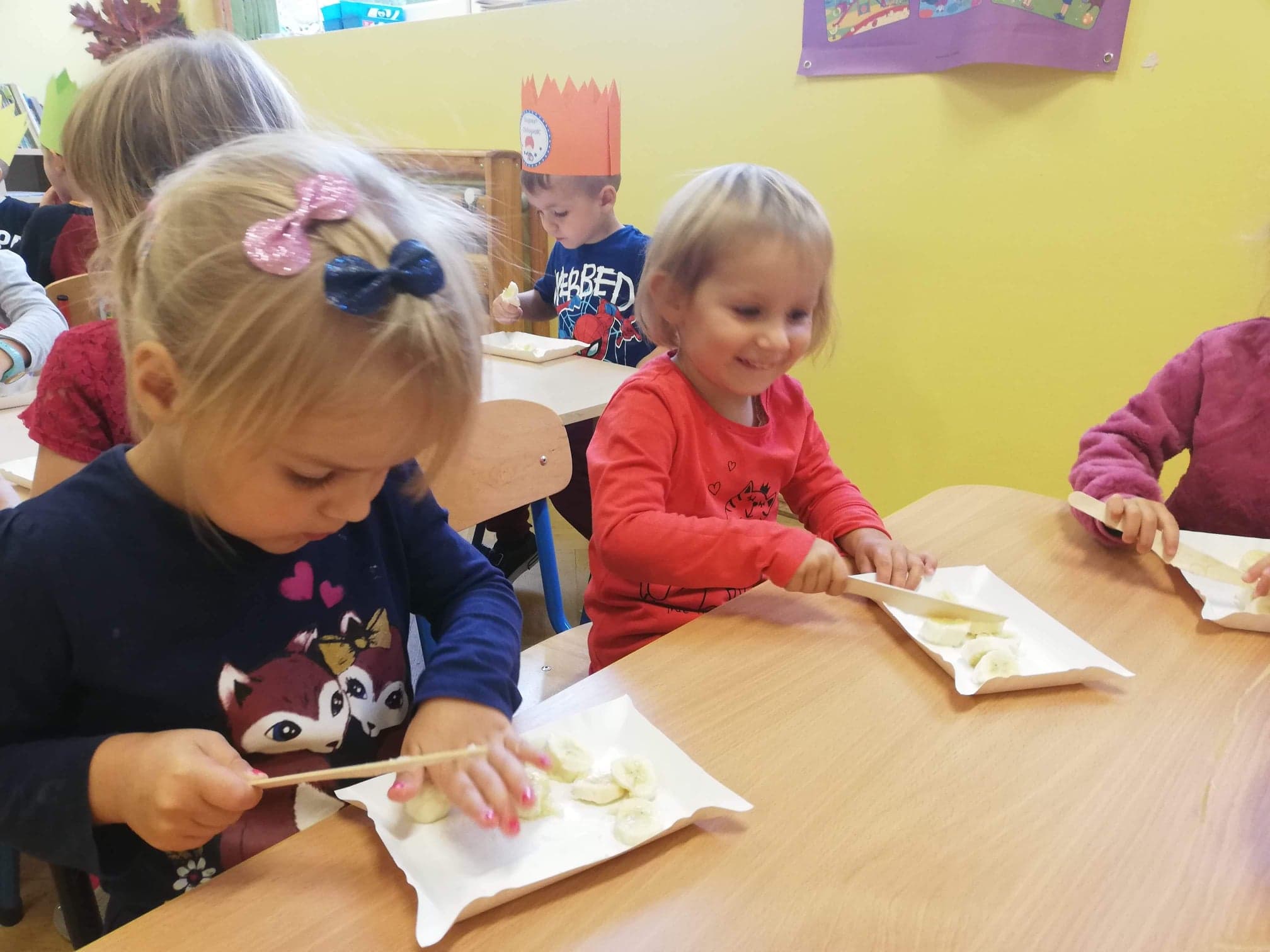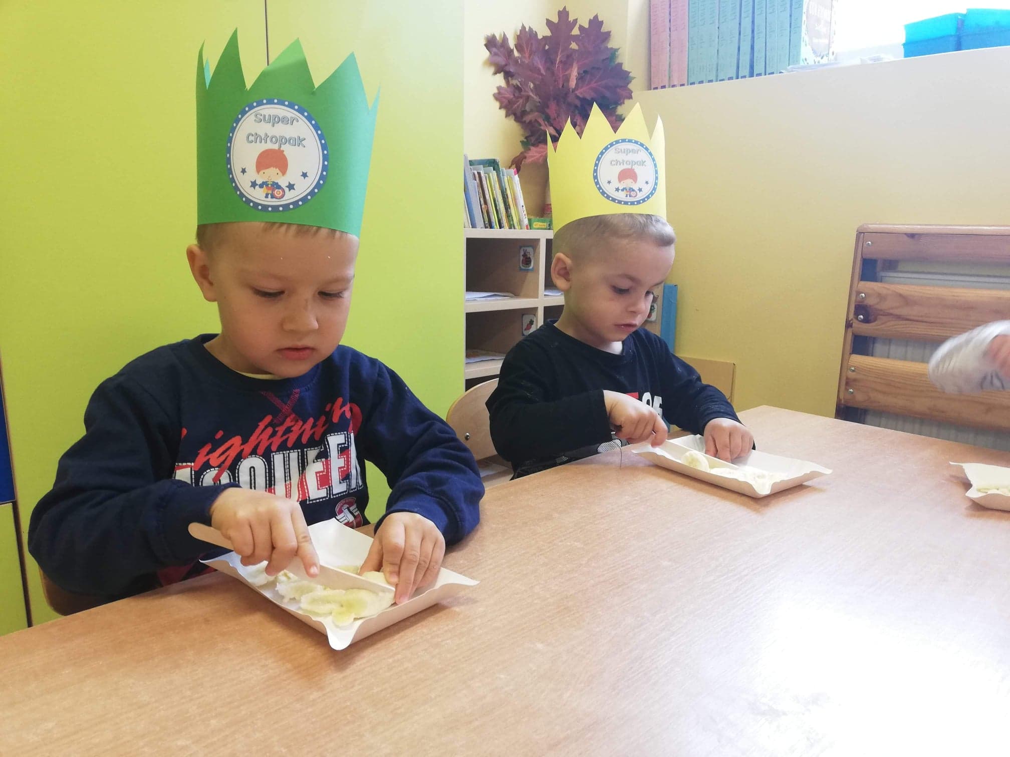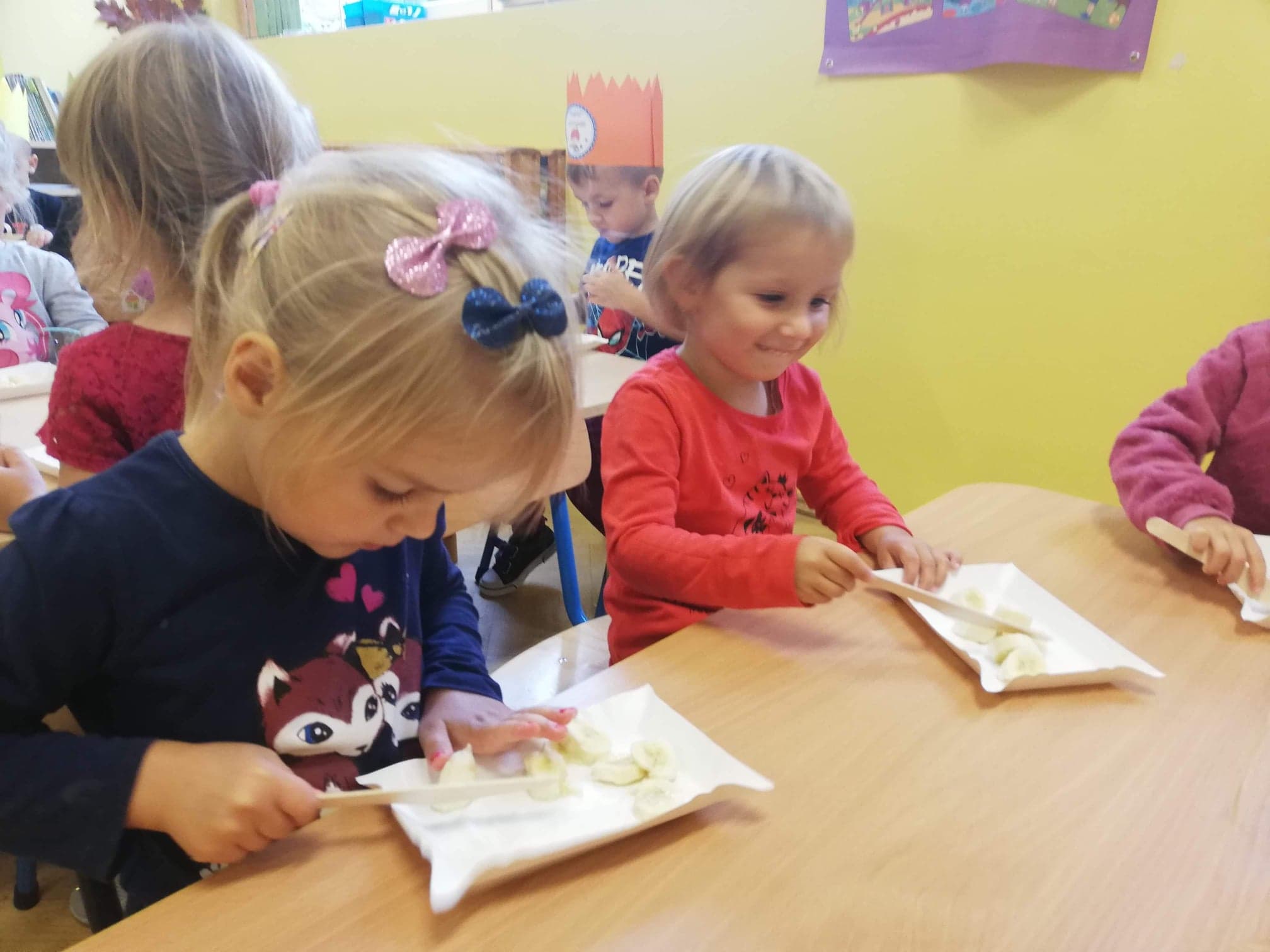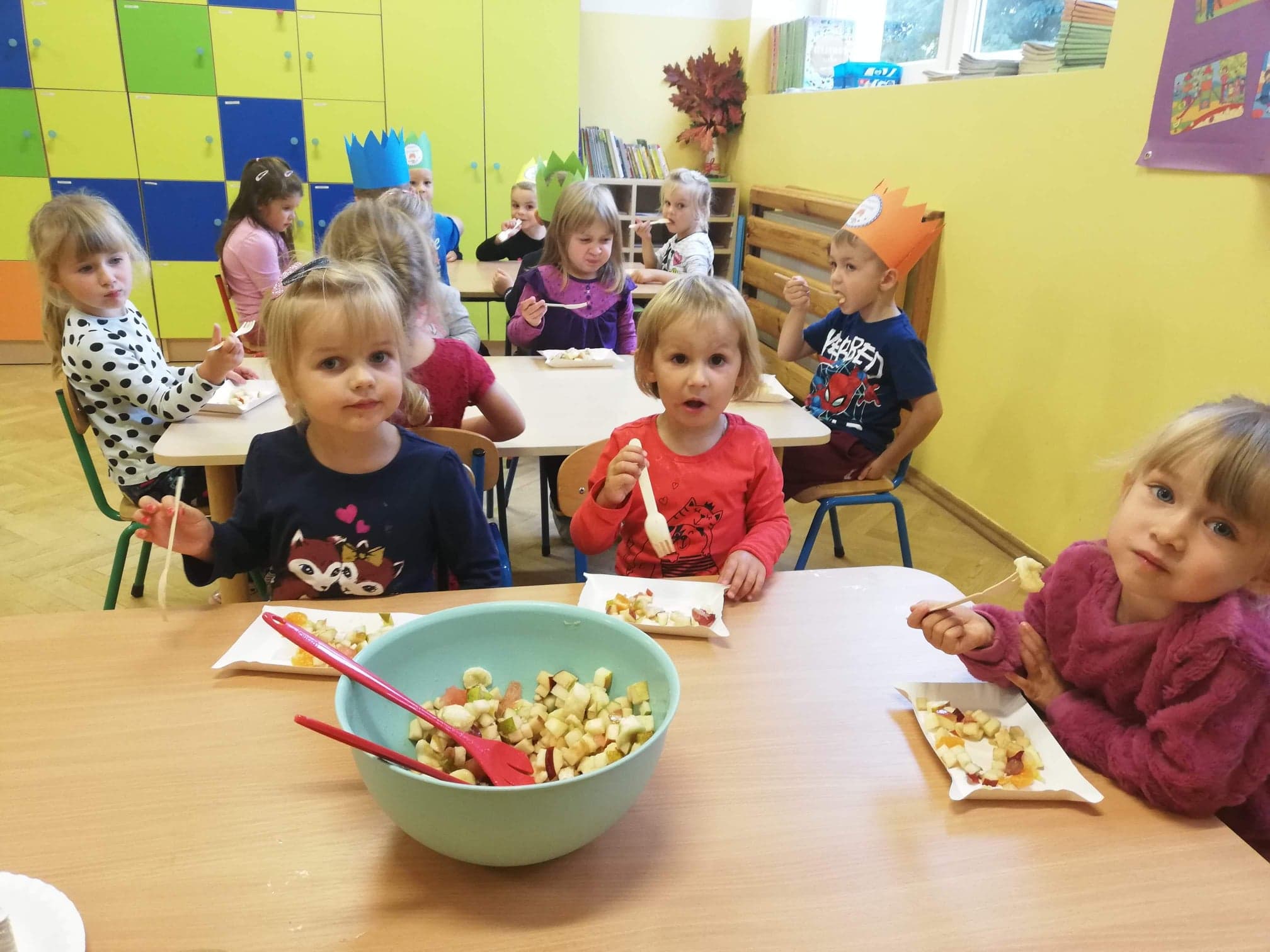 30 września obchodziliśmy w grupie dzieci 3-4-letnich Dzień Chłopaka. W tym roku to wyjątkowe święto połączyliśmy z Dniem Owocowym. Z tej okazji oprócz złożenia życzeń i wręczenia chłopcom koron z napisem "Super chłopak" odbyły się też ciekawe zajęcia o owocach. Dzieci m.in. segregowały owoce, liczyły, rozpoznawały je po zapachu i smaku. Po zajęciach dziewczynki przygotowały dla naszych chłopców sałatkę owocową. Chłopcy, jak na dżentelmenów przystało, oczywiście pomogli w jej przygotowaniu :) Następnie wszyscy kontynuowaliśmy świętowanie jedząc pyszną i zdrową sałatkę owocową. Jeszcze raz życzymy samych wspaniałości dla naszych przedszkolnych chłopców.