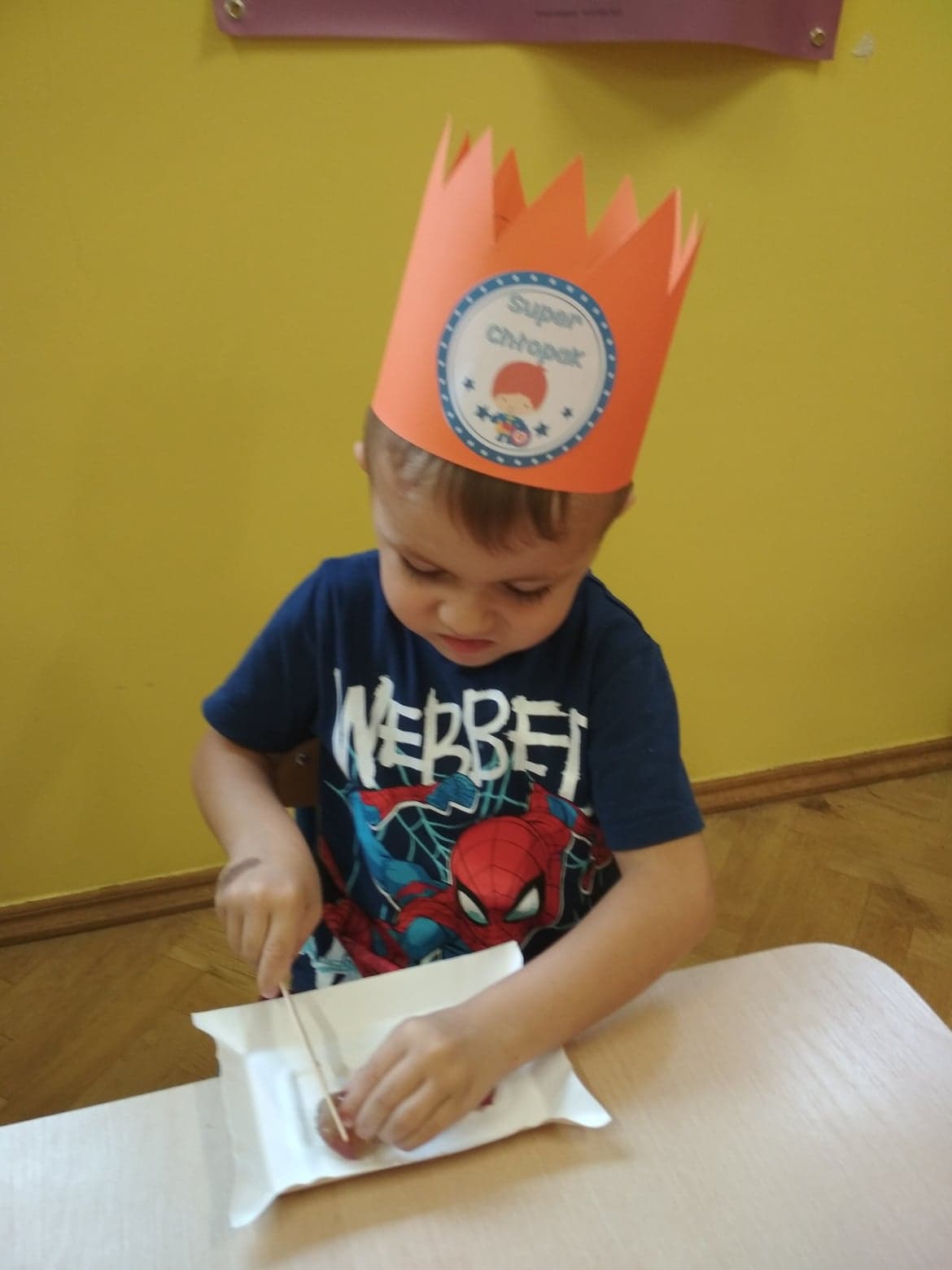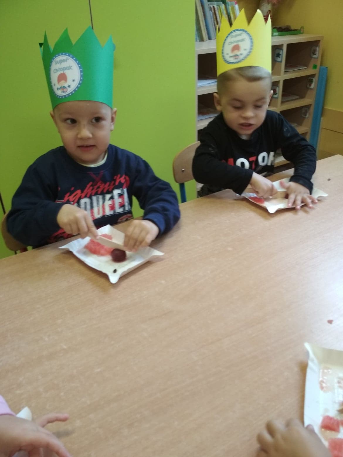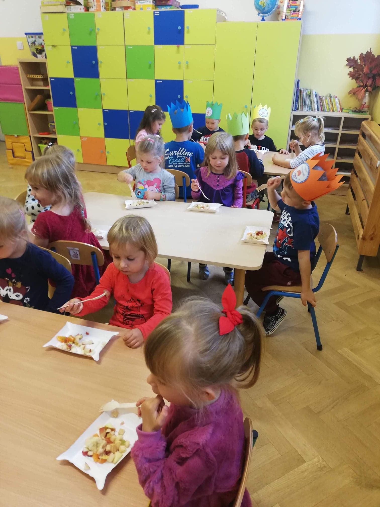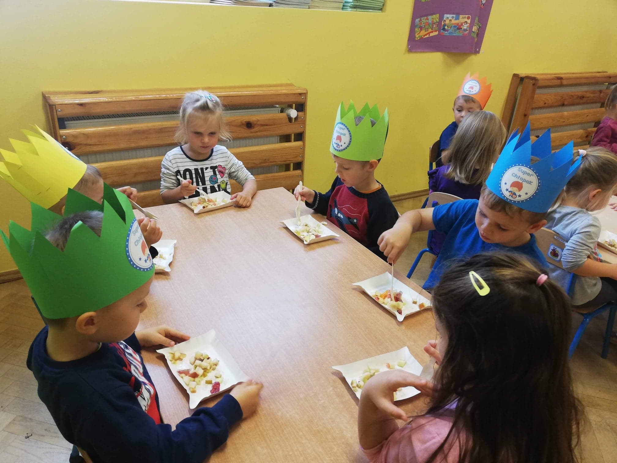 30 września obchodziliśmy w grupie dzieci 3-4-letnich Dzień Chłopaka. W tym roku to wyjątkowe święto połączyliśmy z Dniem Owocowym. Z tej okazji oprócz złożenia życzeń i wręczenia chłopcom koron z napisem "Super chłopak" odbyły się też ciekawe zajęcia o owocach. Dzieci m.in. segregowały owoce, liczyły, rozpoznawały je po zapachu i smaku. Po zajęciach dziewczynki przygotowały dla naszych chłopców sałatkę owocową. Chłopcy, jak na dżentelmenów przystało, oczywiście pomogli w jej przygotowaniu :) Następnie wszyscy kontynuowaliśmy świętowanie jedząc pyszną i zdrową sałatkę owocową. Jeszcze raz życzymy samych wspaniałości dla naszych przedszkolnych chłopców.