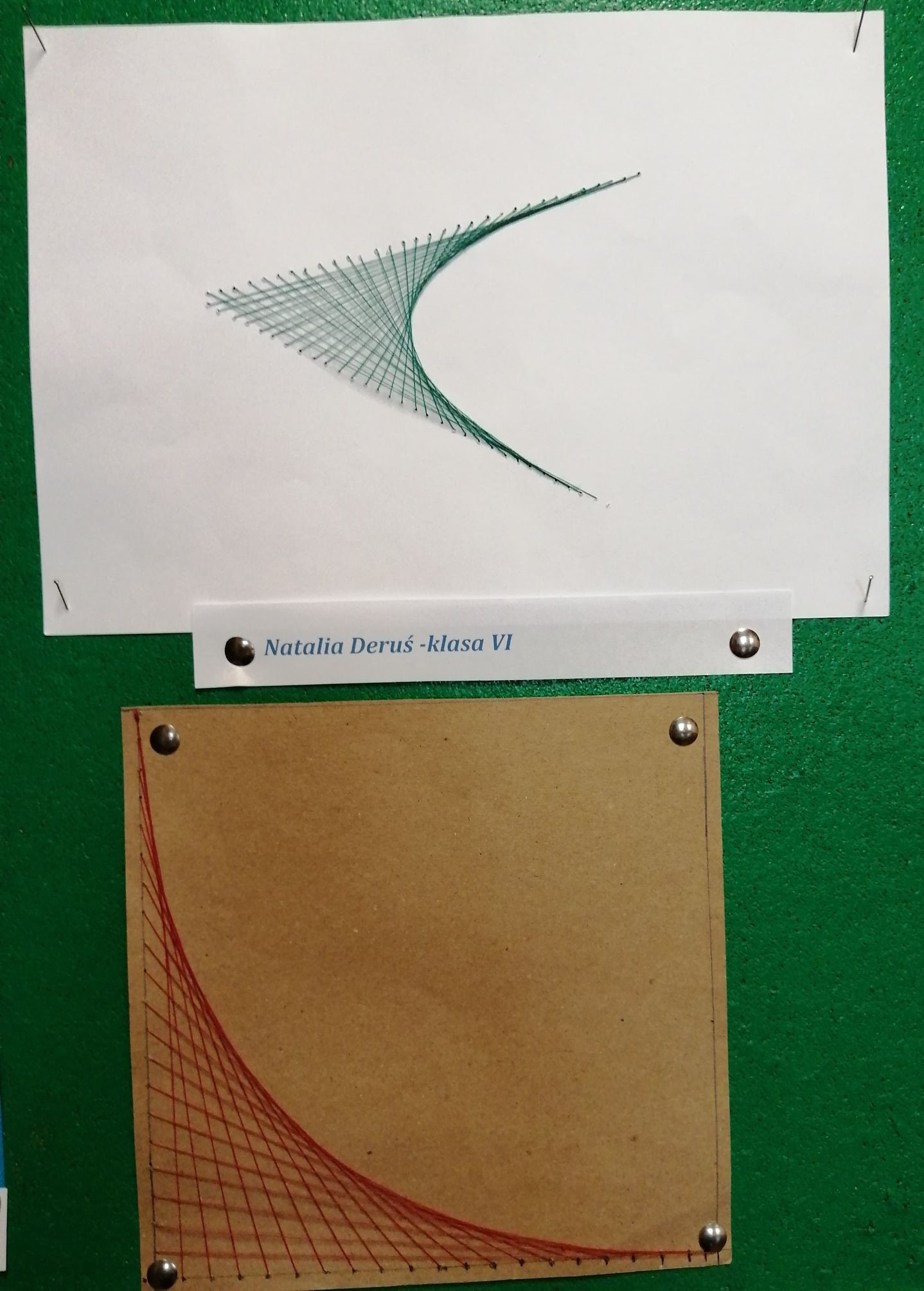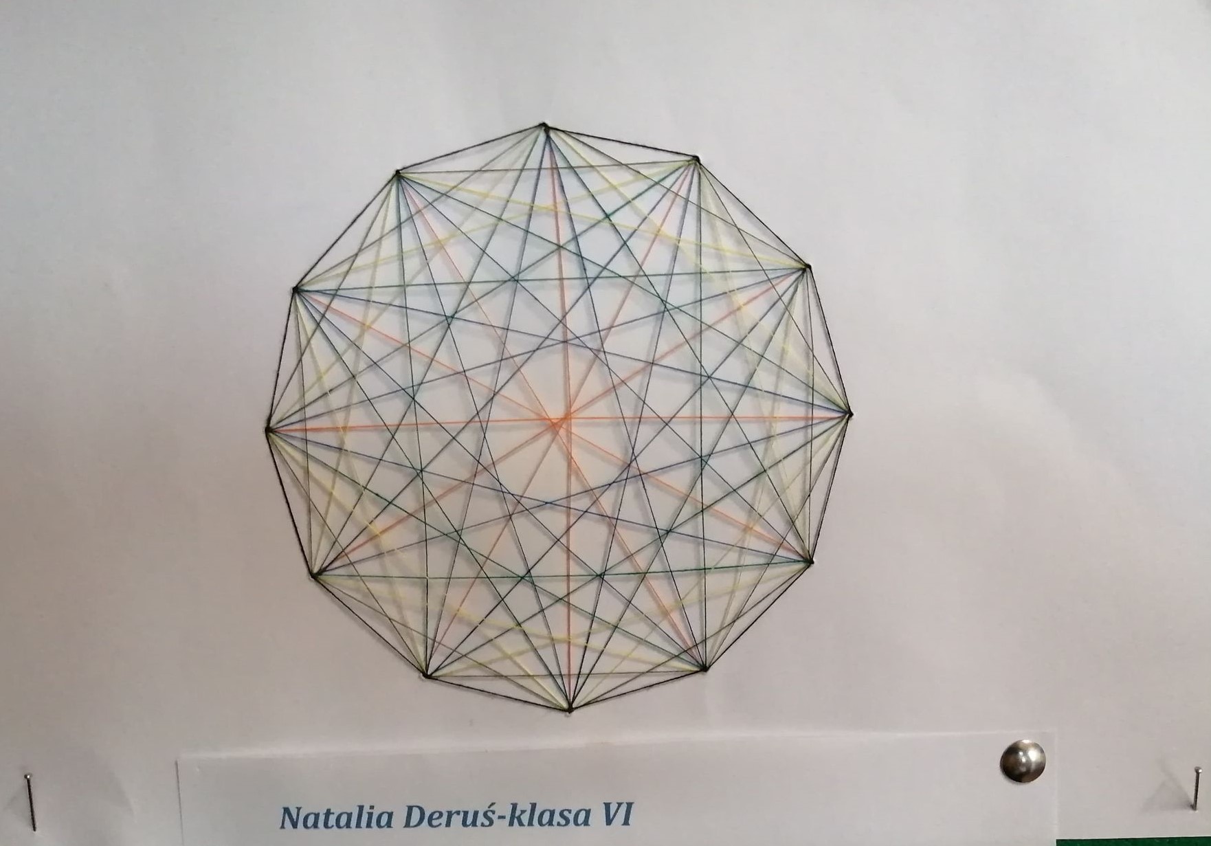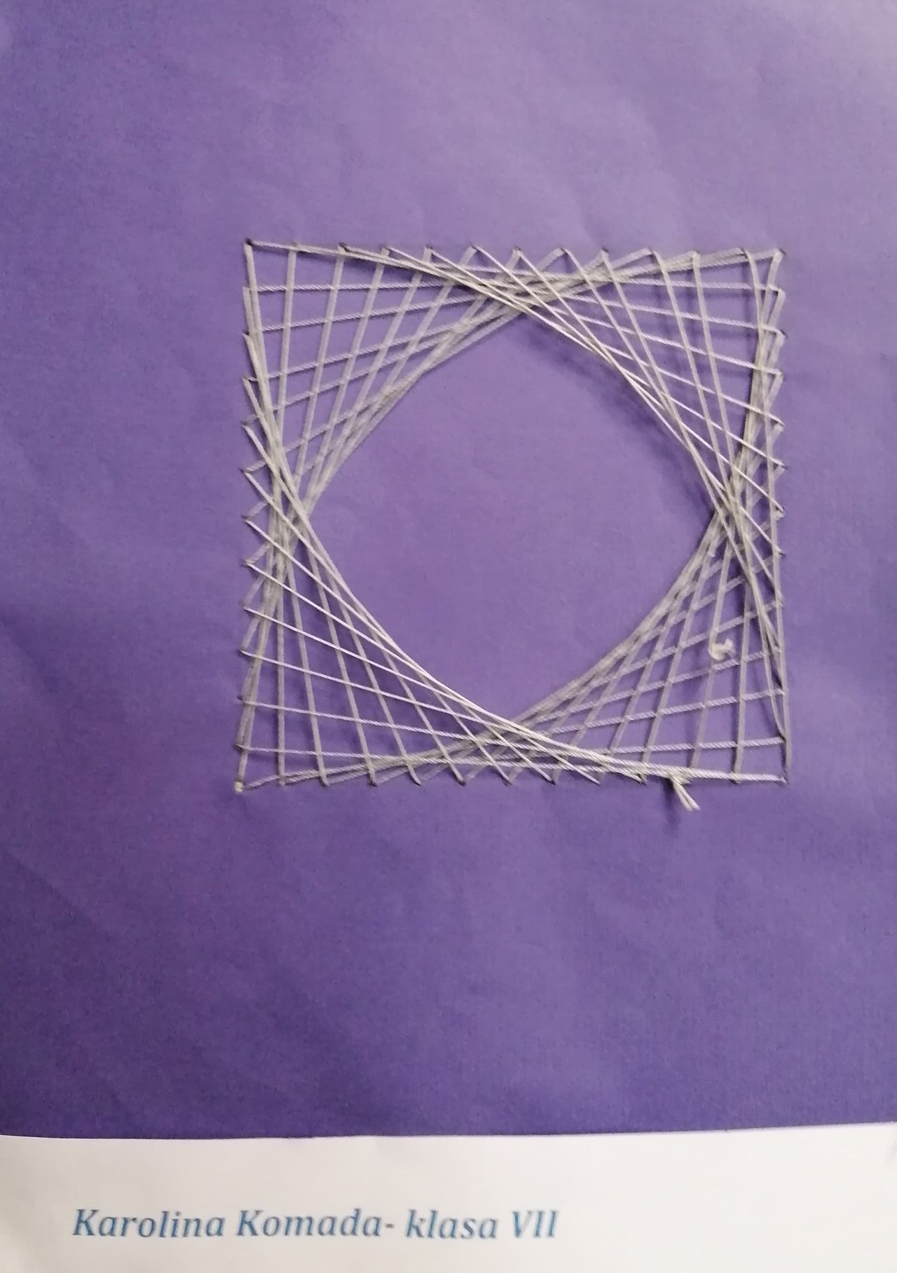 Kilka chętnych uczennic z klas starszych poświęciło swój wolny czas, aby zaprezentować matematyczny haft. Każdy może wykonać go sam. Przed przystąpieniem do wyszywania należy przygotować: linijkę, ołówek, cyrkiel oraz oczywiście igłę i kolorowe nici. Haft wykonuje się na twardym podłożu, np. na kartce z bloku technicznego lub kolorowym kartonie, brystolu czy tekturze. Na przygotowanym papierze rysujemy wielokąty, a następnie przy pomocy linijki rozmieszczamy, a przy pomocy cyrkla nakłuwamy, dziurki. Odległość między nimi decyduje o gęstości rozmieszczenia nici. Elementem malującym jest odpowiednio naciągnięta nitka, czyli odcinek – jedna z podstawowych figur geometrycznych. Za pomocą tylko i wyłącznie odpowiednio rozmieszczonych odcinków tworzy się mniej lub bardziej złożone figury geometryczne. Aby wyszyć kąt wypukły należy na lewej stronie kartki na ramionach kąta, w jednakowych odstępach, najlepiej np. co 2-5 mm, nakłuć dziurki. Na każdym z ramion tyle samo. Następnie odwracamy kartkę na drugą stronę. Nitkę poprowadzimy od dziurki położonej najbliżej wierzchołka na jednym ramieniu do tej najbardziej odległej na drugim ramieniu kąta, poruszając się o jedno pole w górę i o jedno pole w dół. Z kątów można wykonać różnego rodzaju kompozycje. Poniżej znajduje się galeria zdjęć przedstawiających prace naszych uczennic.