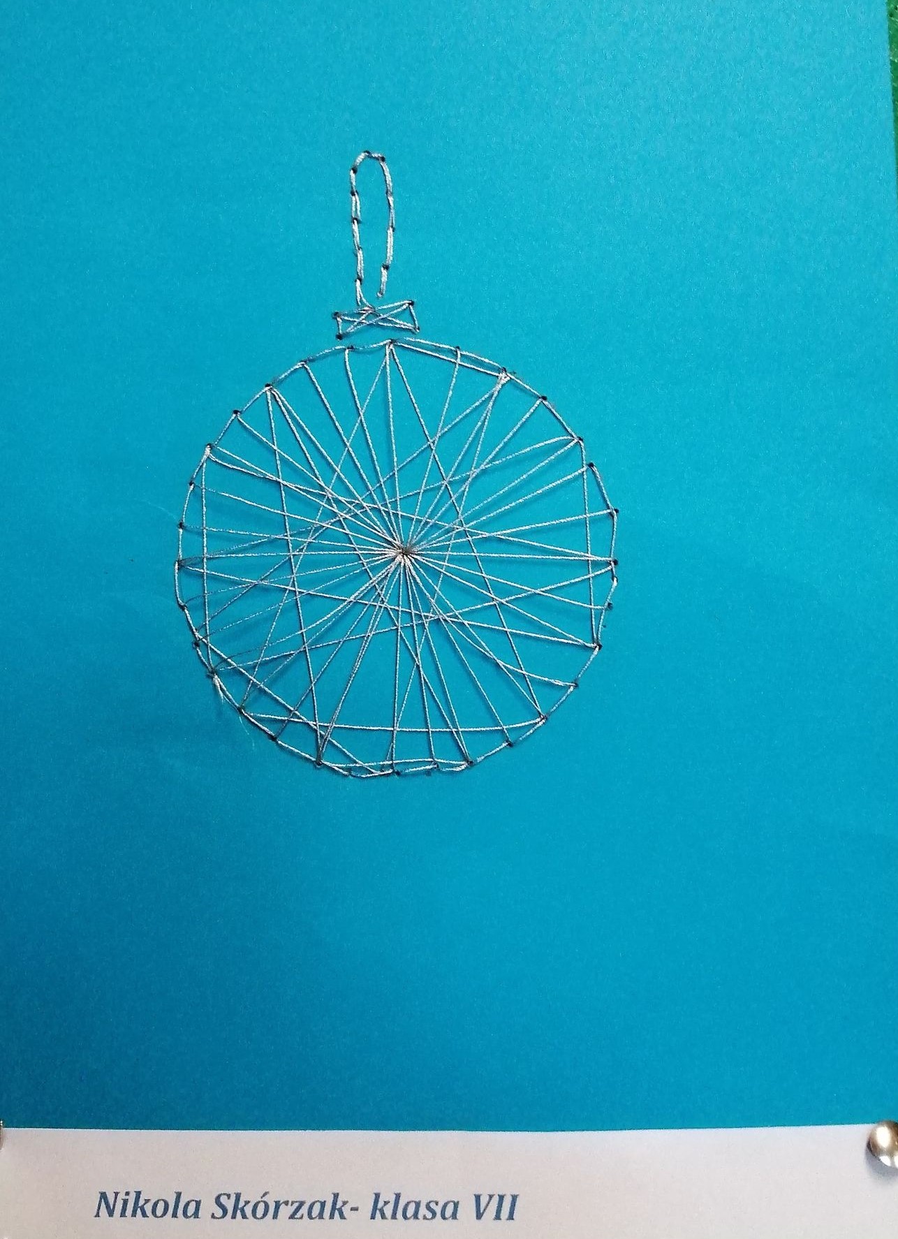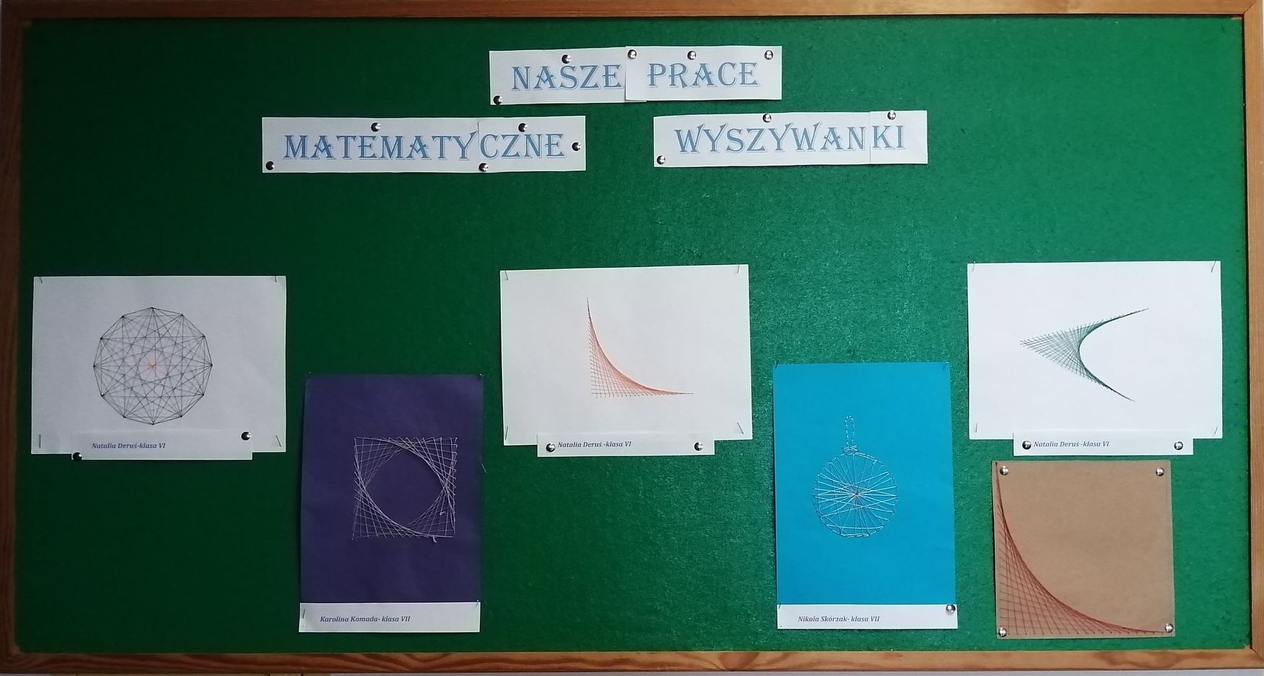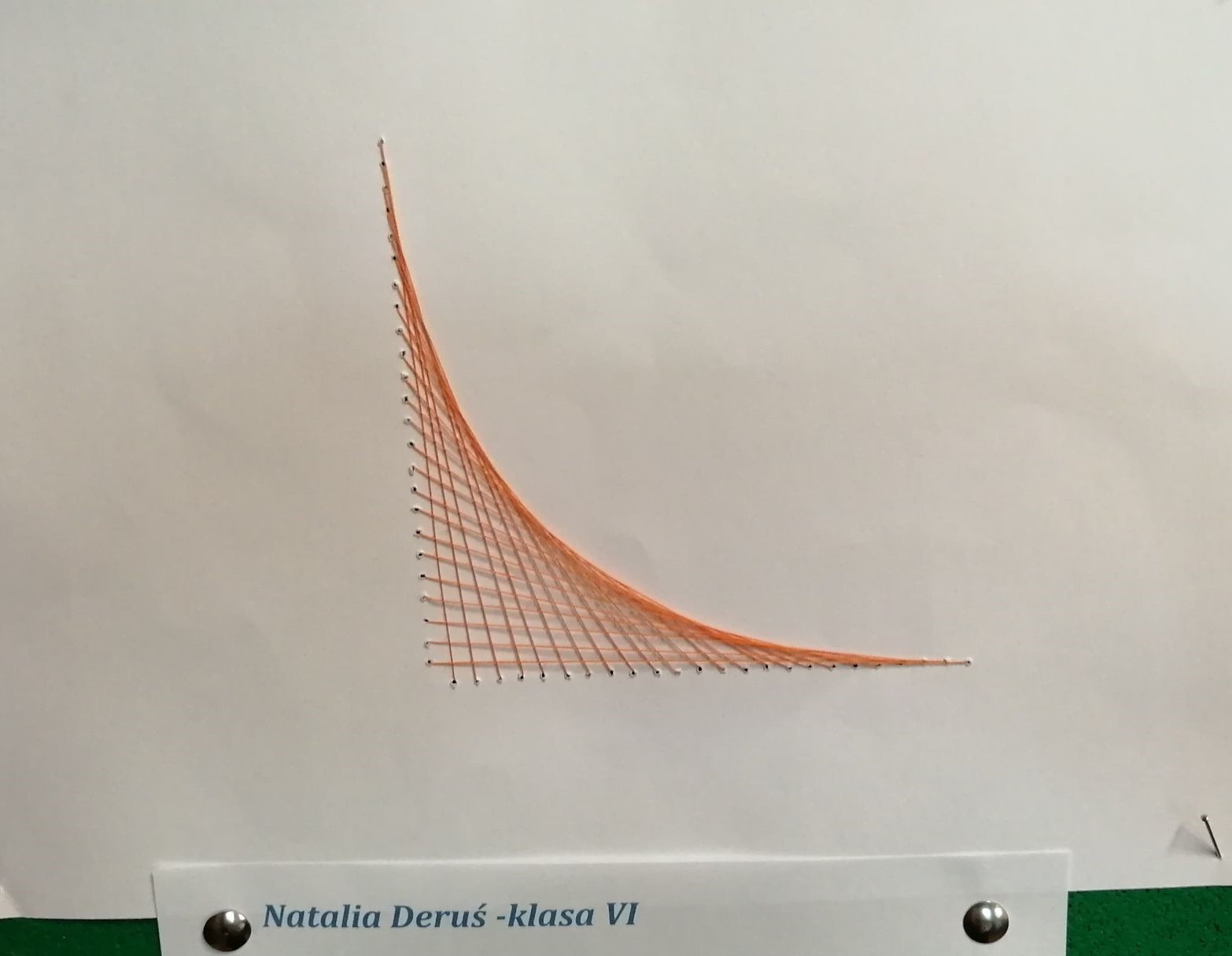 Kilka chętnych uczennic z klas starszych poświęciło swój wolny czas, aby zaprezentować matematyczny haft. Każdy może wykonać go sam. Przed przystąpieniem do wyszywania należy przygotować: linijkę, ołówek, cyrkiel oraz oczywiście igłę i kolorowe nici. Haft wykonuje się na twardym podłożu, np. na kartce z bloku technicznego lub kolorowym kartonie, brystolu czy tekturze. Na przygotowanym papierze rysujemy wielokąty, a następnie przy pomocy linijki rozmieszczamy, a przy pomocy cyrkla nakłuwamy, dziurki. Odległość między nimi decyduje o gęstości rozmieszczenia nici. Elementem malującym jest odpowiednio naciągnięta nitka, czyli odcinek – jedna z podstawowych figur geometrycznych. Za pomocą tylko i wyłącznie odpowiednio rozmieszczonych odcinków tworzy się mniej lub bardziej złożone figury geometryczne. Aby wyszyć kąt wypukły należy na lewej stronie kartki na ramionach kąta, w jednakowych odstępach, najlepiej np. co 2-5 mm, nakłuć dziurki. Na każdym z ramion tyle samo. Następnie odwracamy kartkę na drugą stronę. Nitkę poprowadzimy od dziurki położonej najbliżej wierzchołka na jednym ramieniu do tej najbardziej odległej na drugim ramieniu kąta, poruszając się o jedno pole w górę i o jedno pole w dół. Z kątów można wykonać różnego rodzaju kompozycje. Poniżej znajduje się galeria zdjęć przedstawiających prace naszych uczennic.