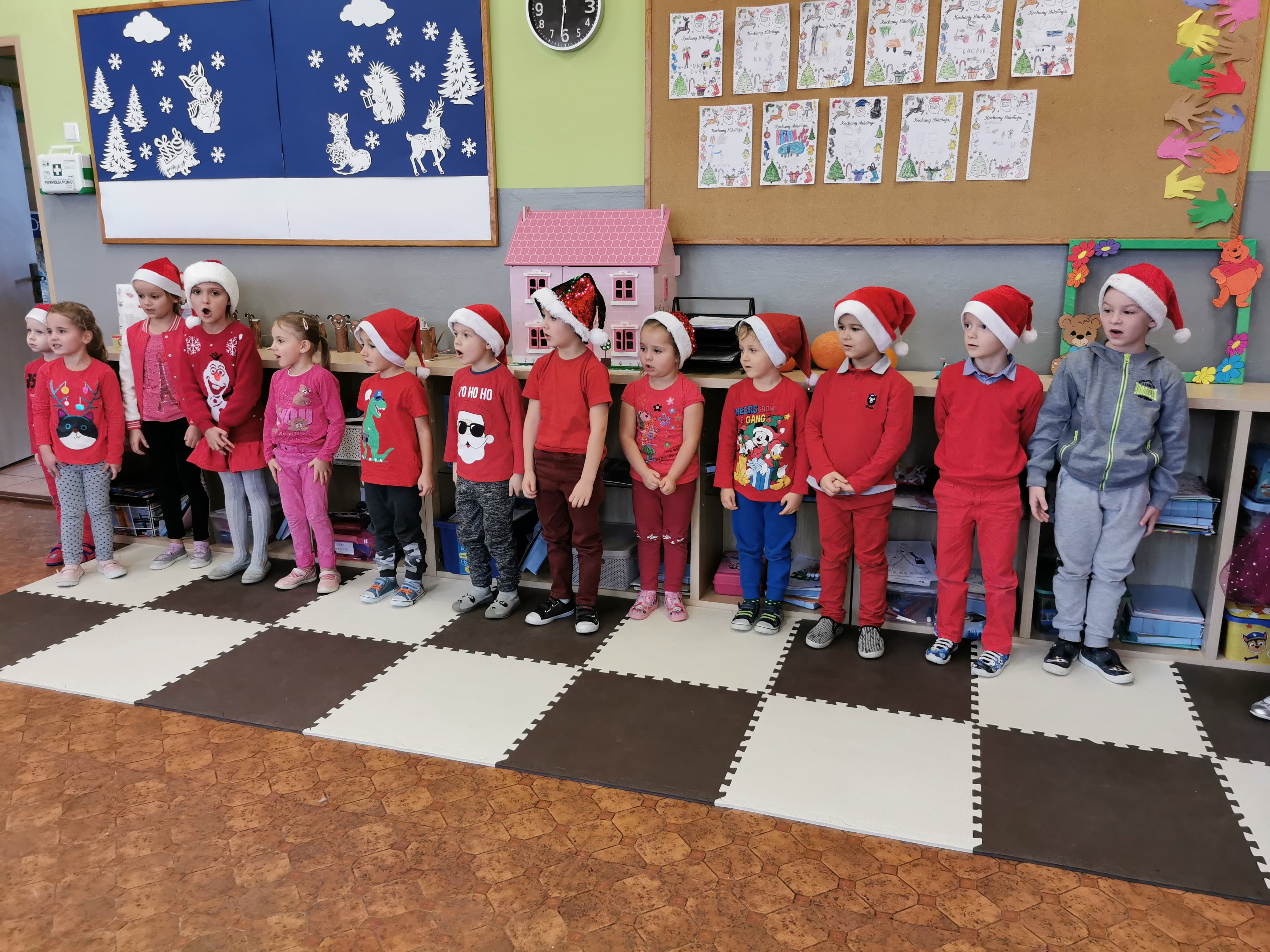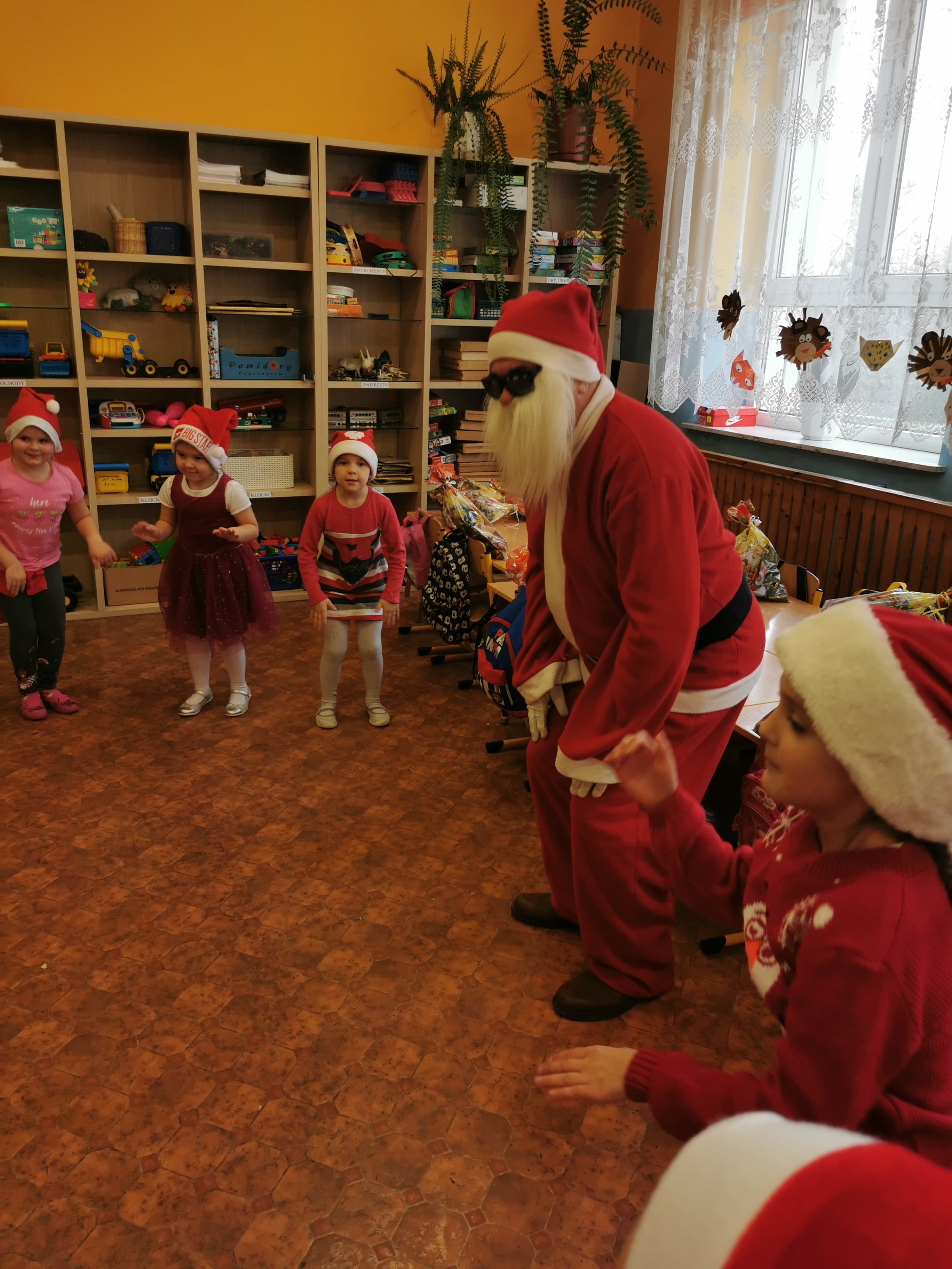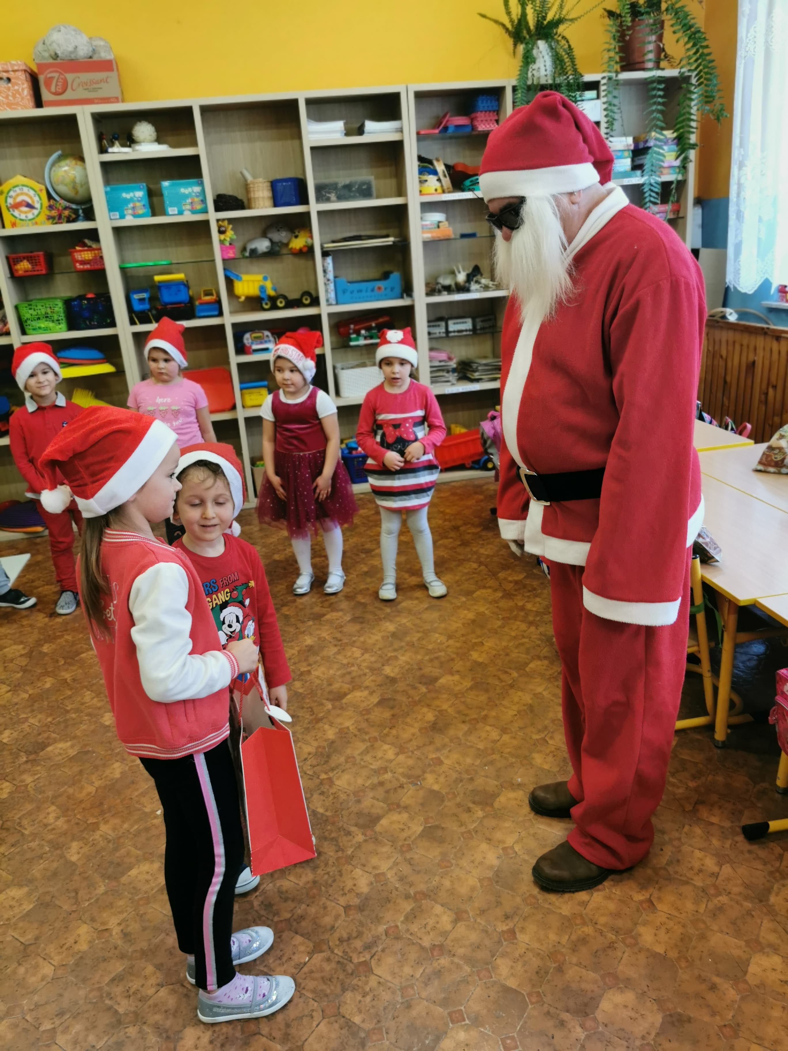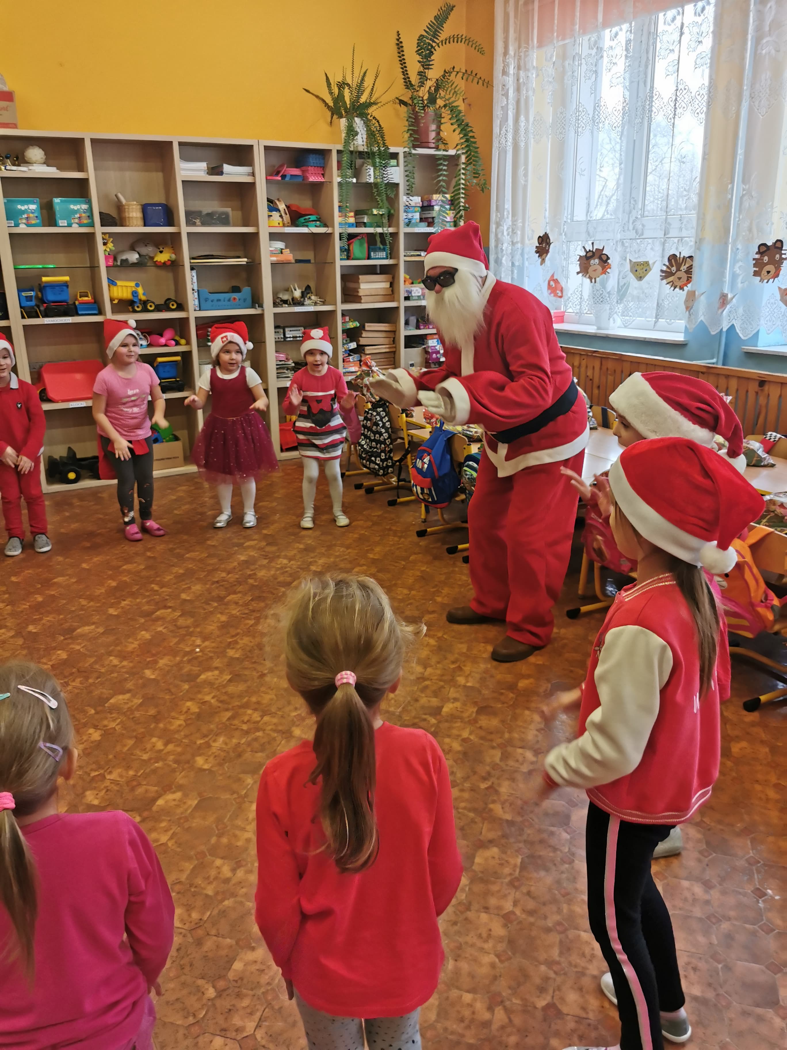 Święty Mikołaj co roku odwiedza wszystkie grzeczne dzieci. Tak też było w zerówce. 4 grudnia grzecznych starszaków odwiedził Święty Mikołaj z workiem pełnym prezentów. Dzieci do przedszkola przyszły pięknie ubrane na czerwono, w mikołajowych czapkach na głowach. Od rana przez okno wyglądały, czy Mikołaj nie zbliża się do naszego przedszkola. Przedszkolaki były radosne i uśmiechnięte a gdy znaleźli się blisko Mikołaja - były zawstydzone. Starszaki Świętego Mikołaja przywitały wierszykami oraz piosenką. Mikołaj oprócz worka pełnego prezentów przywiózł ze sobą mnóstwo uśmiechu. Święty Mikołaj zachęcał dzieci, aby były grzeczne i słuchały pani w przedszkolu oraz rodziców w domu. Święty Mikołaj osobiście wręczył paczkę przedszkolakom, a w niej dla każdego coś dobrego. Starszaki również przygotowały skromny upominek dla Mikołaja, ale żeby go dostać Mikołaj musiał zatańczyć z przedszkolakami taniec. Mikołaj w tańcu wypadł rewelacyjnie. Tak bardzo oczekiwaną przez dzieci wizyta Mikołaja minęła w miłej atmosferze i przyniosła dzieciom wiele radości.