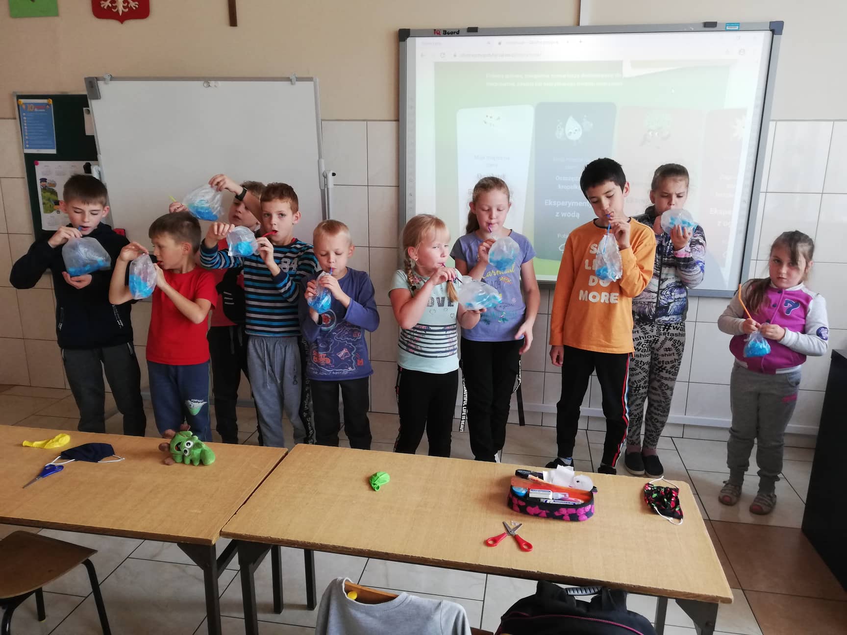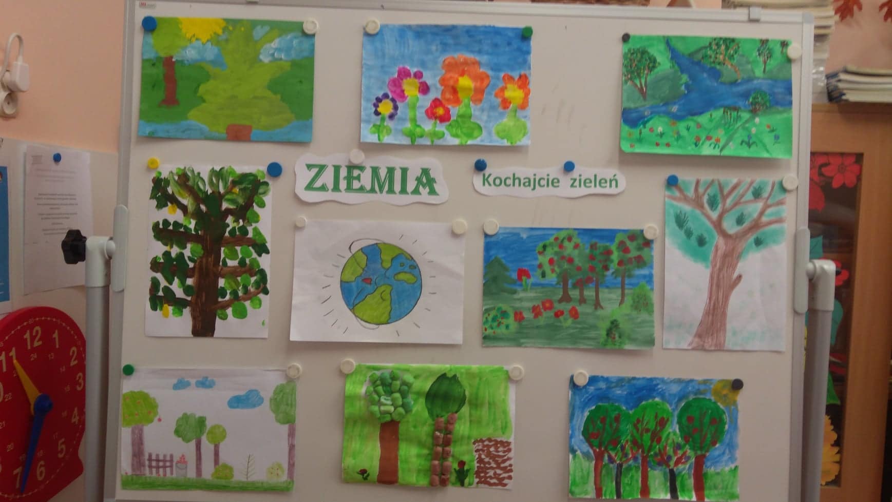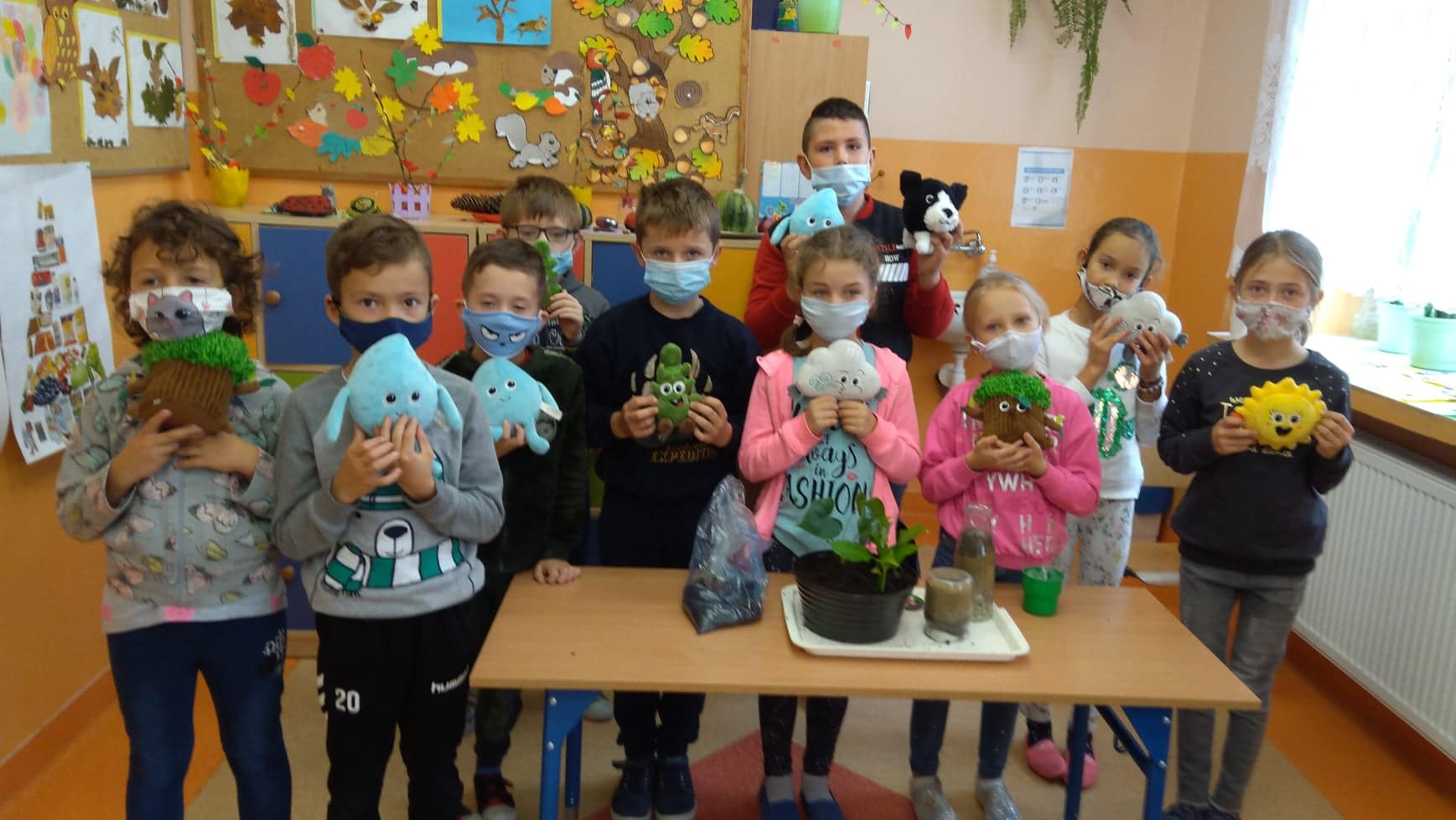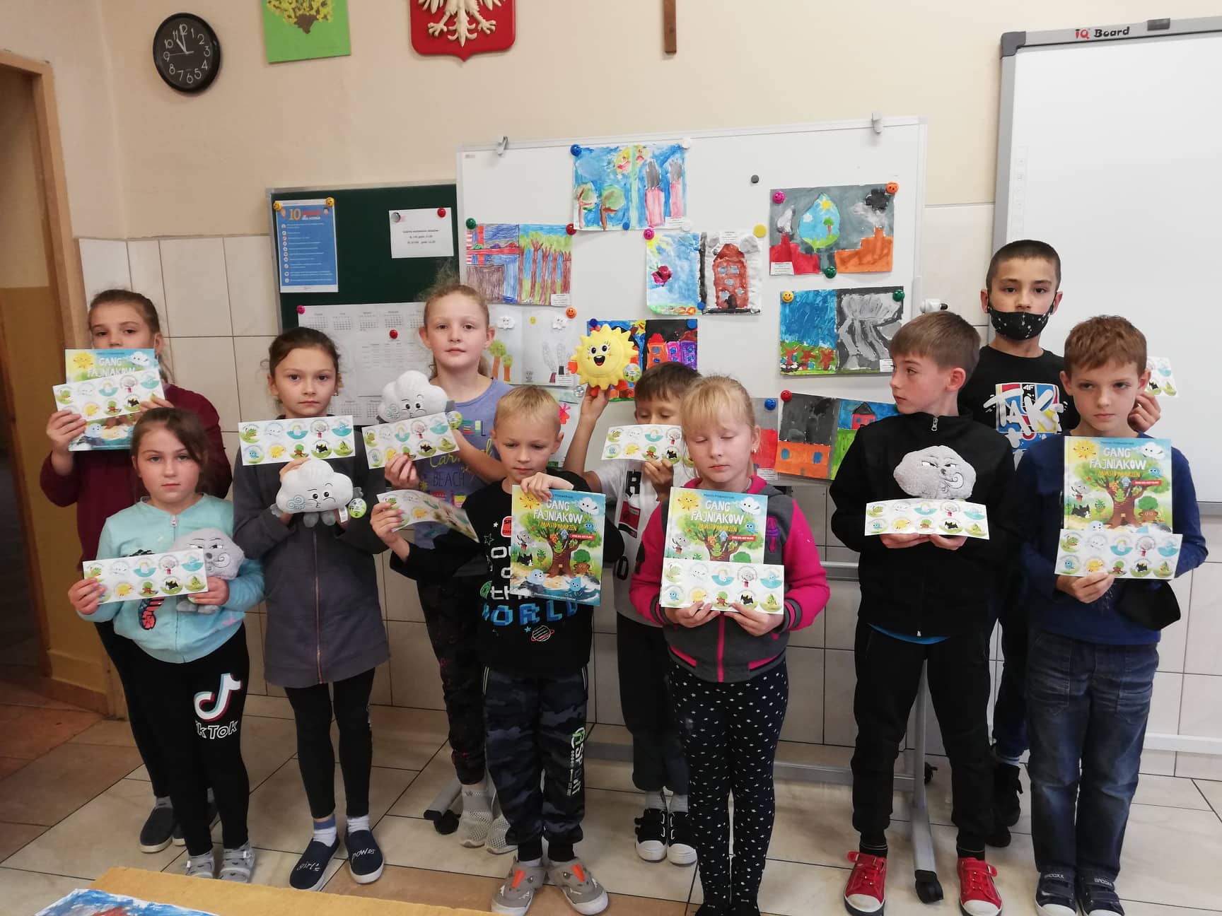 Troska o środowisko naturalne jest bardzo ważna. Wierzymy, że dobre nawyki ekologiczne warto wpajać już od najmłodszych lat, dlatego uczniowie klas I-III oraz przedszkolaki z oddziału dzieci 5-6 letnich wzięły udział w konkursie propagującym wrażliwość ekologiczną - „Szkolne Przygody Gangu Fajniaków”. Razem z „Fajniakami” dzieci poznawały magię natury, uczyły się wrażliwości ekologicznej i troski o środowisko każdego dnia. W paczkach, które otrzymaliśmy od sklepu Biedronka, zamieszczone były maskotki bohaterów, książki z historyjkami z ich udziałem oraz zestaw naklejek-odznak do nagradzania ekologicznych postaw wśród uczniów. Zadanie konkursowe polegało na przeprowadzeniu zajęć dotyczących wybranego żywiołu na podstawie scenariuszy i materiałów edukacyjnych dostępnych na stronie programu, udokumentowaniu i opisaniu tych zajęć oraz przesłaniu indywidualnych prac plastycznych dzieci inspirowanych wybranym żywiołem. Każda klasa pracowała z innym żywiołem: zerówka z ogniem, klasa I z wodą, klasa II z ziemia, klasa III z powietrzem. Uczniowie byli bardzo zainteresowani i z dużym zaangażowaniem przystąpili do wykonania poszczególnych zadań konkursowych.