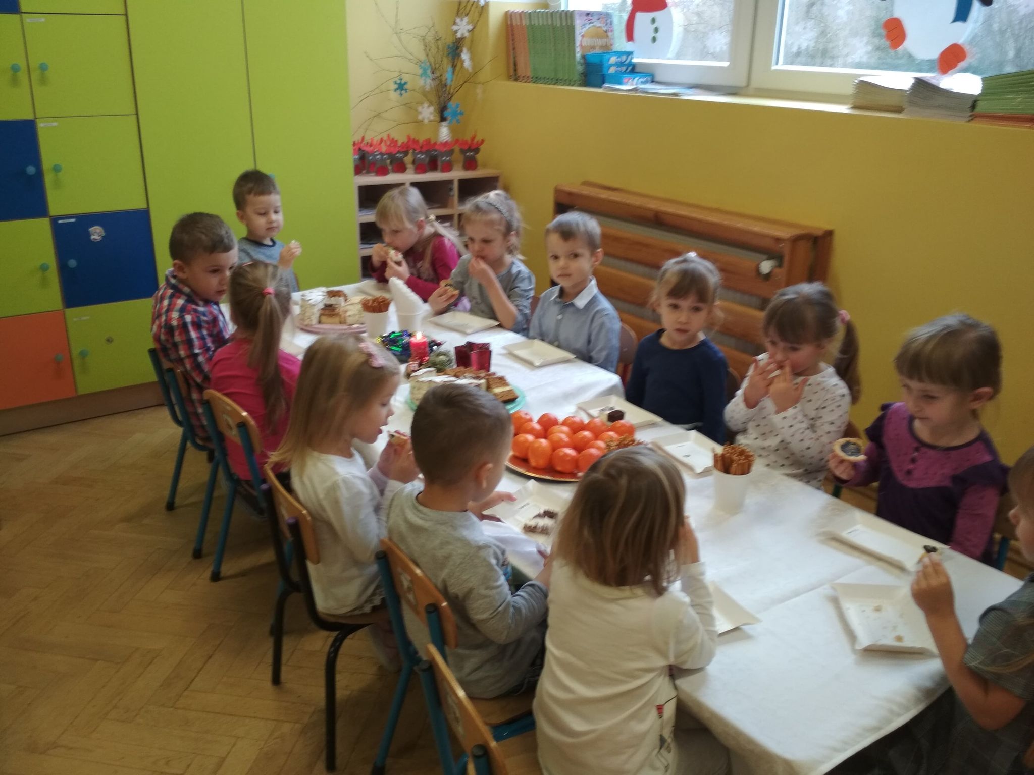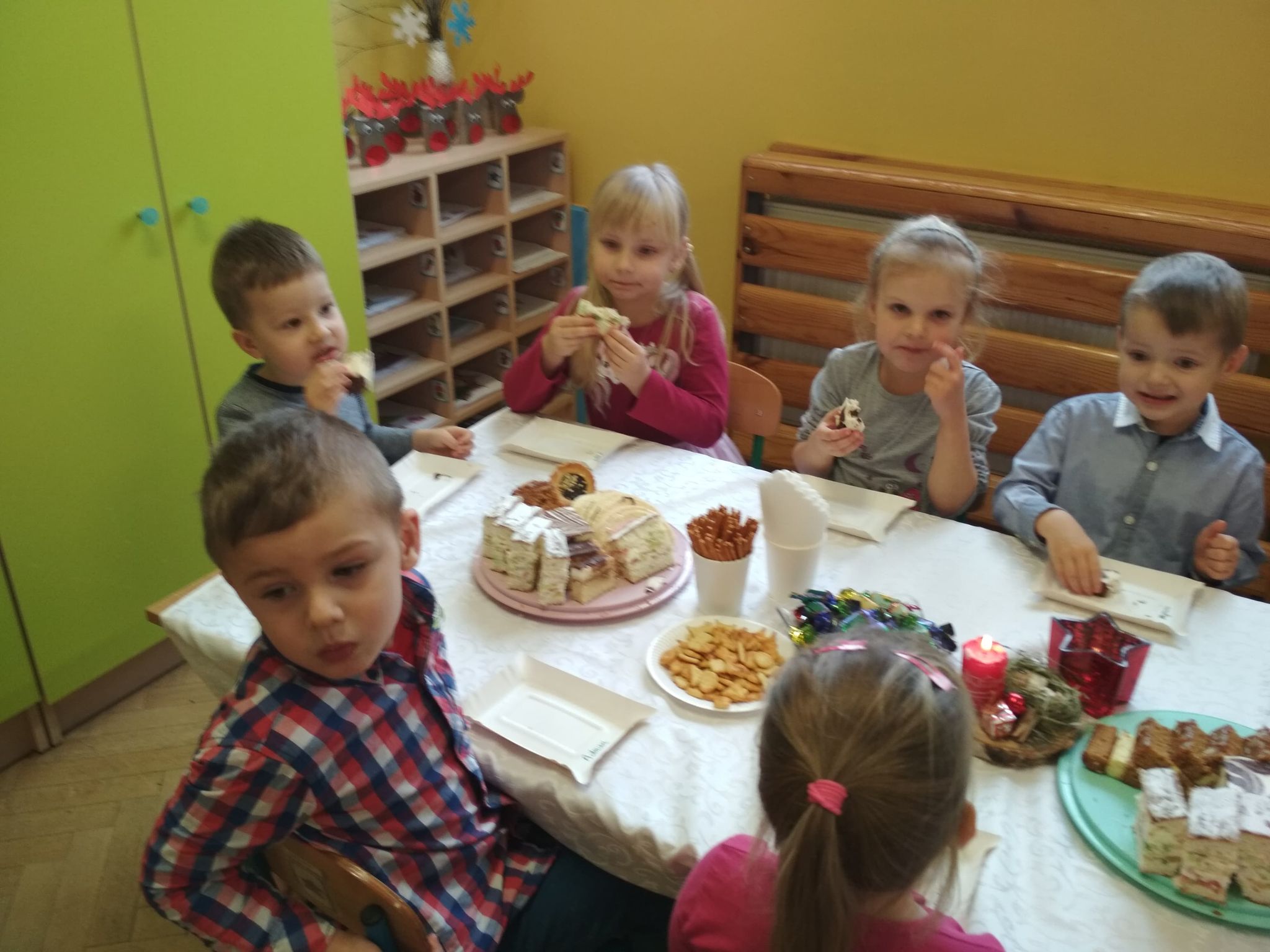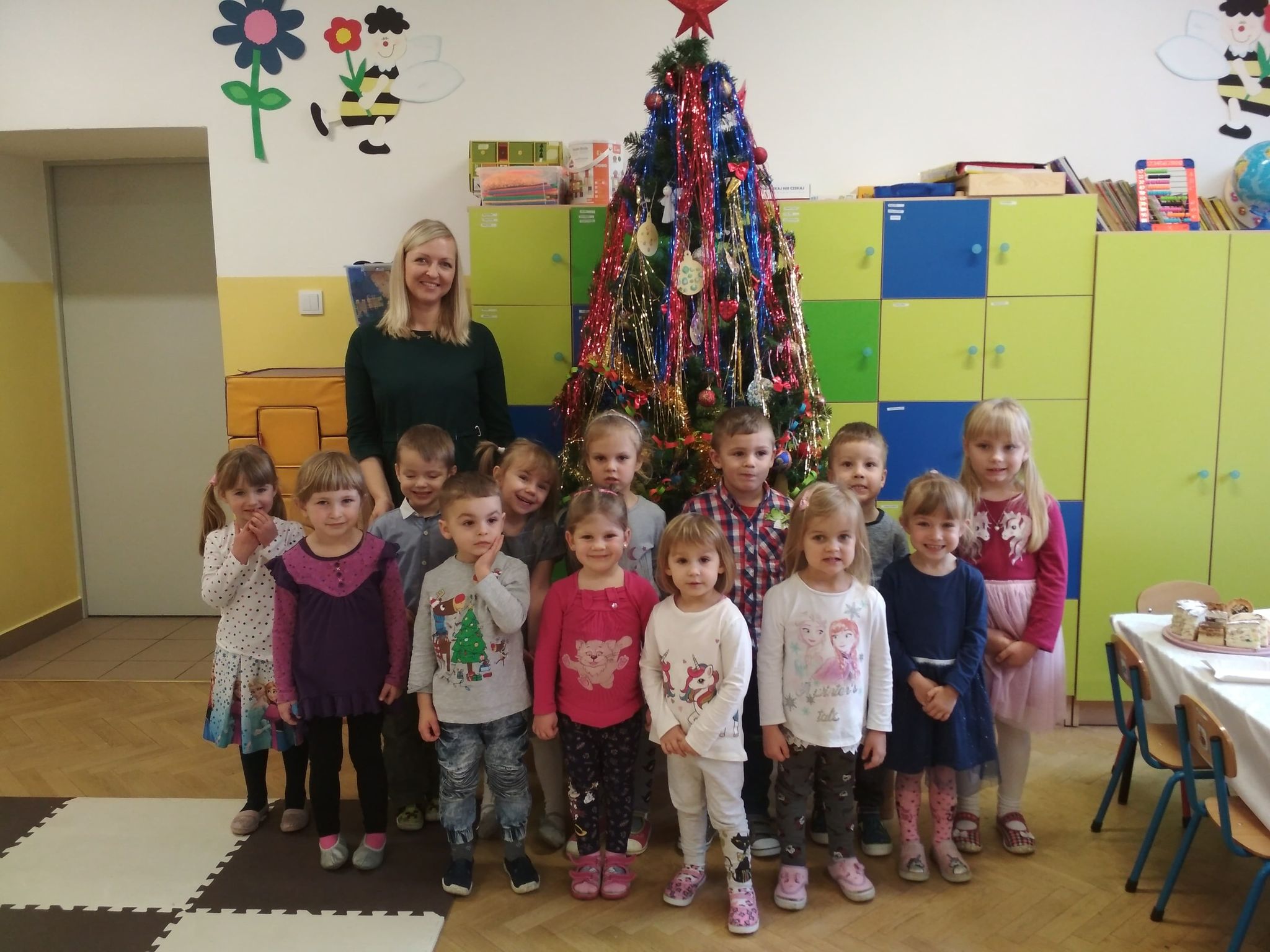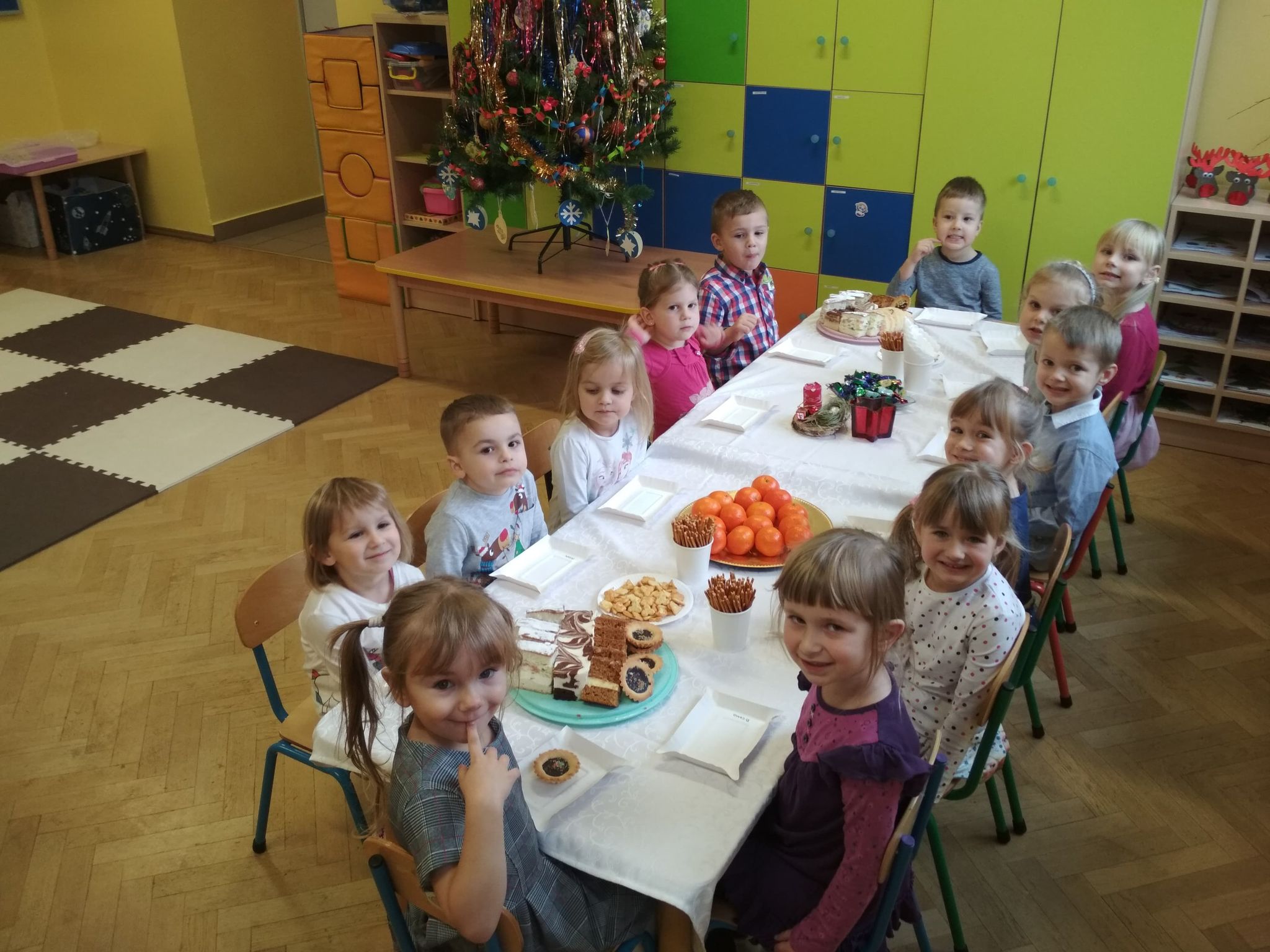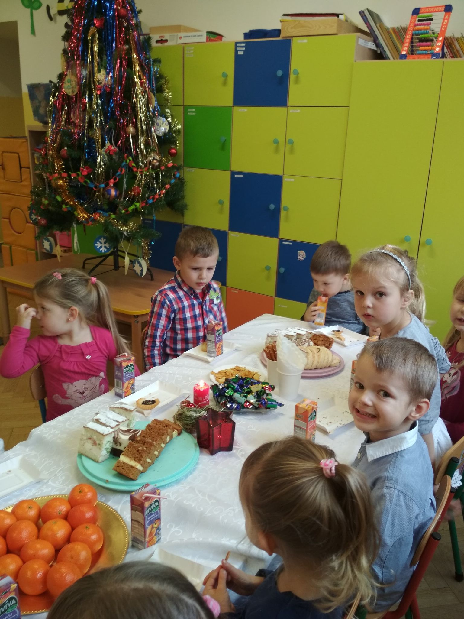Święta Bożego Narodzenia są najpiękniejszymi świętami, na które czekają nie tylko dzieci, ale i dorośli. Są to święta najbliższe i najdroższe naszym sercom, gdyż towarzyszy im niepowtarzalna i wyjątkowa atmosfera. Jest to również okazja do wspólnego spotkania i wspólnego kolędowania. Świąteczny nastrój zapanował również w naszej grupie. 22 grudnia odbyło się wigilijne spotkanie w grupie dzieci 3-4-letnich. Bożonarodzeniowy klimat dopełniały okolicznościowe dekoracje, lampki, choinka oraz odświętnie nakryty stół z poczęstunkiem przygotowanym przez rodziców. Nie zabrakło również wspólnego śpiewania kolęd.Wigilia w naszej grupie upłynęła w miłej i serdecznej atmosferze, na długo pozostanie w naszej pamięci. Takie szczególne momenty wzmacniają wzajemne relacje oraz integrują. Dzieci życzą wszystkim Wesołych i Spokojnych Świąt Bożego Narodzenia :)