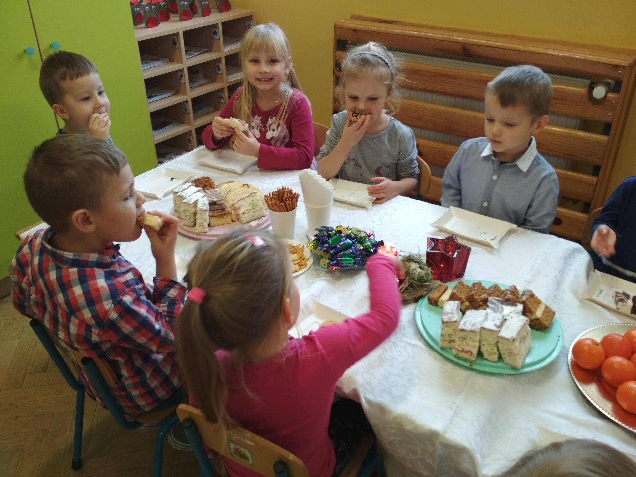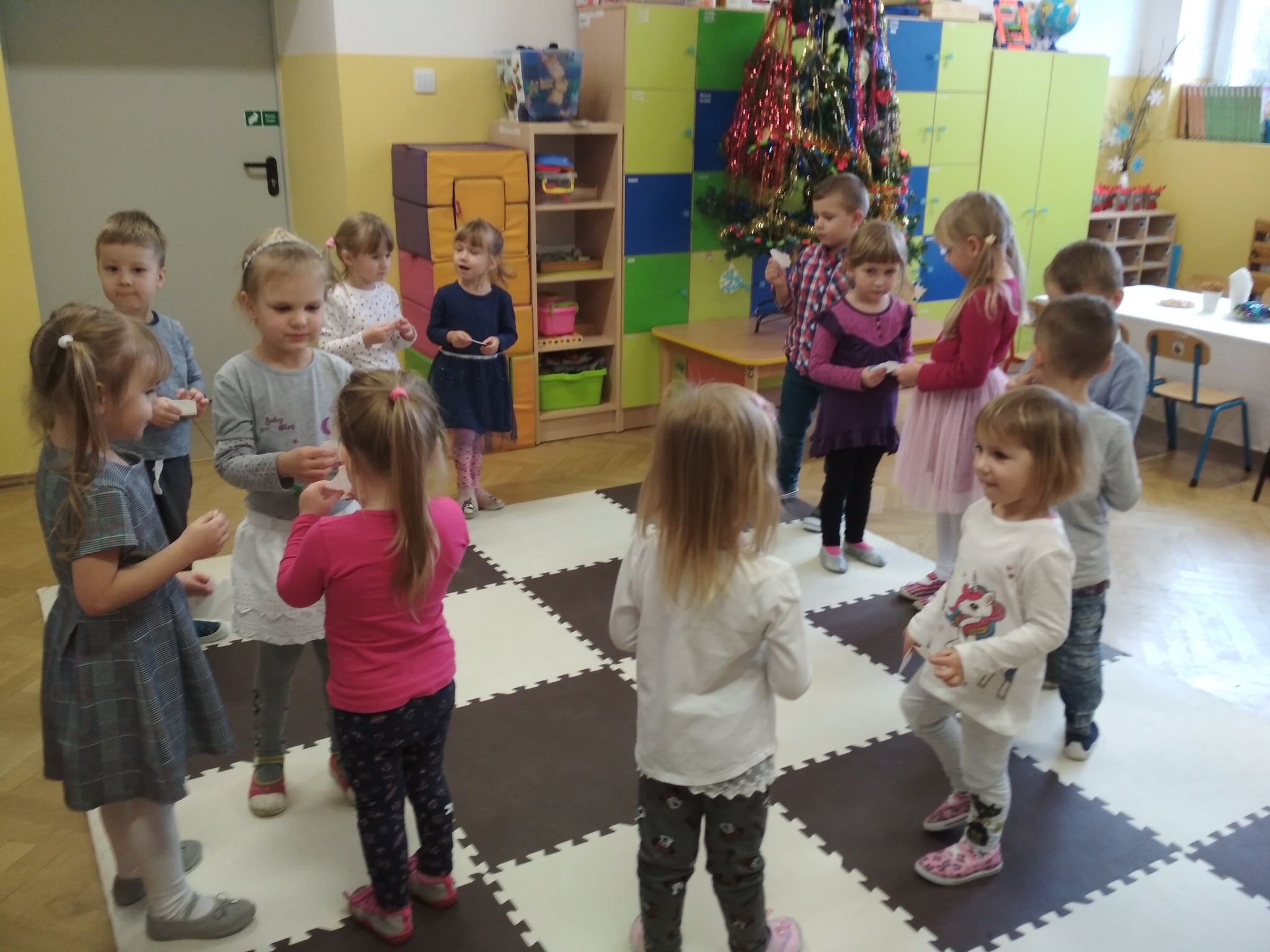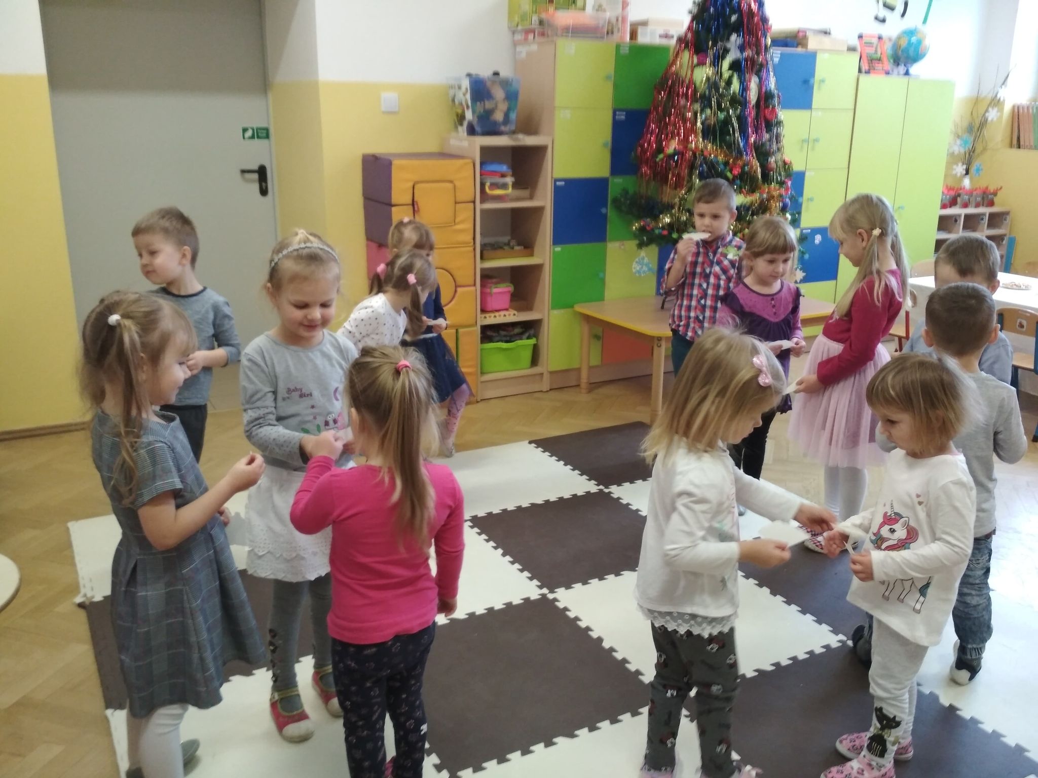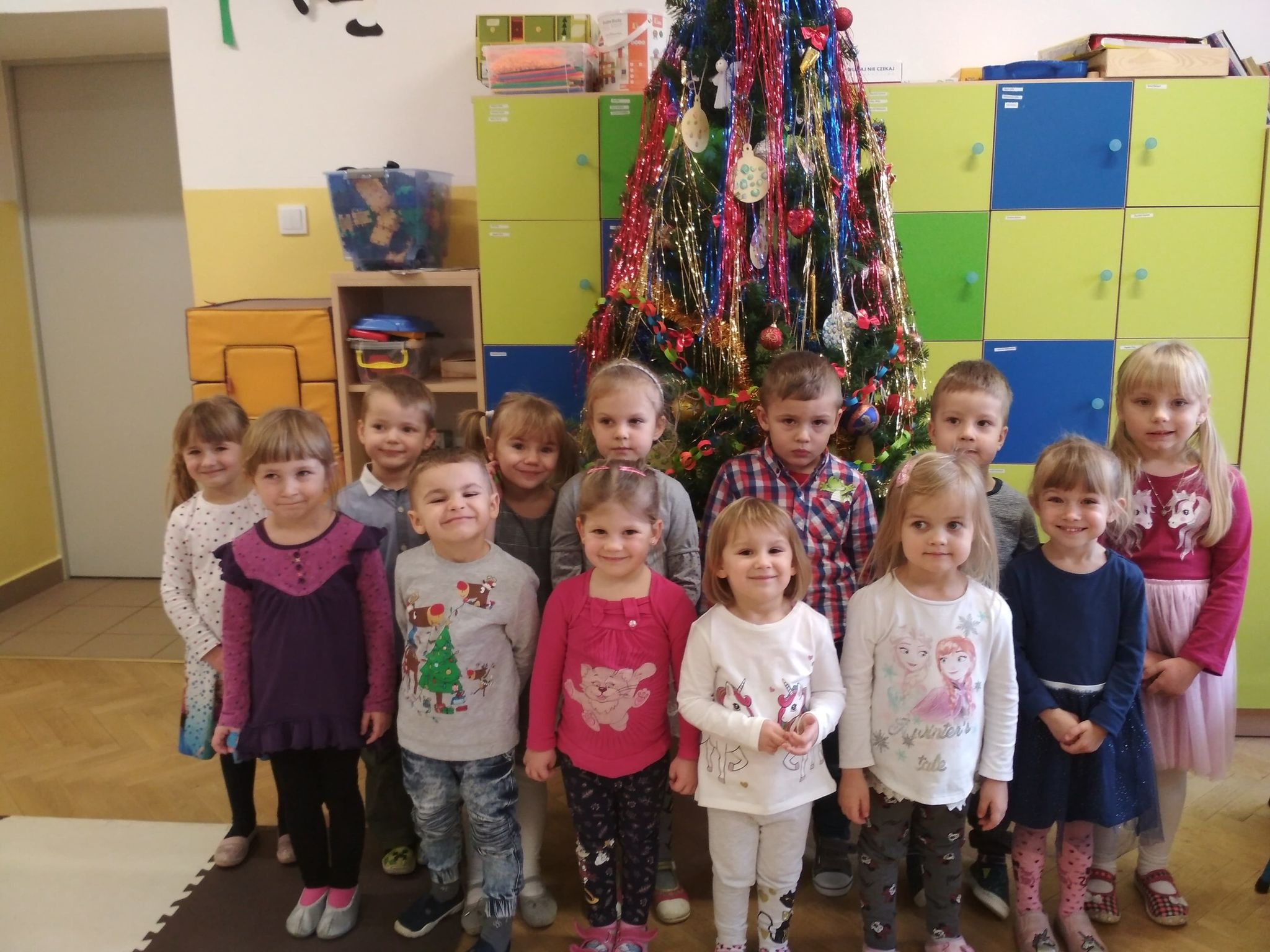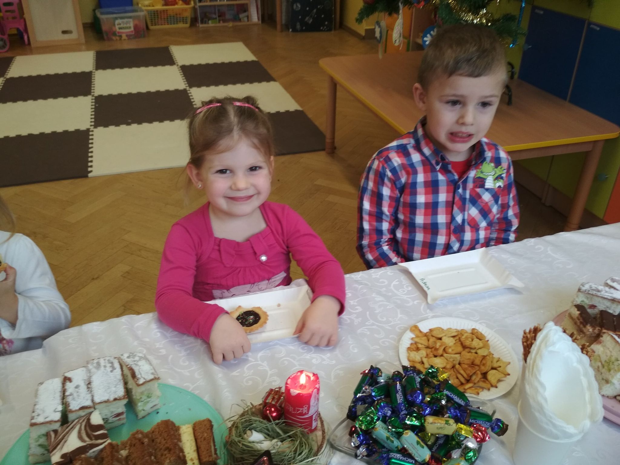 Święta Bożego Narodzenia są najpiękniejszymi świętami, na które czekają nie tylko dzieci, ale i dorośli. Są to święta najbliższe i najdroższe naszym sercom, gdyż towarzyszy im niepowtarzalna i wyjątkowa atmosfera. Jest to również okazja do wspólnego spotkania i wspólnego kolędowania. Świąteczny nastrój zapanował również w naszej grupie. 22 grudnia odbyło się wigilijne spotkanie w grupie dzieci 3-4-letnich. Bożonarodzeniowy klimat dopełniały okolicznościowe dekoracje, lampki, choinka oraz odświętnie nakryty stół z poczęstunkiem przygotowanym przez rodziców. Nie zabrakło również wspólnego śpiewania kolęd.Wigilia w naszej grupie upłynęła w miłej i serdecznej atmosferze, na długo pozostanie w naszej pamięci. Takie szczególne momenty wzmacniają wzajemne relacje oraz integrują. Dzieci życzą wszystkim Wesołych i Spokojnych Świąt Bożego Narodzenia :)